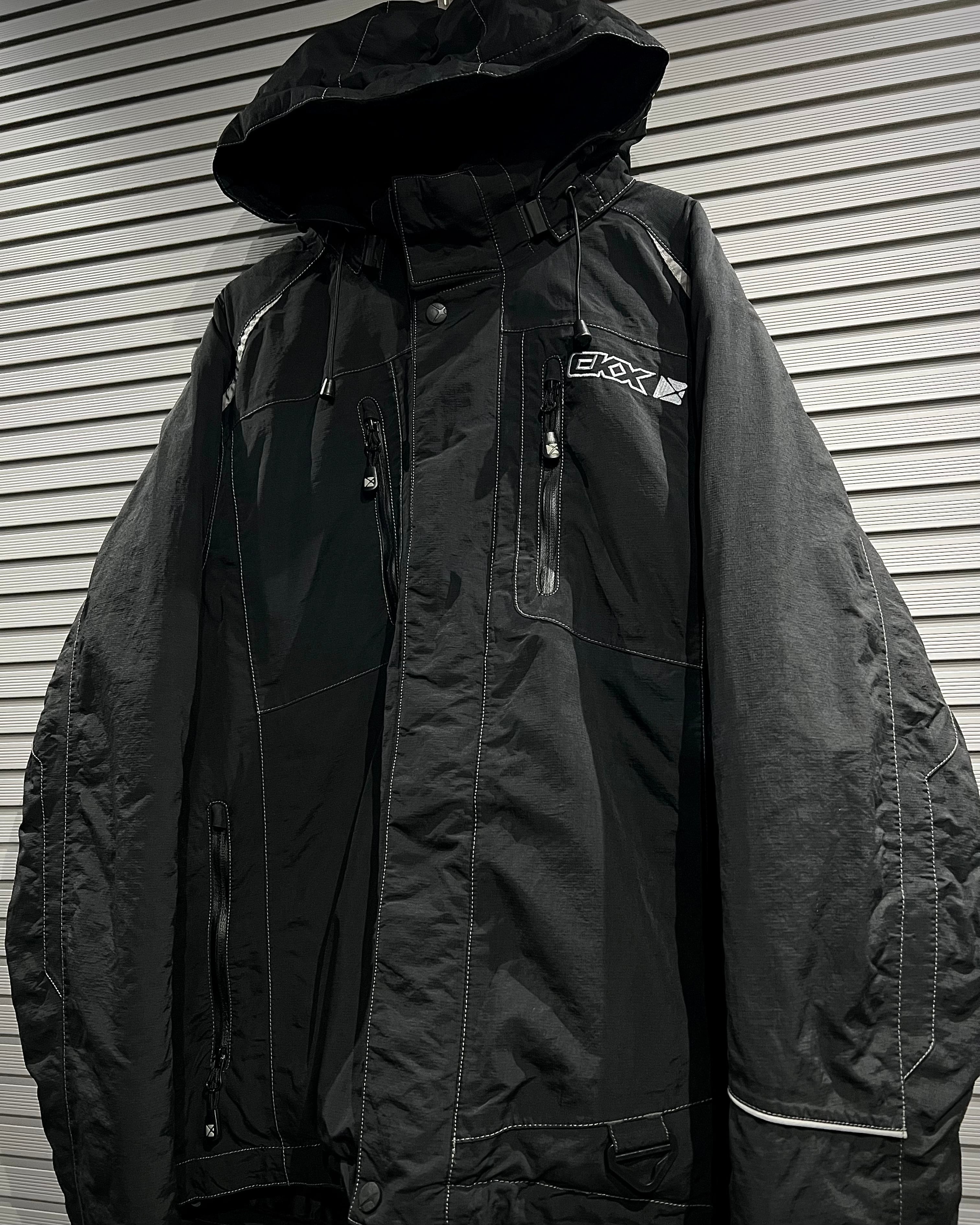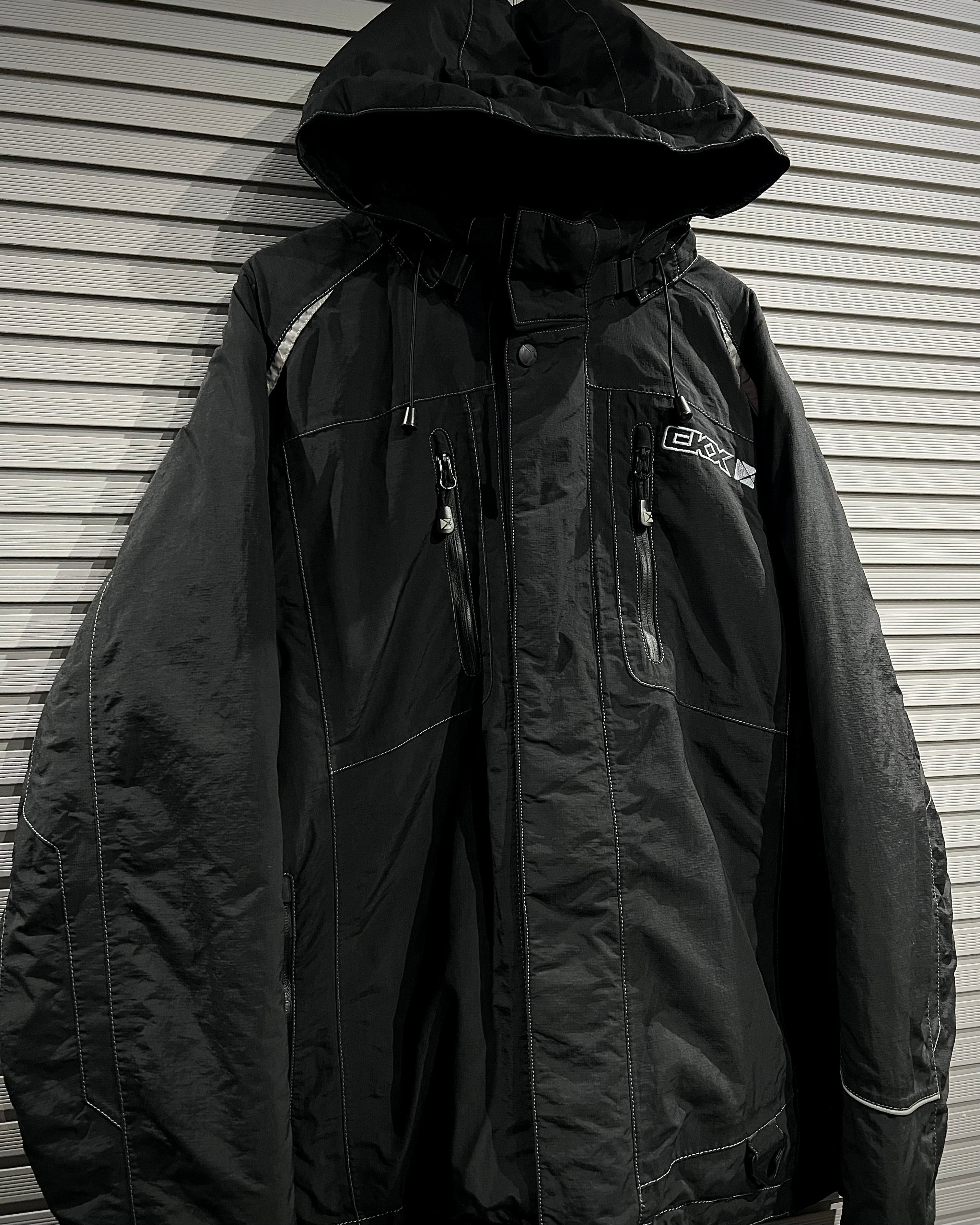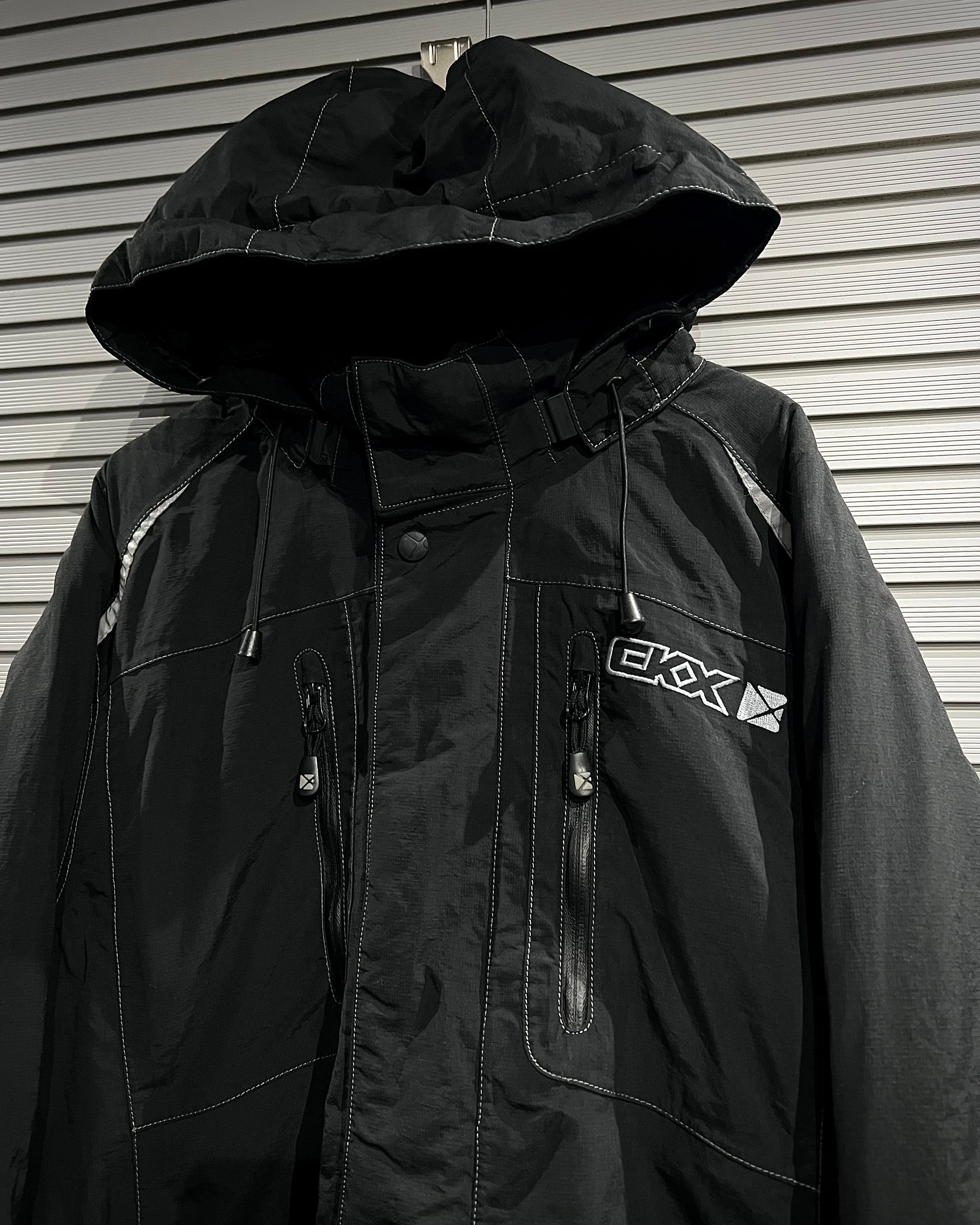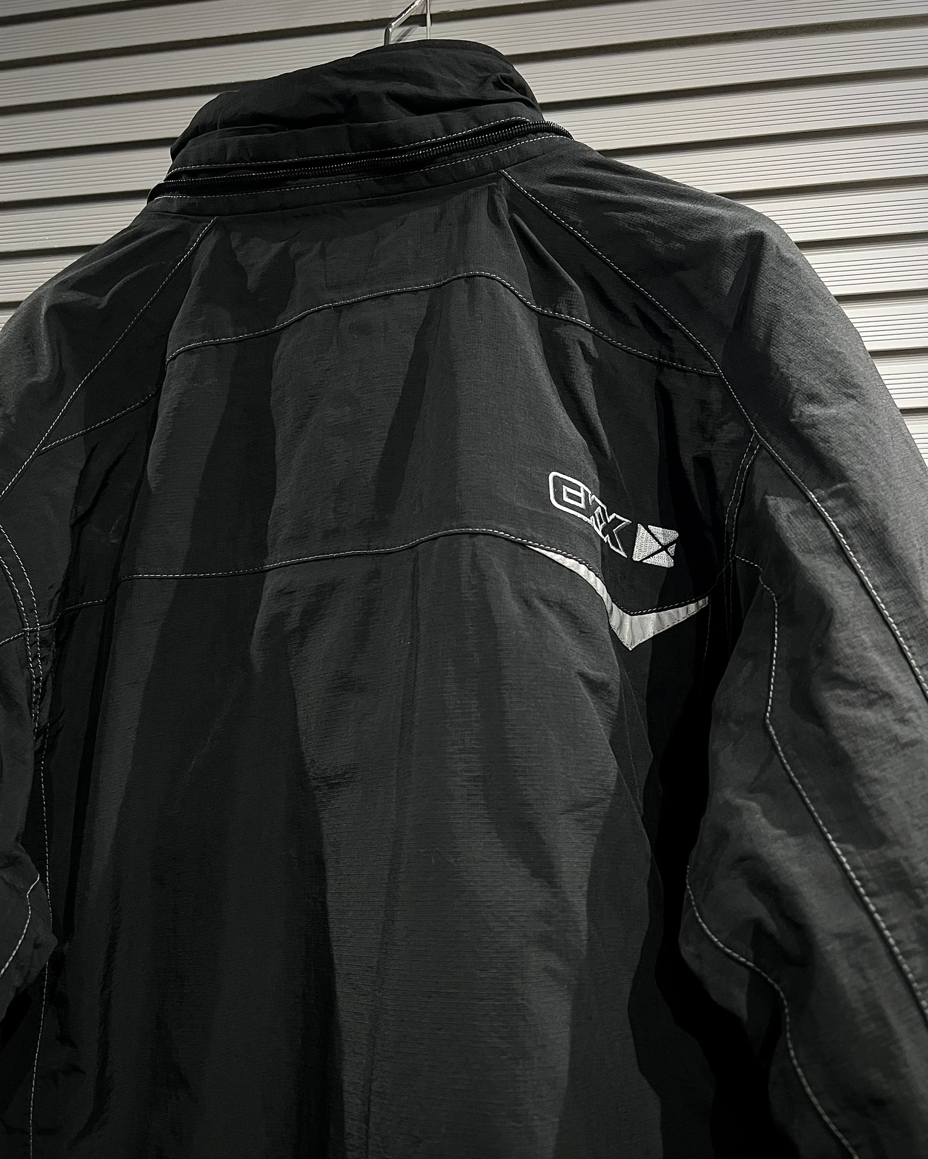 フロントには止水ジップポケットを複数配置し視覚的にも機能的にもギア感が強く、胸元や背面に配されたロゴワーク、首元のベルト、リフレクティブのパイピング、切り替えが、テックウェアらしいアクセントとして効いています。