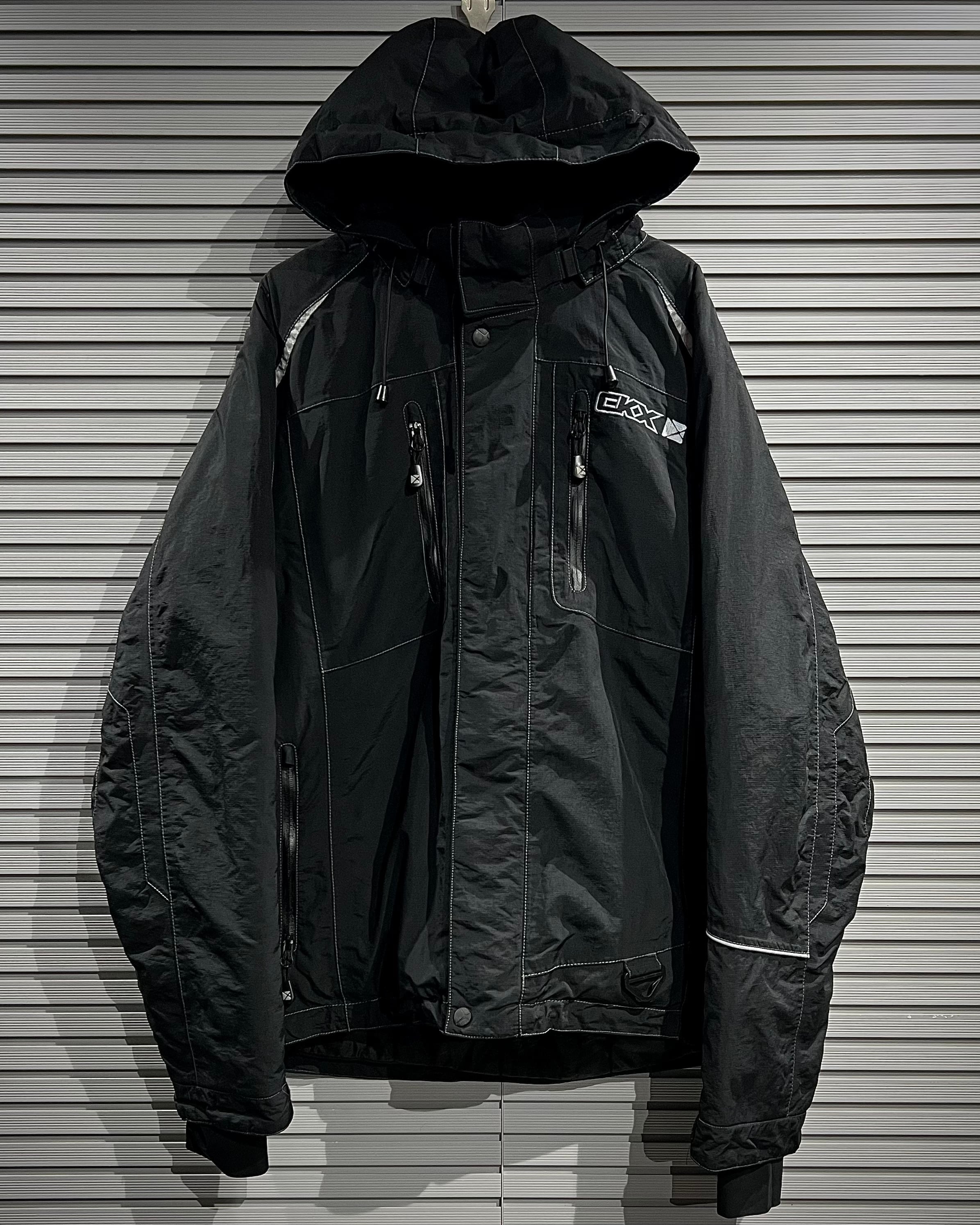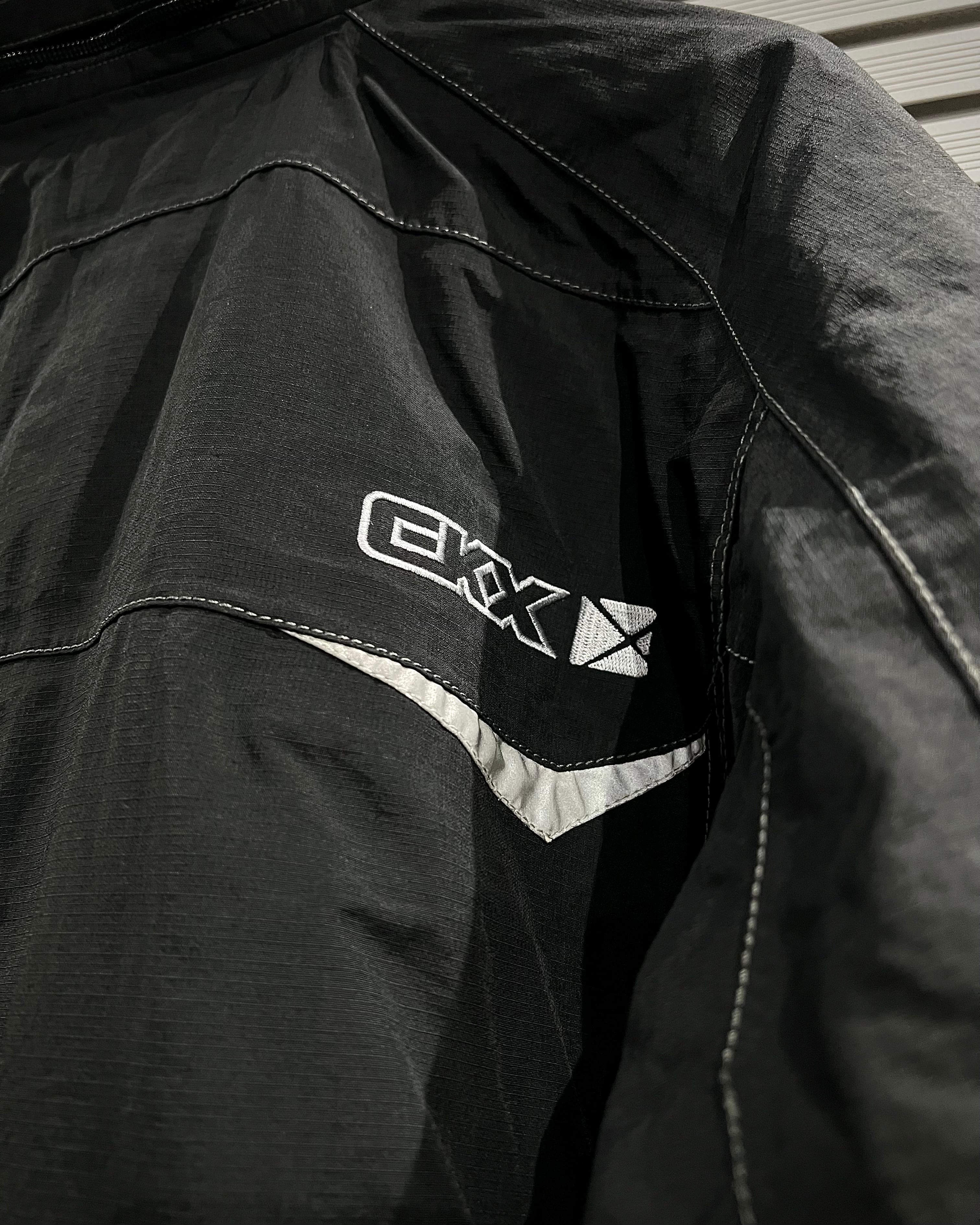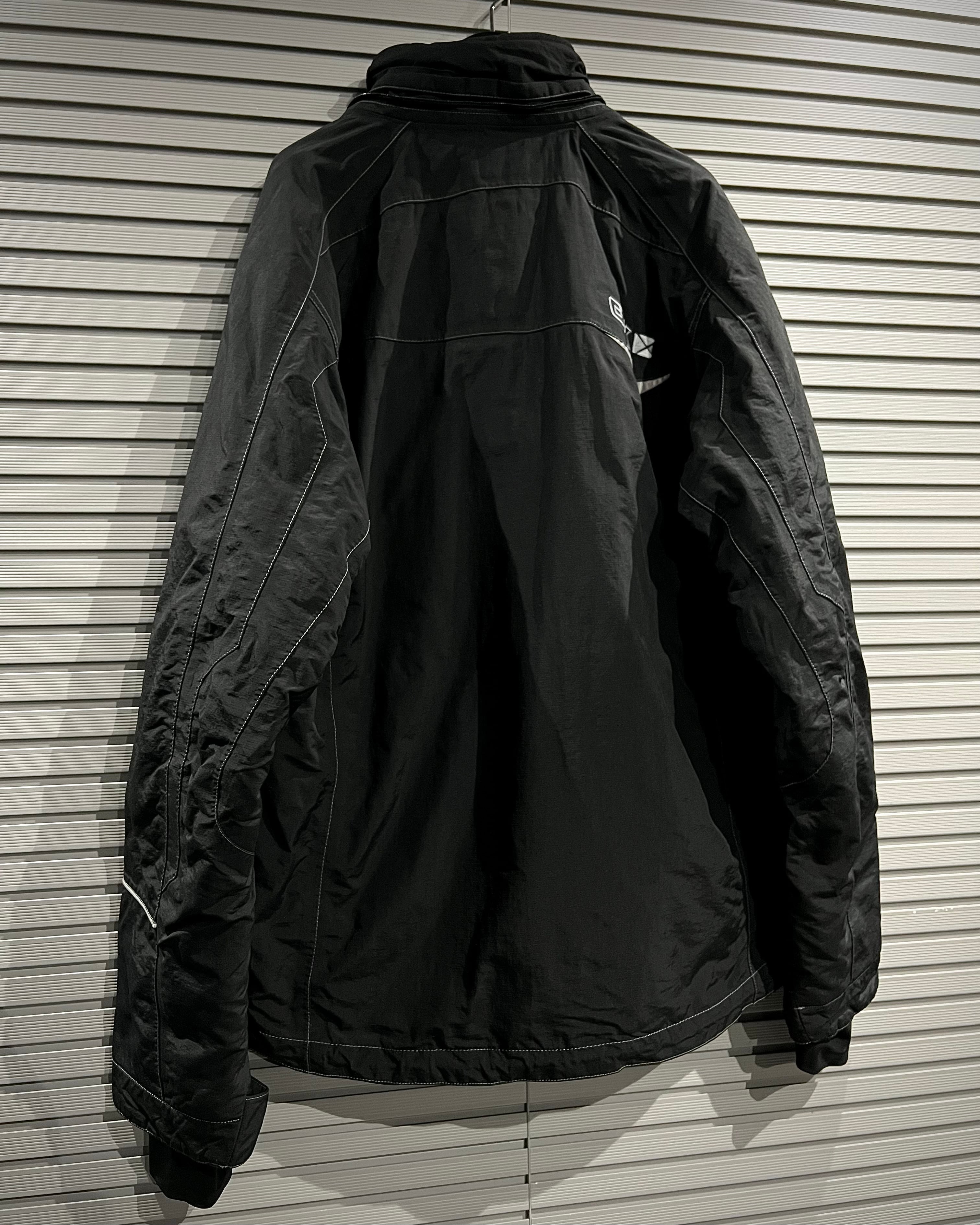 フロントには止水ジップポケットを複数配置し視覚的にも機能的にもギア感が強く、胸元や背面に配されたロゴワーク、首元のベルト、リフレクティブのパイピング、切り替えが、テックウェアらしいアクセントとして効いています。