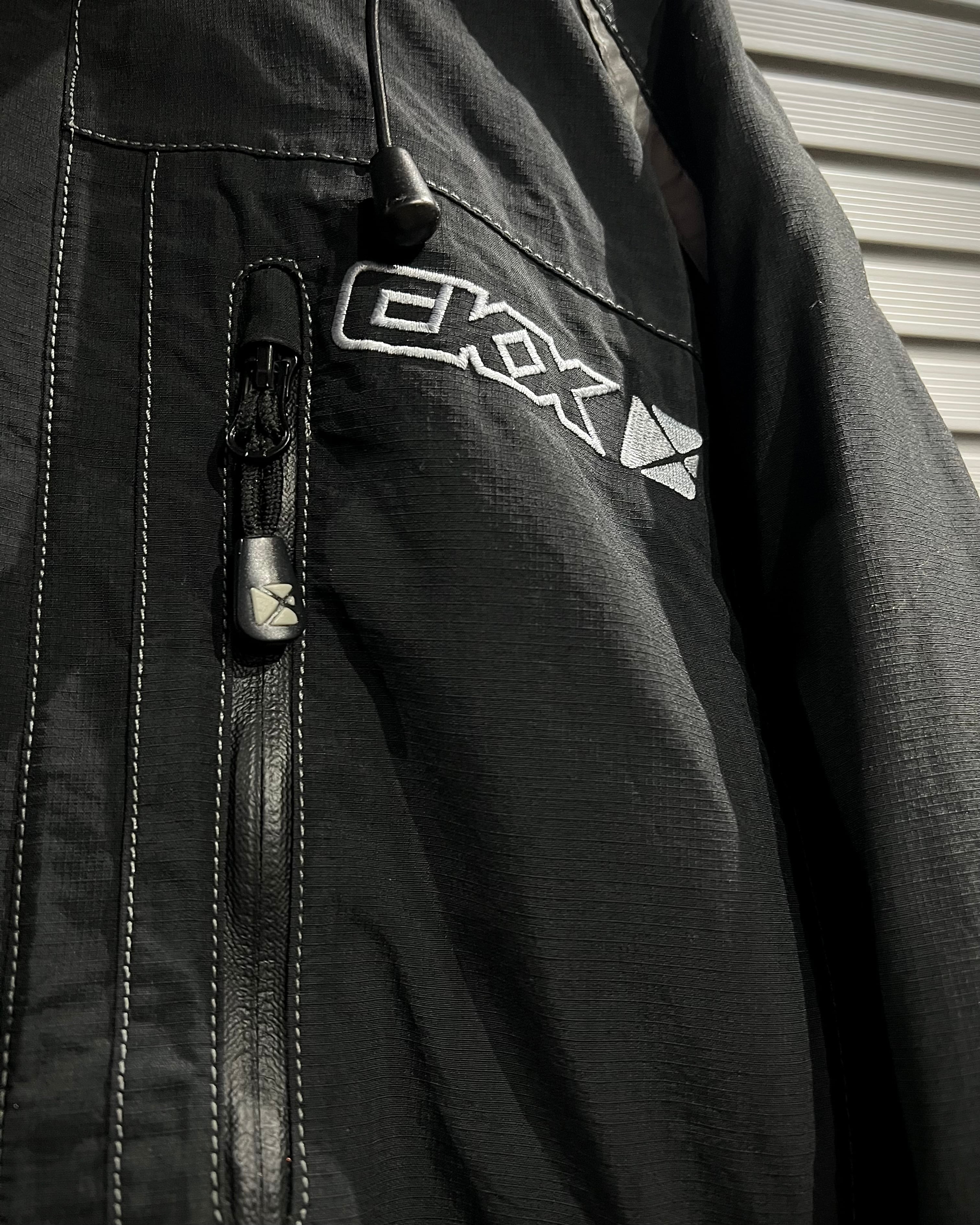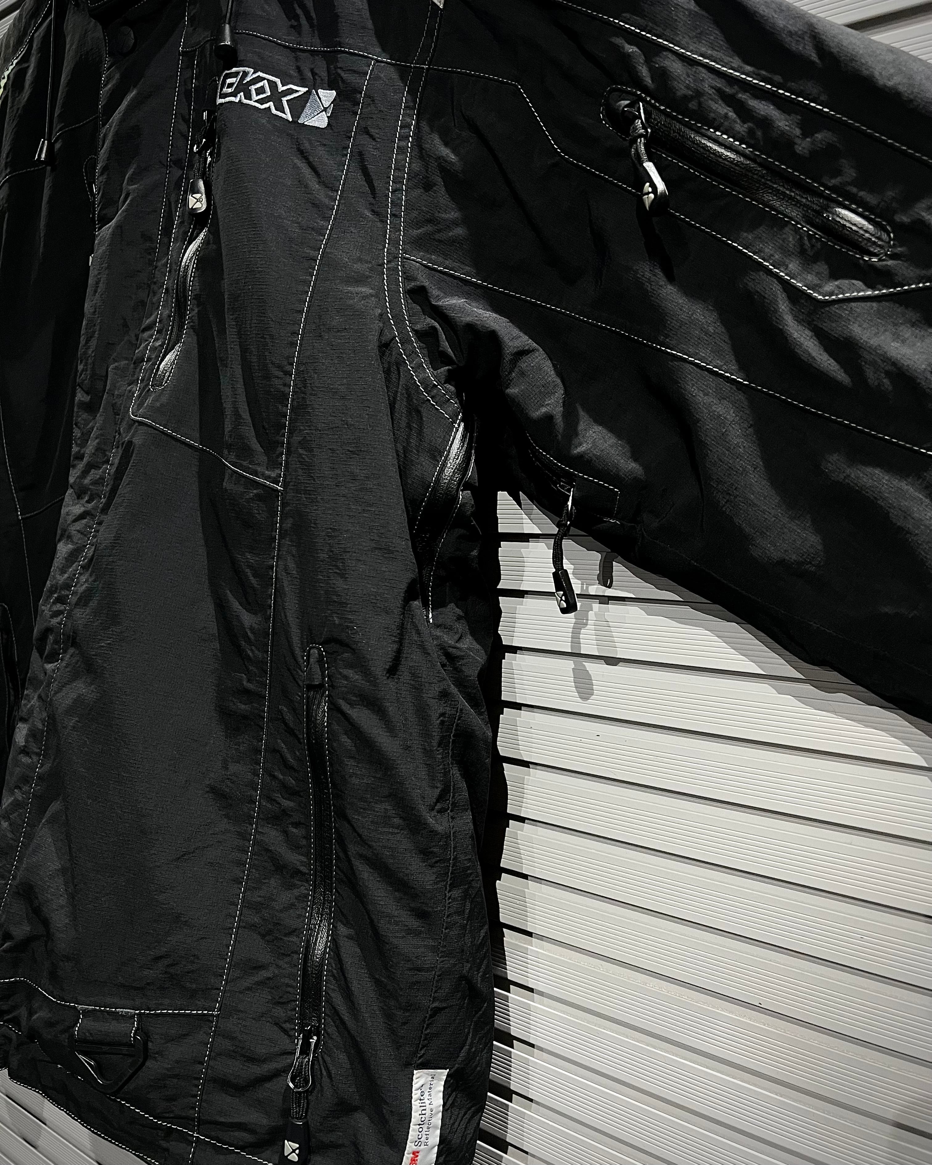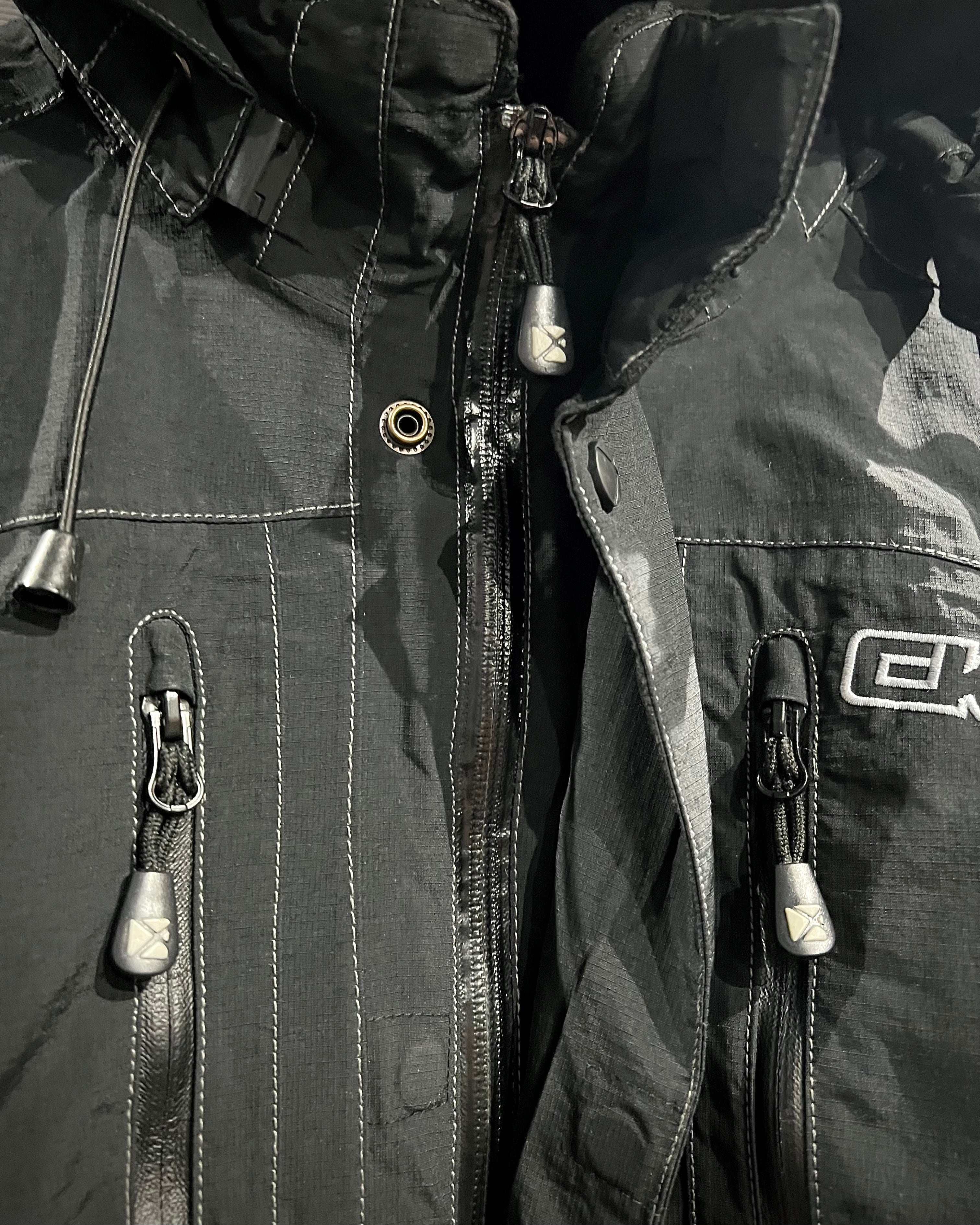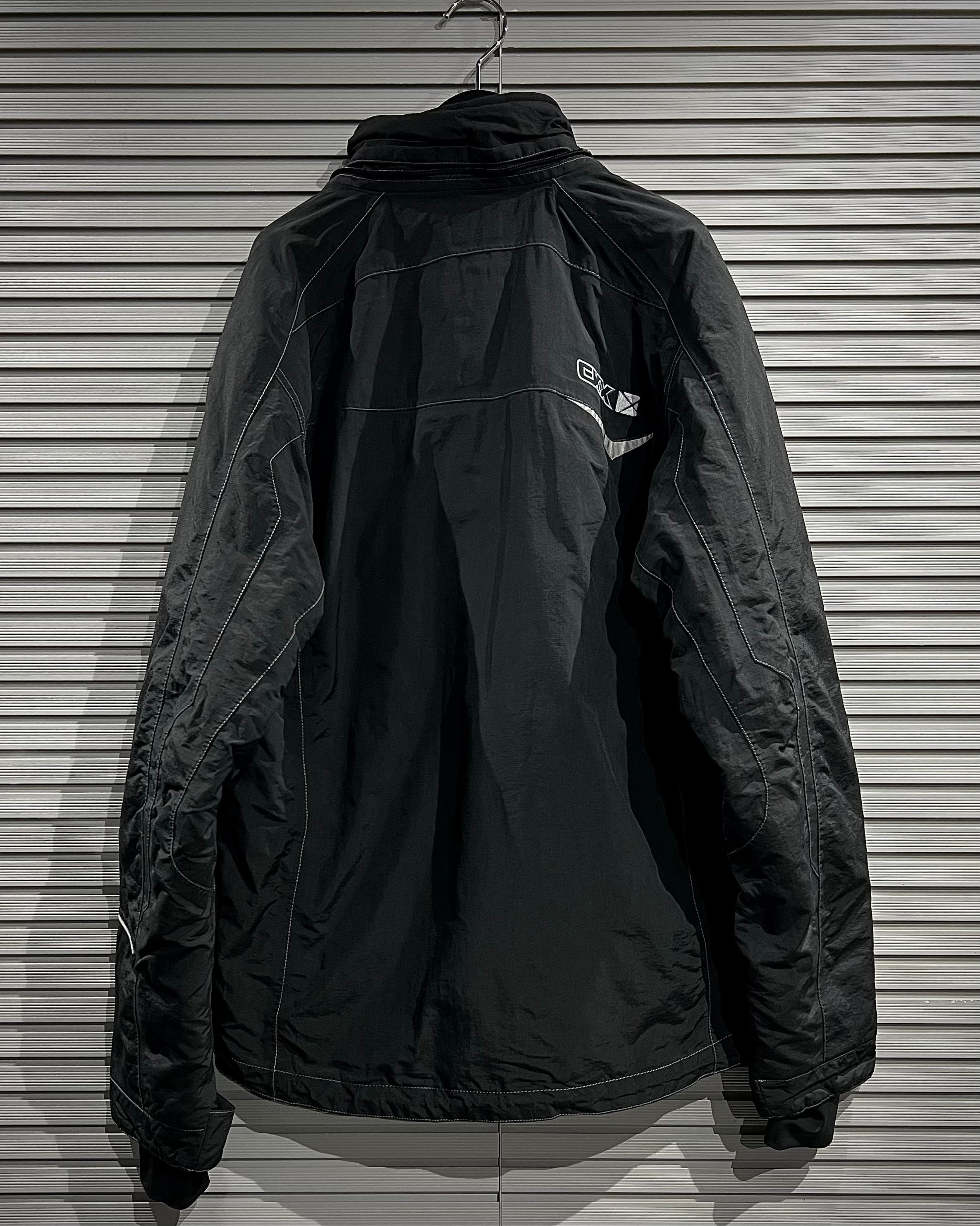 フロントには止水ジップポケットを複数配置し視覚的にも機能的にもギア感が強く、胸元や背面に配されたロゴワーク、首元のベルト、リフレクティブのパイピング、切り替えが、テックウェアらしいアクセントとして効いています。