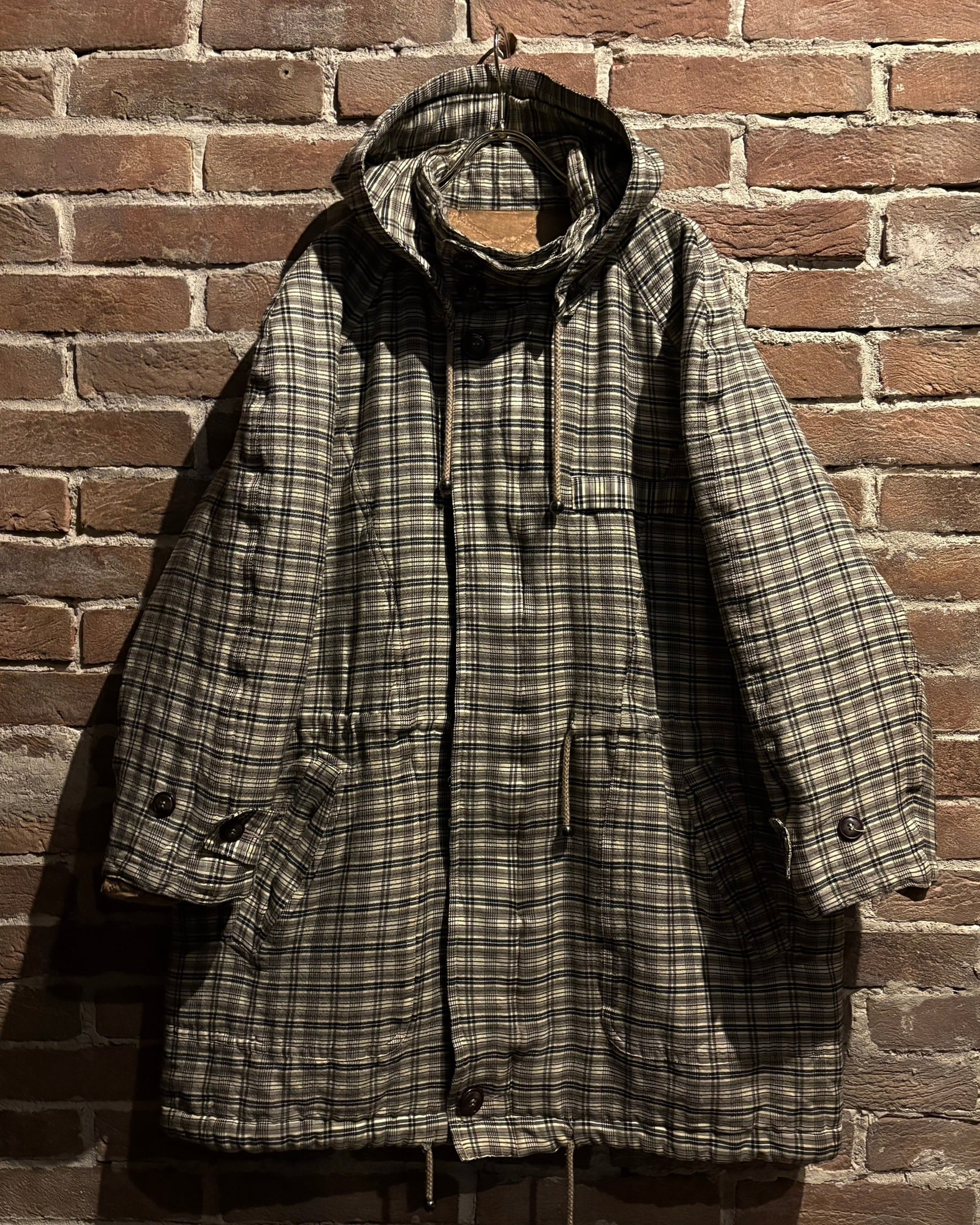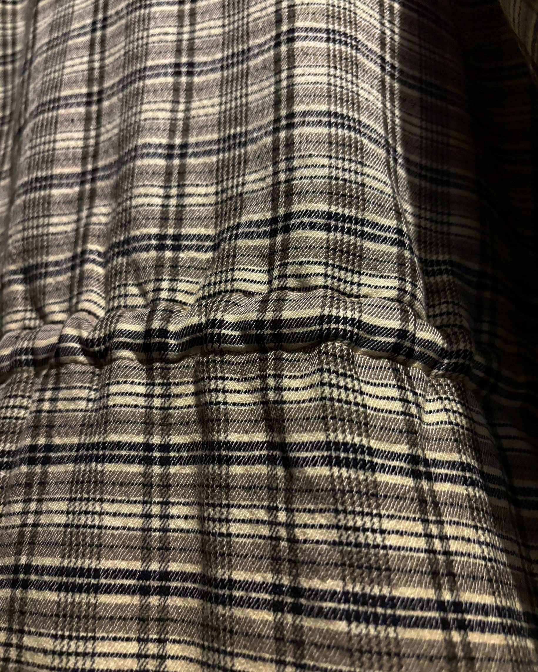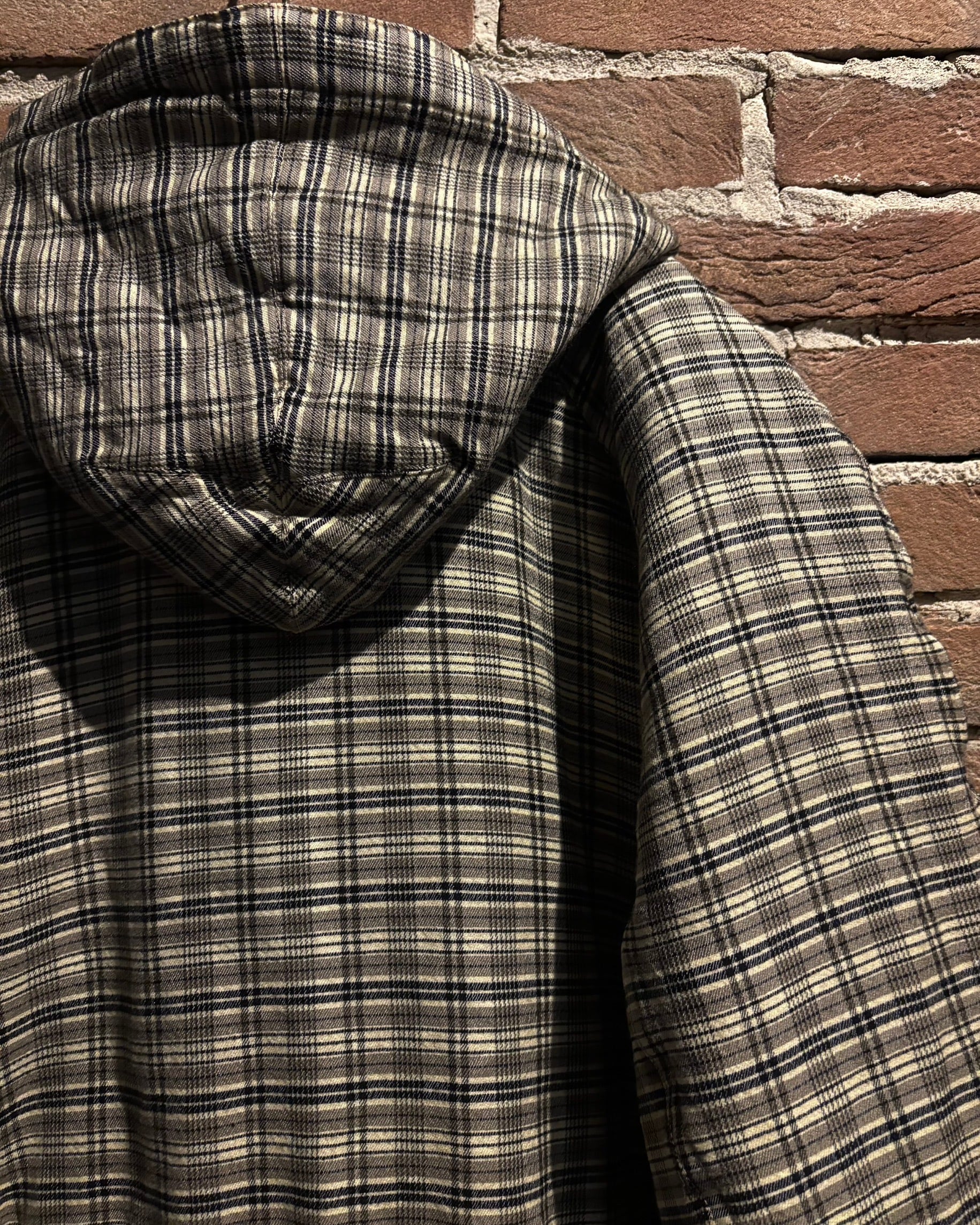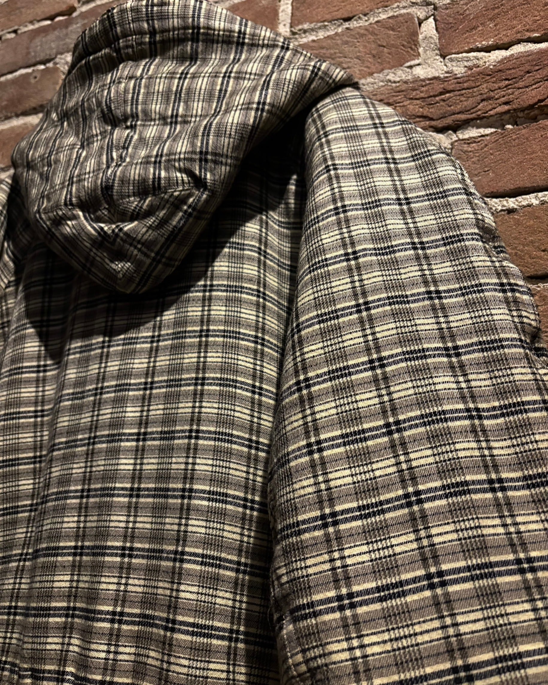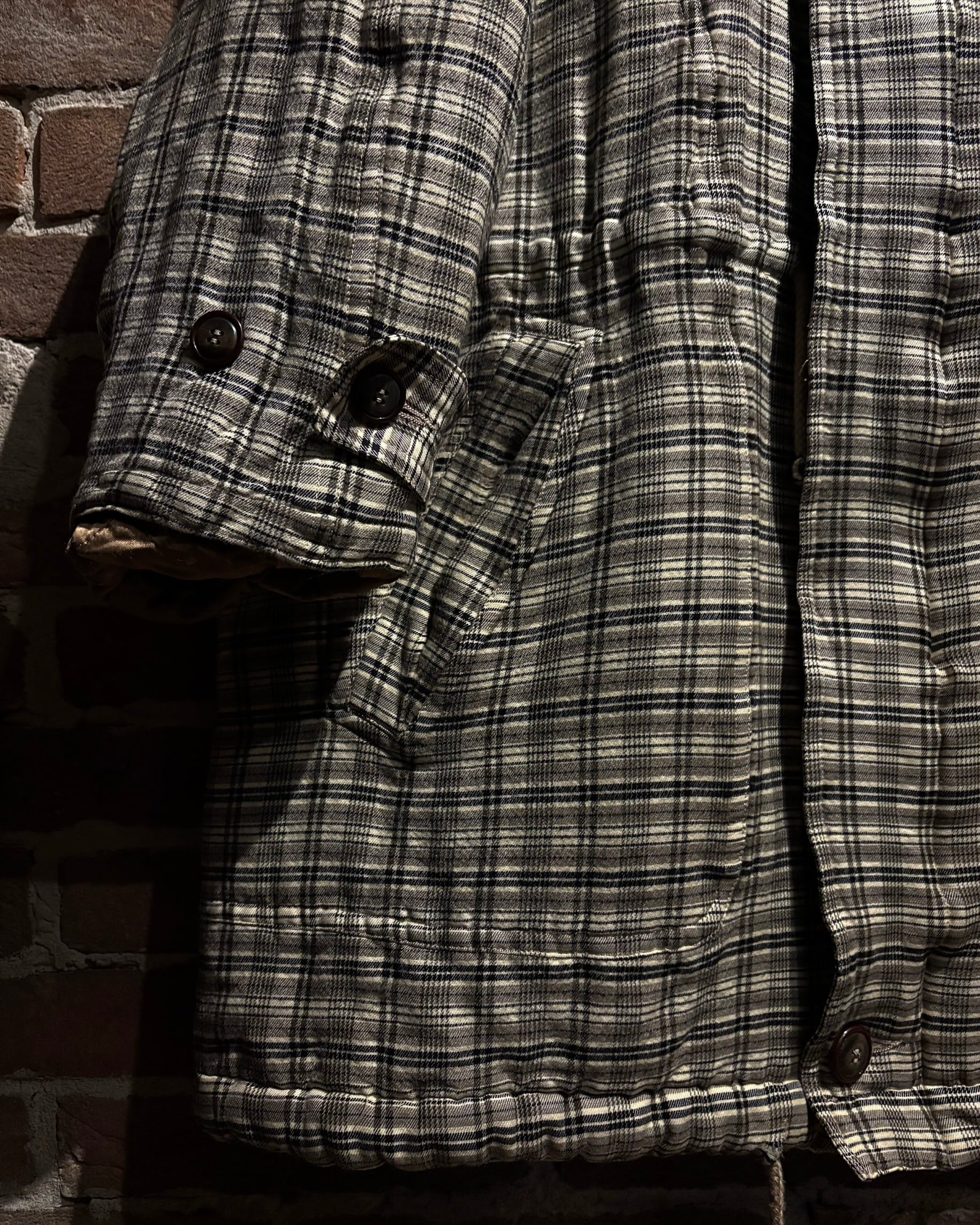 落ち着いたトーンのチェック柄を全面に配したボディは、ベーシックな配色ながら奥行きのある表情。表地には肌触りの良いコットン混ファブリックを使用し、内側にはしっかりと中綿を仕込むことで、防寒性と軽やかな着用感を両立しています。
