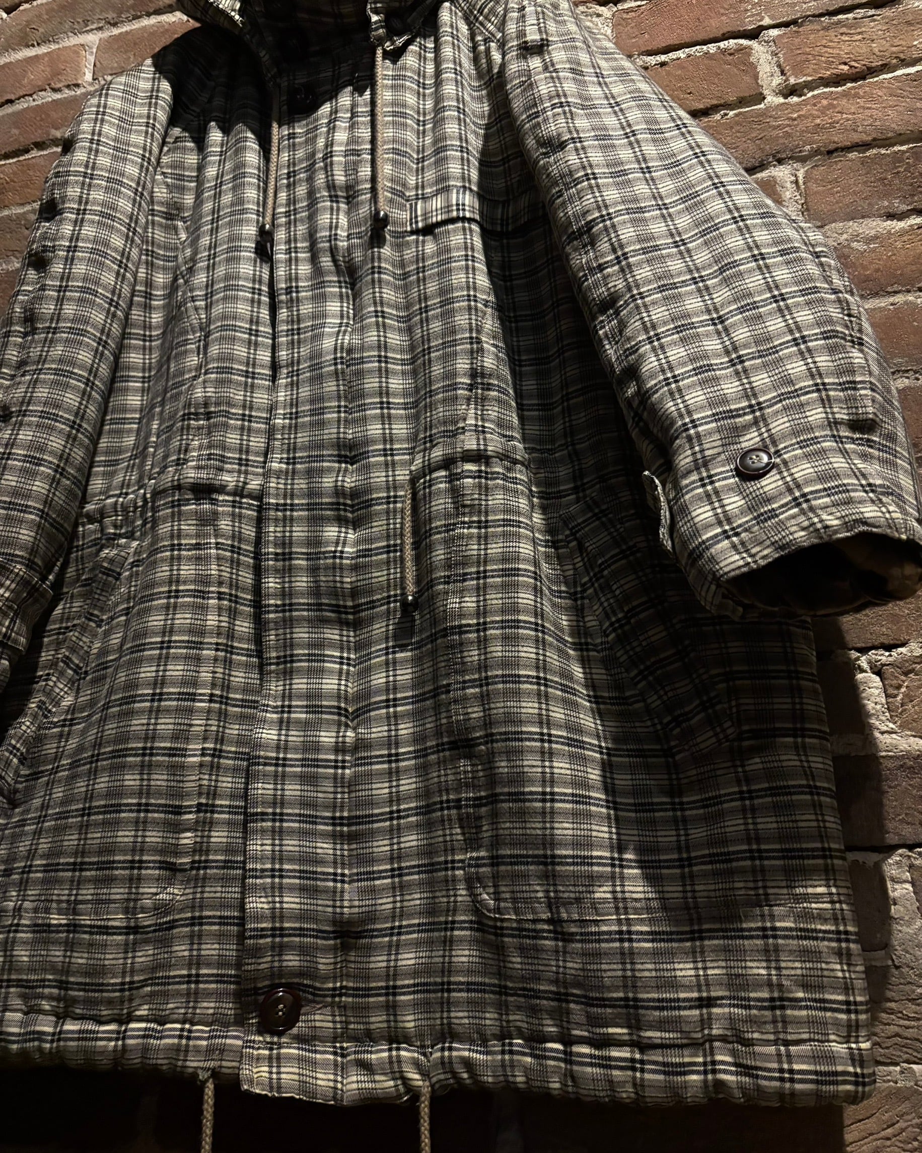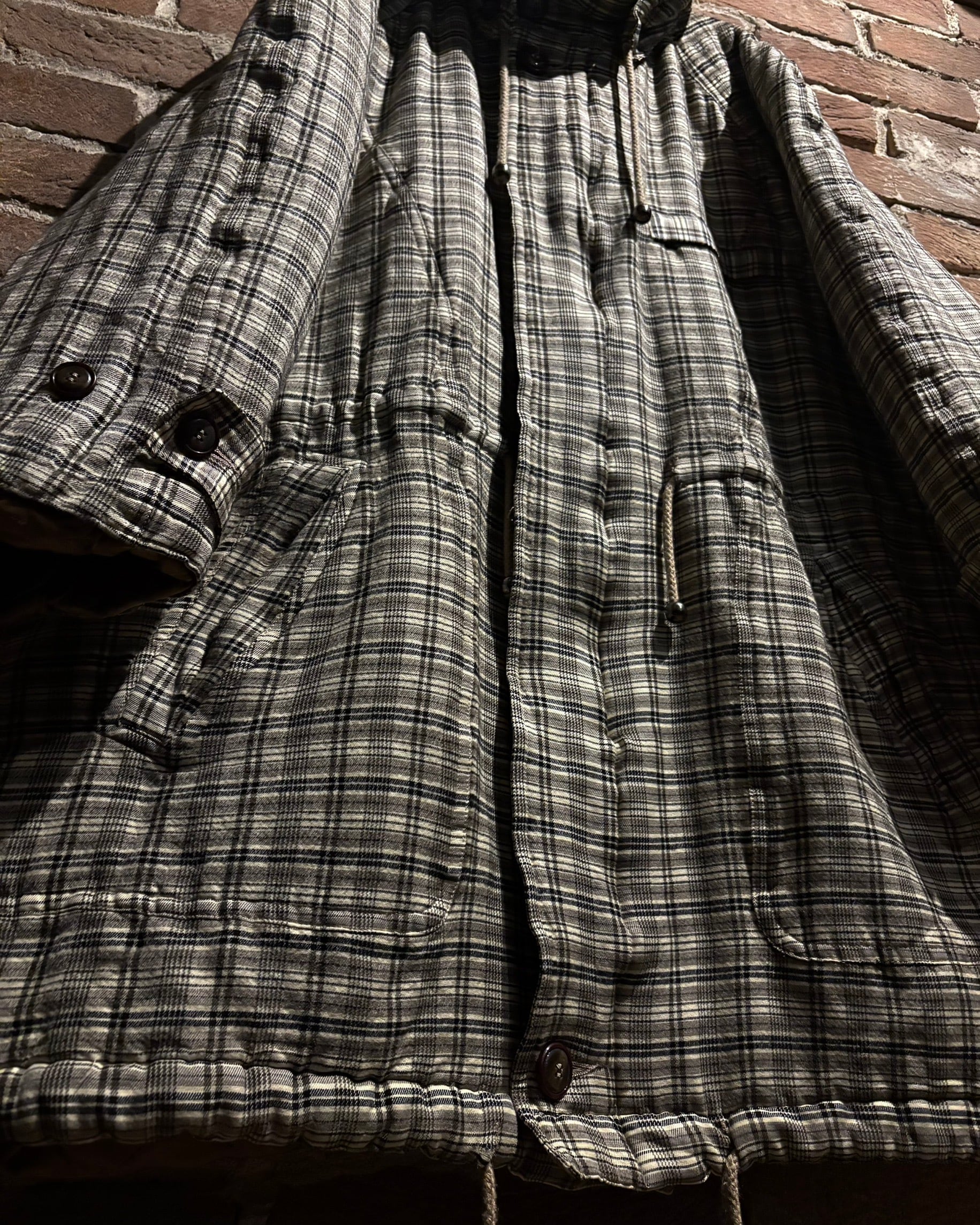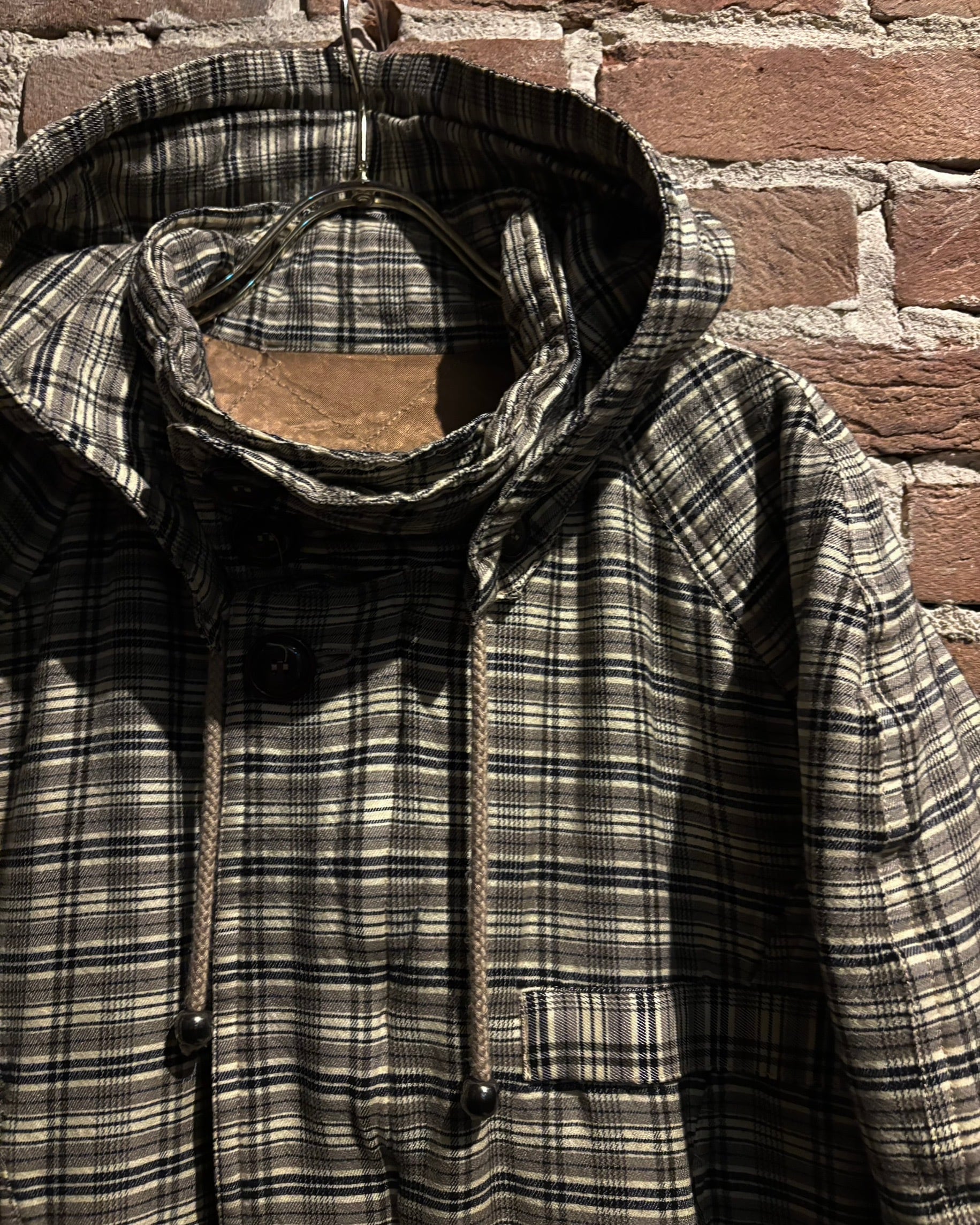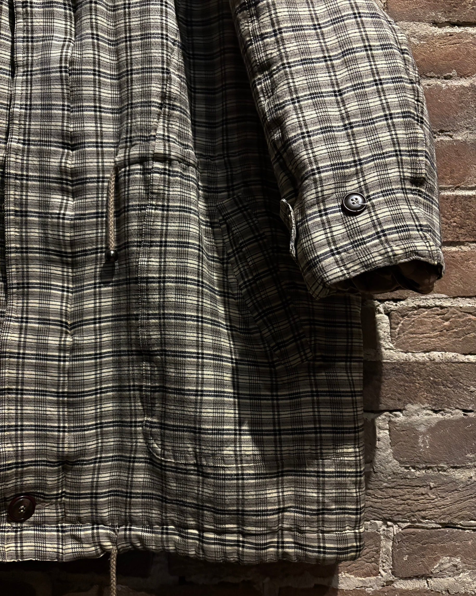 落ち着いたトーンのチェック柄を全面に配したボディは、ベーシックな配色ながら奥行きのある表情。表地には肌触りの良いコットン混ファブリックを使用し、内側にはしっかりと中綿を仕込むことで、防寒性と軽やかな着用感を両立しています。