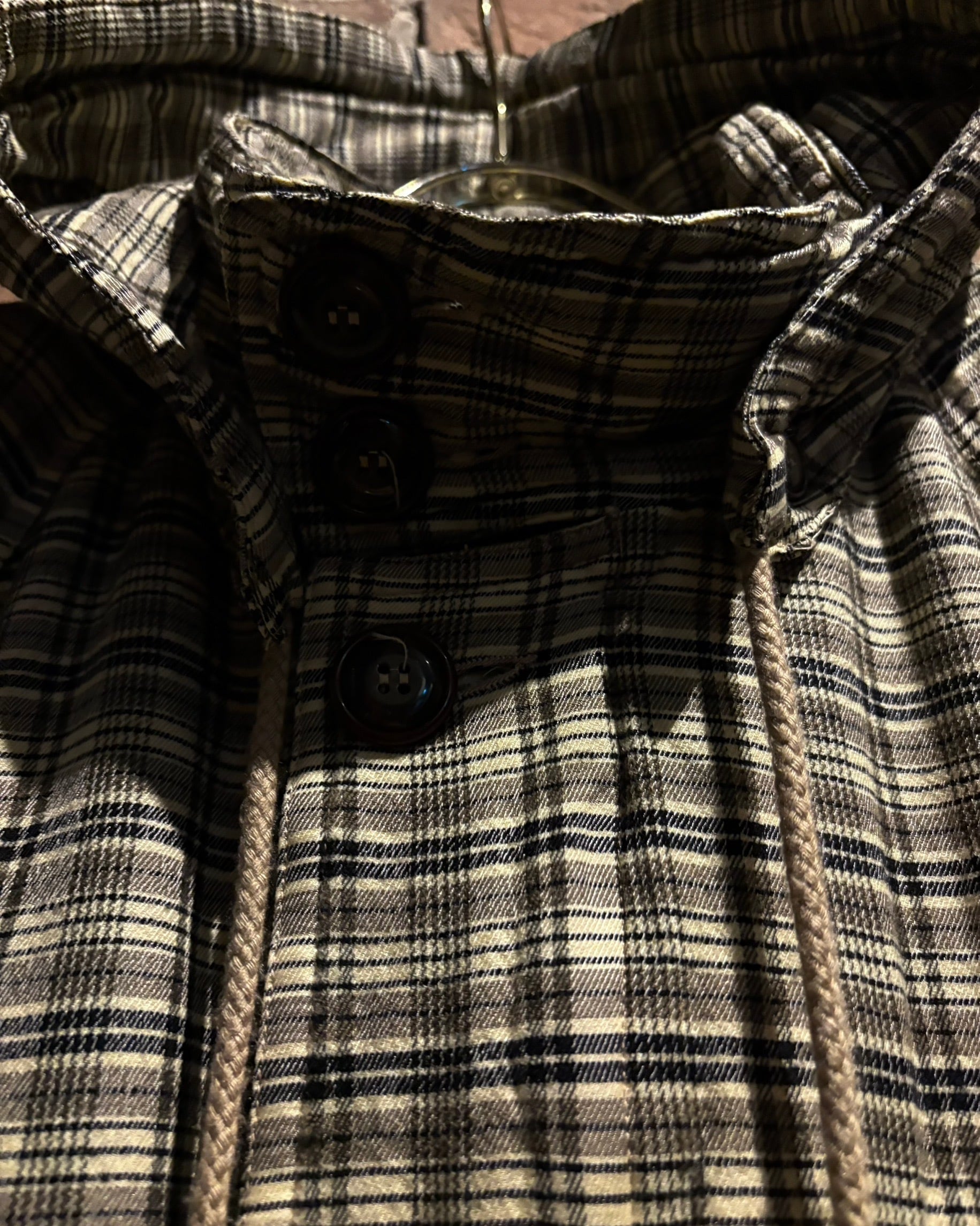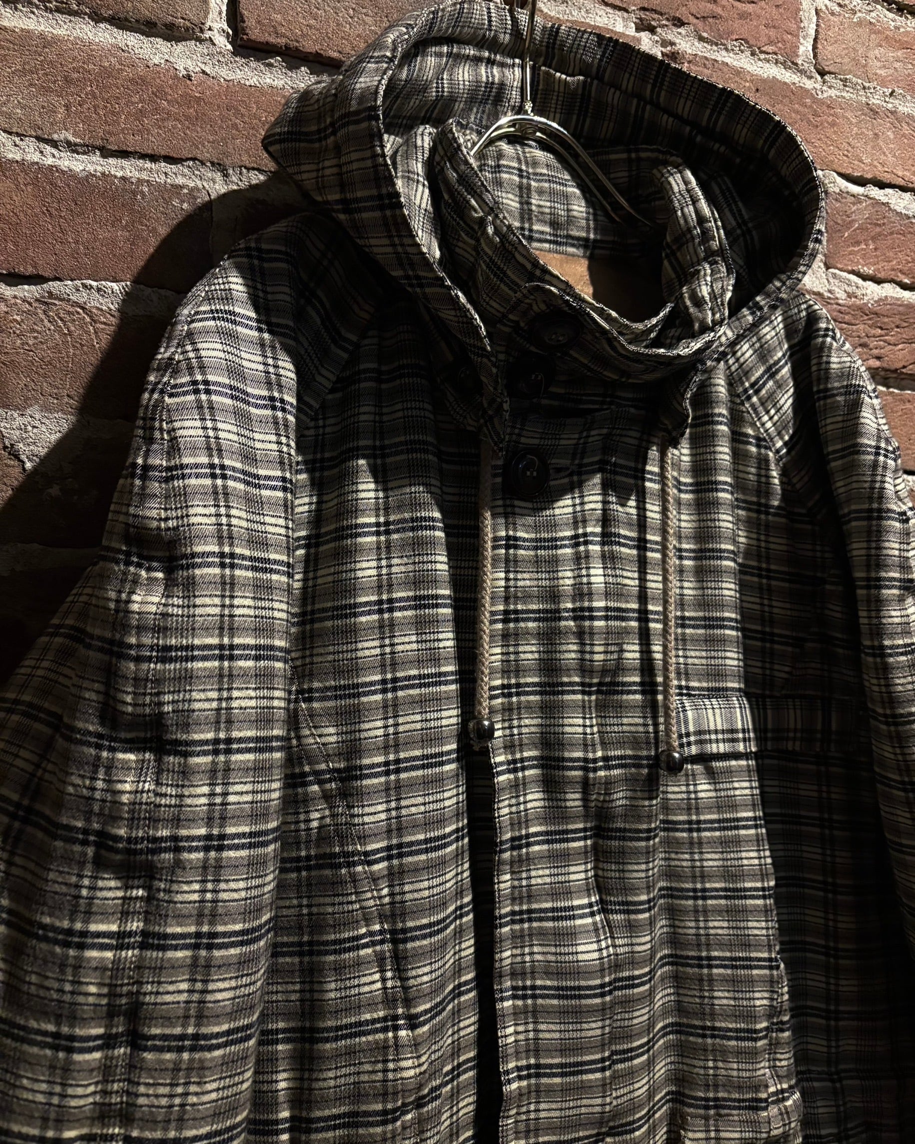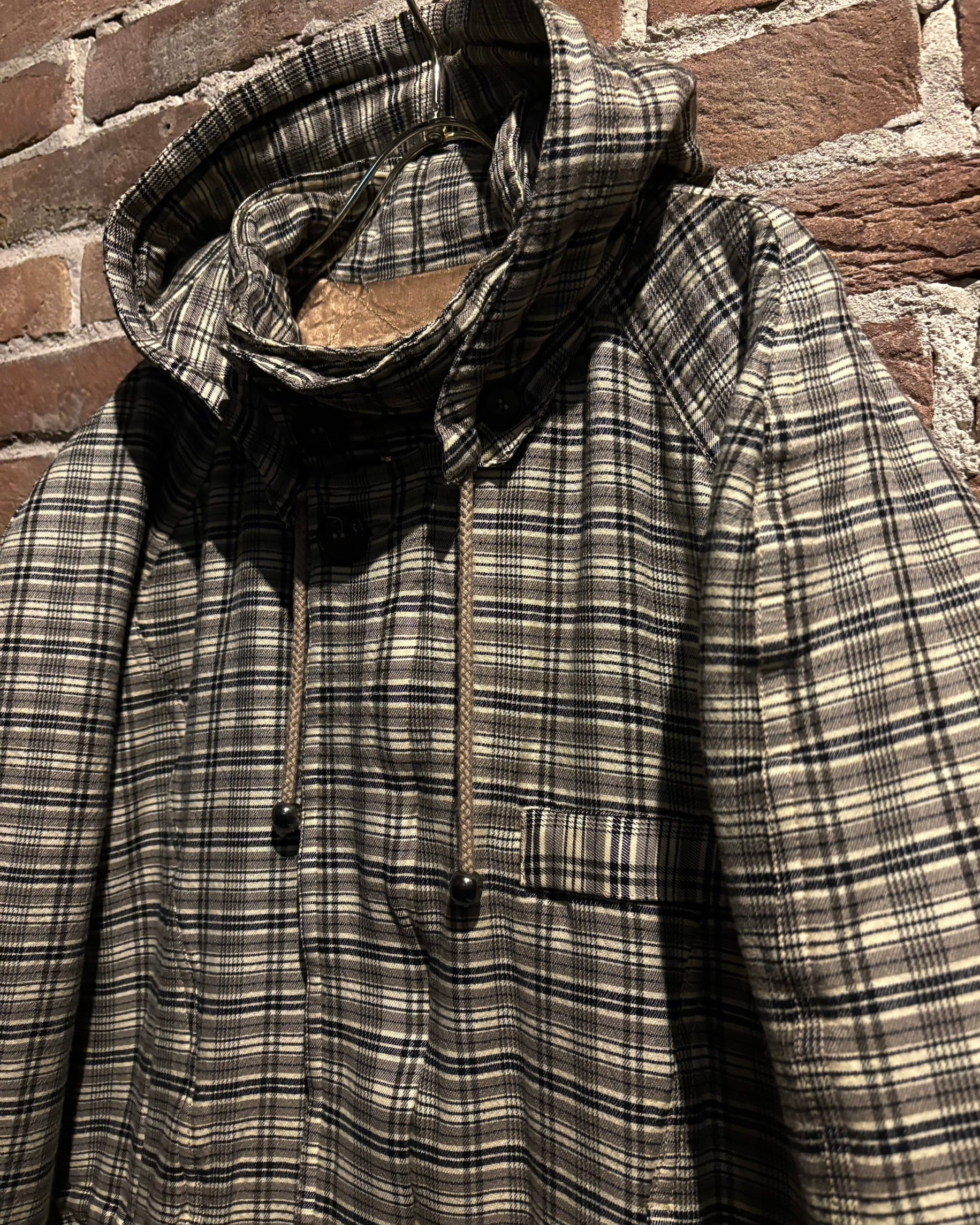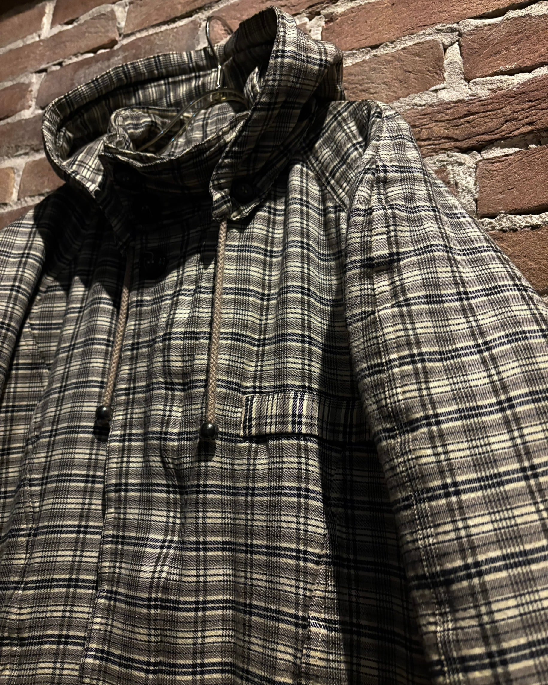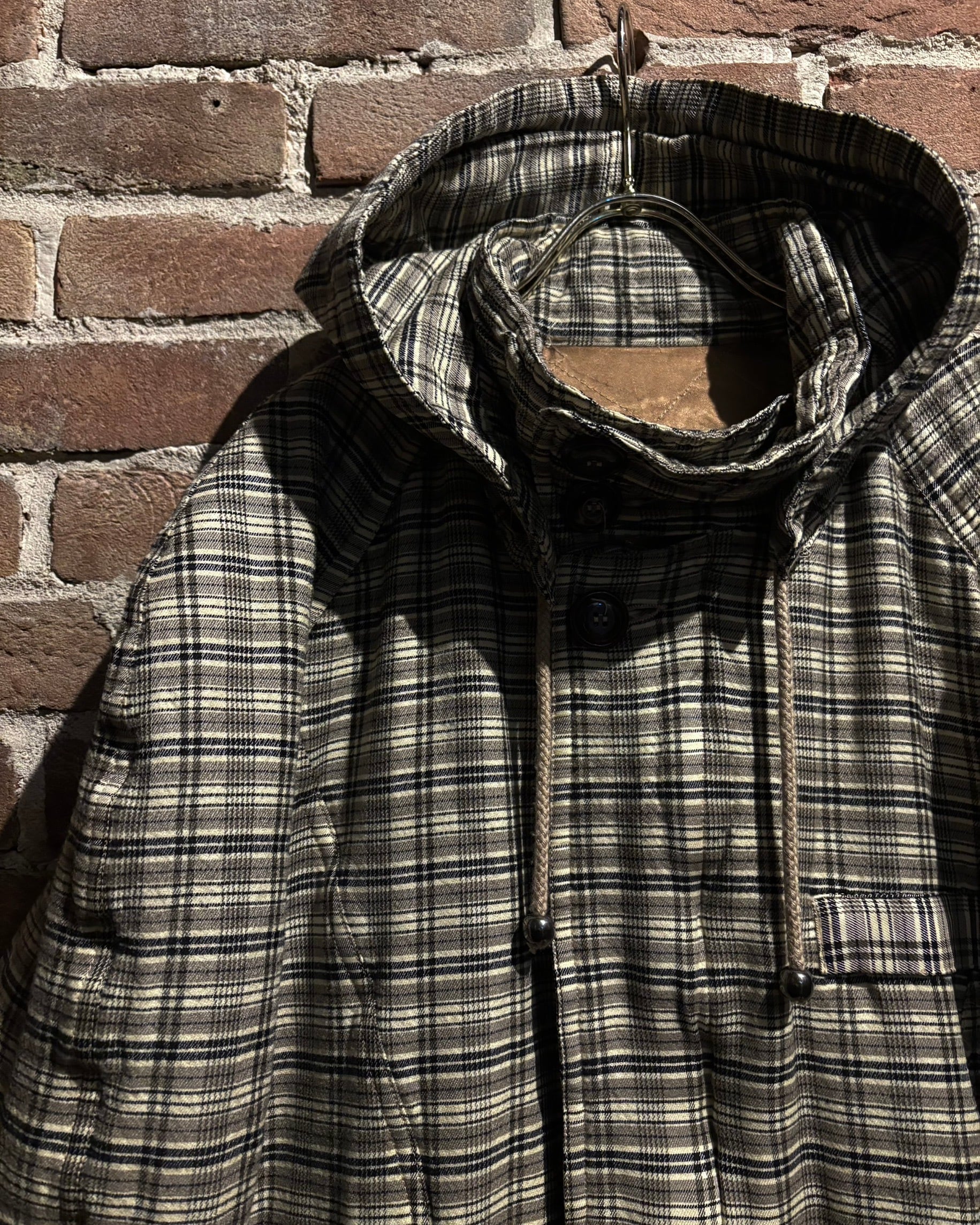 落ち着いたトーンのチェック柄を全面に配したボディは、ベーシックな配色ながら奥行きのある表情。表地には肌触りの良いコットン混ファブリックを使用し、内側にはしっかりと中綿を仕込むことで、防寒性と軽やかな着用感を両立しています。