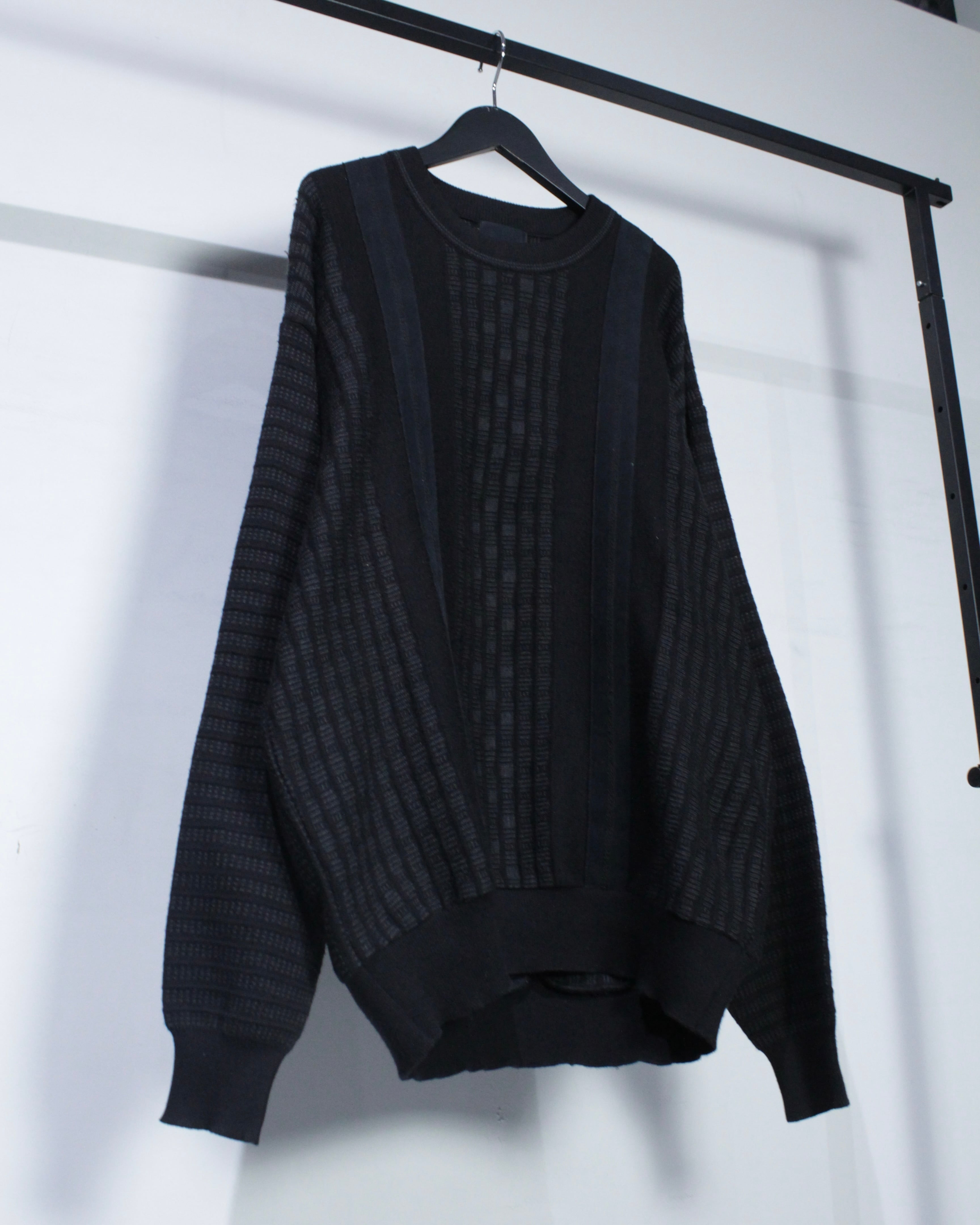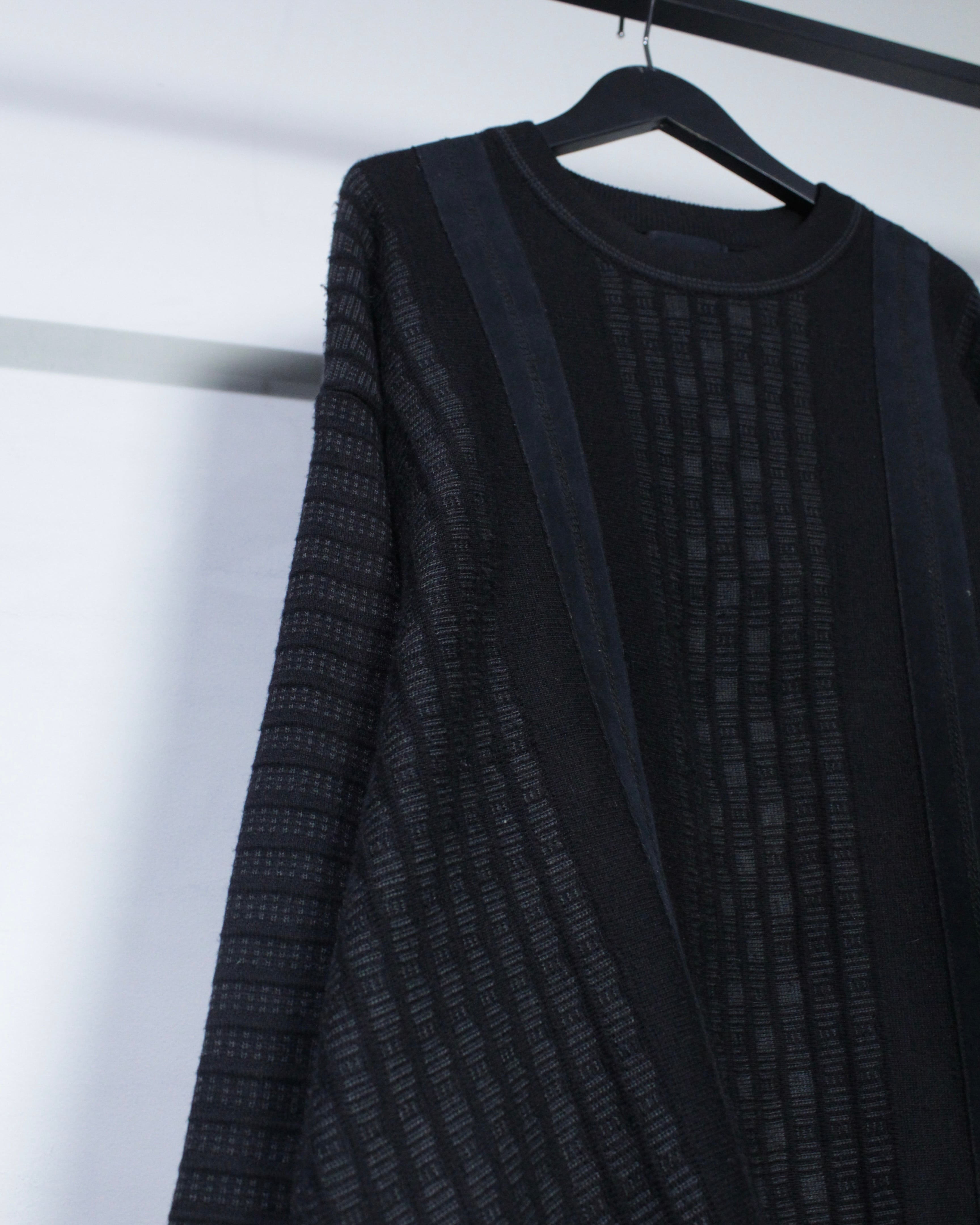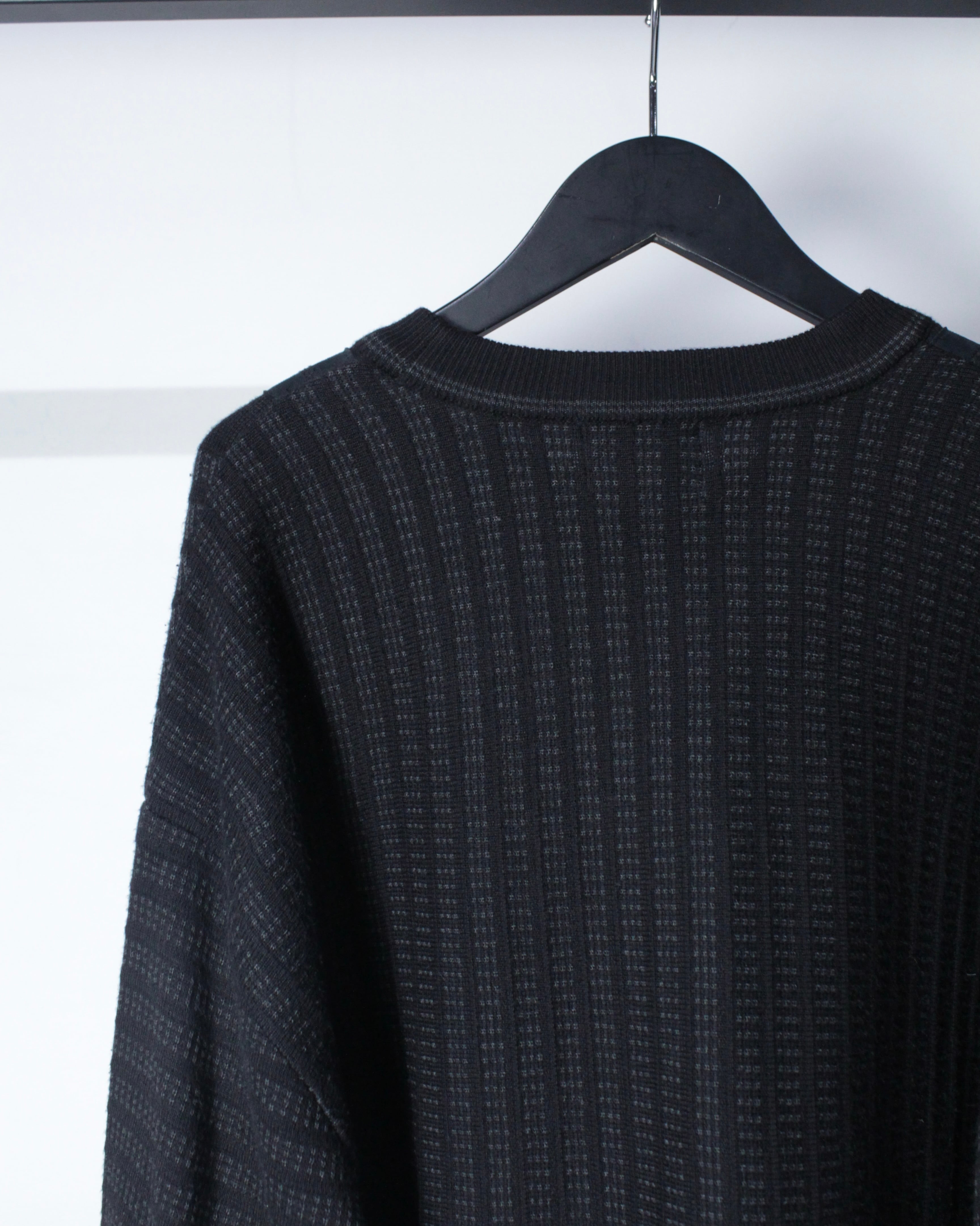 ベースはブラックトーンでまとめたミニマルなニットボディ。フロントにはフェイクスエード素材を縦に切り替えで配置し、同色ながらも質感のコントラストで奥行きを生み出しています。