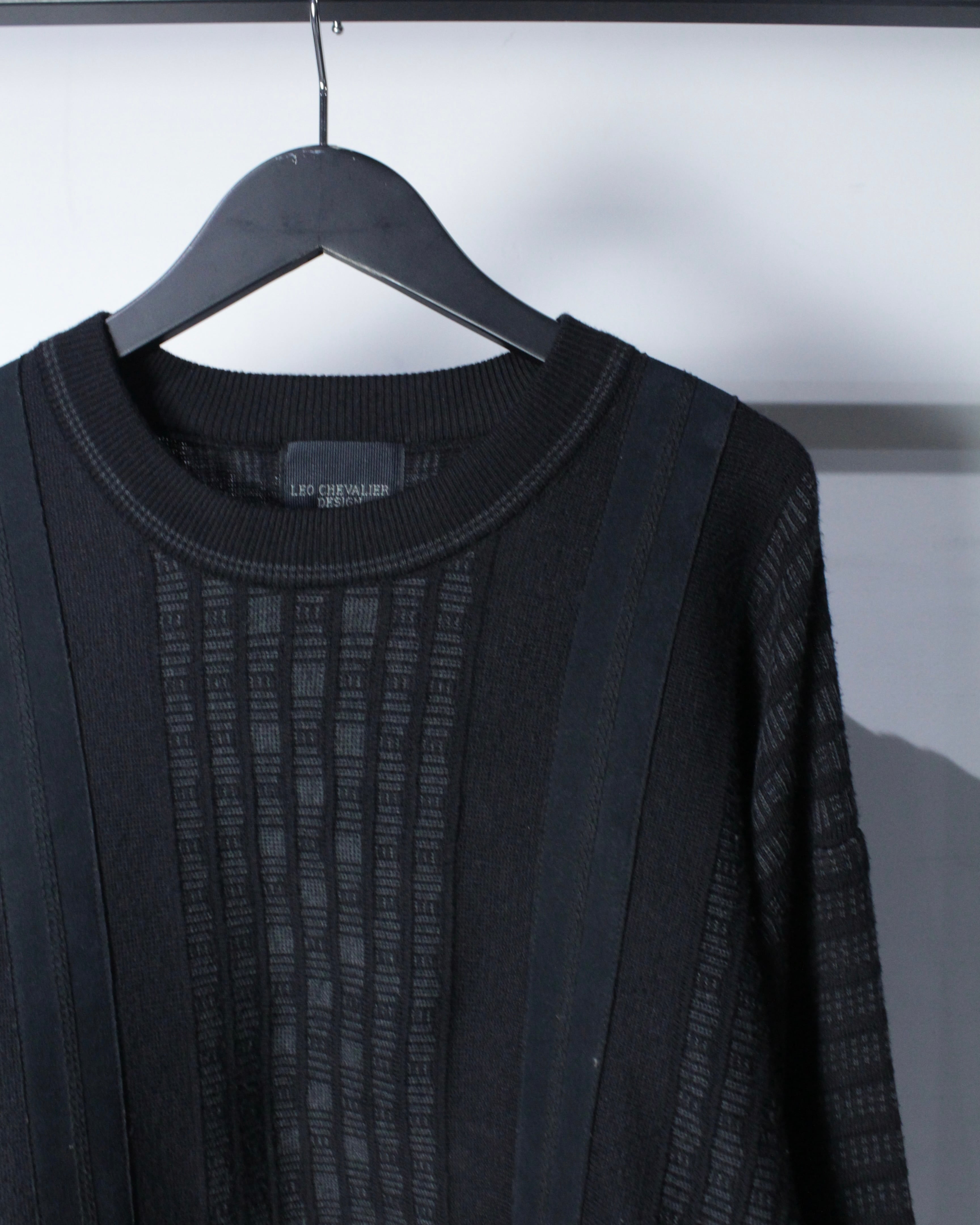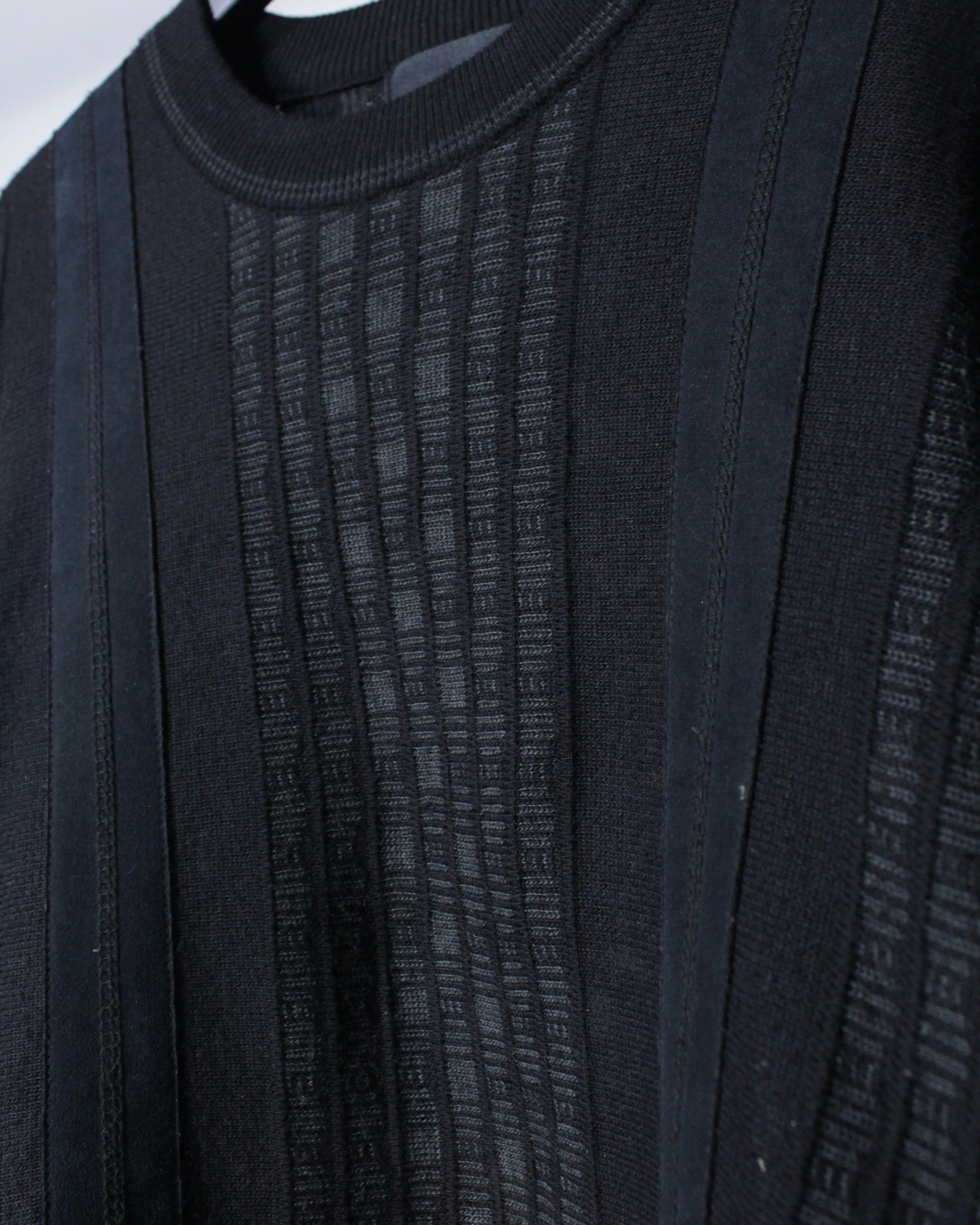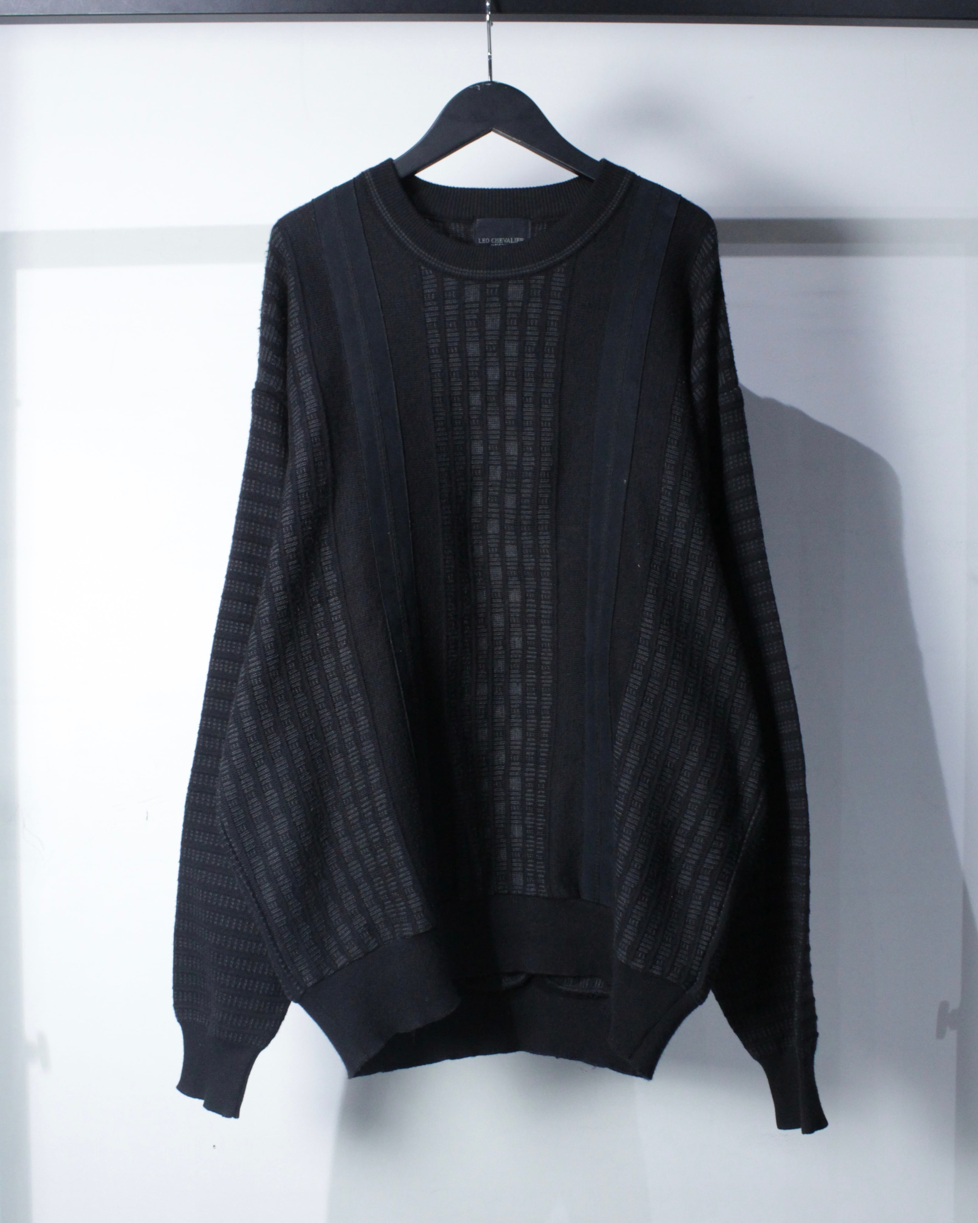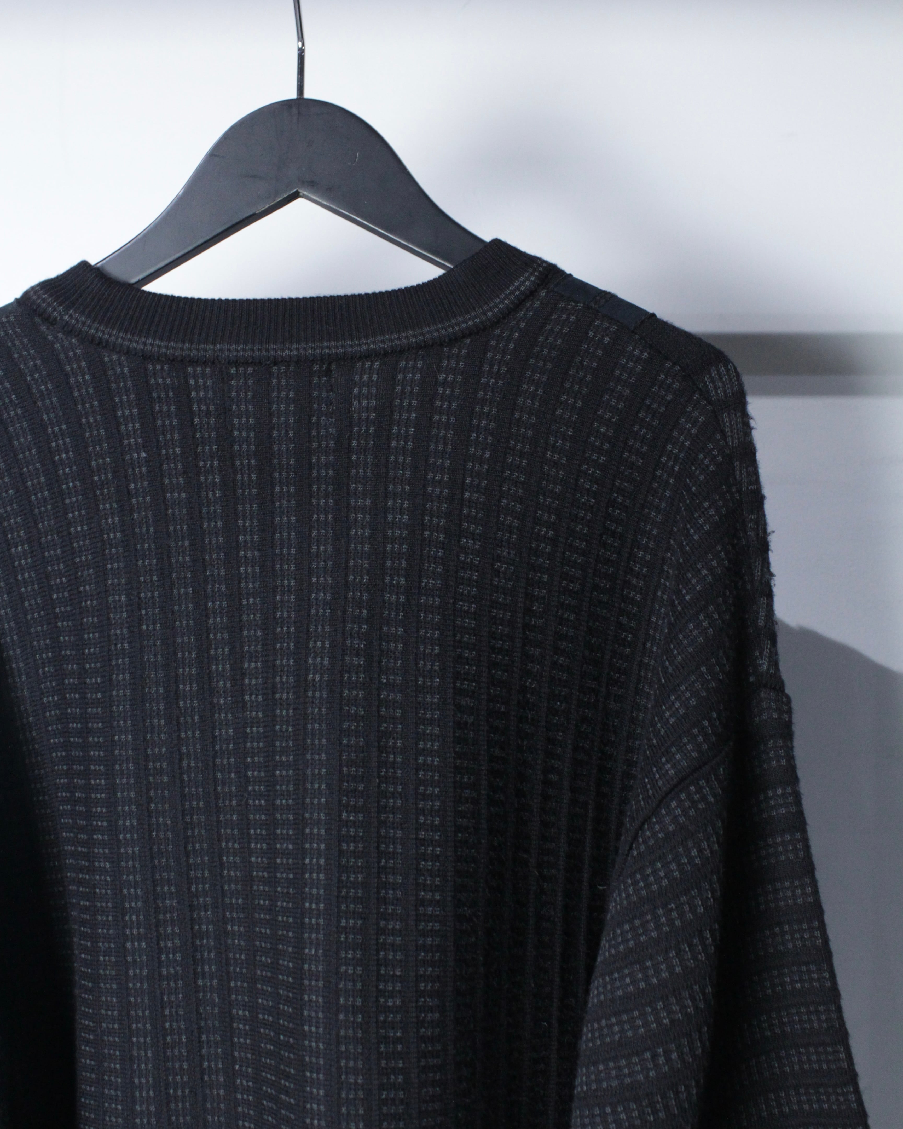 ベースはブラックトーンでまとめたミニマルなニットボディ。フロントにはフェイクスエード素材を縦に切り替えで配置し、同色ながらも質感のコントラストで奥行きを生み出しています。