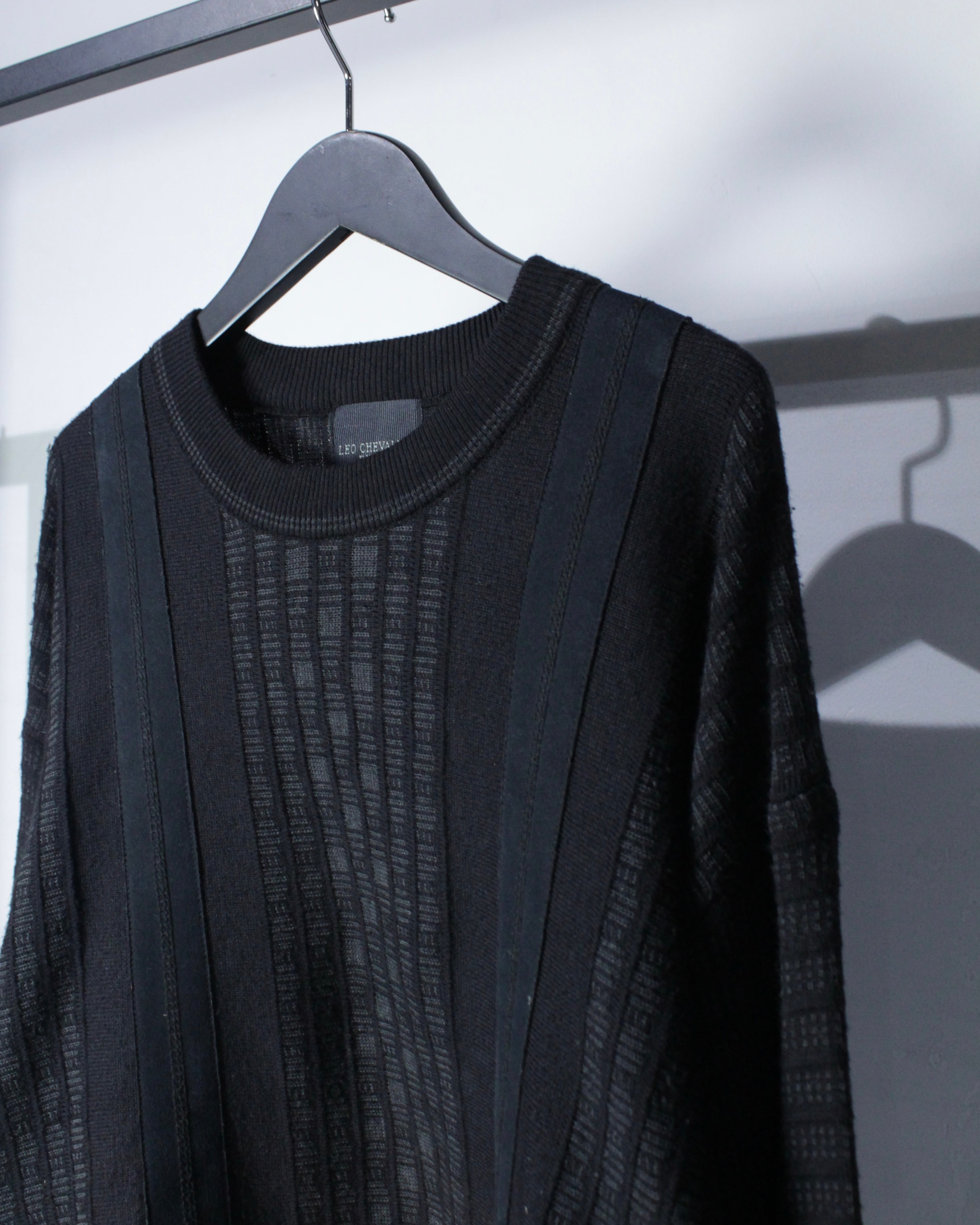 シンプルな表情の中に異素材のエッジが効いた、当店らしいニットの逸品です。