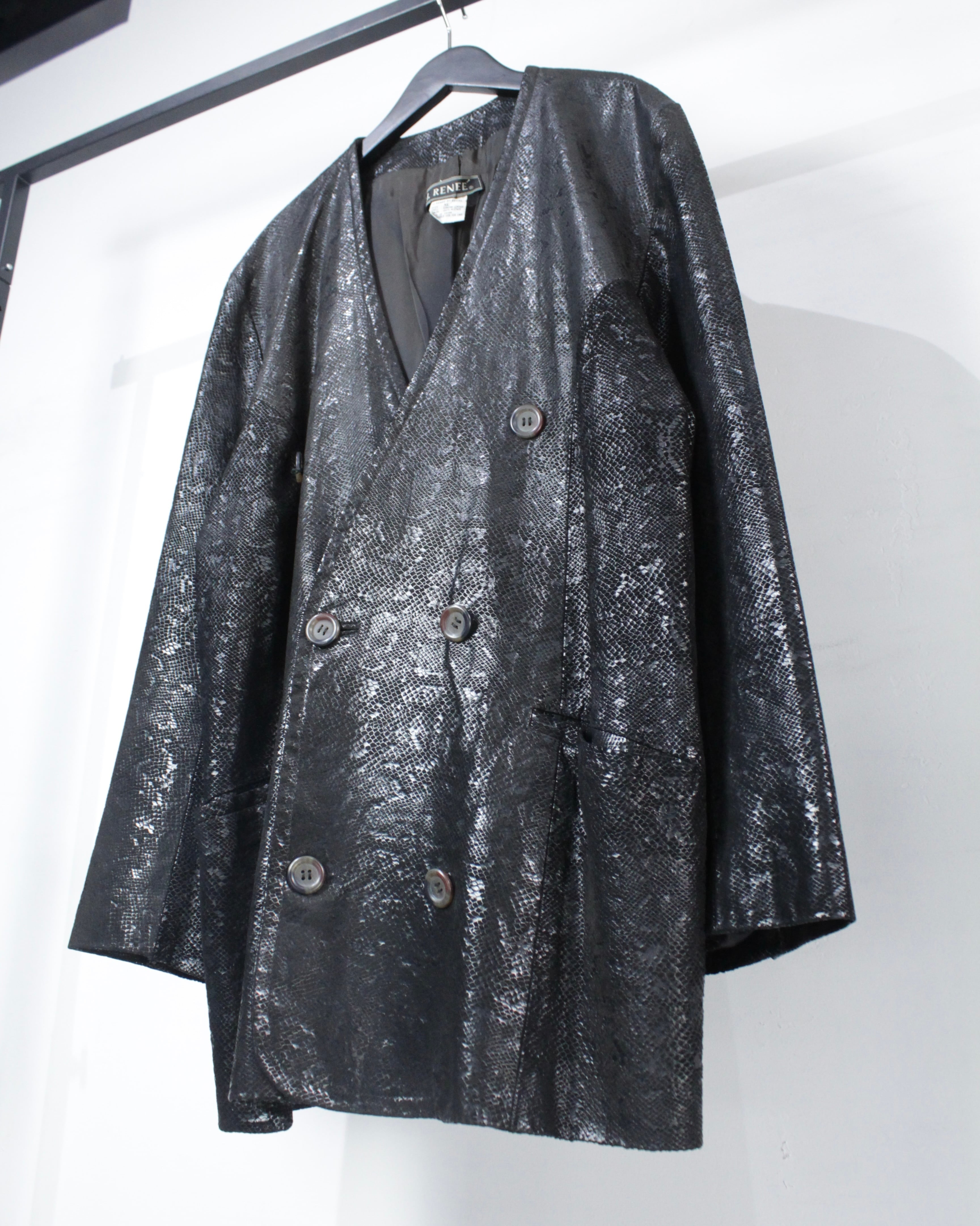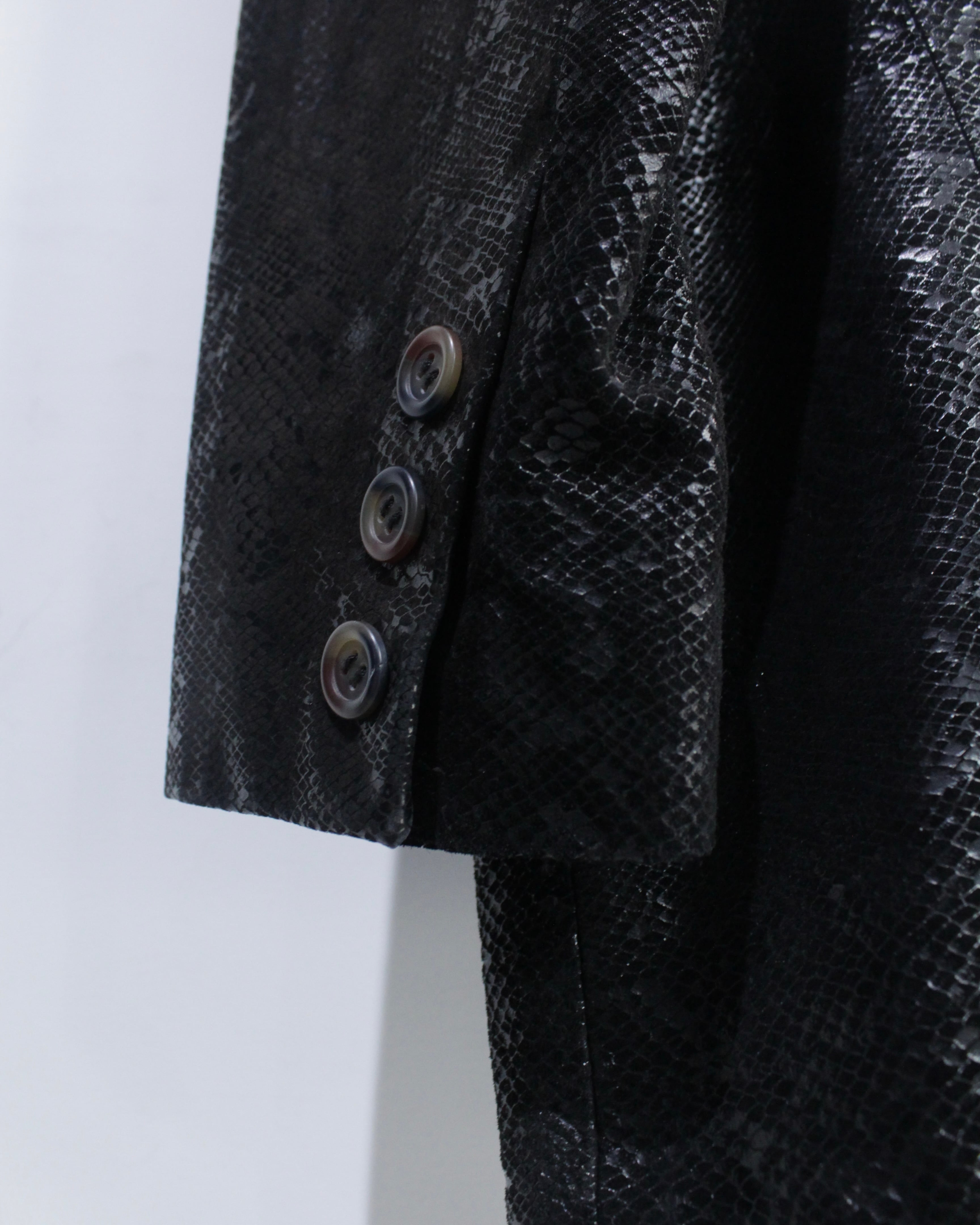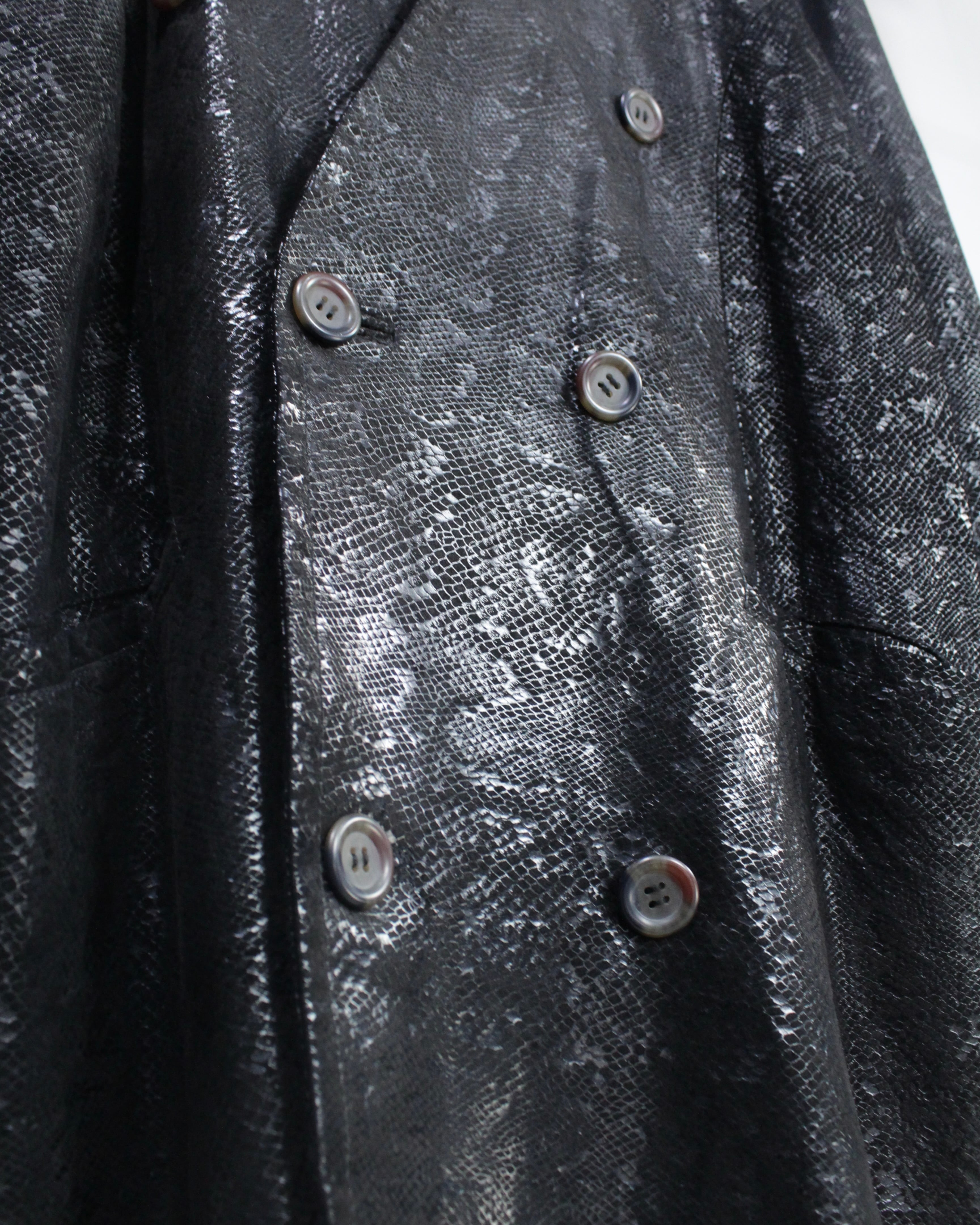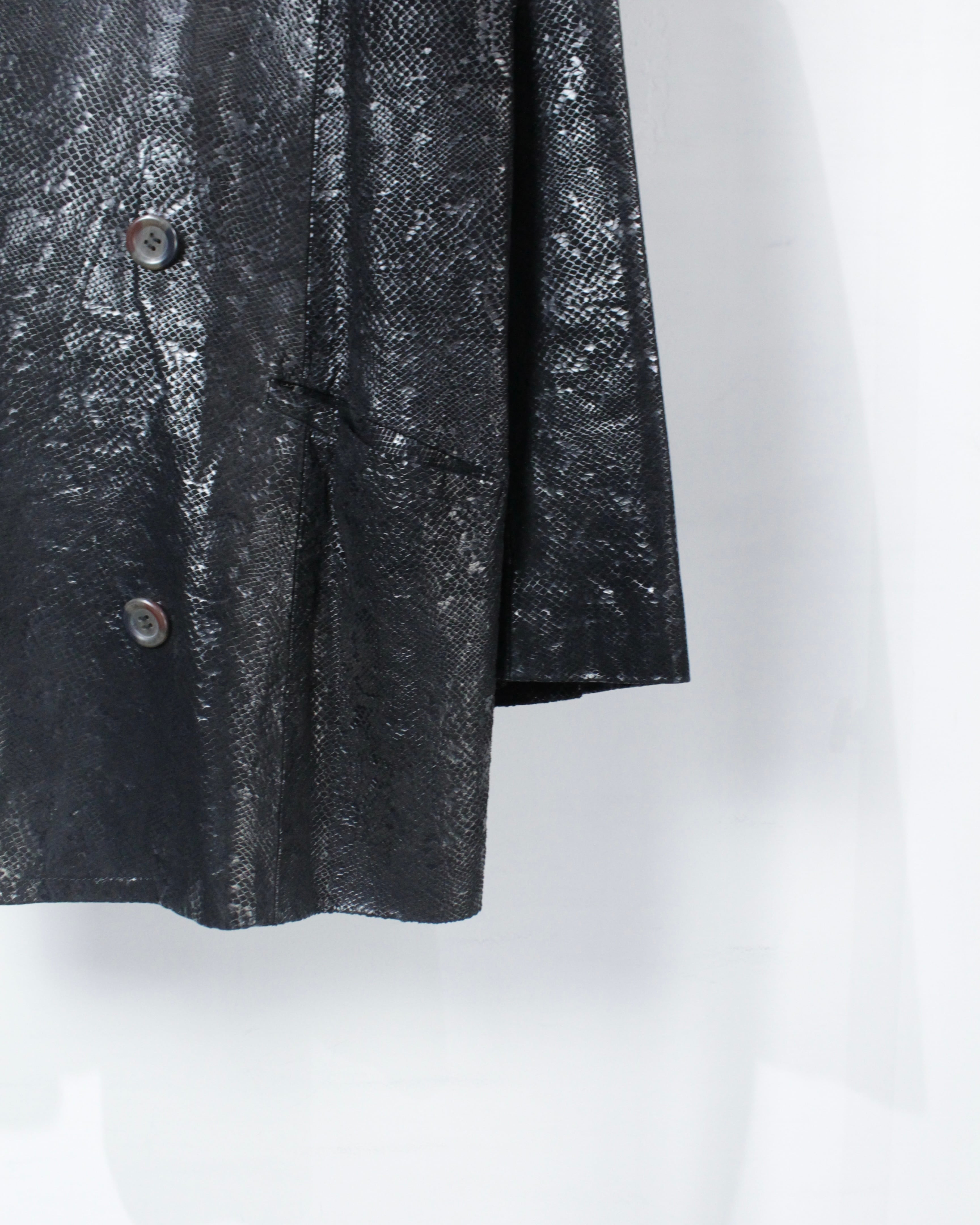 重厚感と艶を併せ持つ、パイソン柄レザーを用いたダブルブレストのテーラードジャケット。