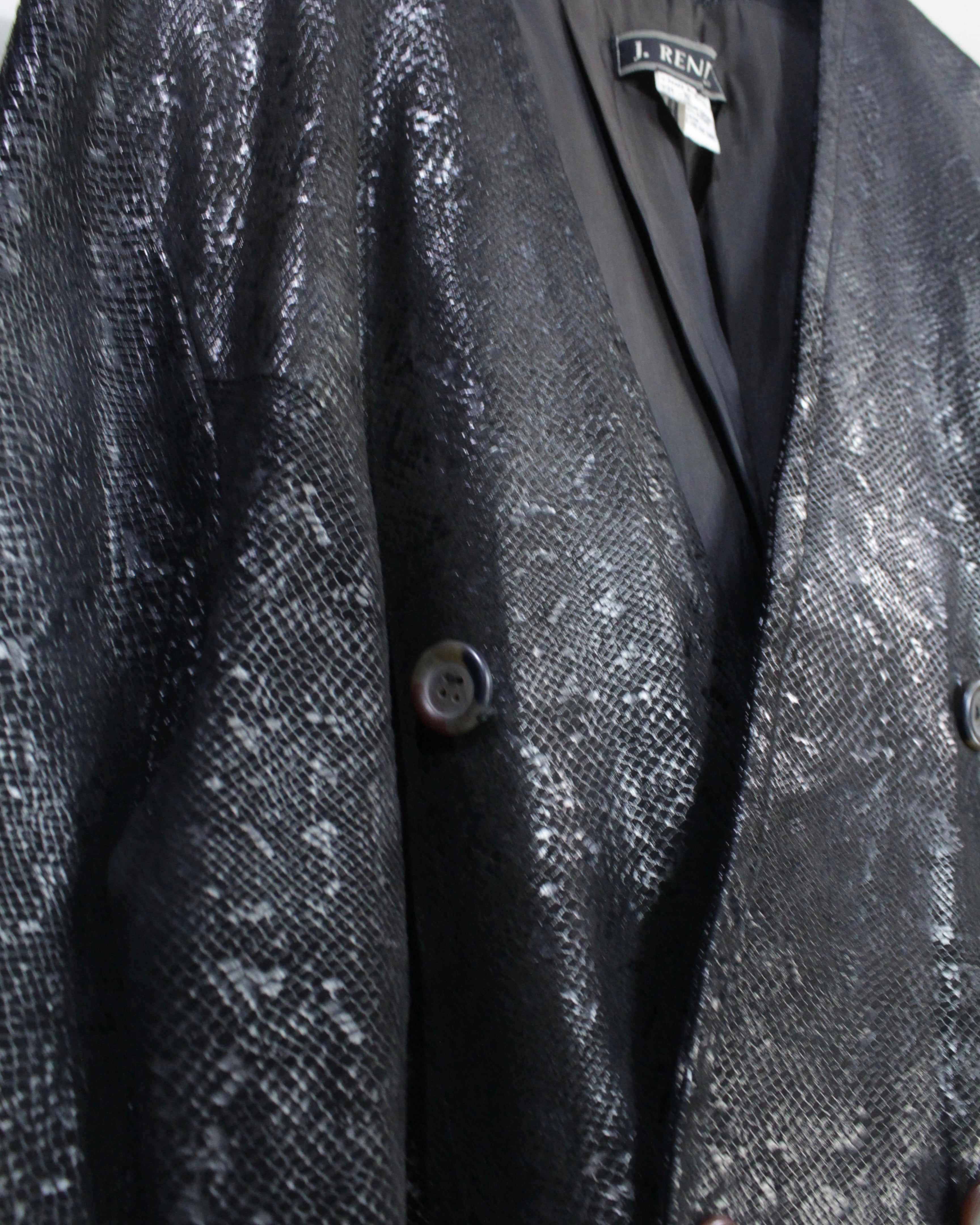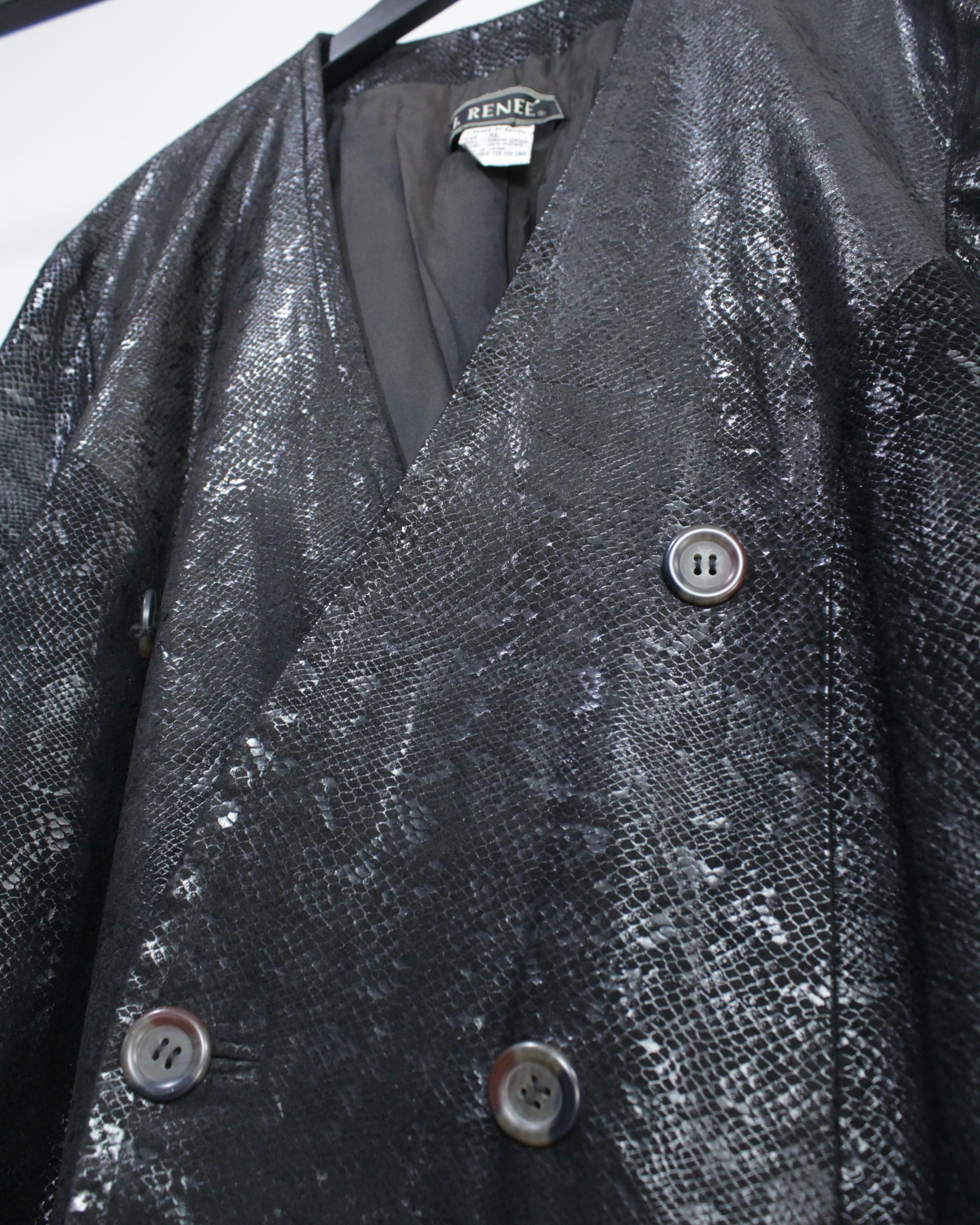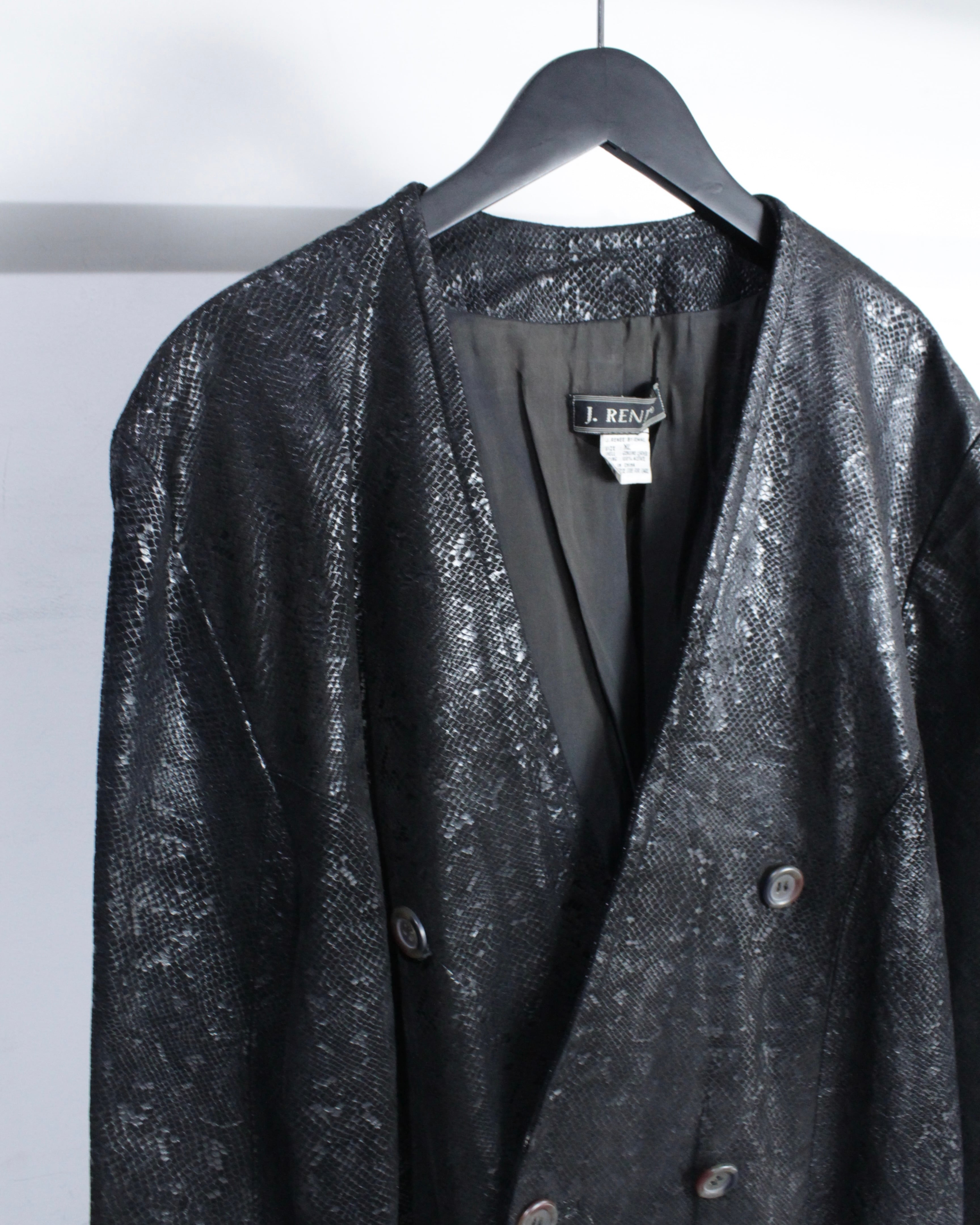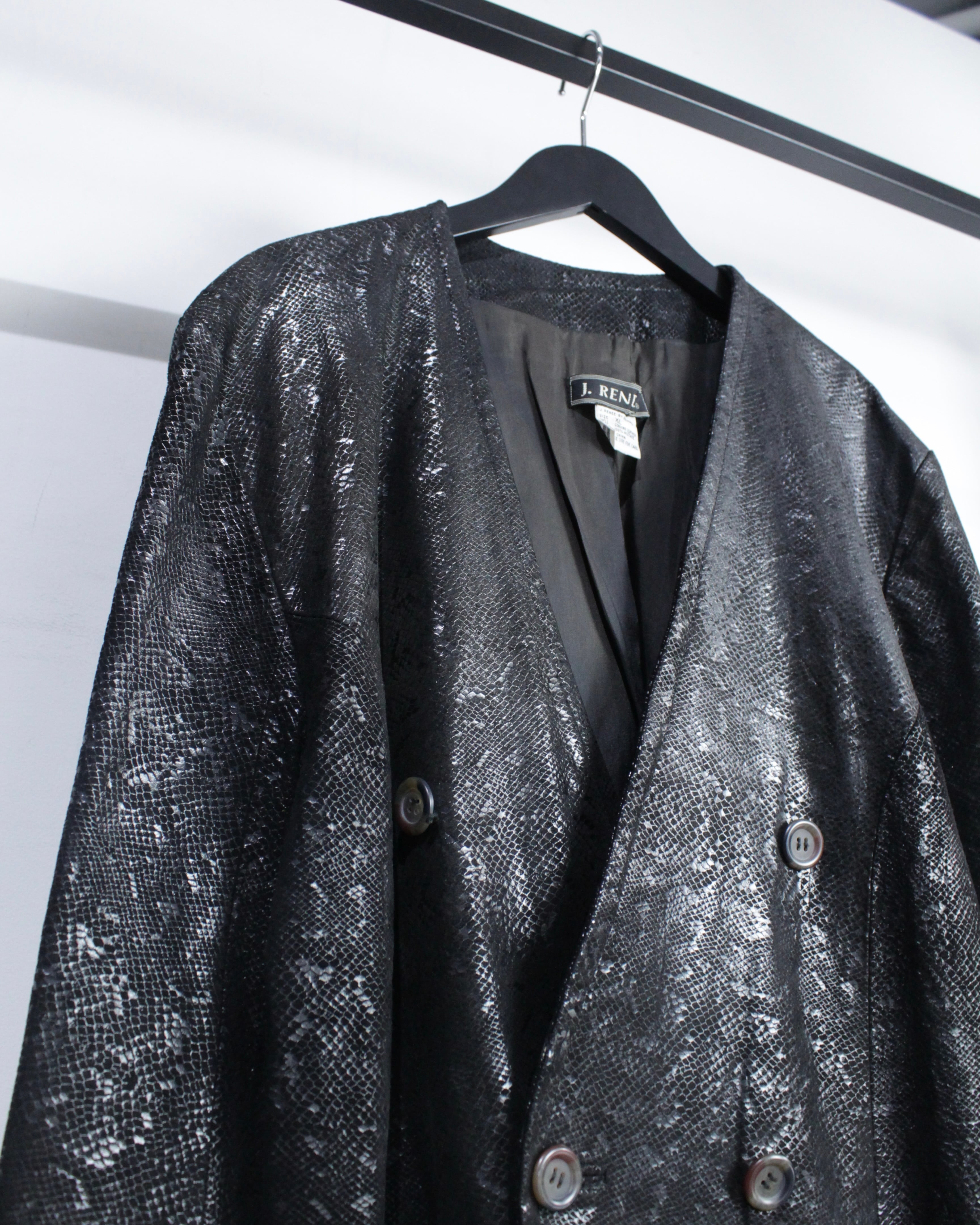 重厚感と艶を併せ持つ、パイソン柄レザーを用いたダブルブレストのテーラードジャケット。