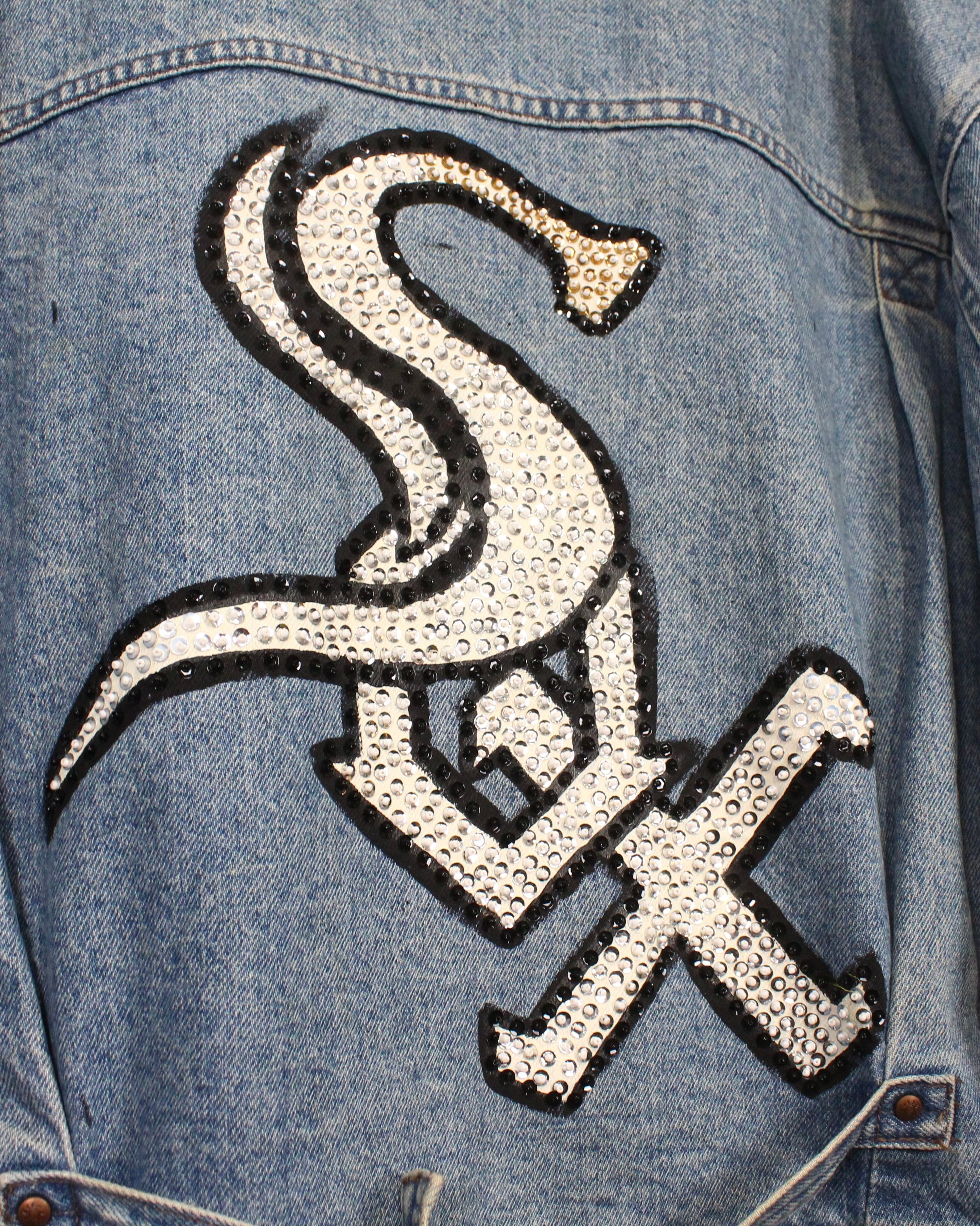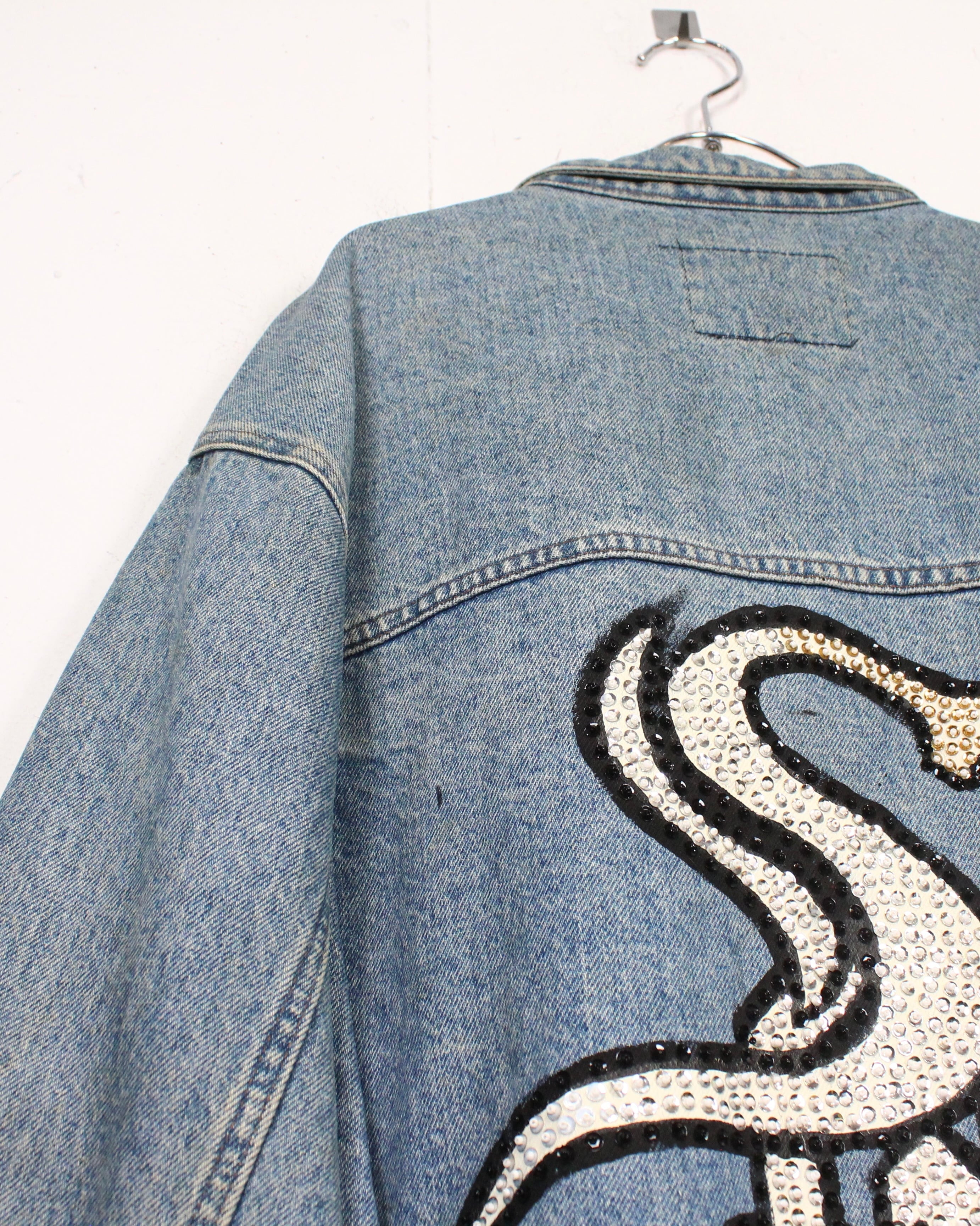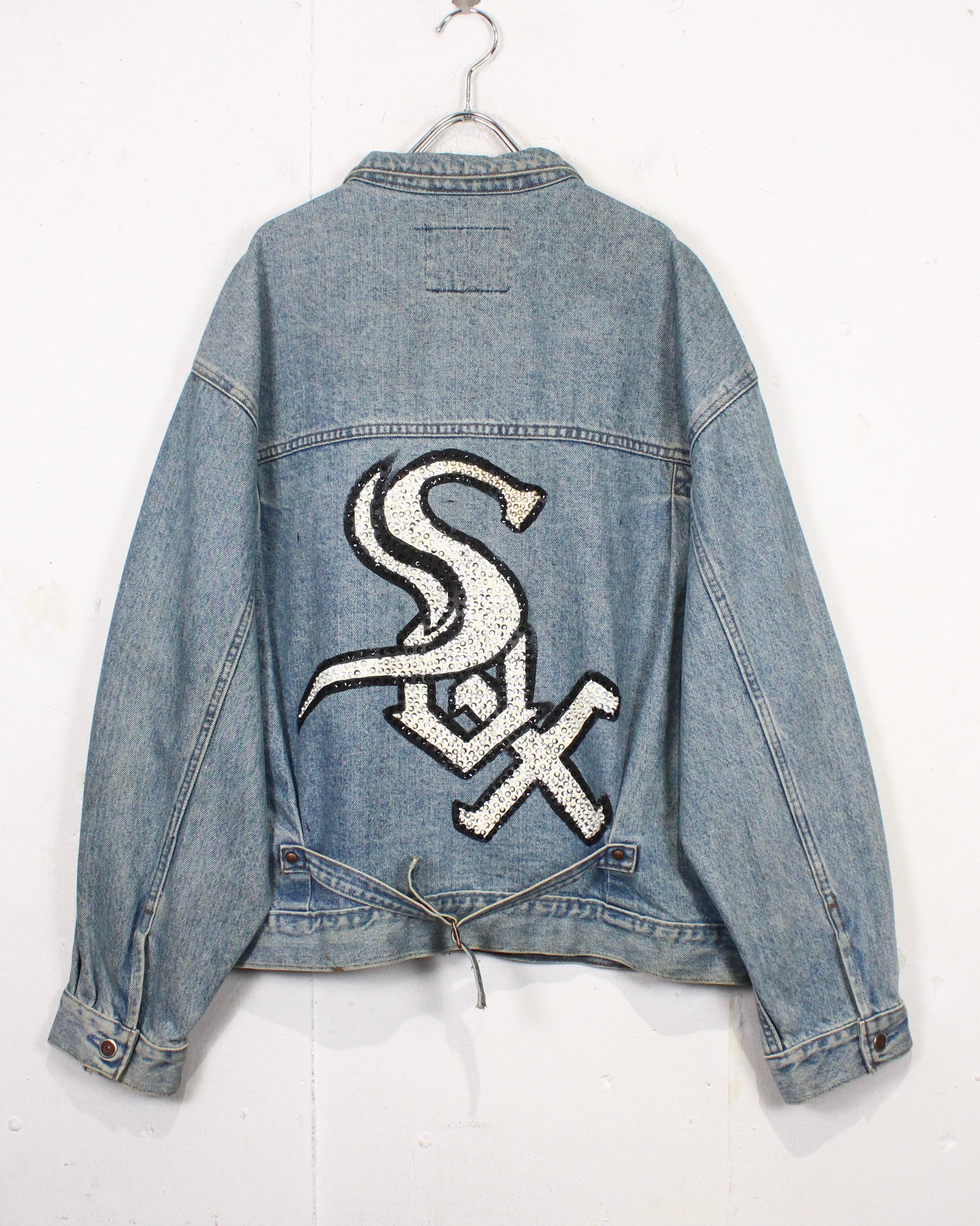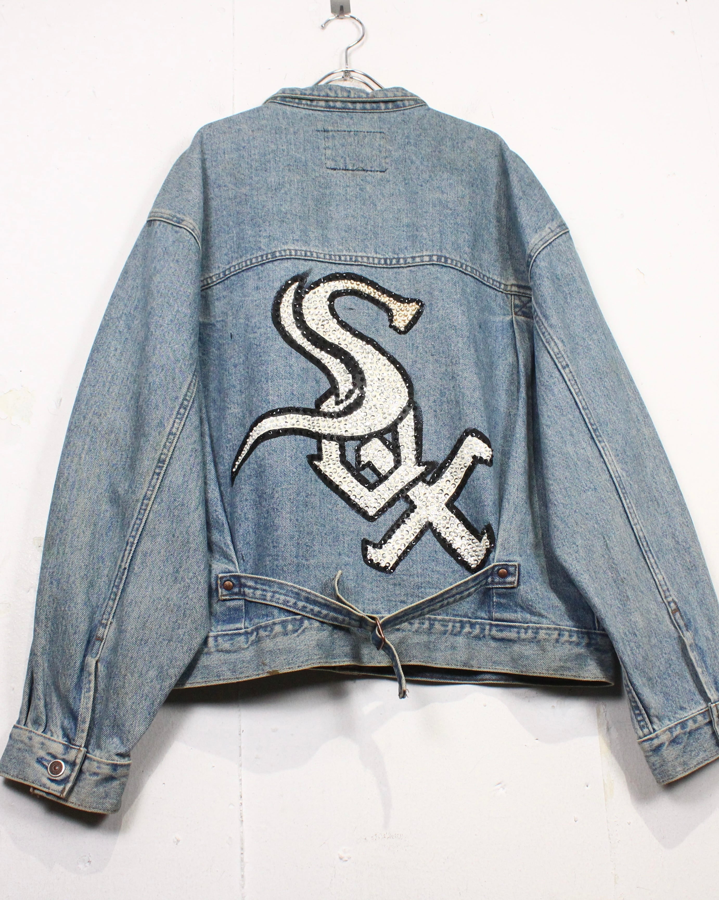 フェードの効いたライトインディゴのデニムをボディに使用。背面にホワイトソックスのエンブレムを、ペイント×ラインストーンによって載せた1着。