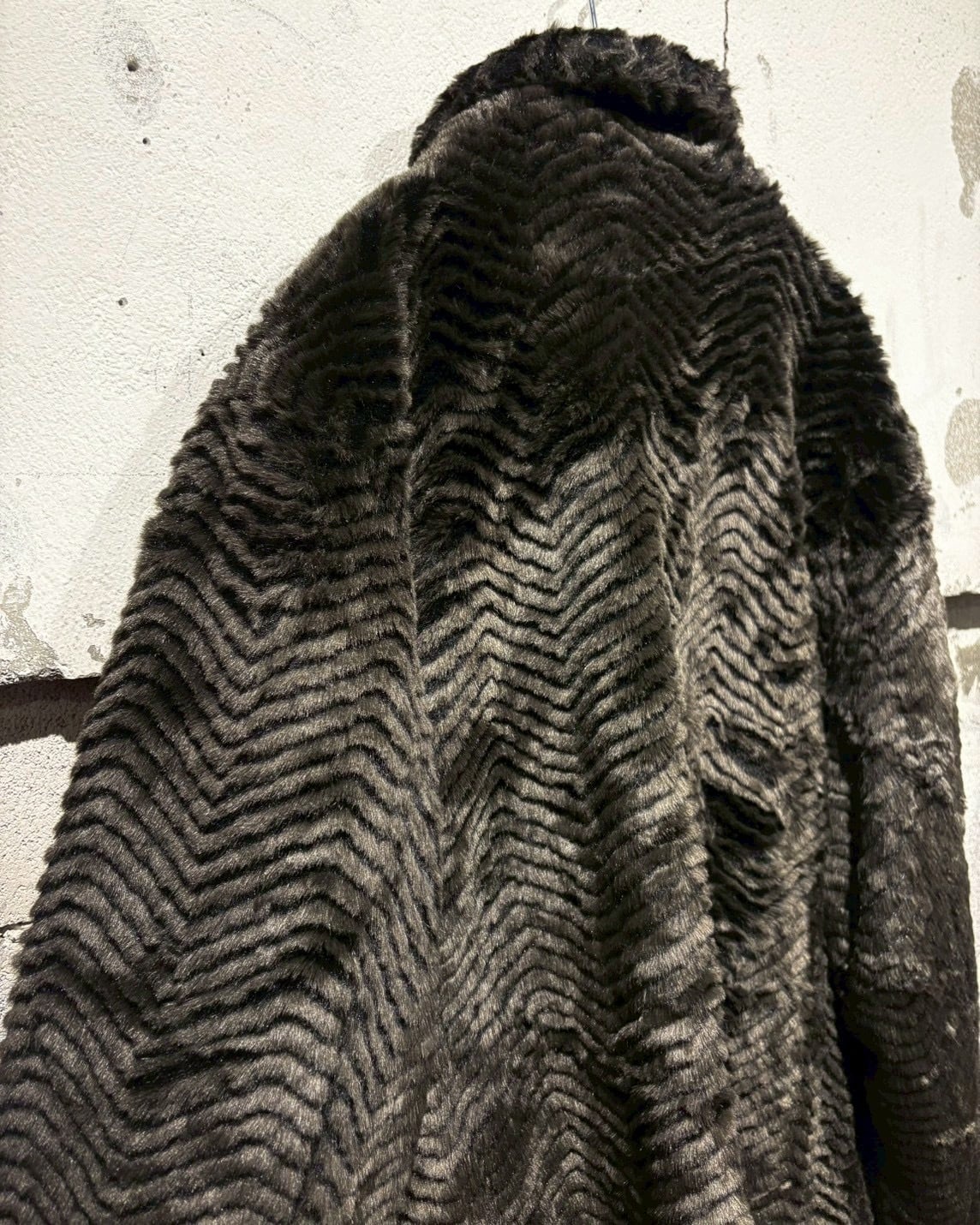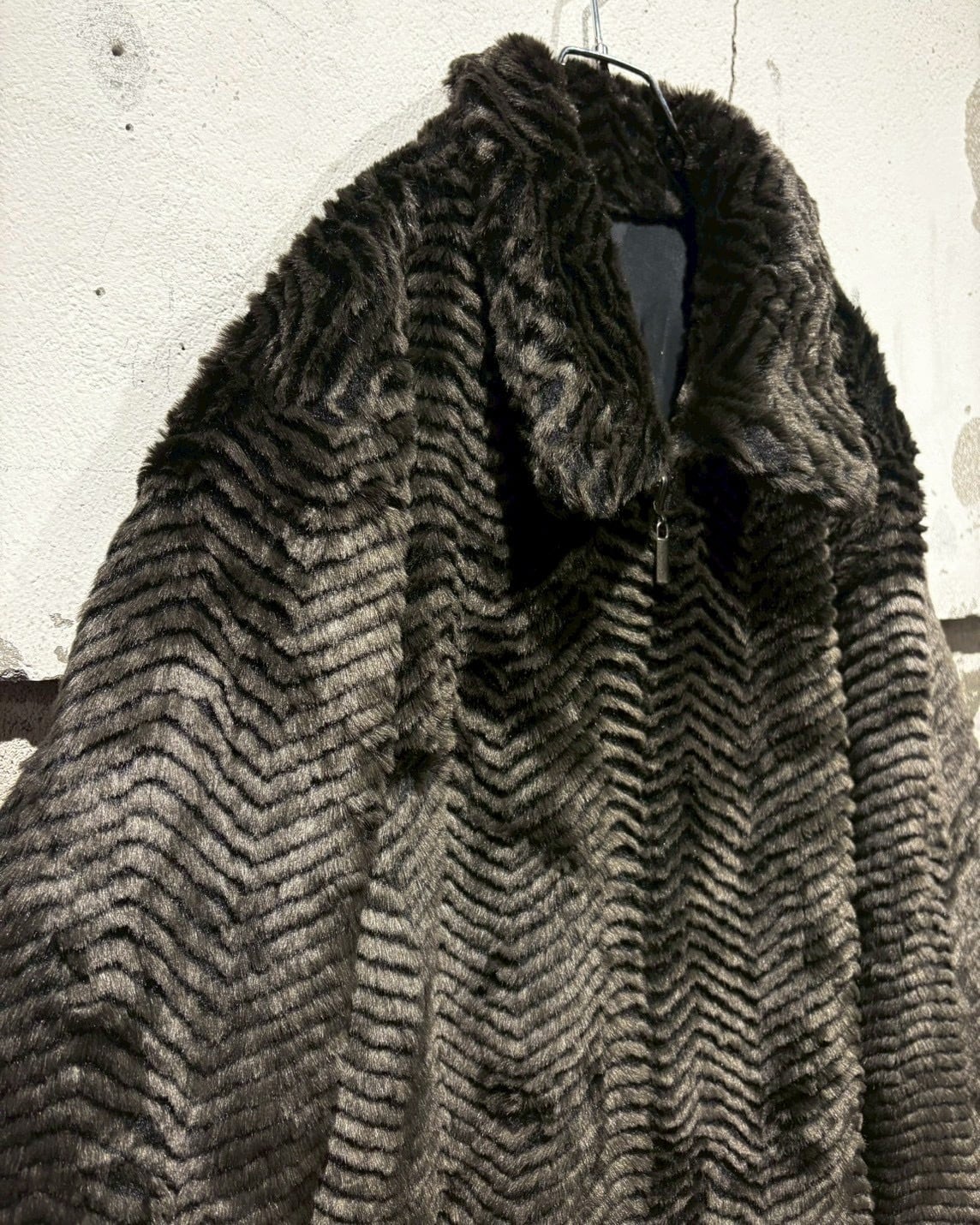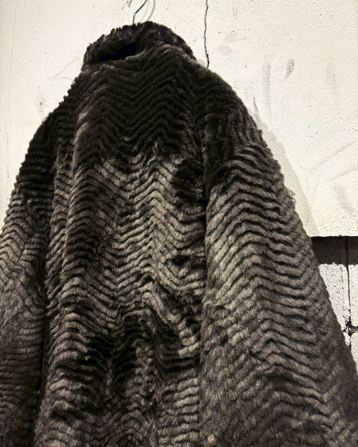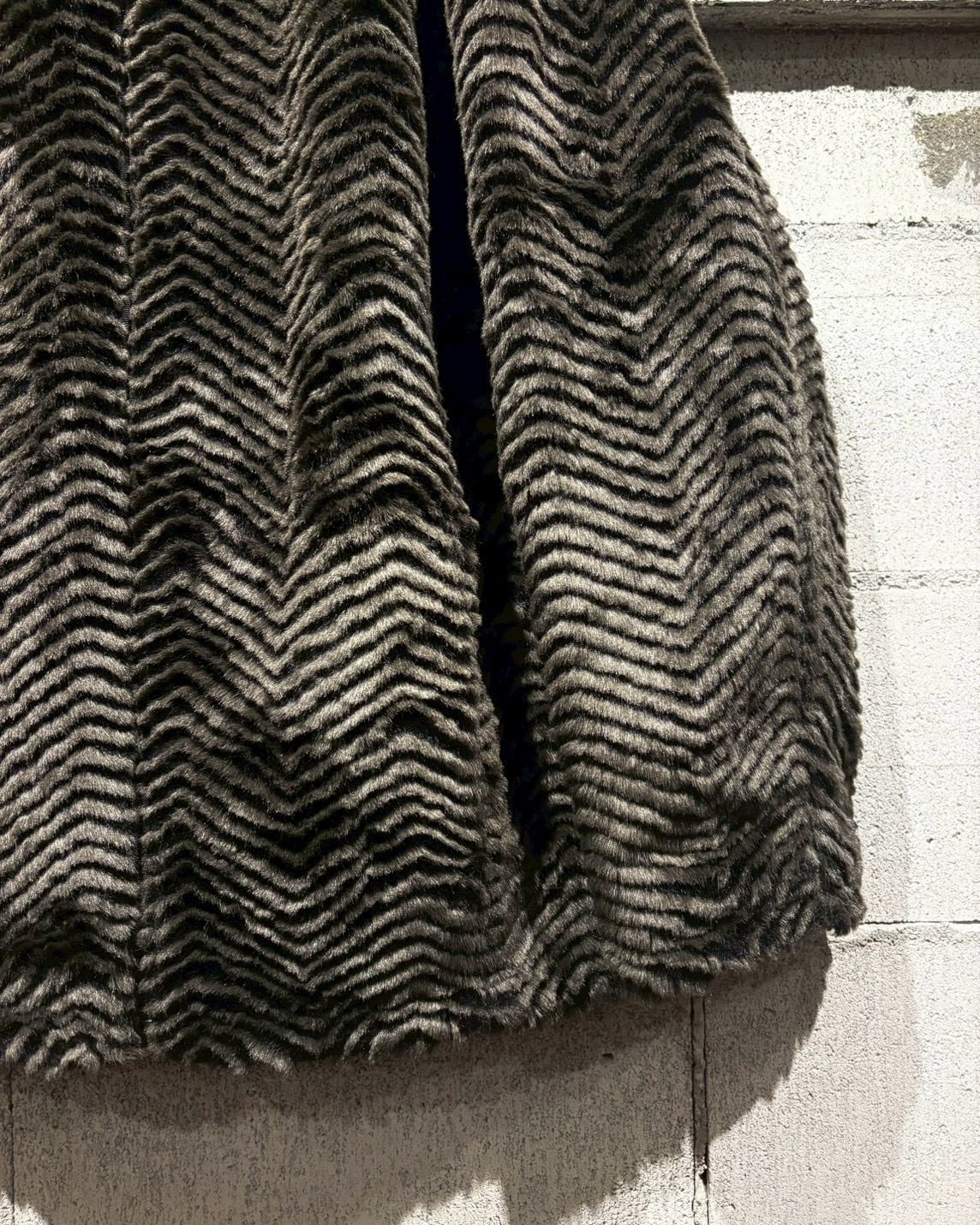 片面には、ジグザグ状に表情をつけたフェイクファーを贅沢に使用。毛足の流れによって生まれる陰影が奥行きを演出し、しっかりと存在感を放つ仕上がりに。ラグジュアリーでムードのある佇まいが魅力です。