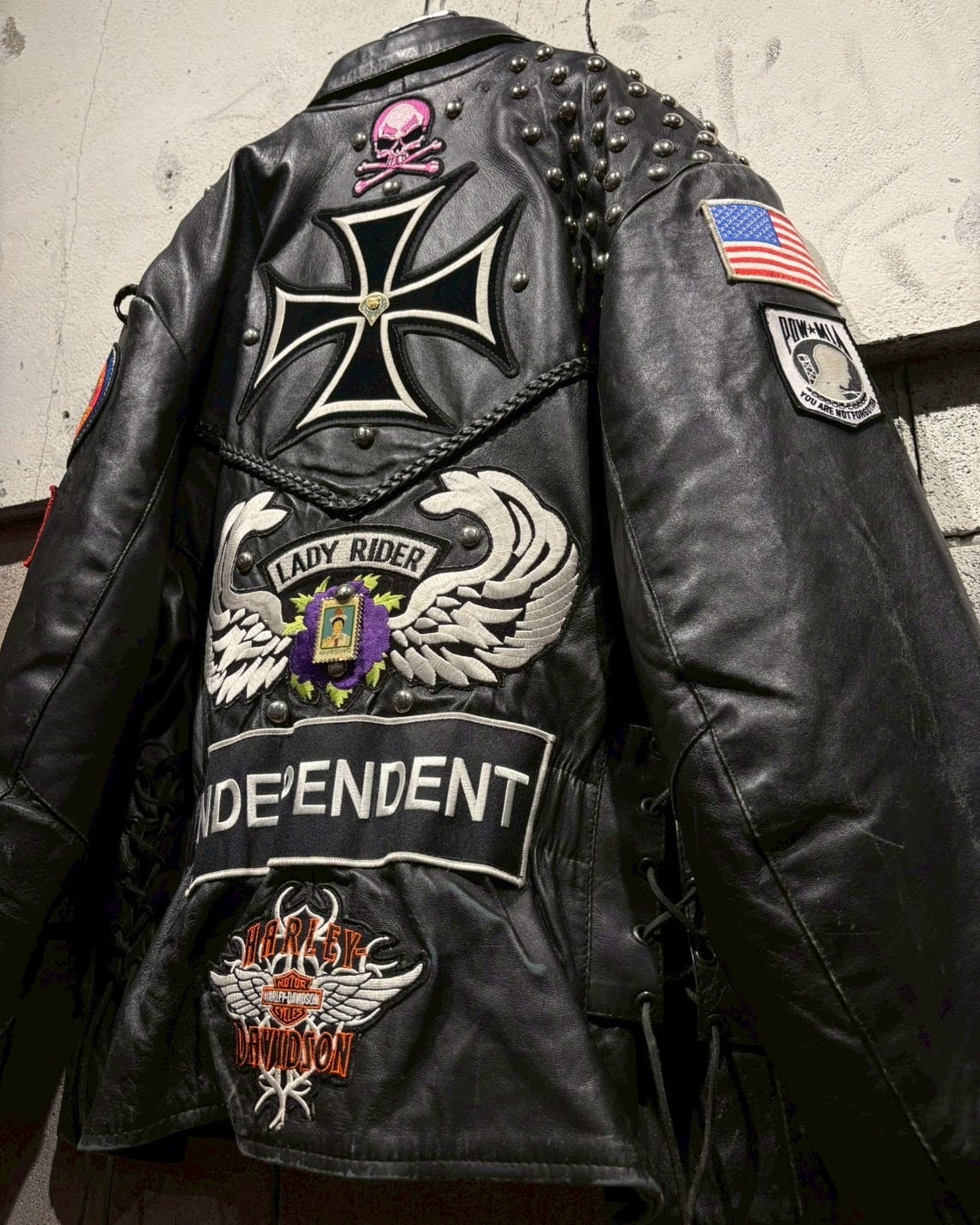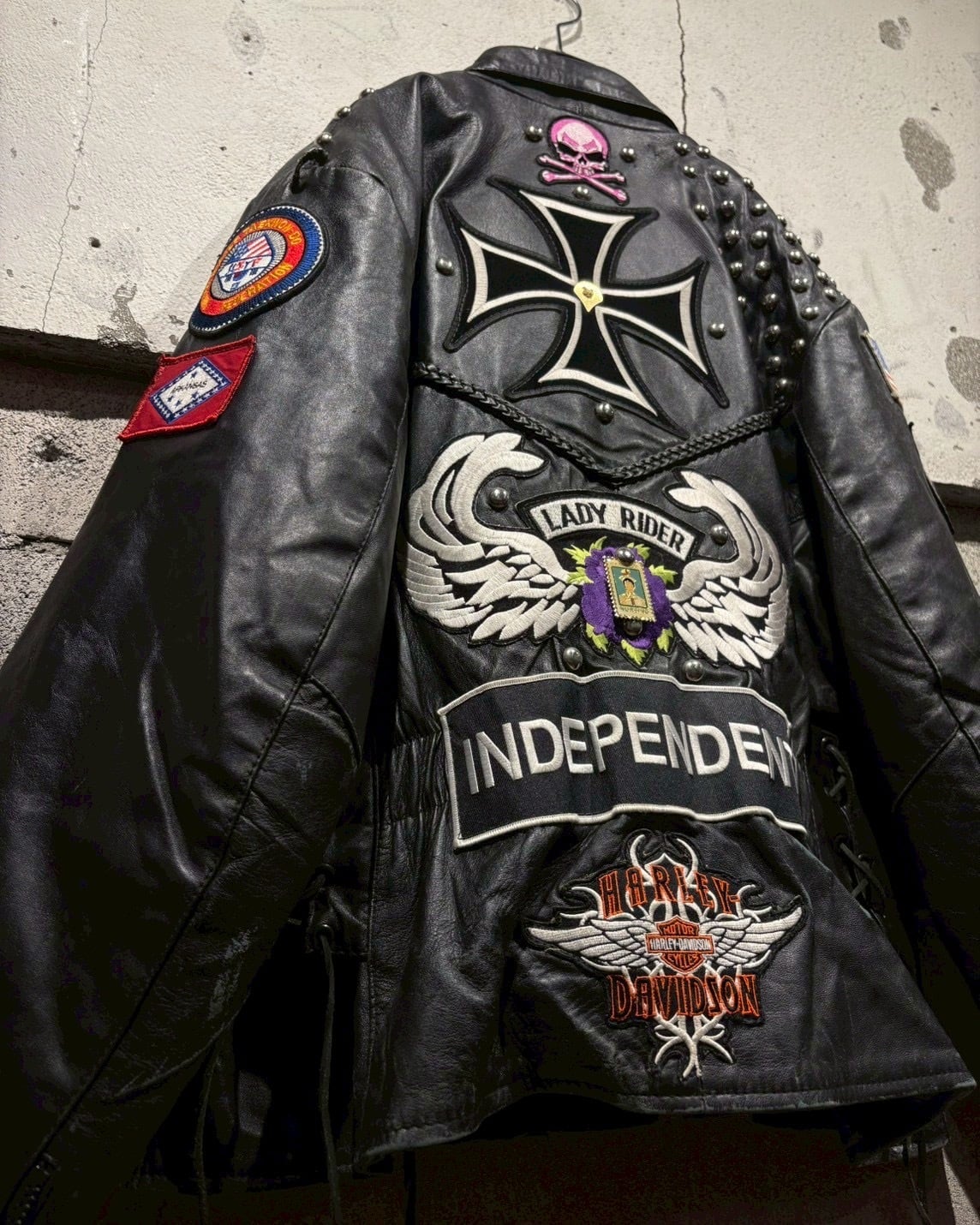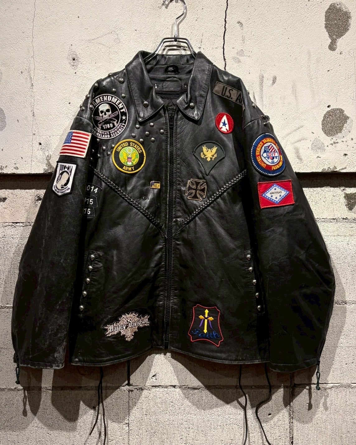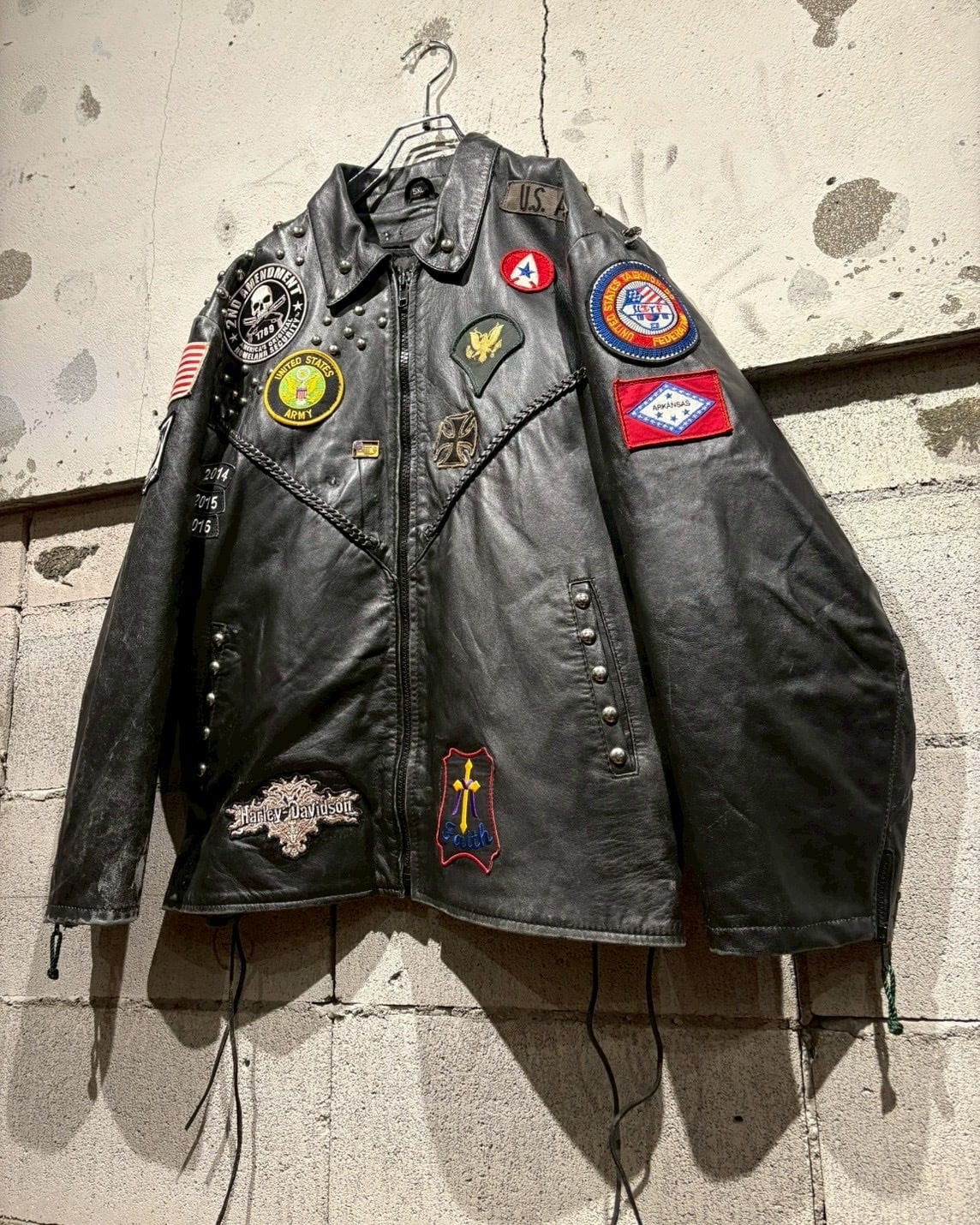 Harley-Davidsonのワッペンをはじめ、アイアンクロス、スカル、ミリタリーパッチ、スタッズといった数々のワッペンが配置されており、装飾の一つ一つから相当なバイク愛とカスタムセンスを感じさせる仕上がりです。