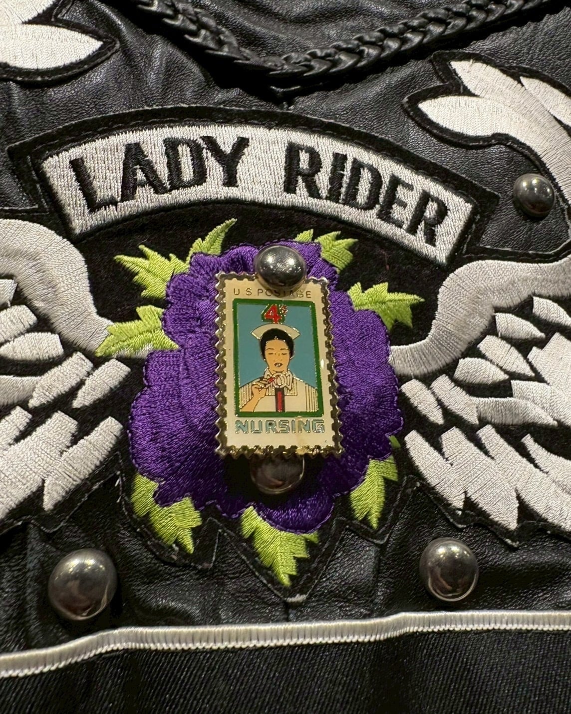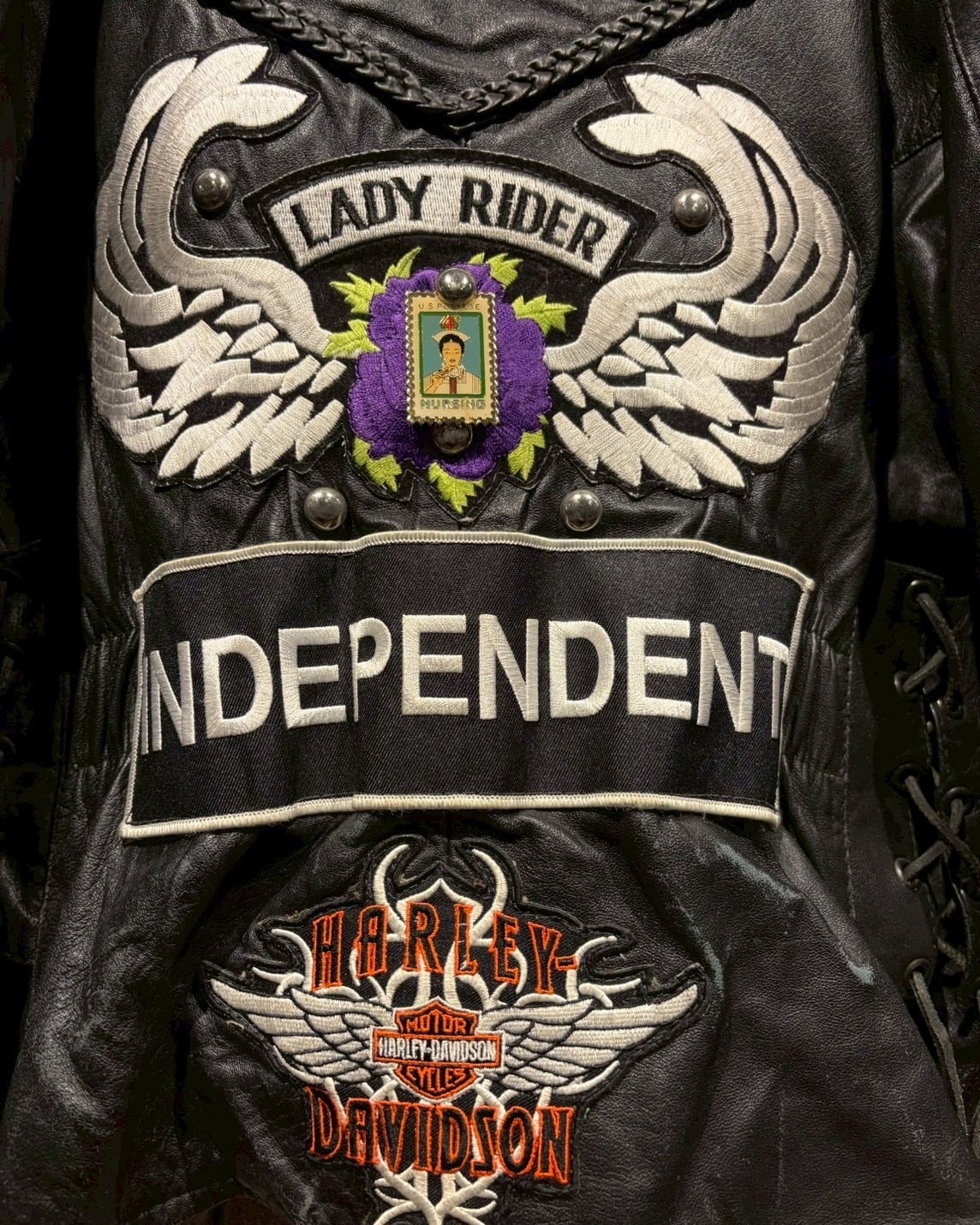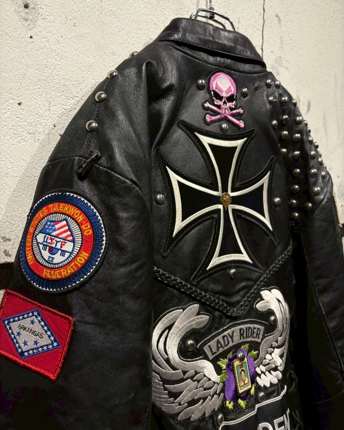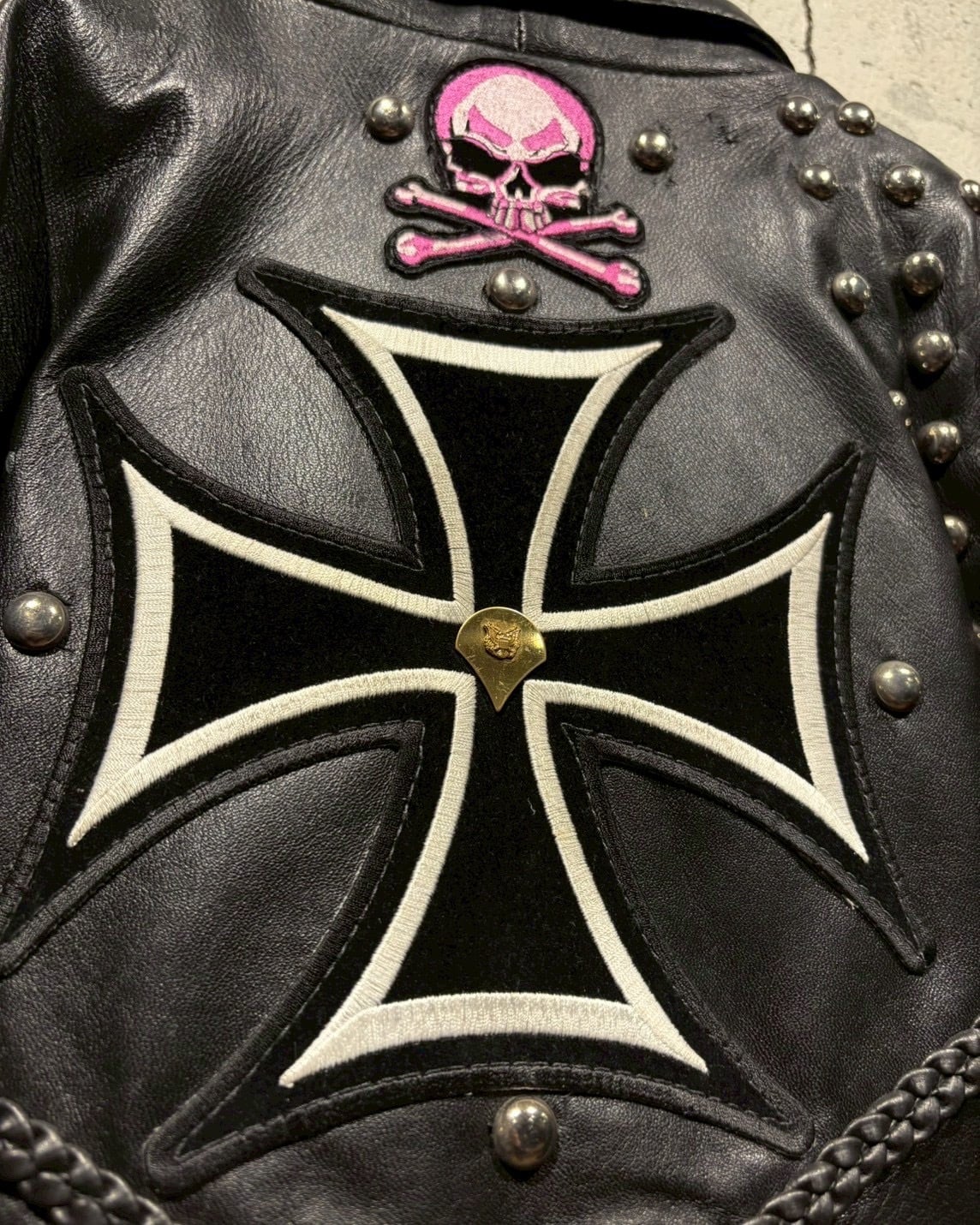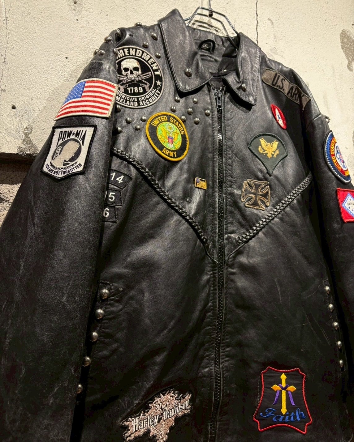 Harley-Davidsonのワッペンをはじめ、アイアンクロス、スカル、ミリタリーパッチ、スタッズといった数々のワッペンが配置されており、装飾の一つ一つから相当なバイク愛とカスタムセンスを感じさせる仕上がりです。