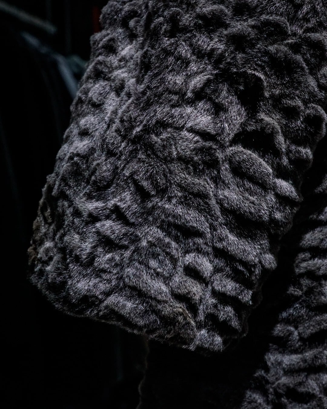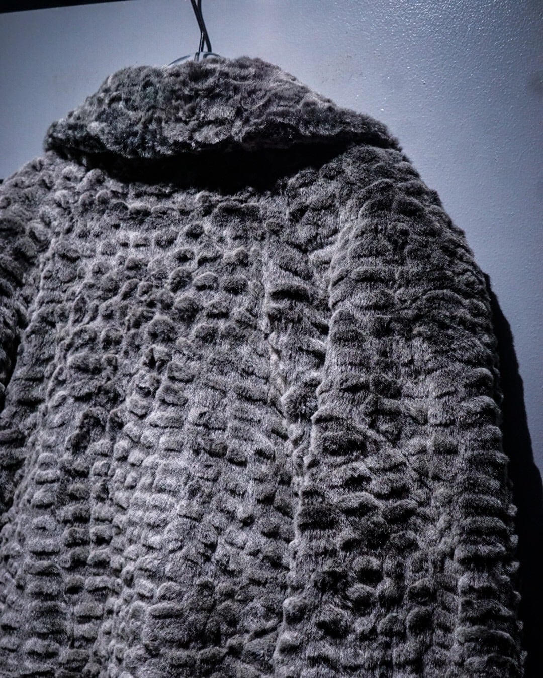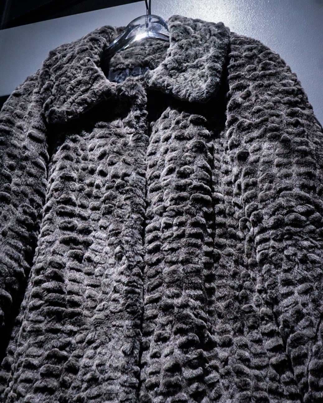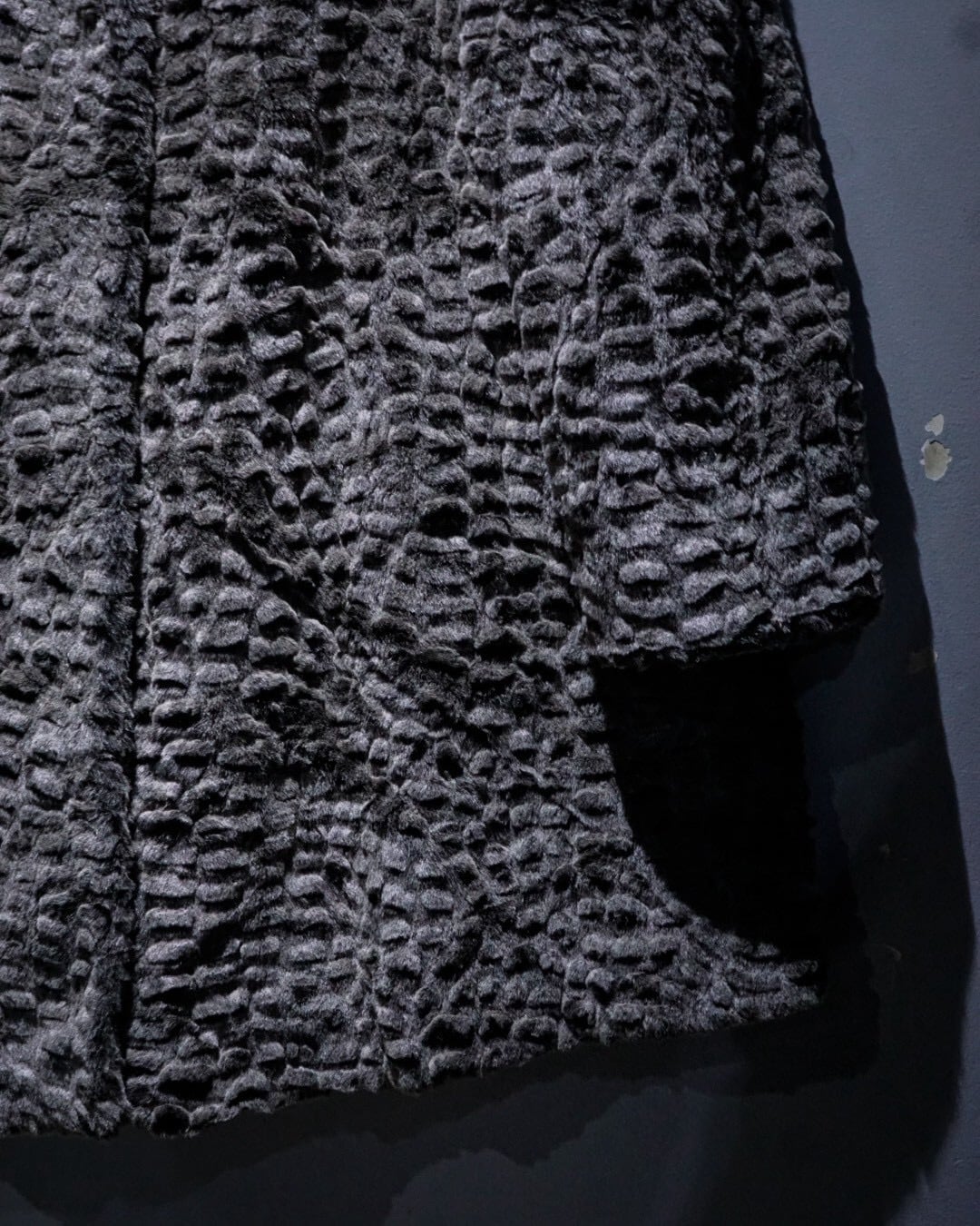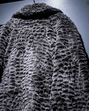 滑らかな毛足と凹凸のある立体的な表情が特徴的なフェイクファーコート。