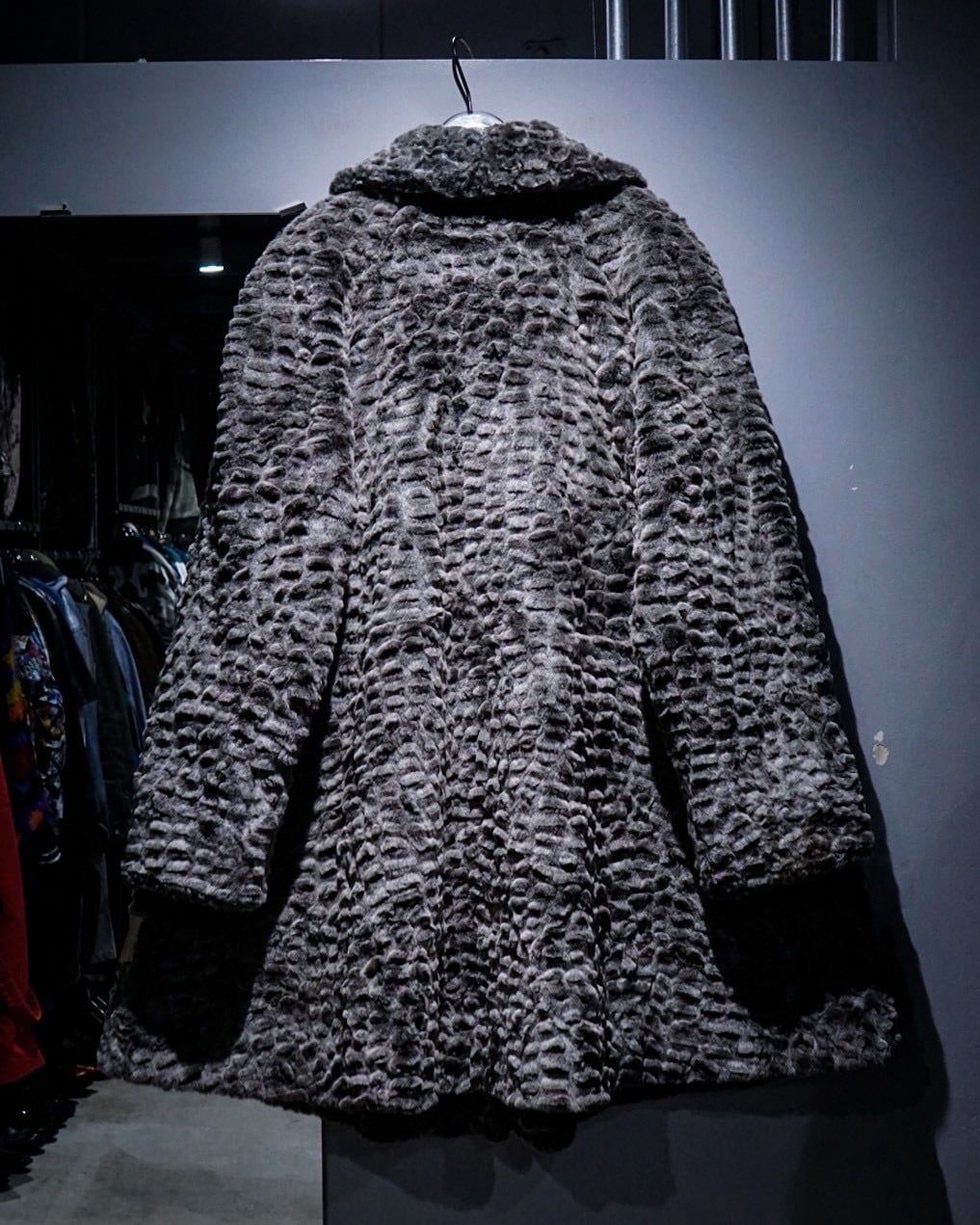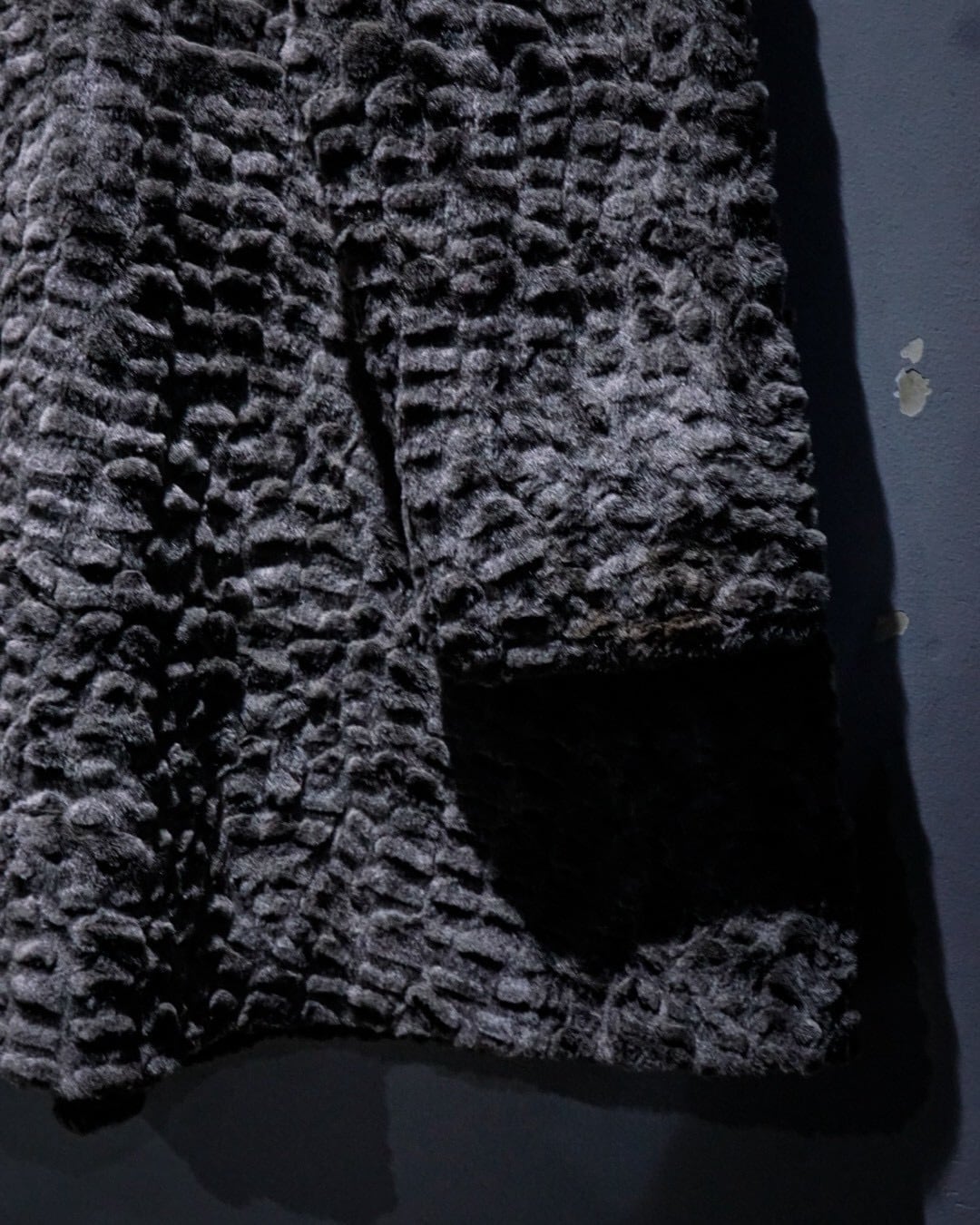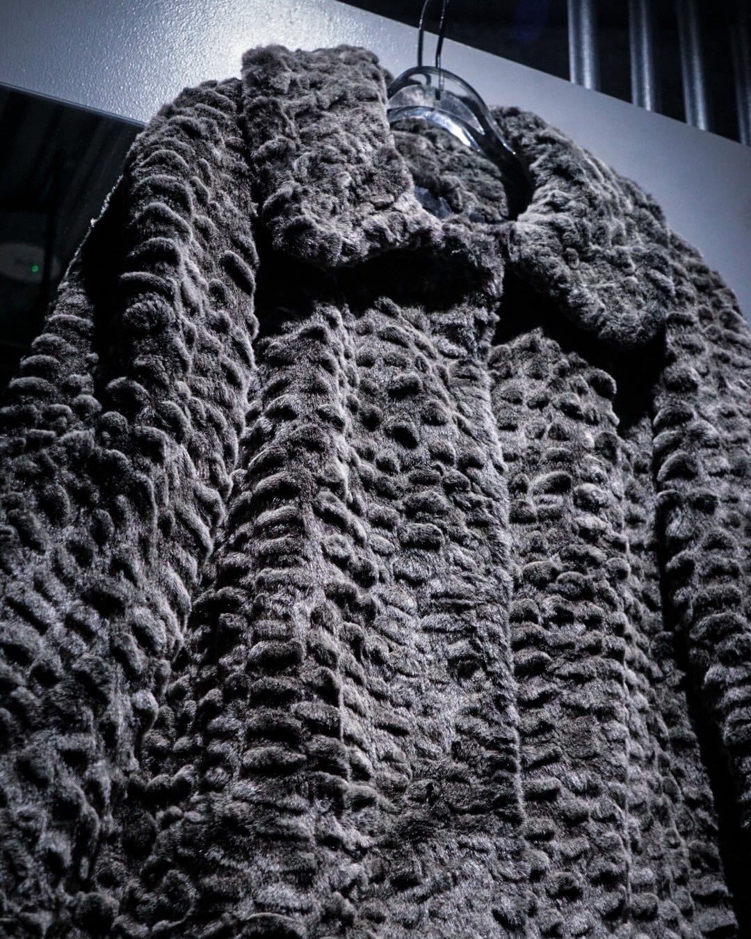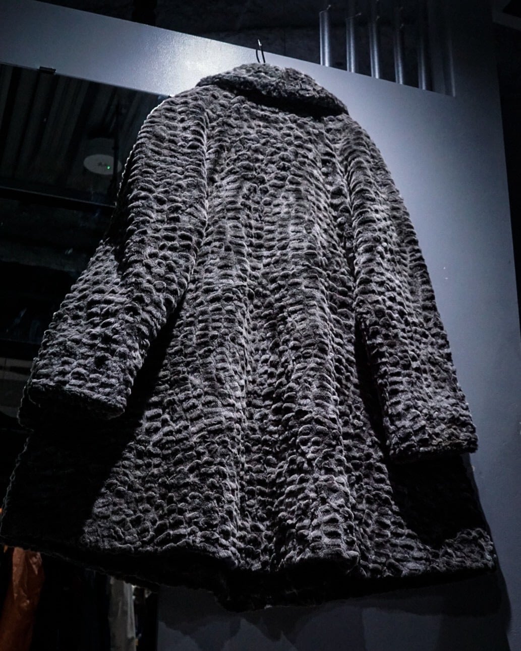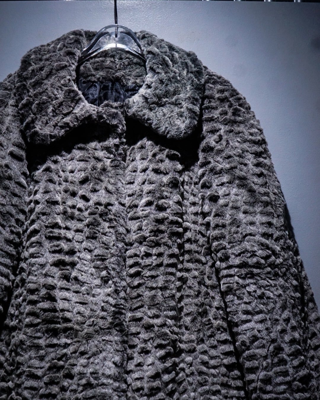 滑らかな毛足と凹凸のある立体的な表情が特徴的なフェイクファーコート。