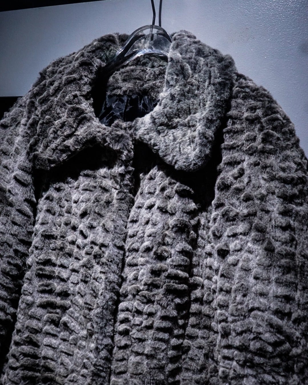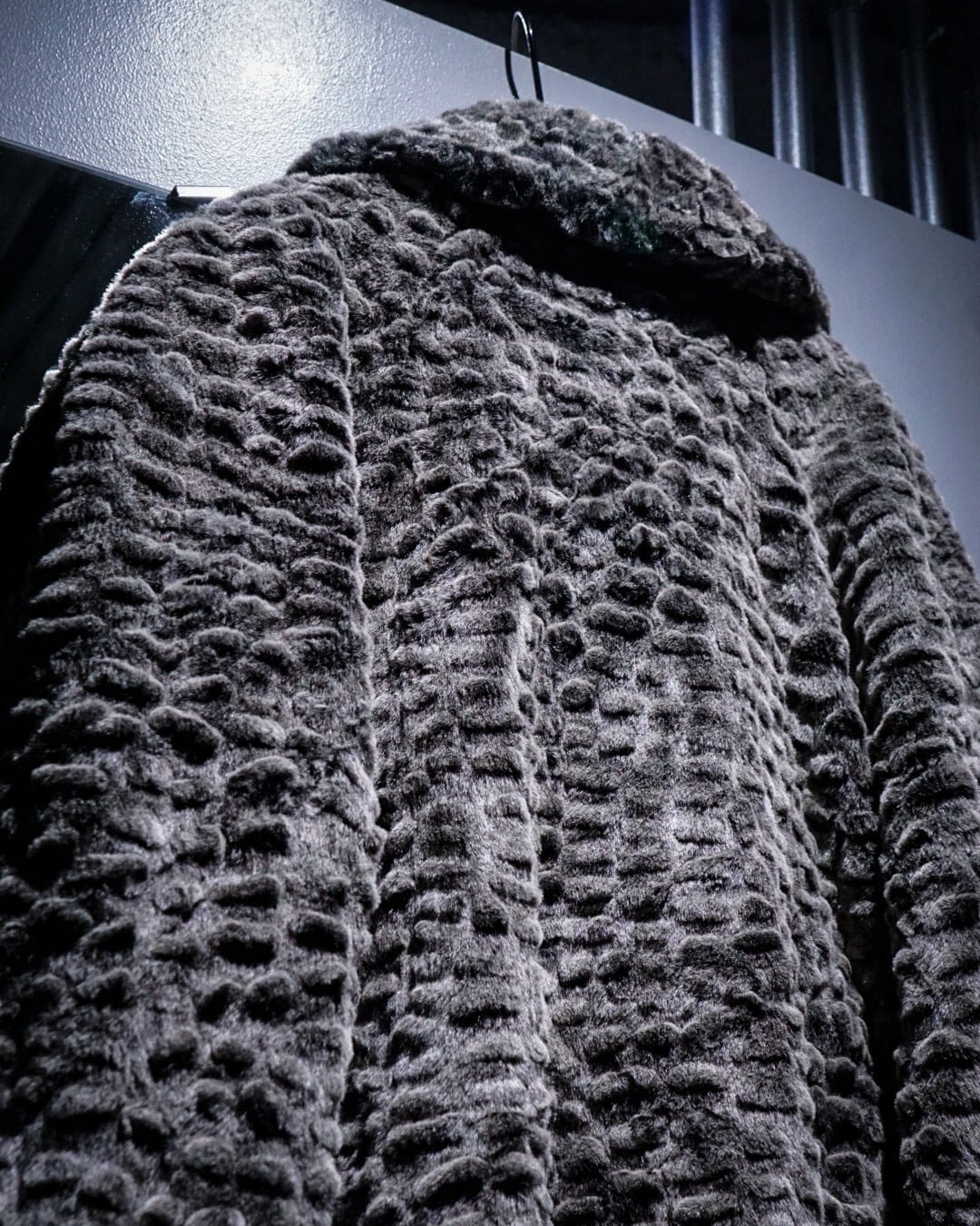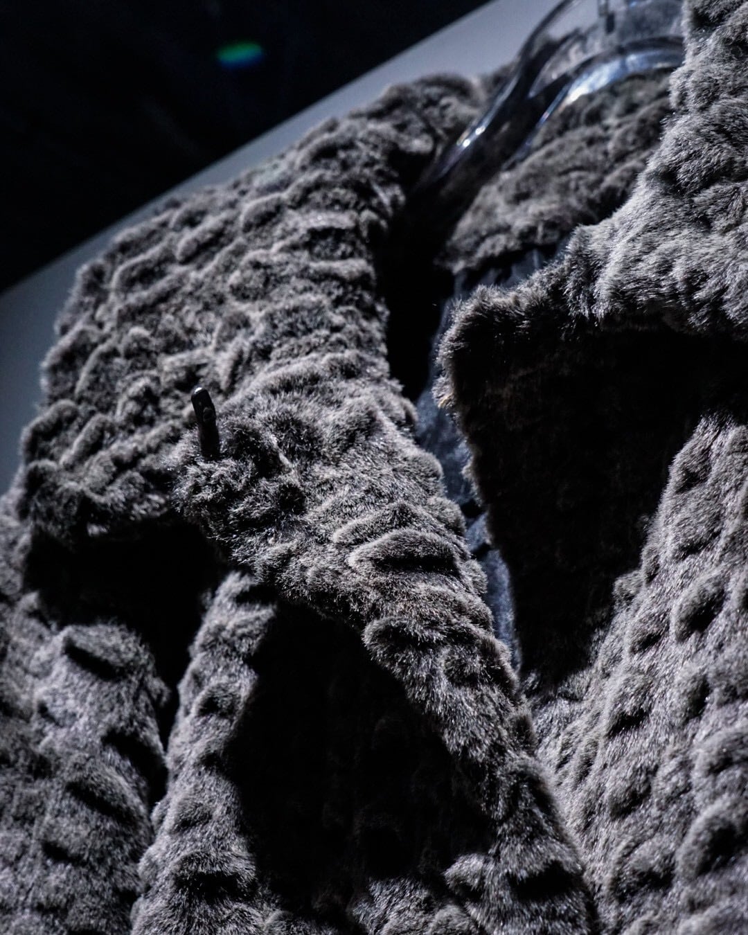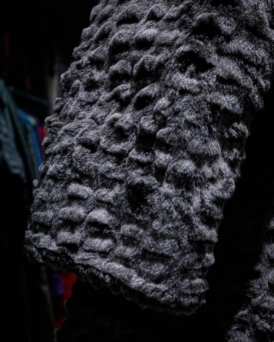 滑らかな毛足と凹凸のある立体的な表情が特徴的なフェイクファーコート。