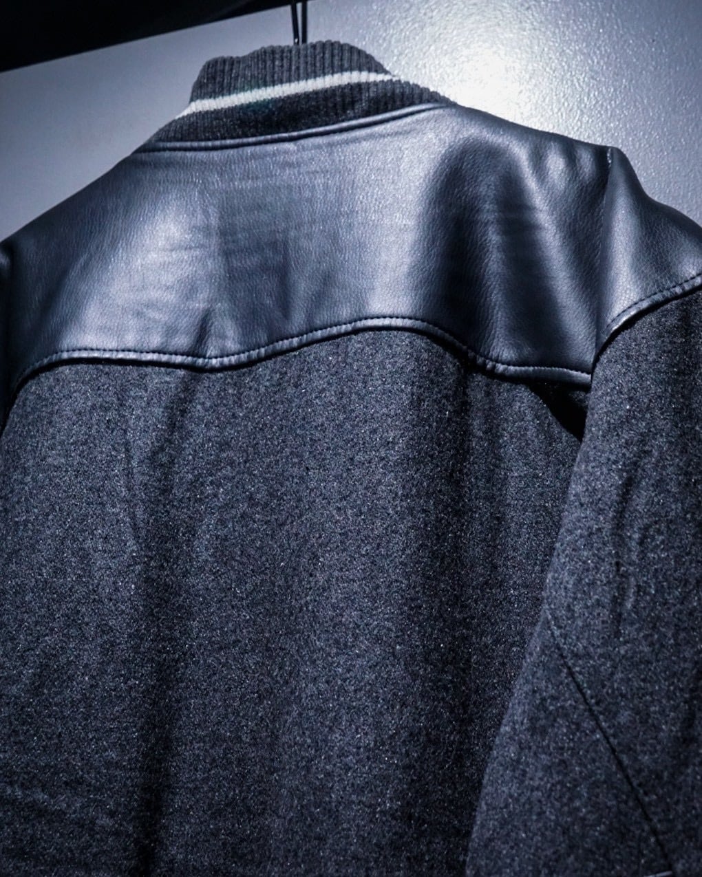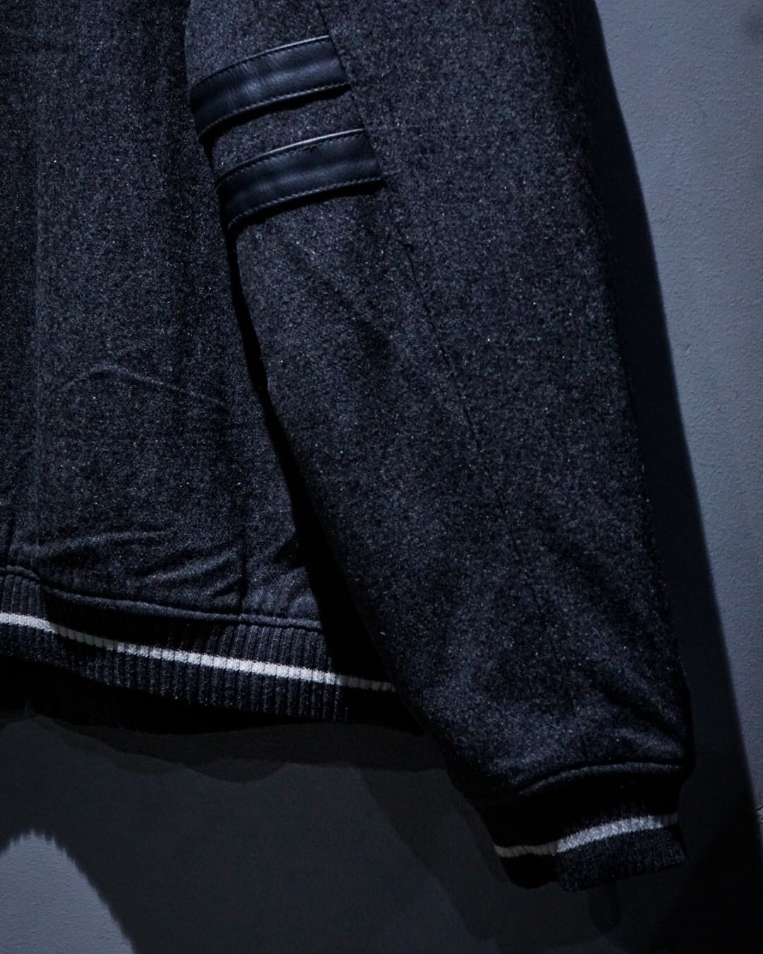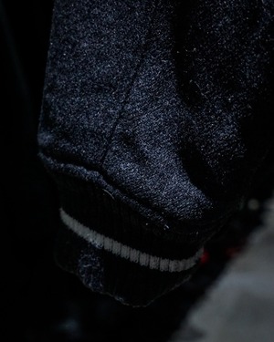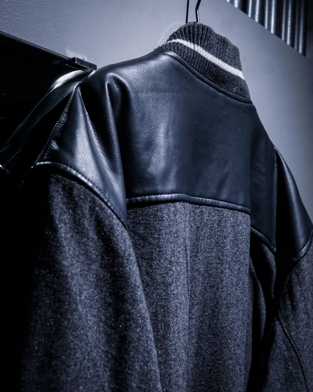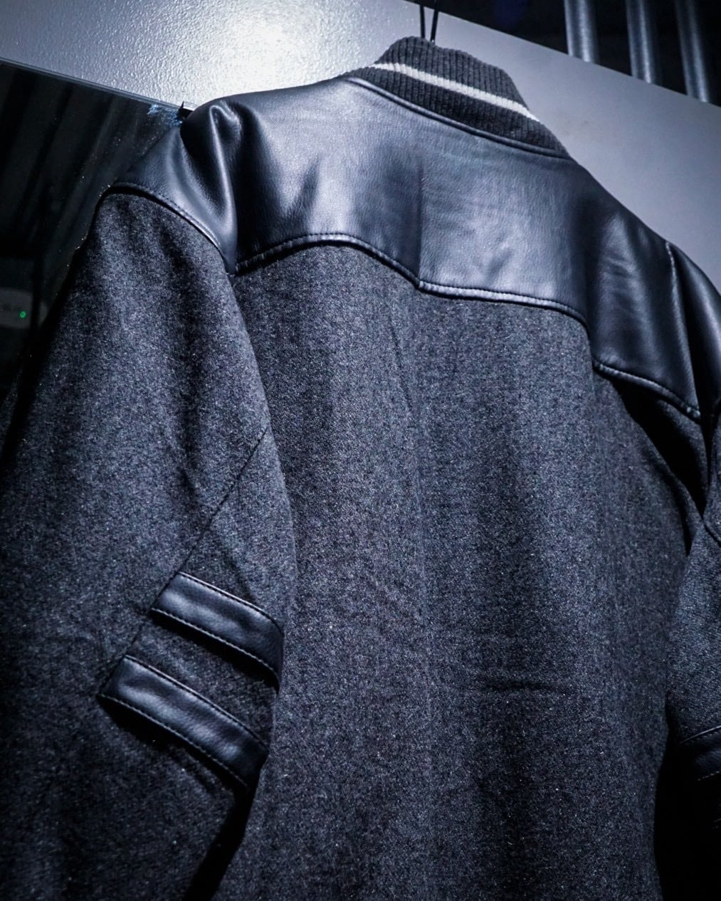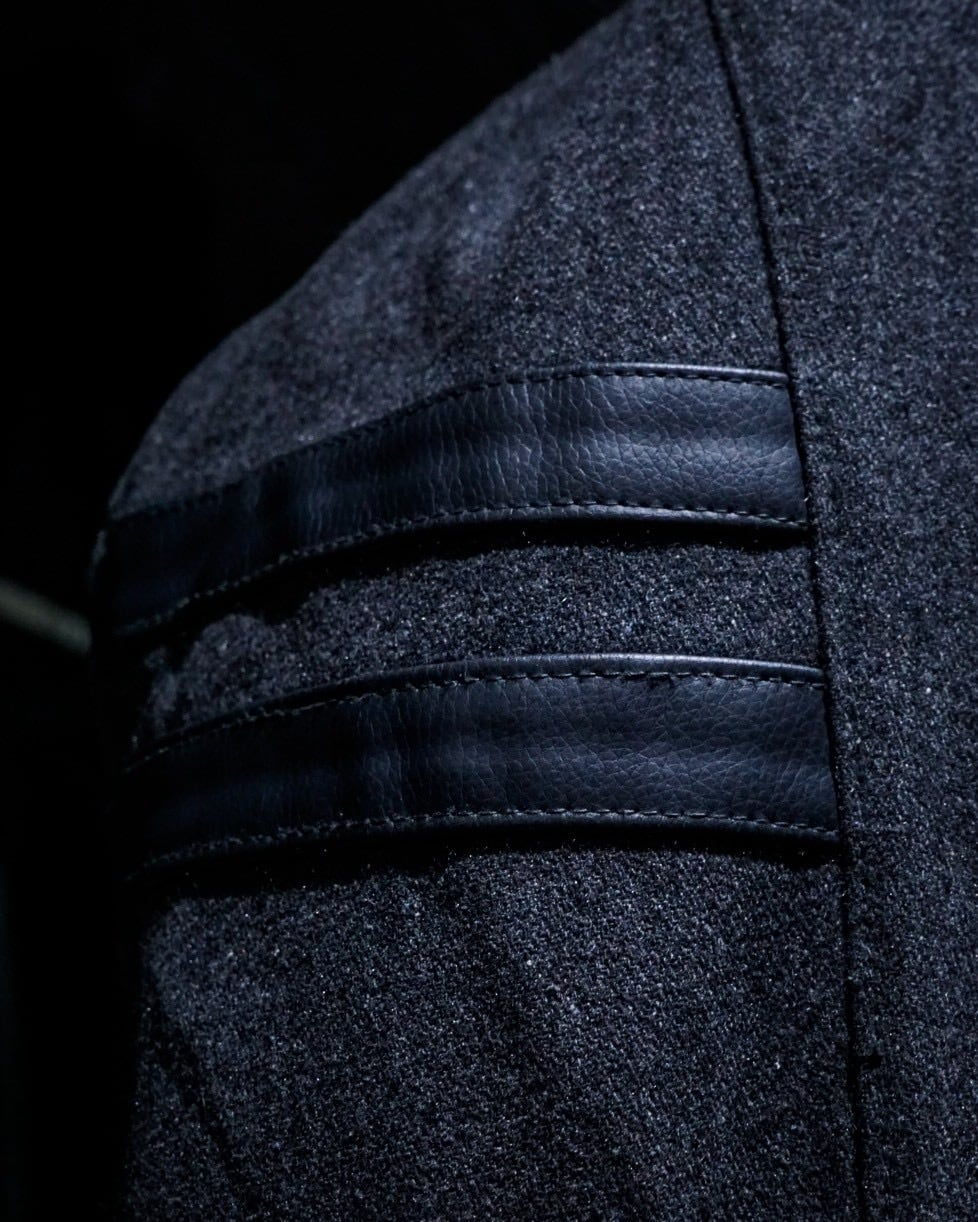 ボディには柔らかなタッチのグレーウール素材を使用。肩からアームにかけてはフェイクレザーで切り替えられ、異素材のコントラストが立体感と奥行きを生み出しています。