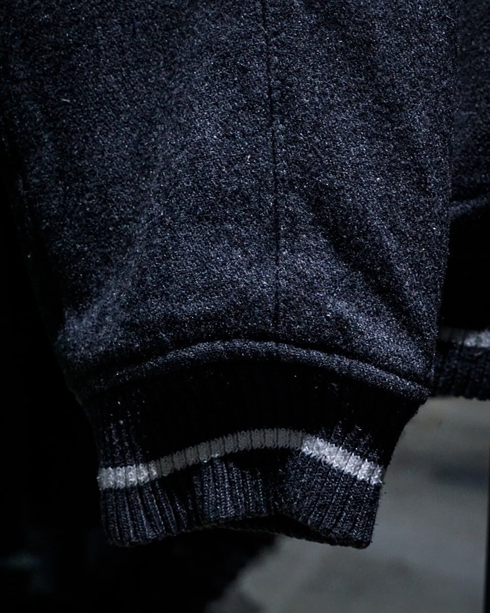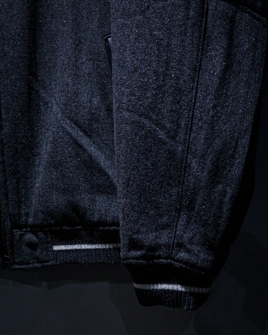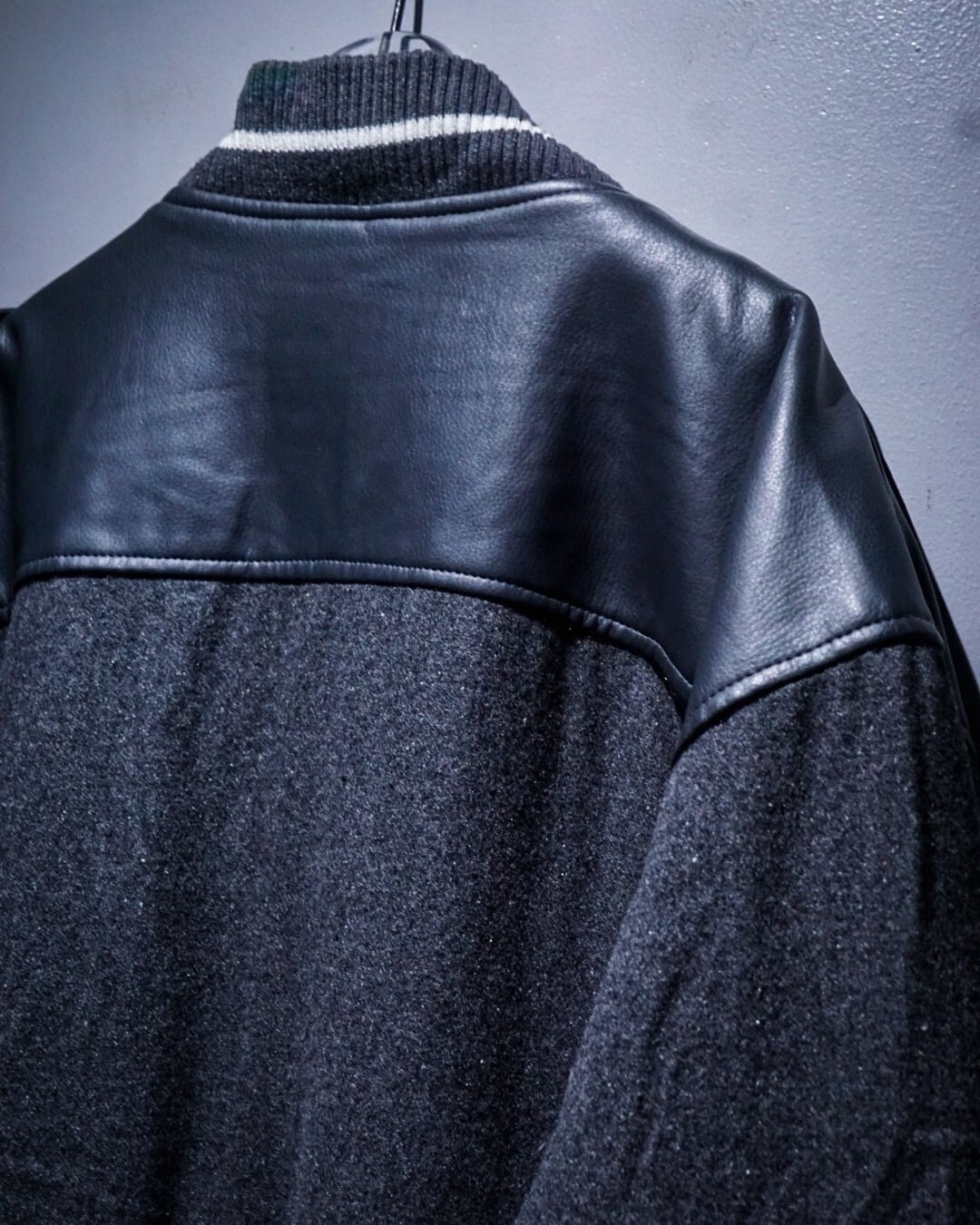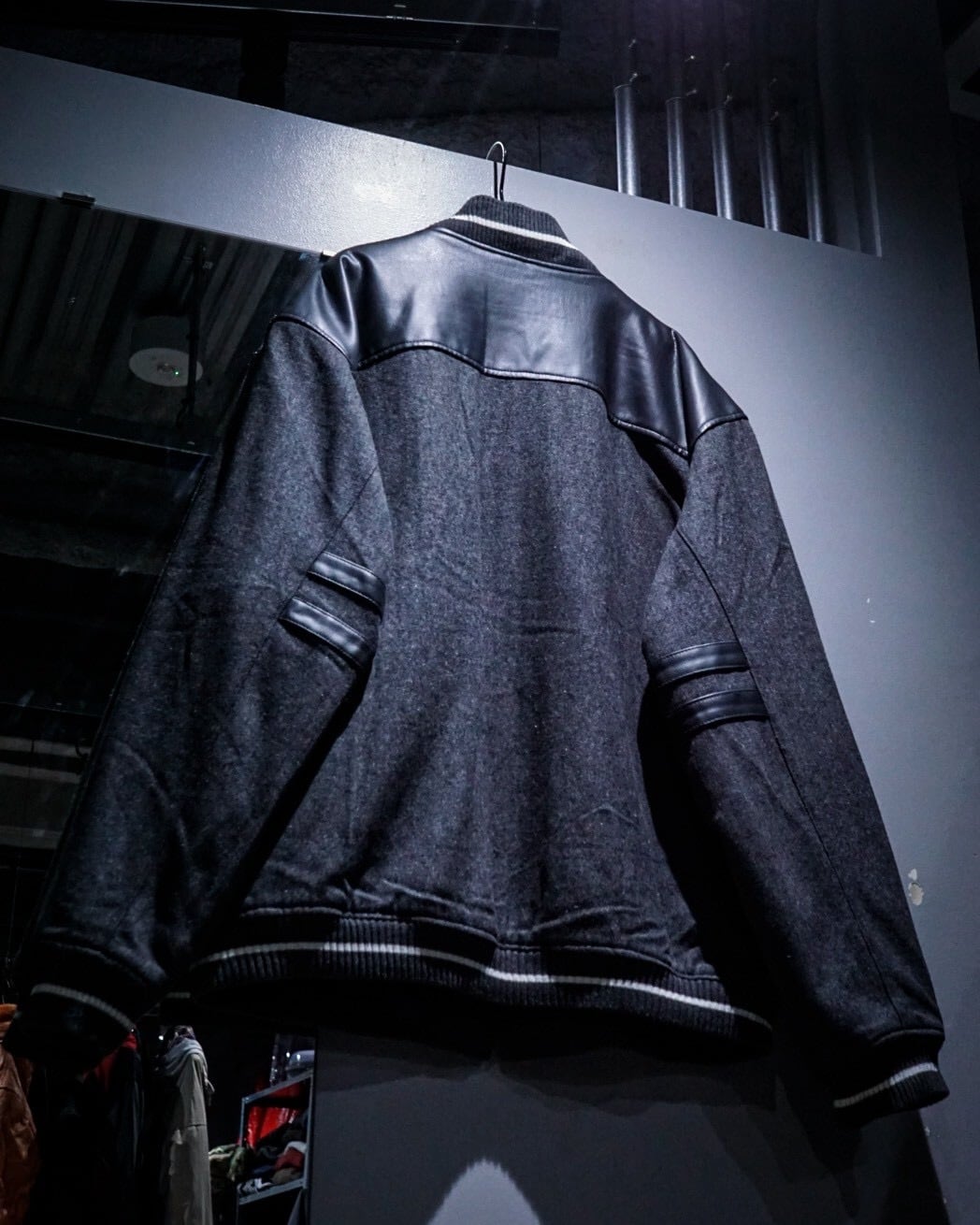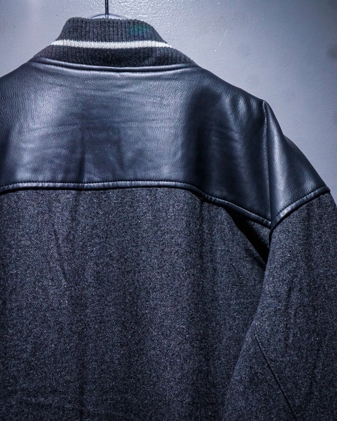 ボディには柔らかなタッチのグレーウール素材を使用。肩からアームにかけてはフェイクレザーで切り替えられ、異素材のコントラストが立体感と奥行きを生み出しています。