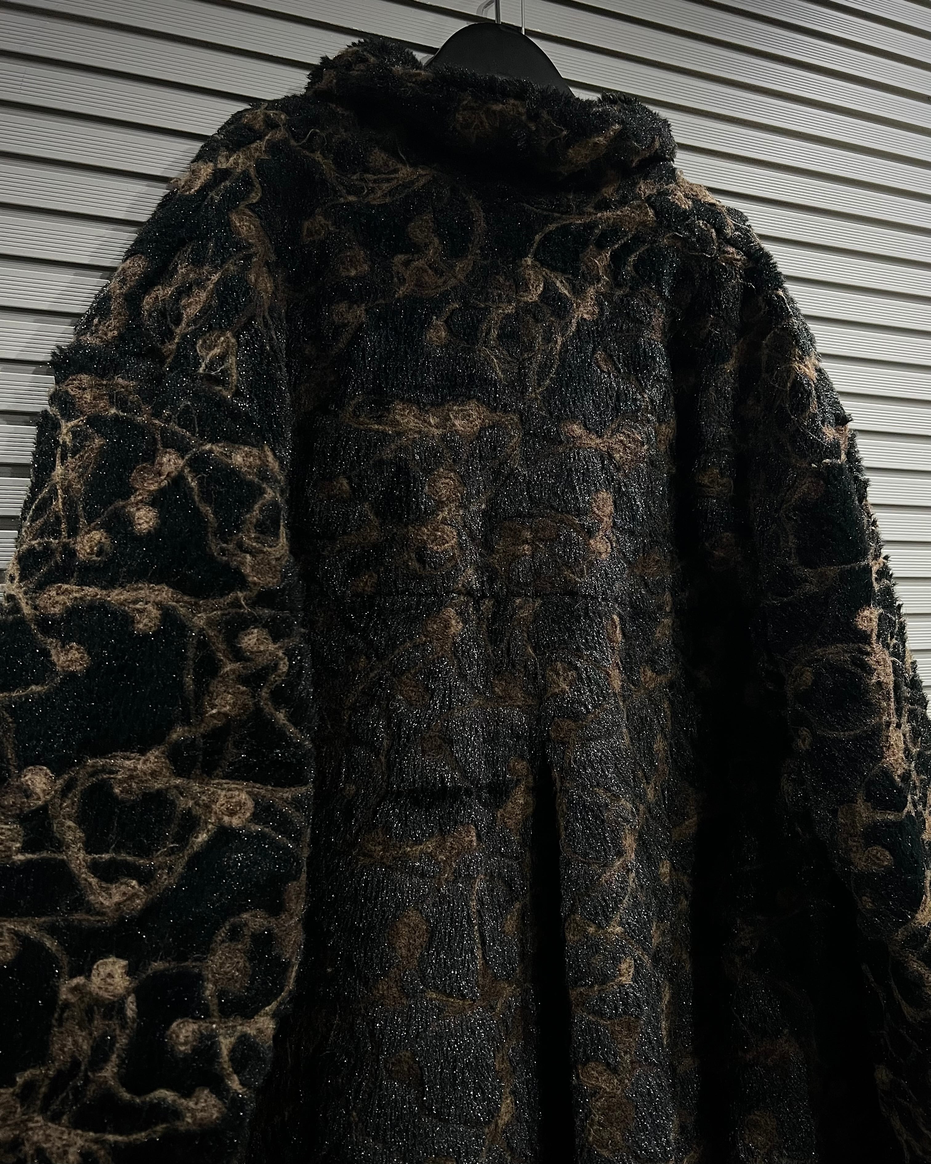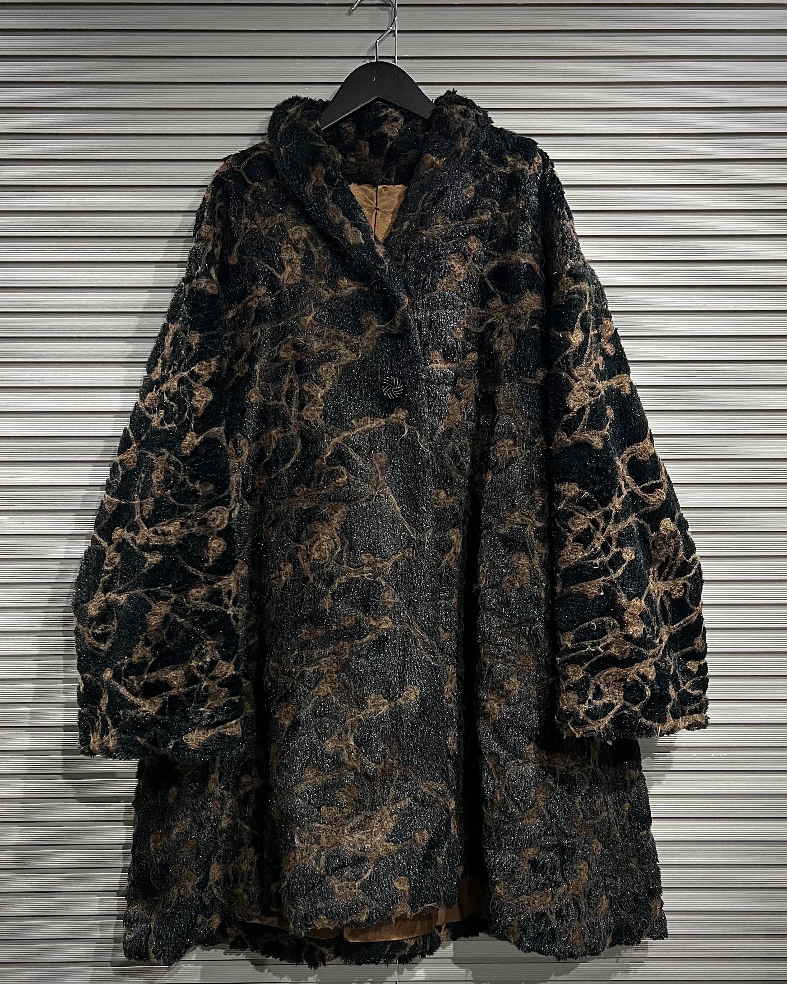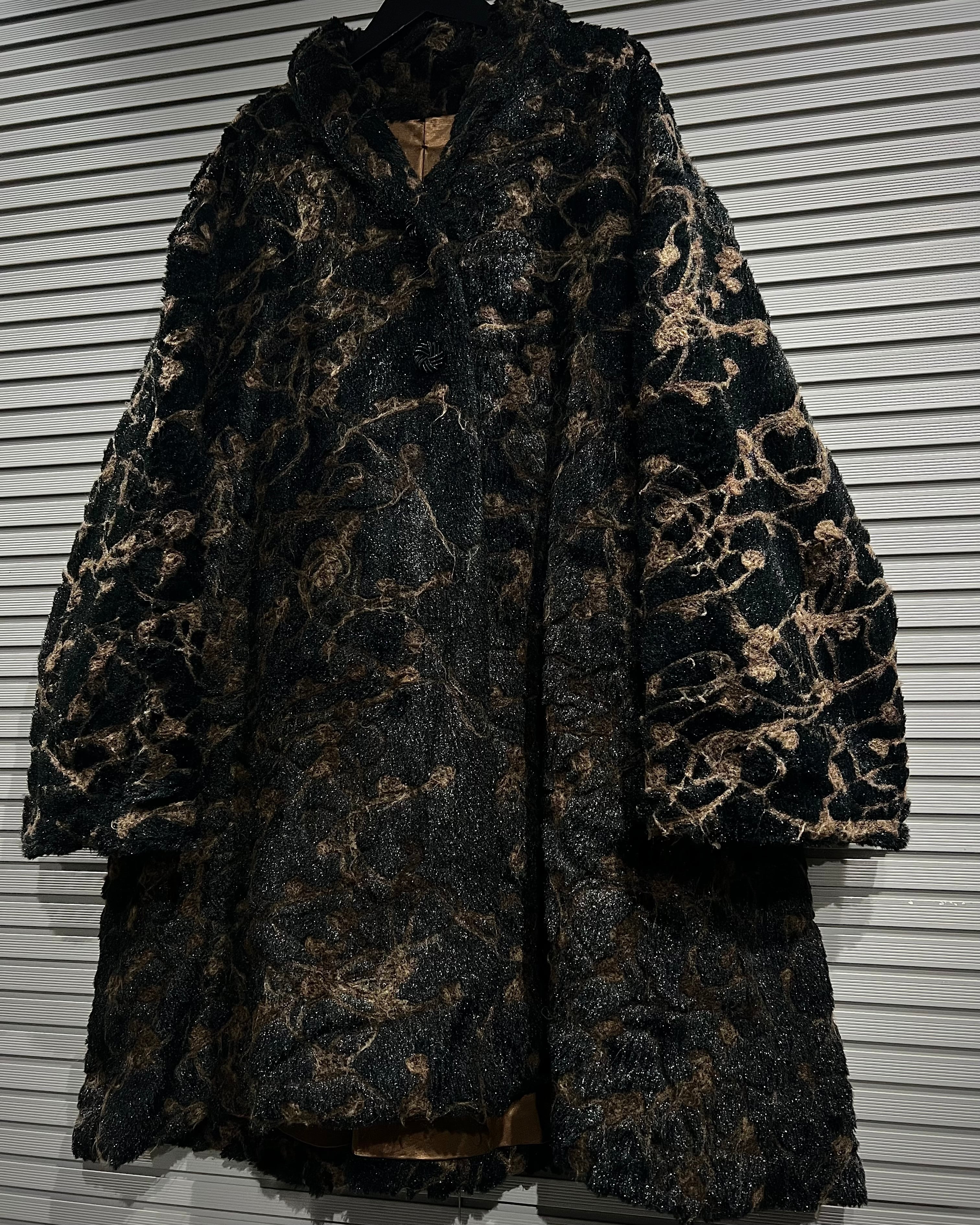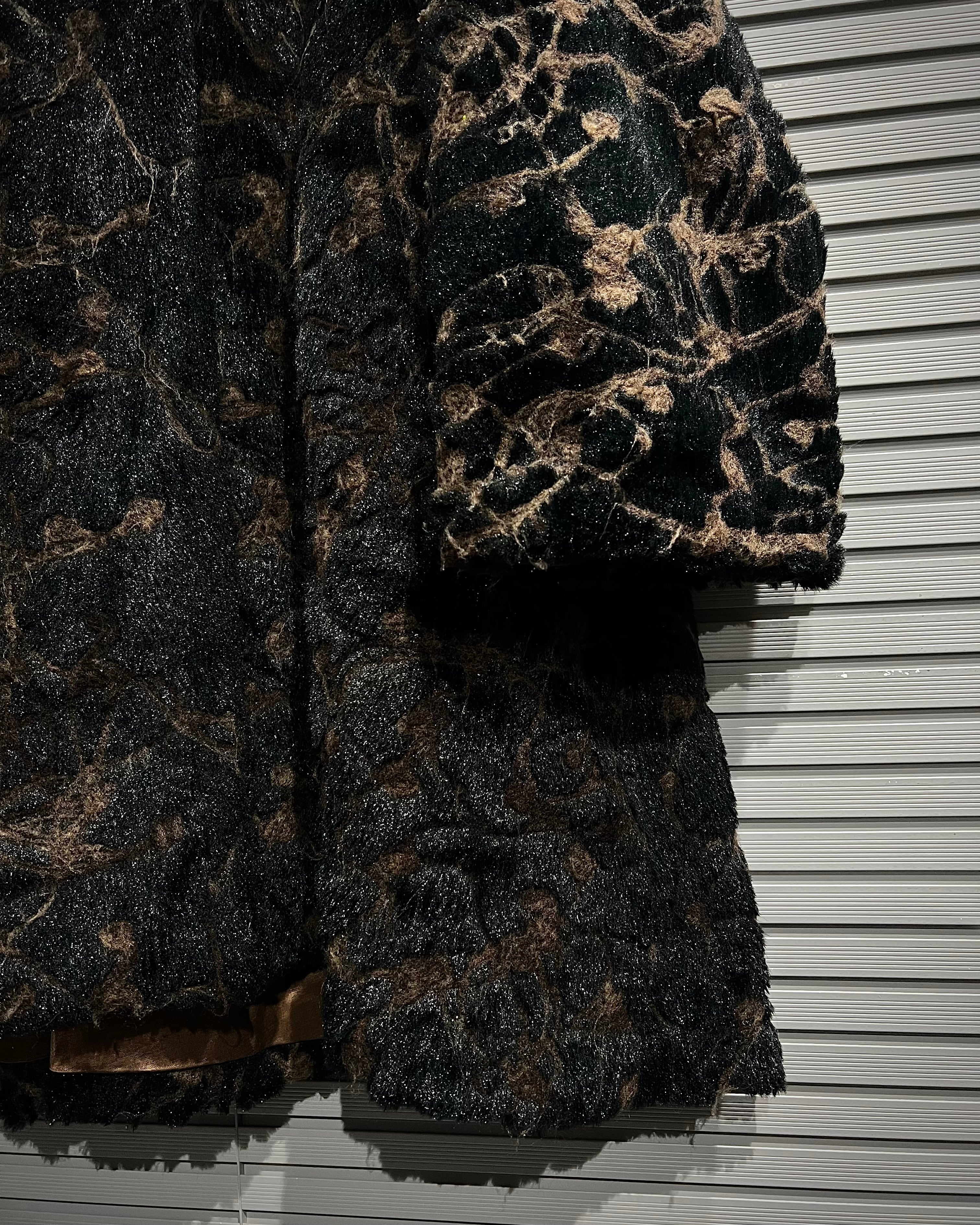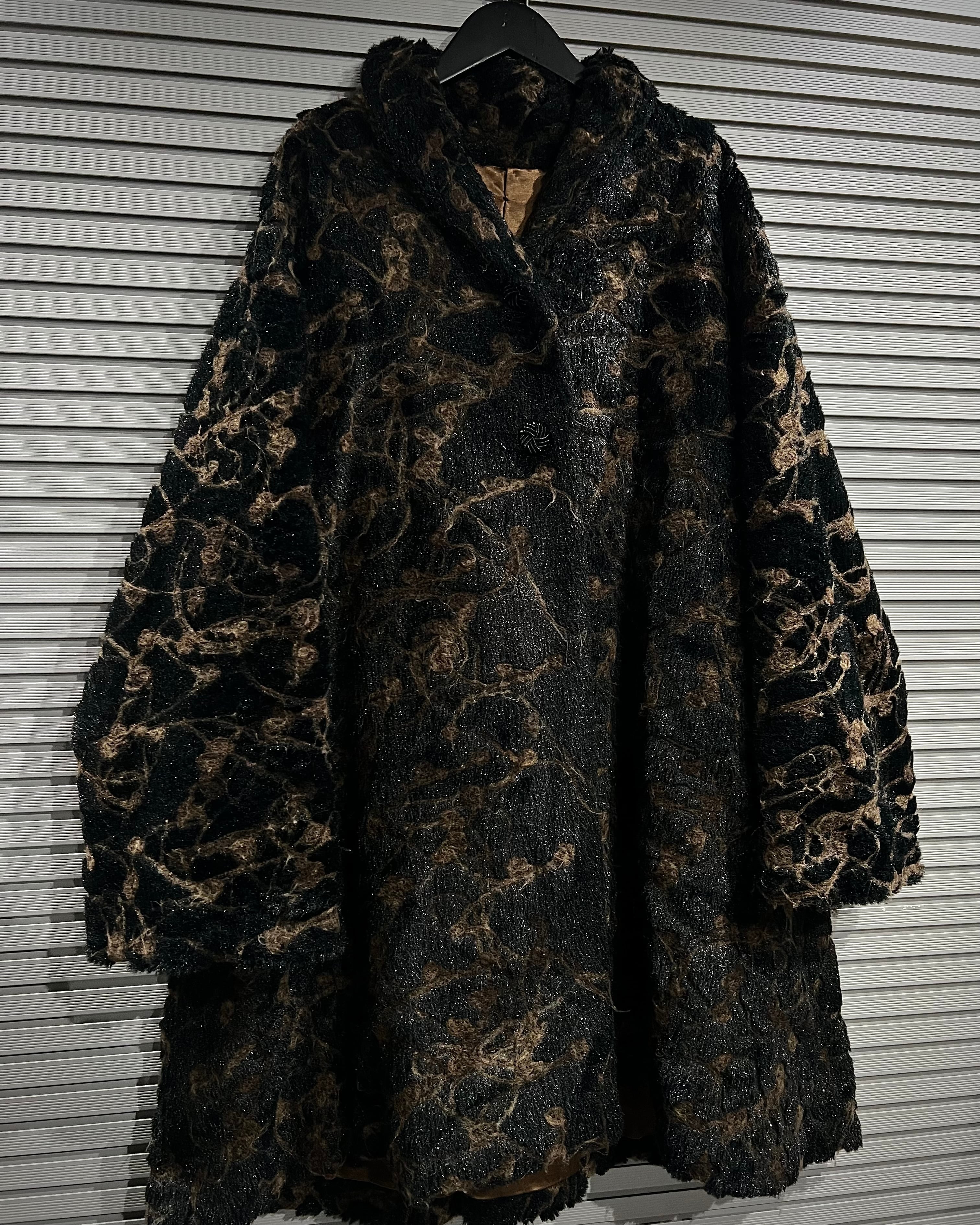 ブラウン×ブラックを基調に、マーブル調で抽象的な総柄デザインが表現された存在感際立つフェイクファーコート。