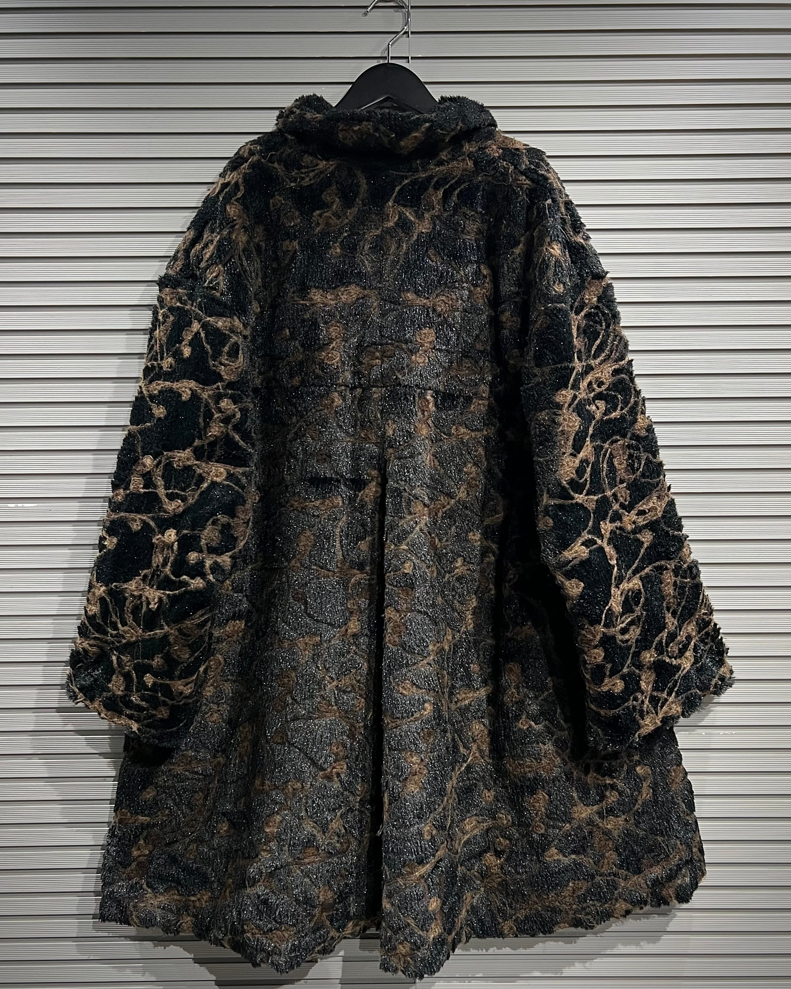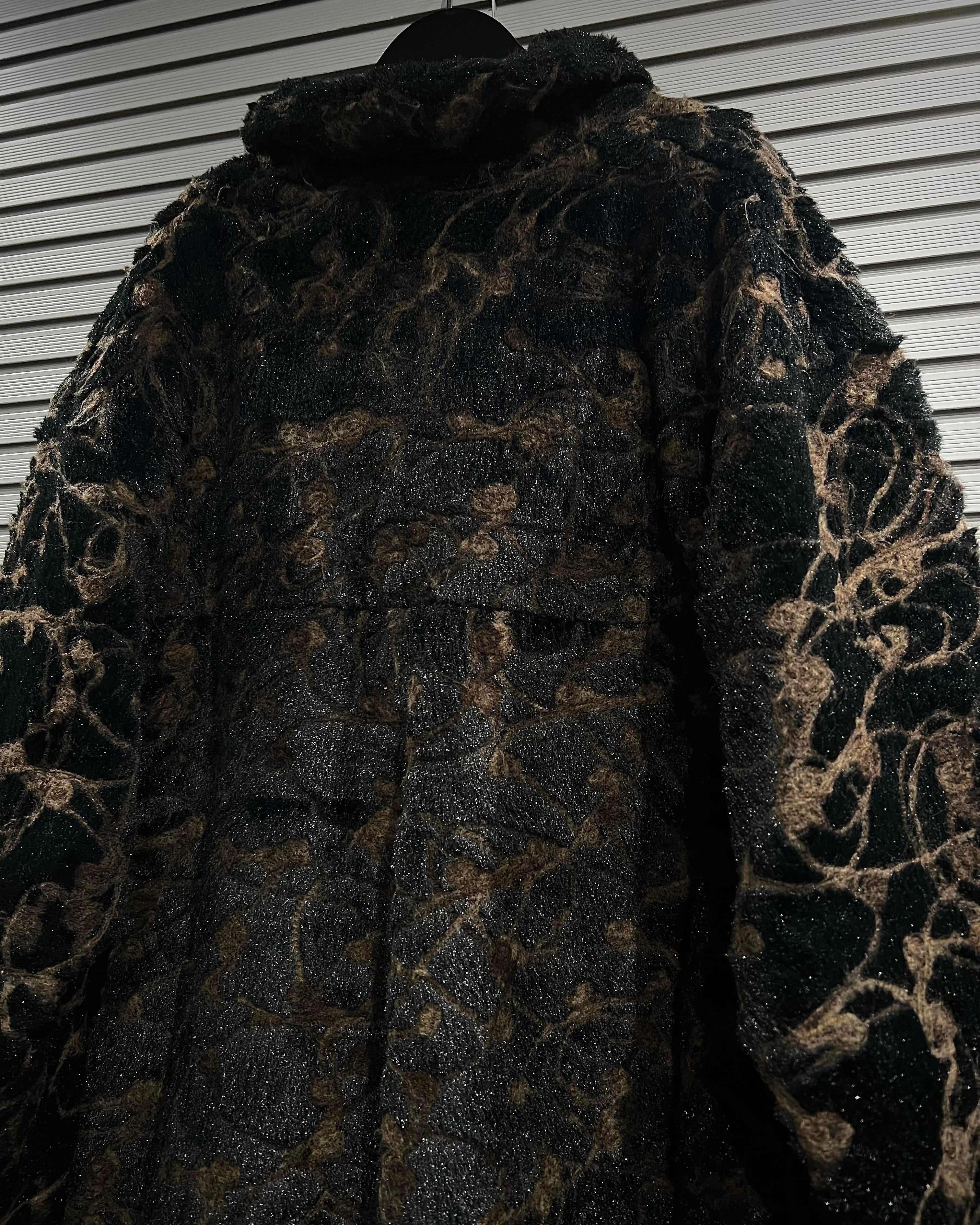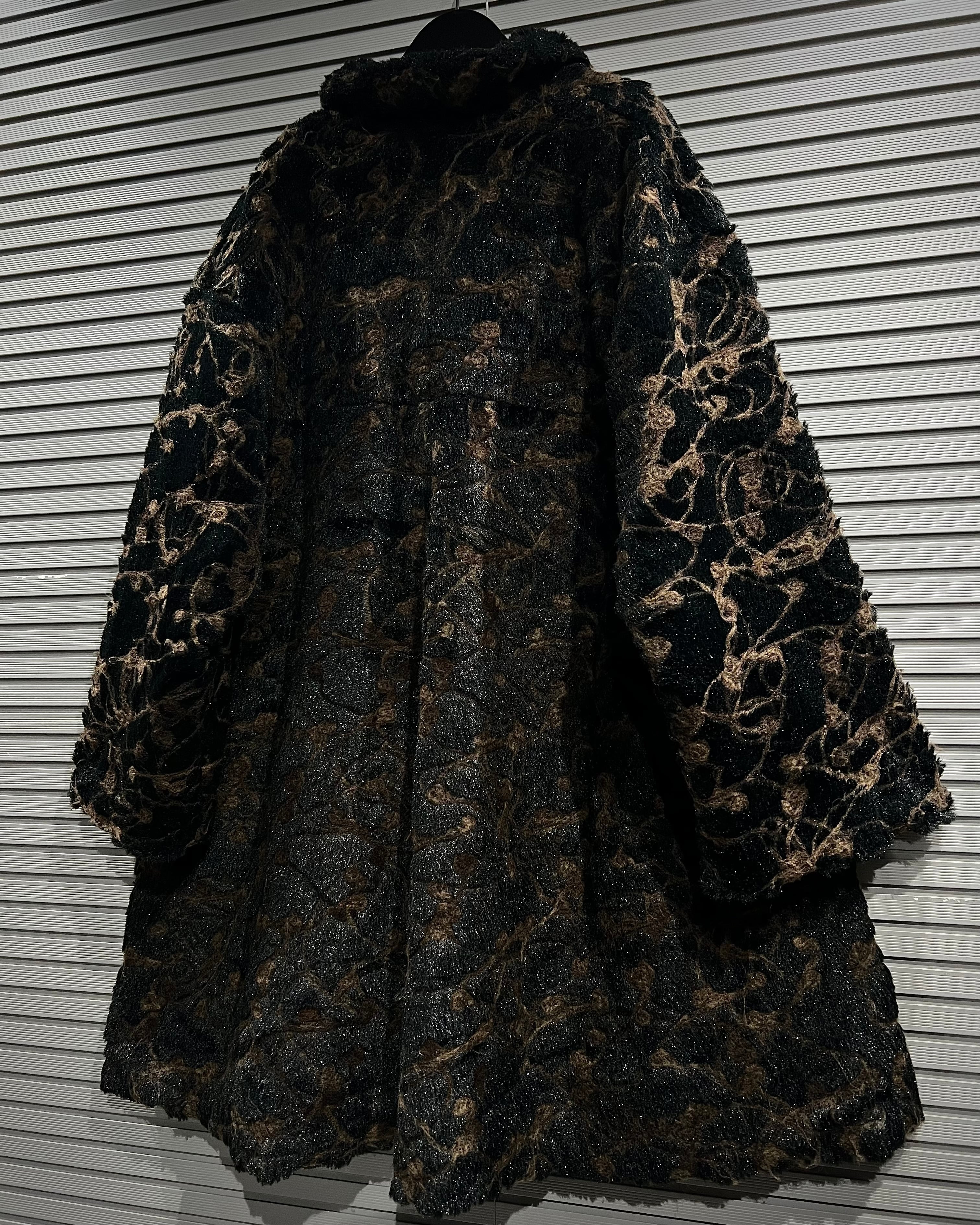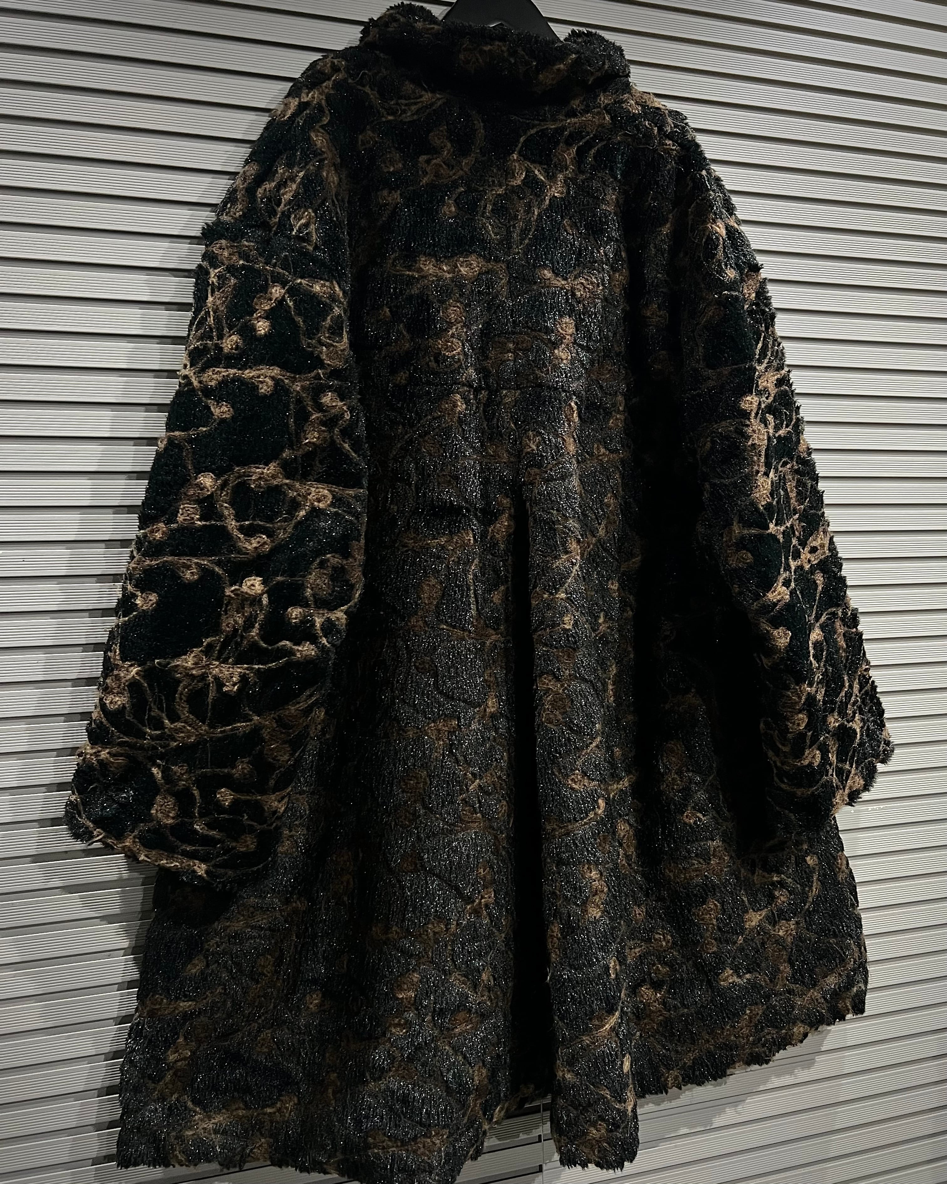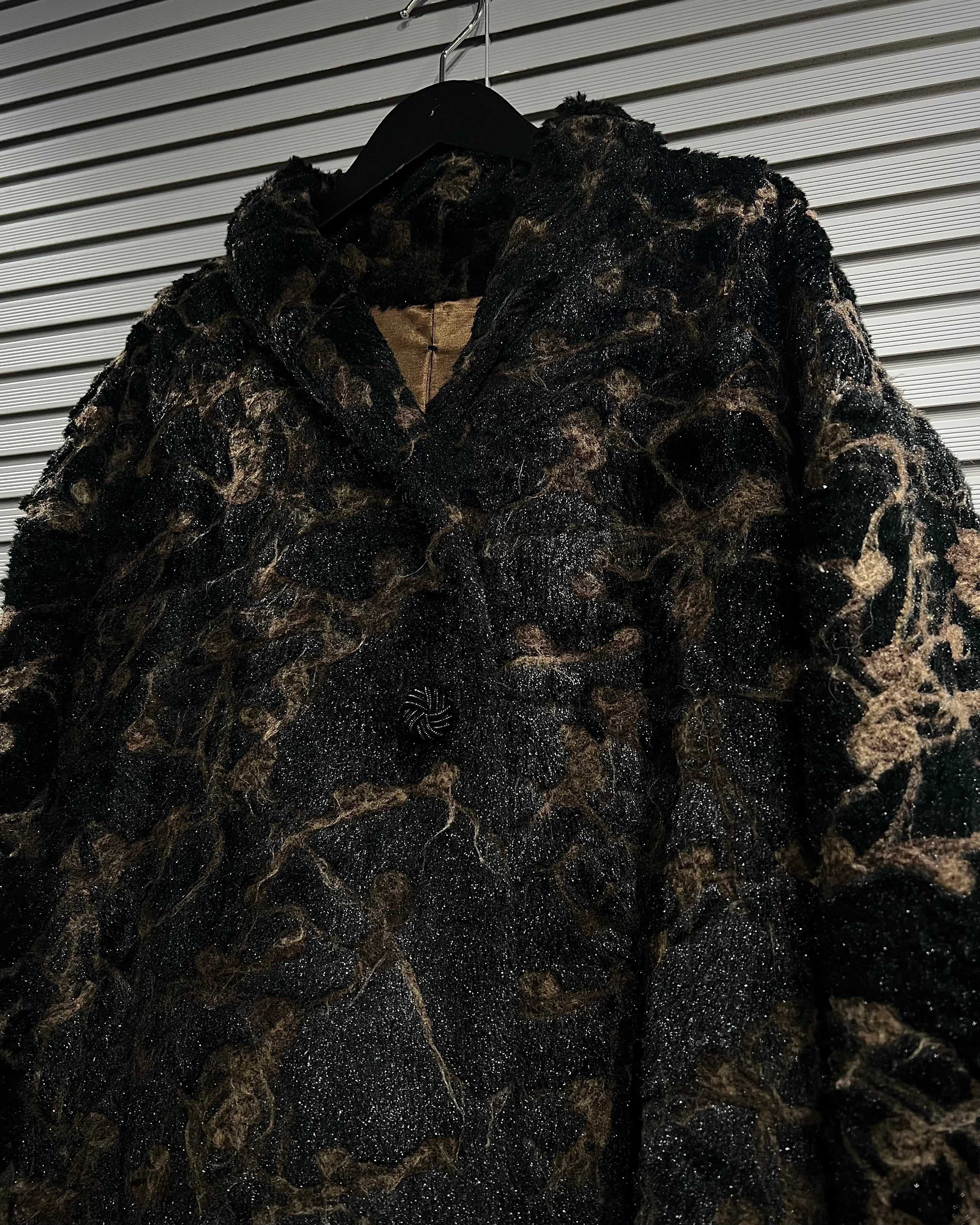 ブラウン×ブラックを基調に、マーブル調で抽象的な総柄デザインが表現された存在感際立つフェイクファーコート。