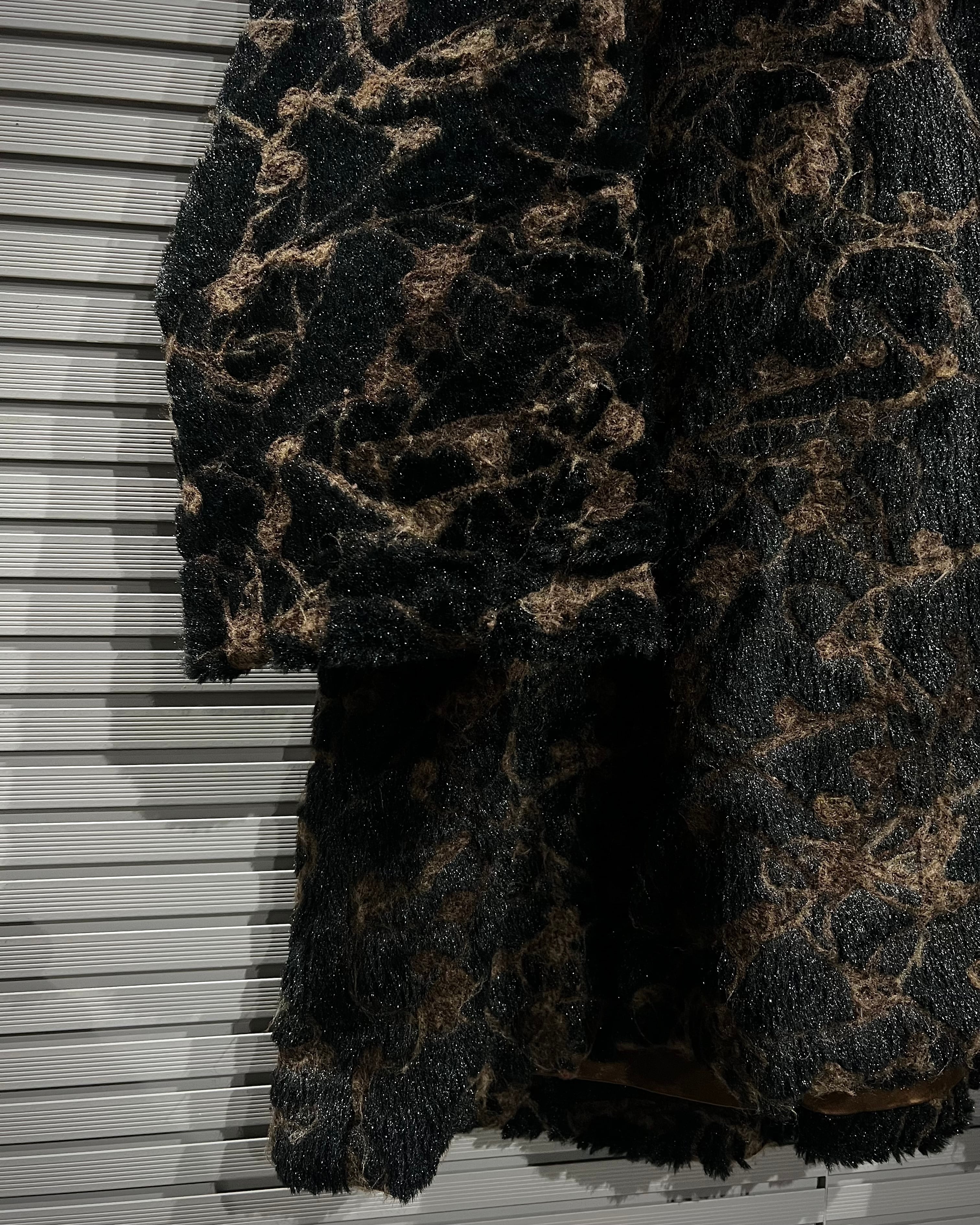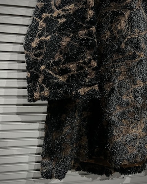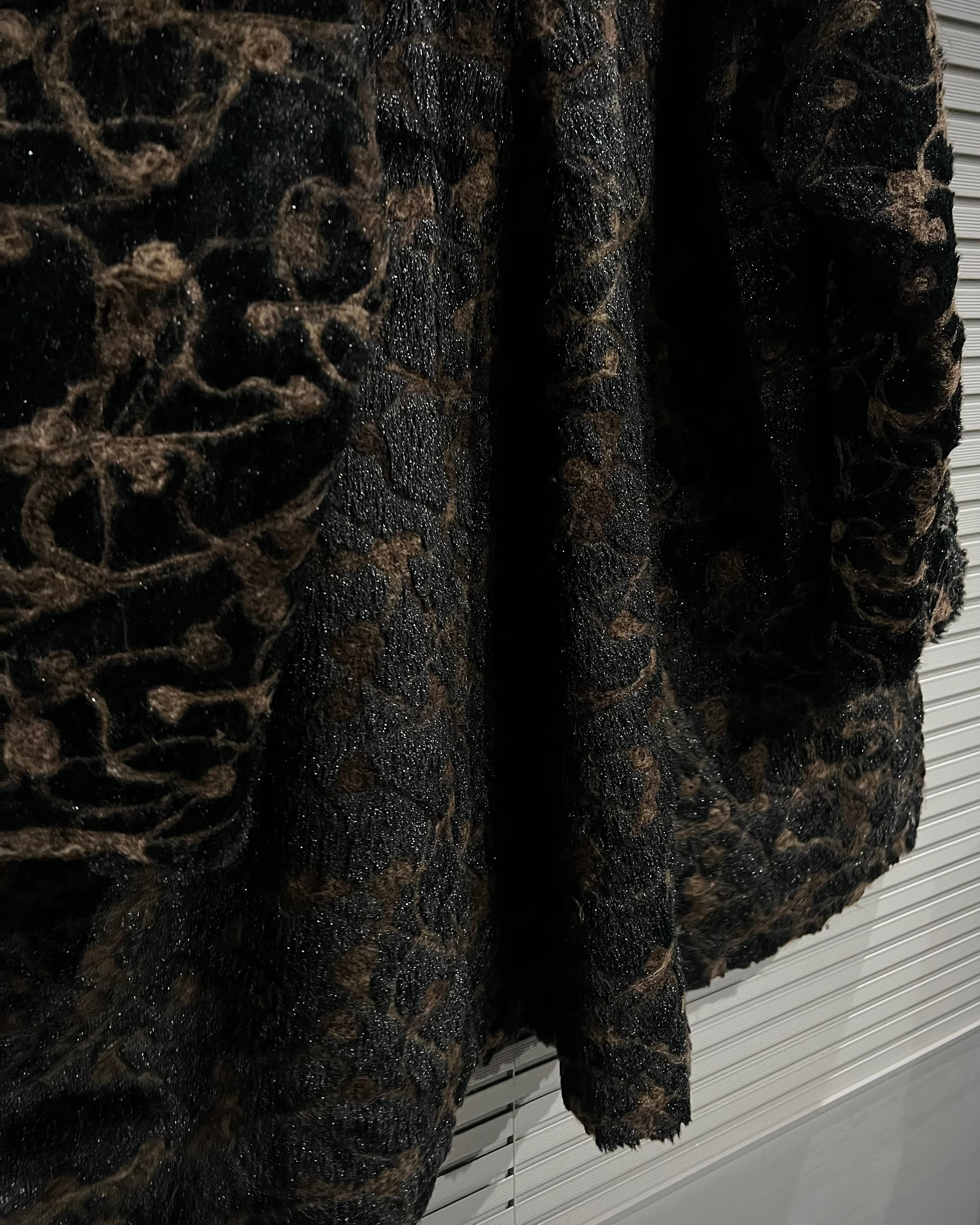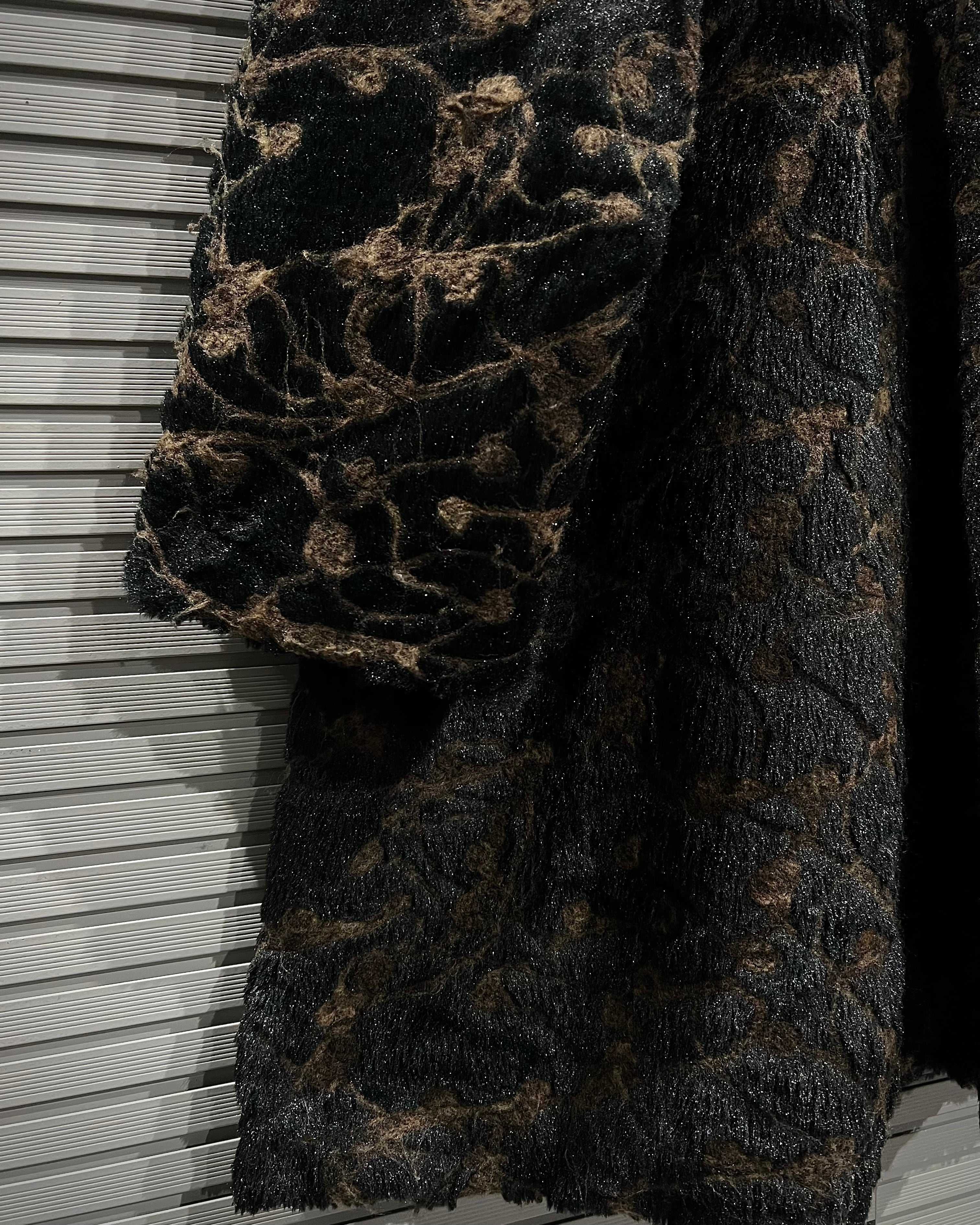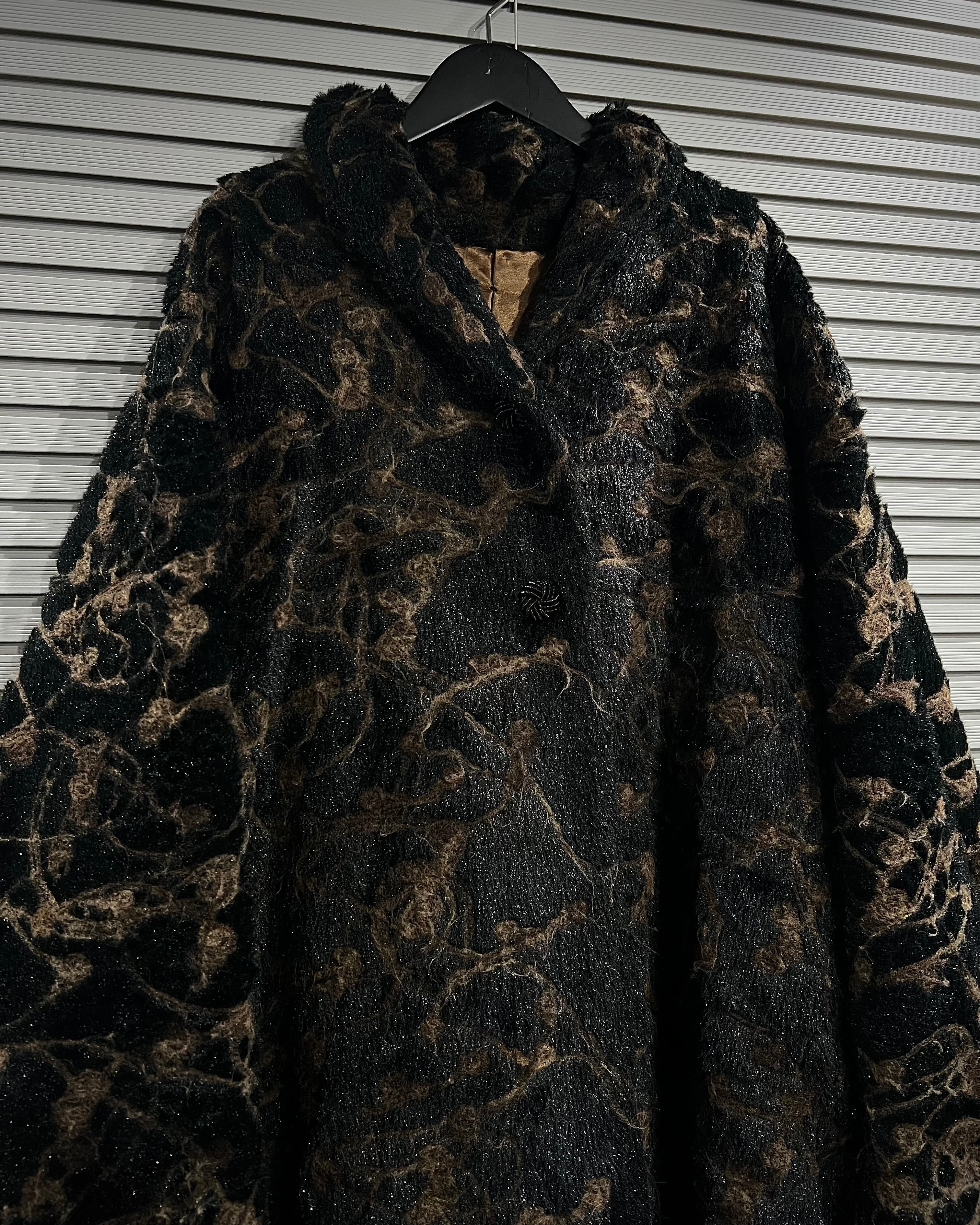 ブラウン×ブラックを基調に、マーブル調で抽象的な総柄デザインが表現された存在感際立つフェイクファーコート。