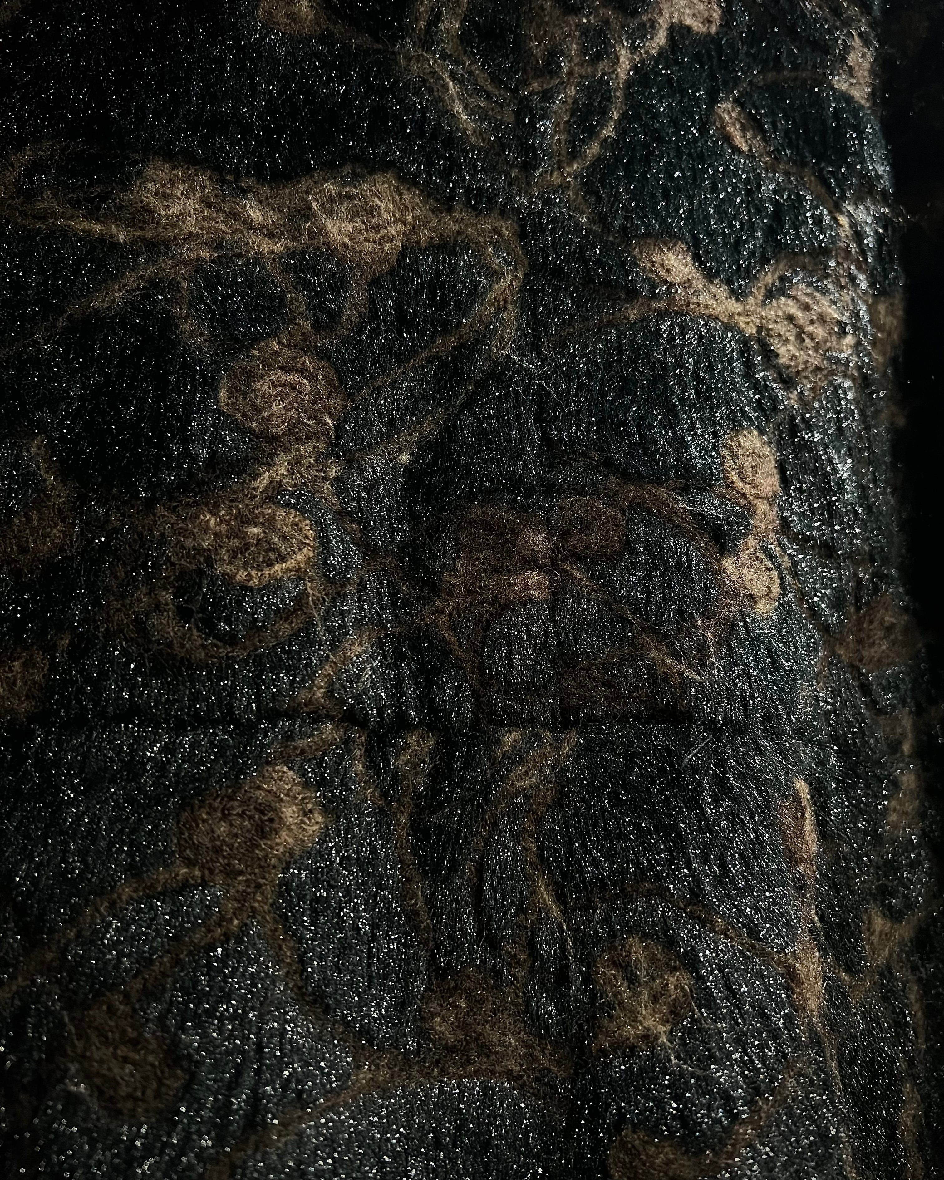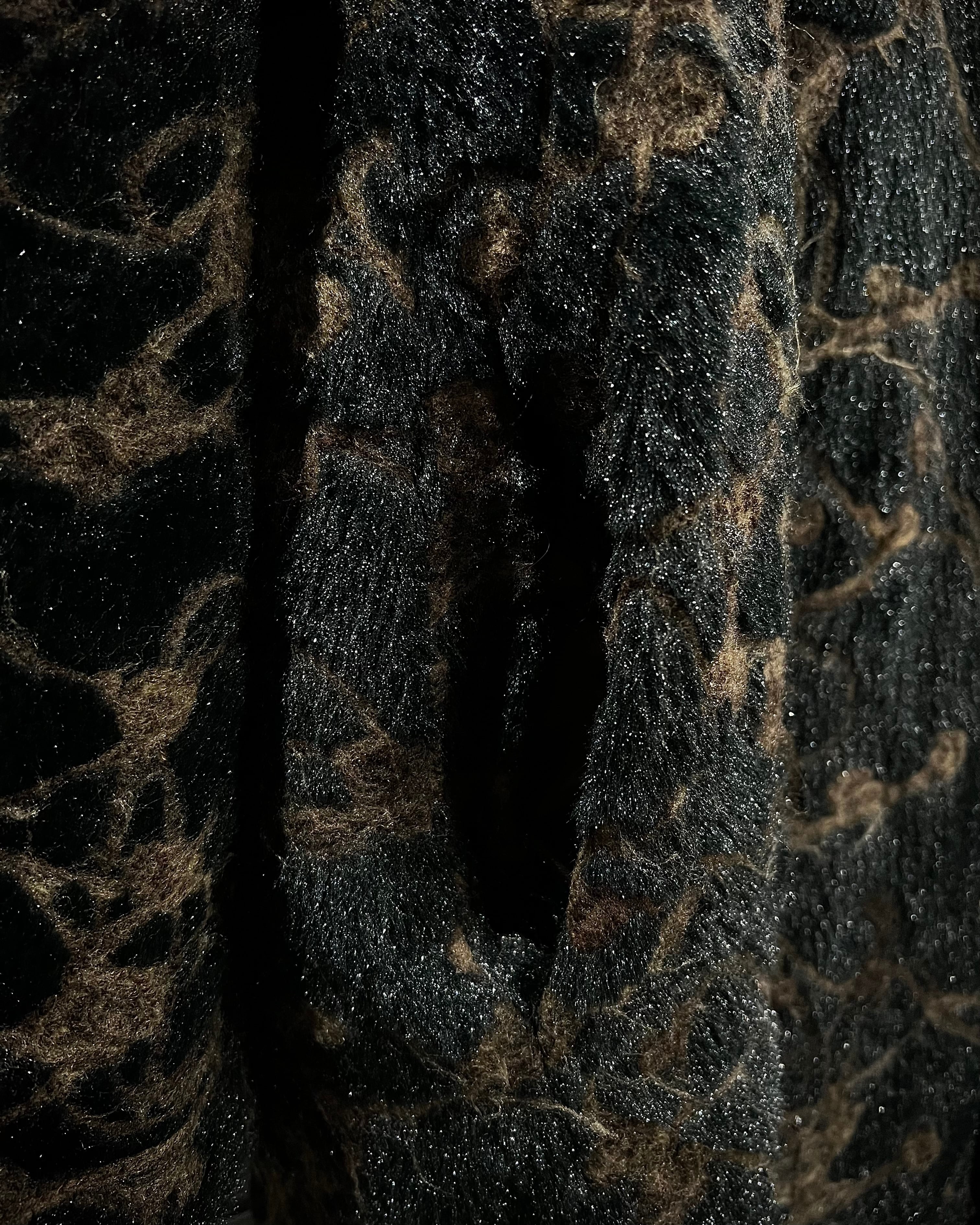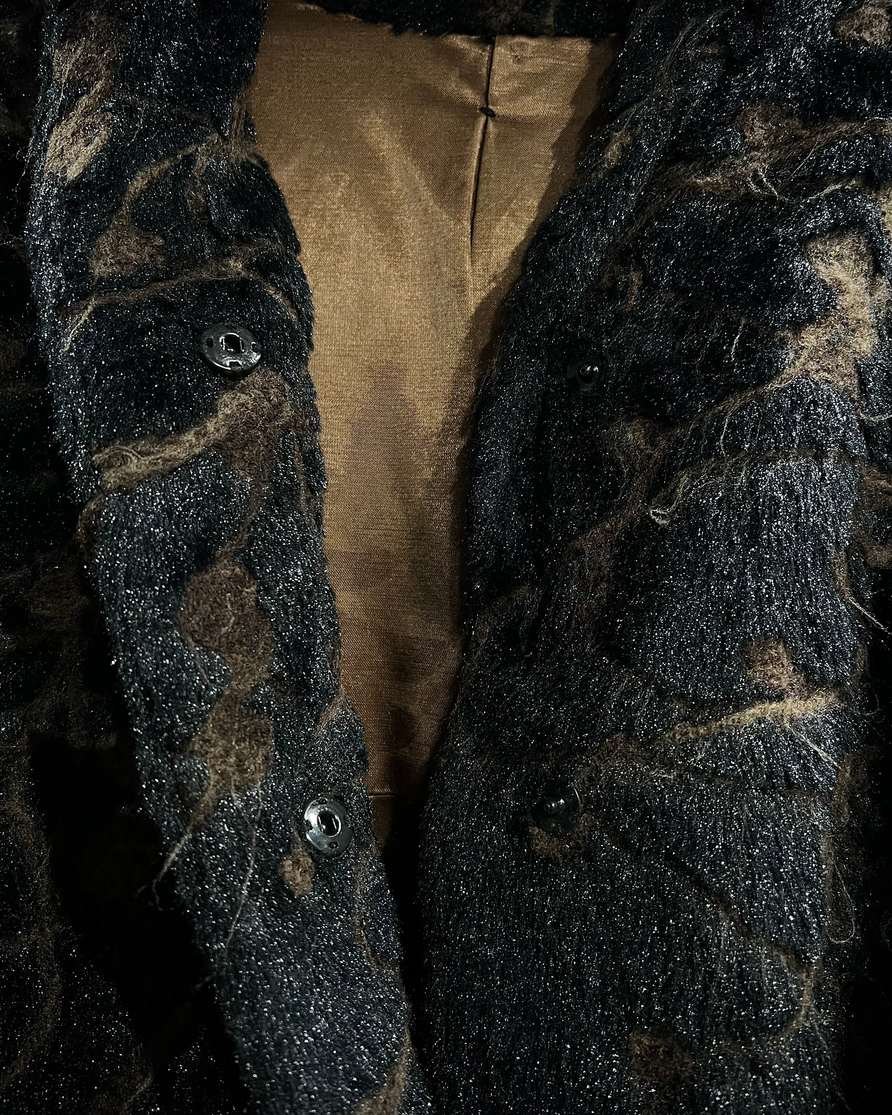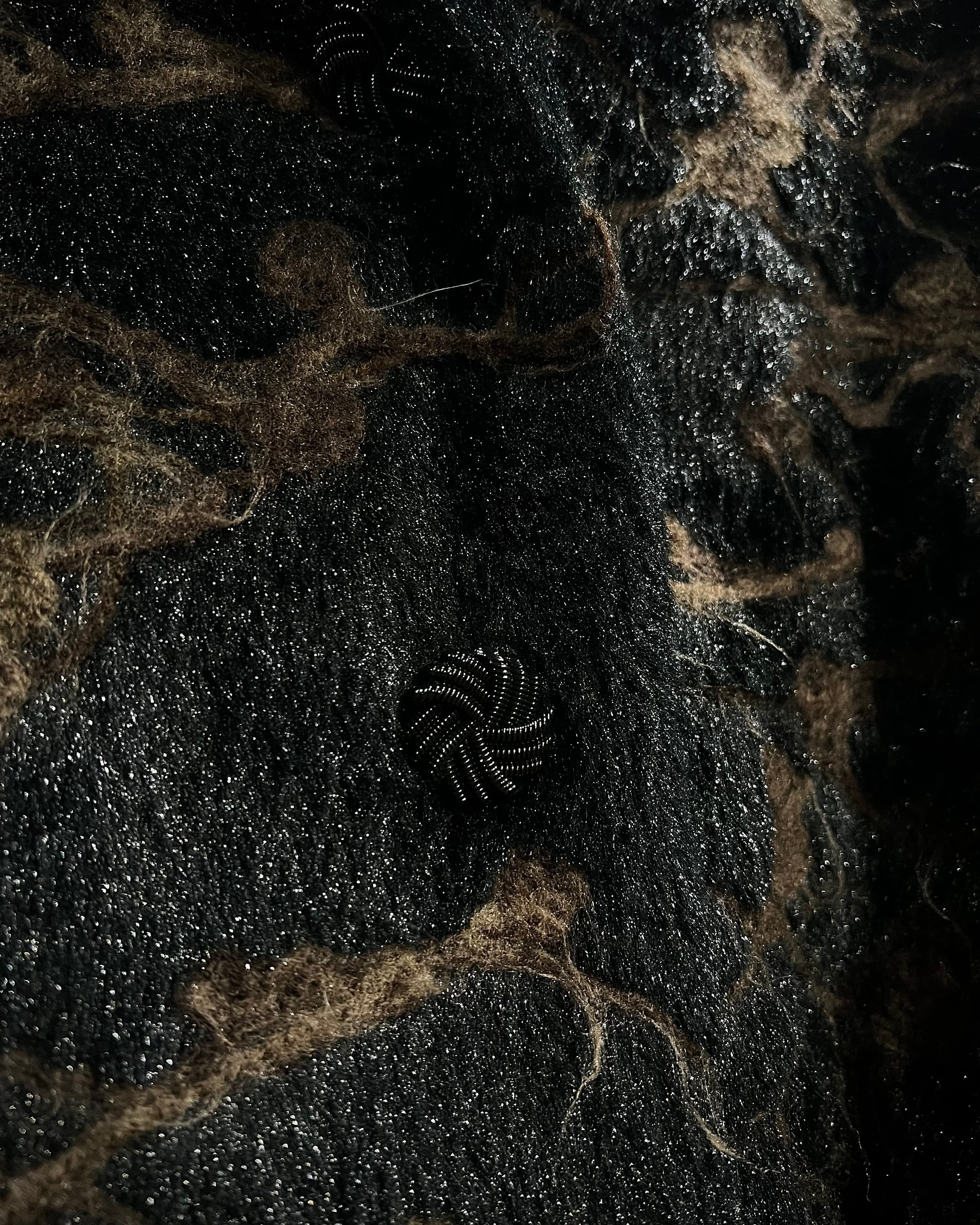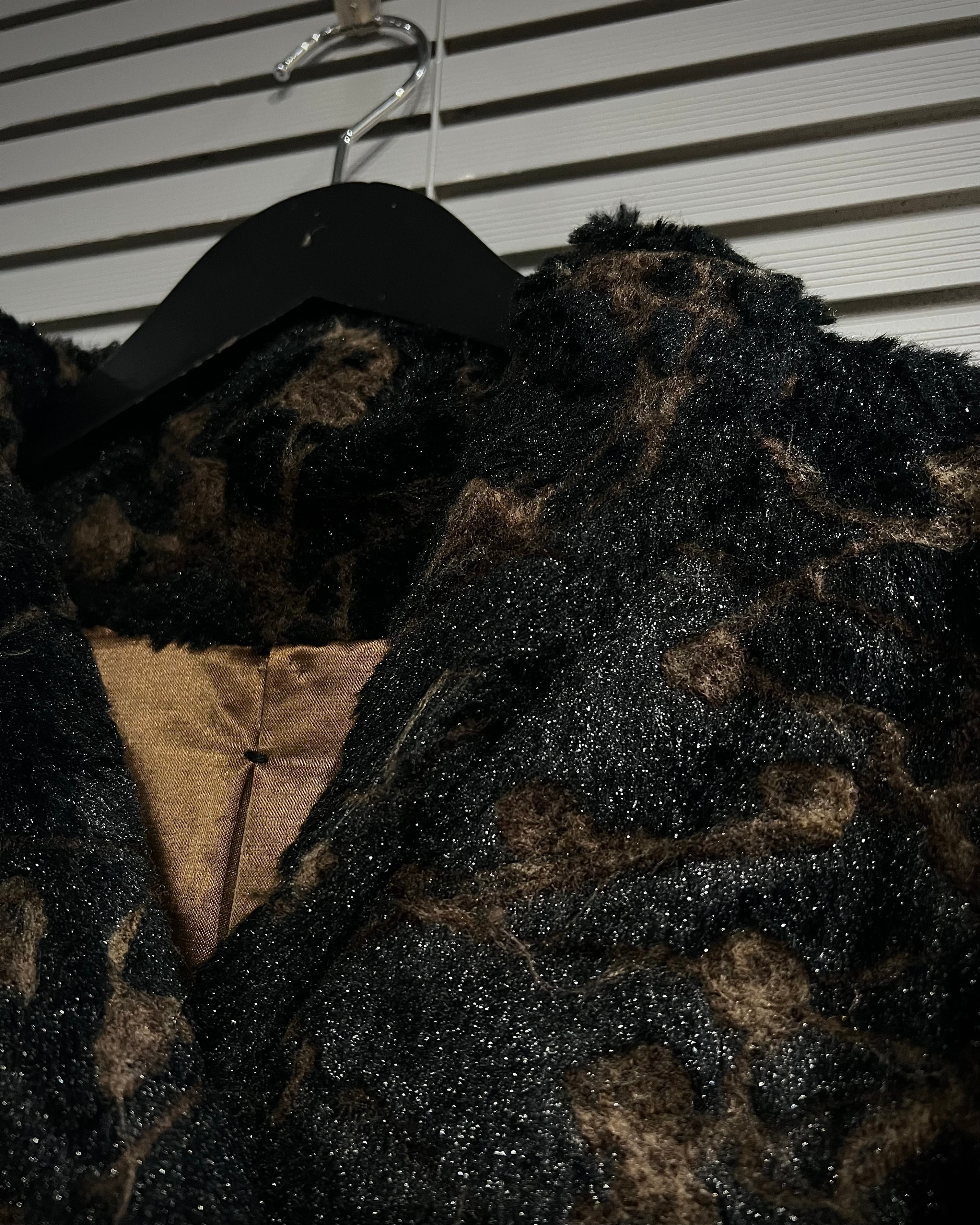 ブラウン×ブラックを基調に、マーブル調で抽象的な総柄デザインが表現された存在感際立つフェイクファーコート。