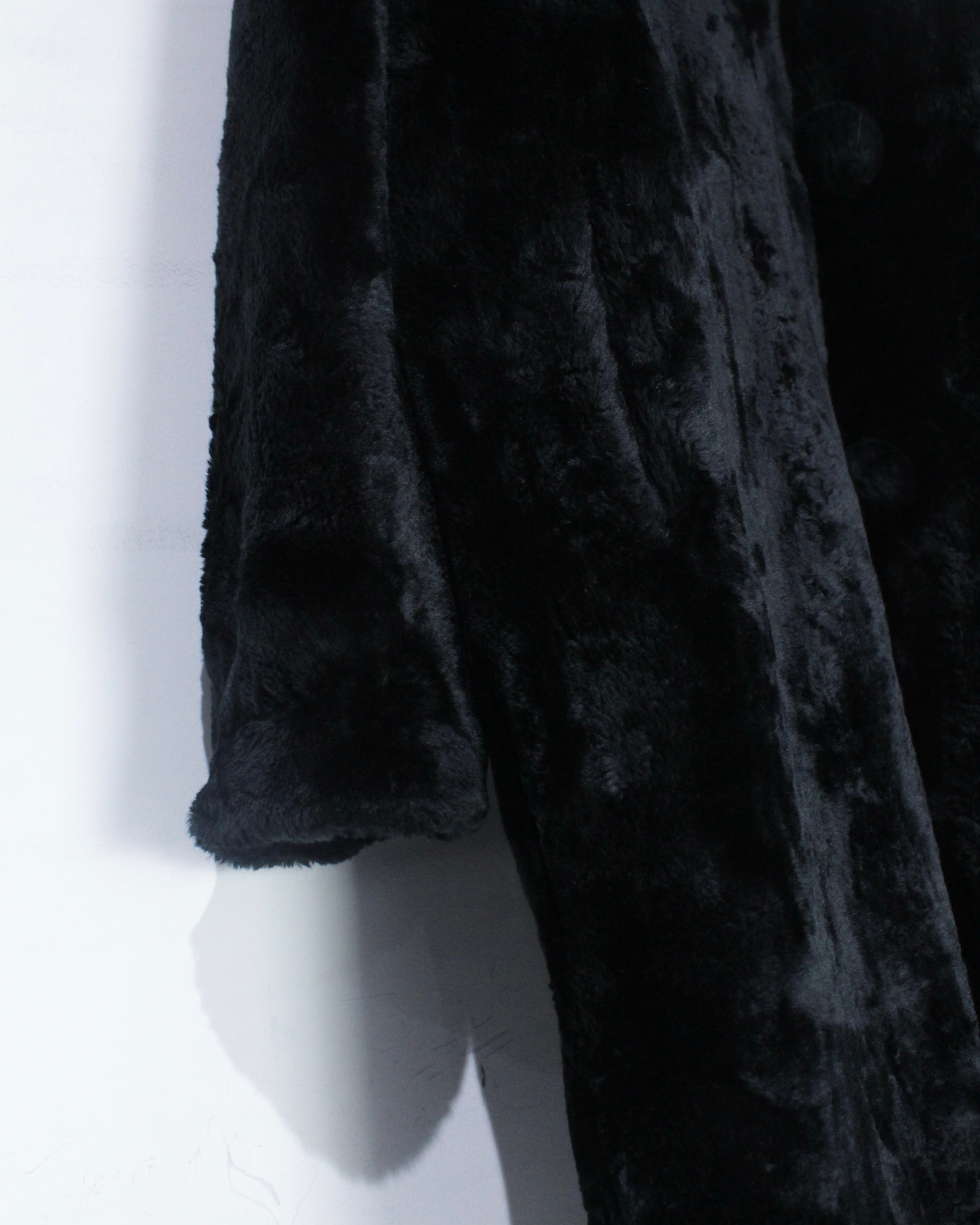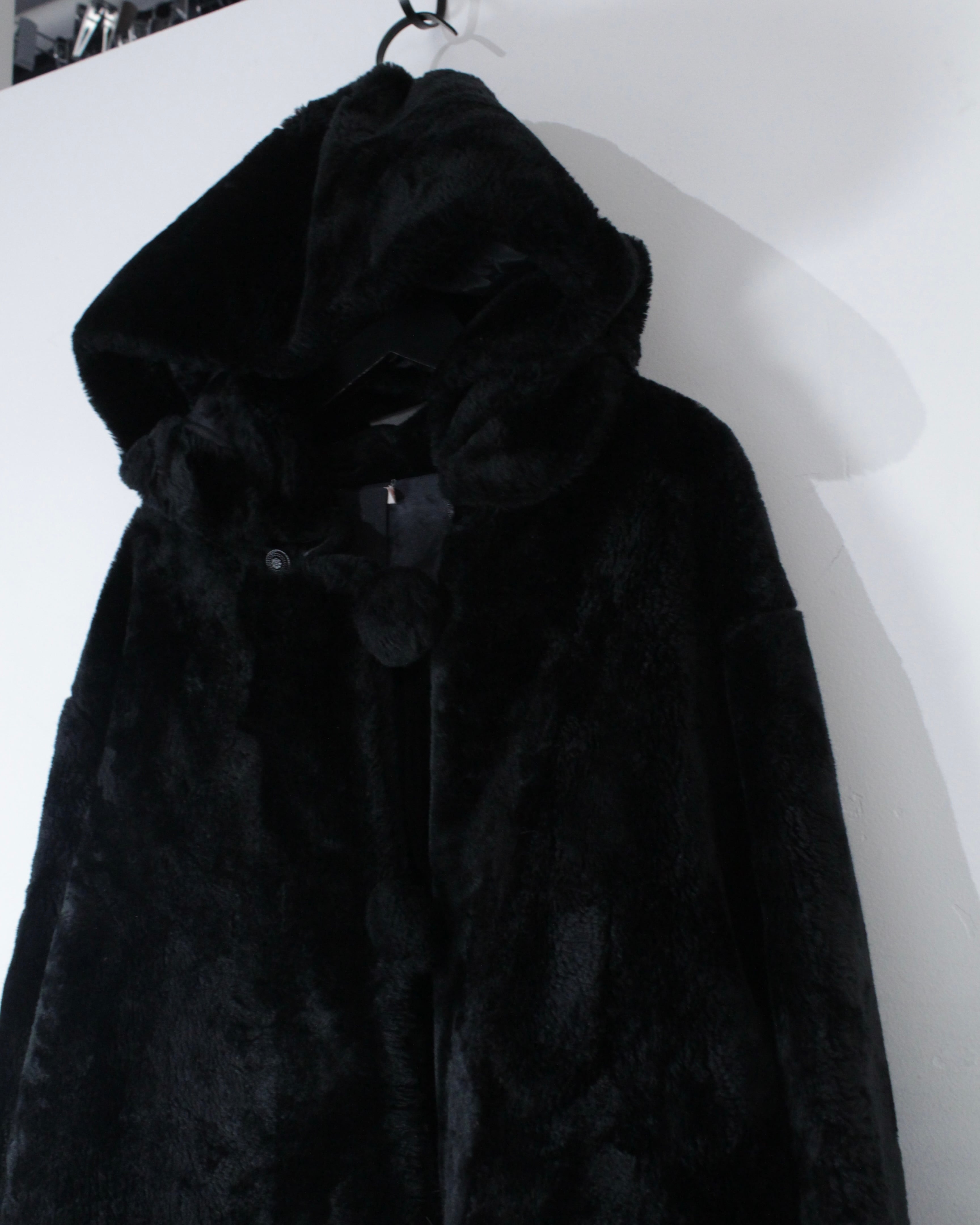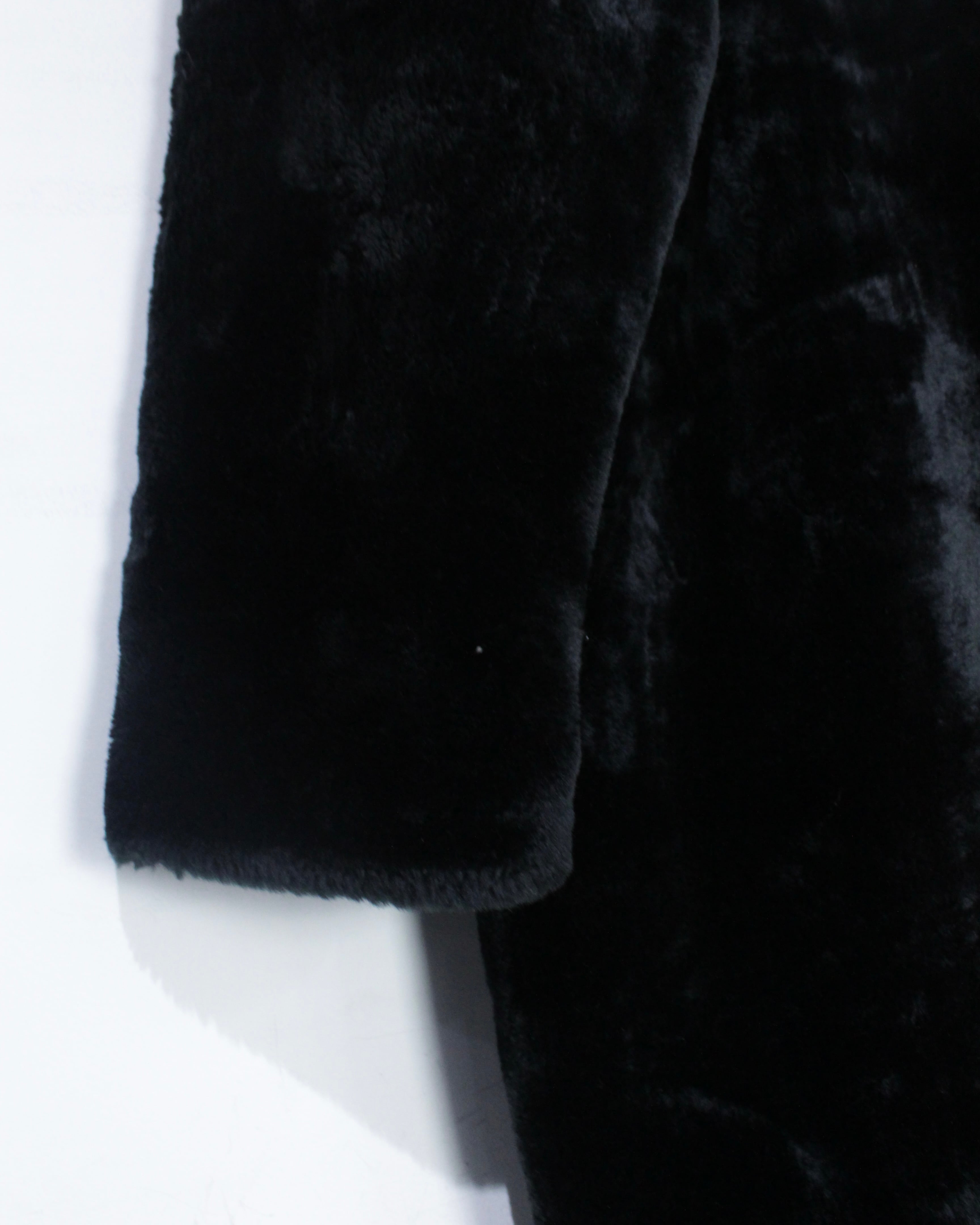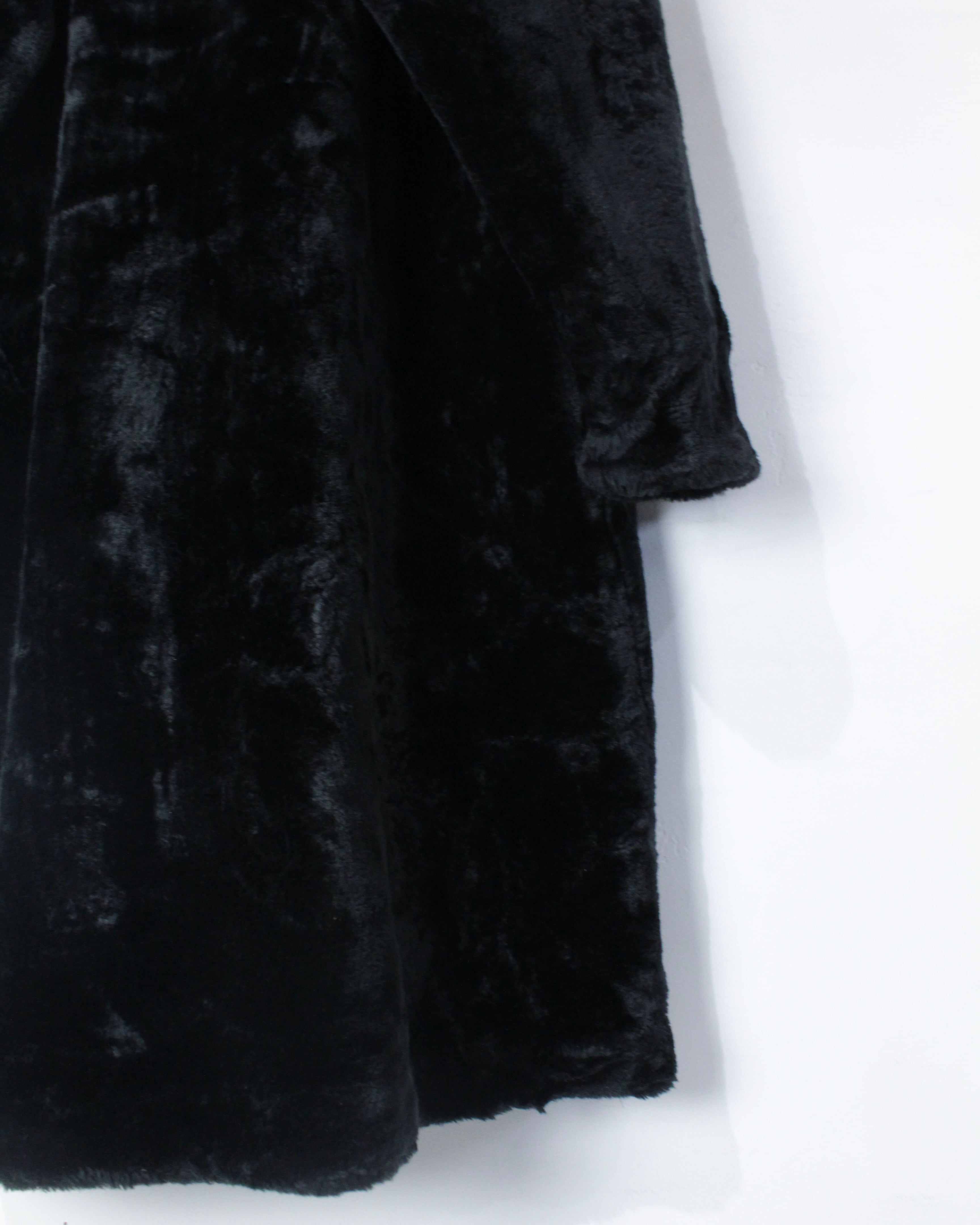 しっかりとした毛足のブラックフェイクファーを使用した、ラグジュアリーなムードを纏ったロングファーコート。