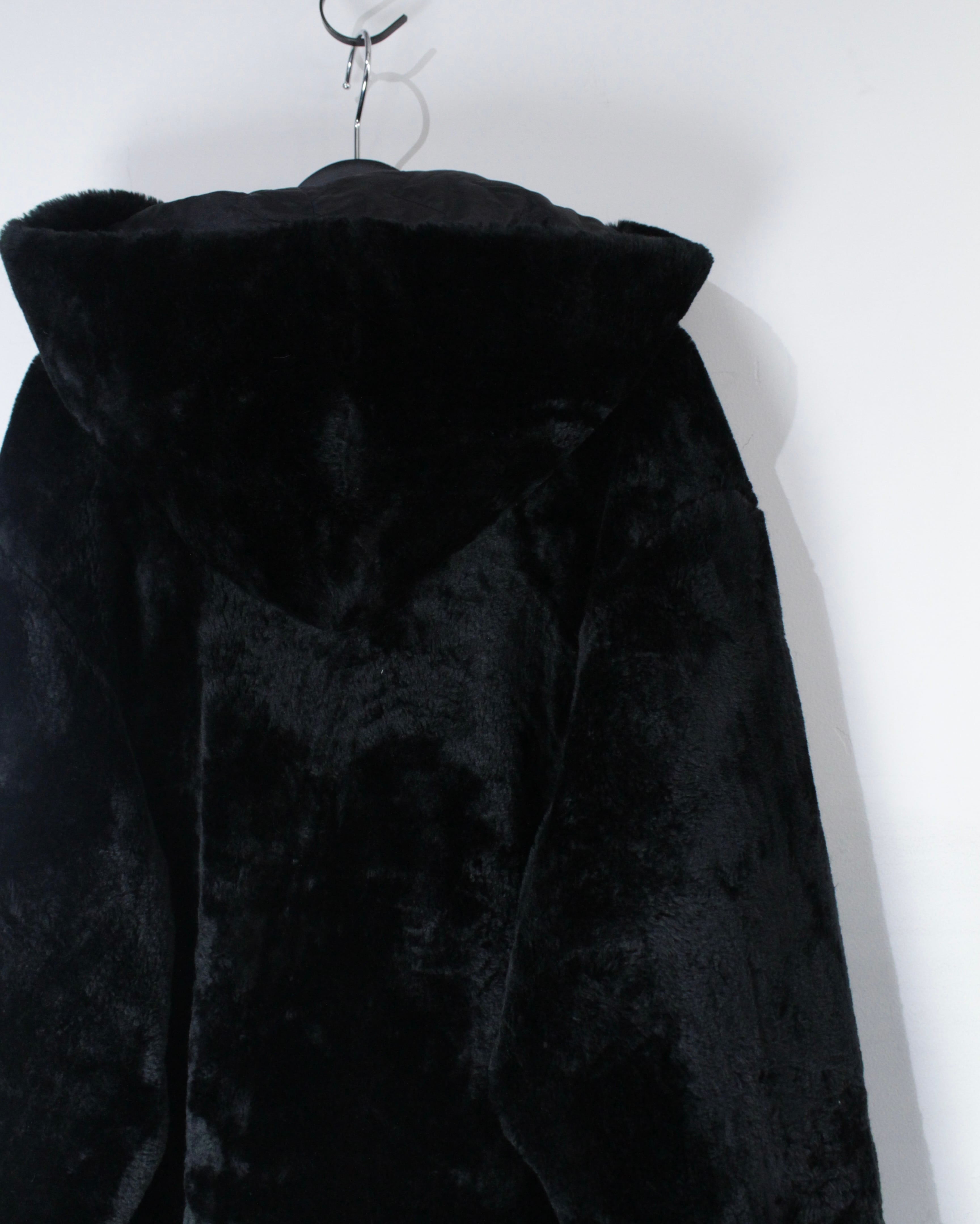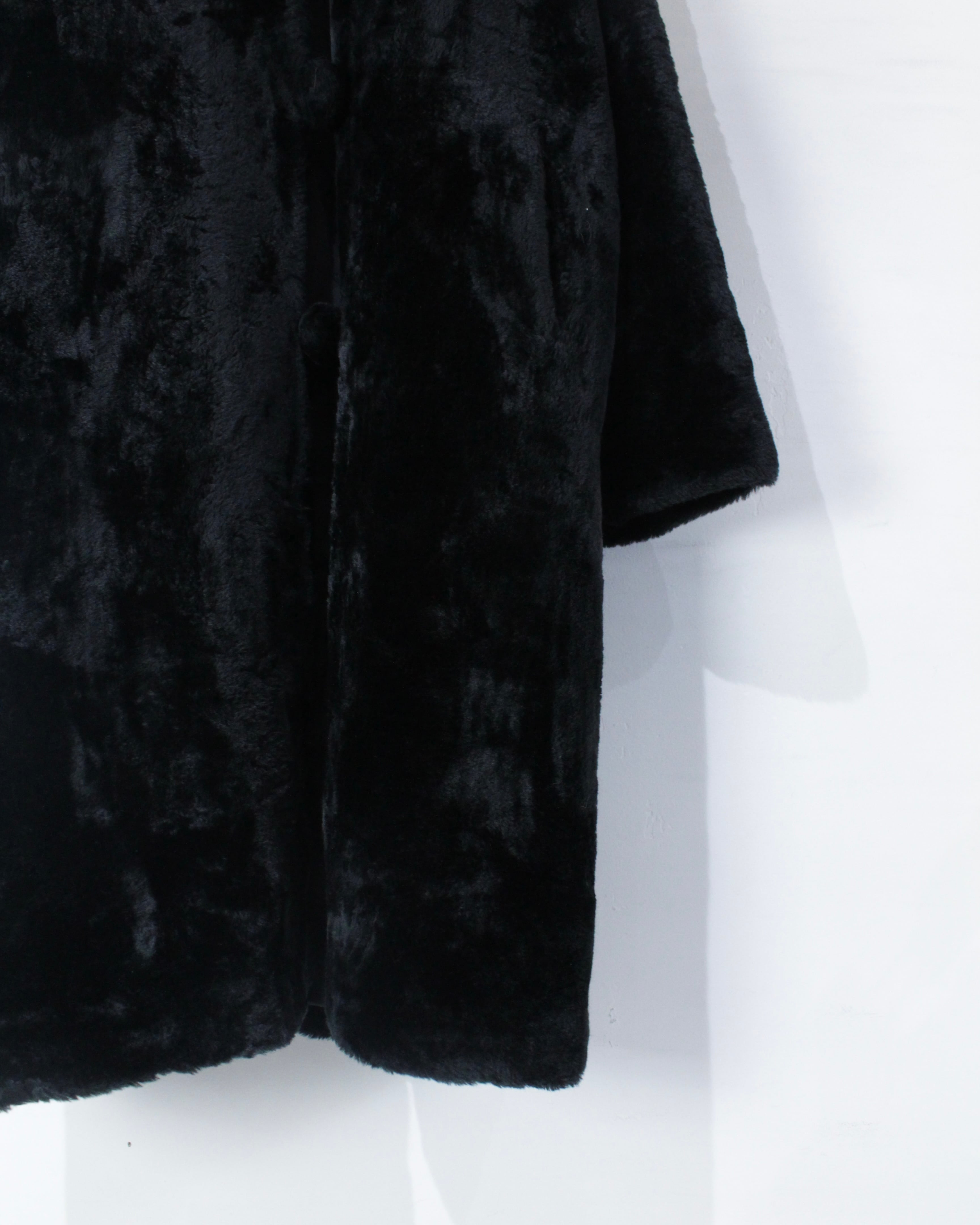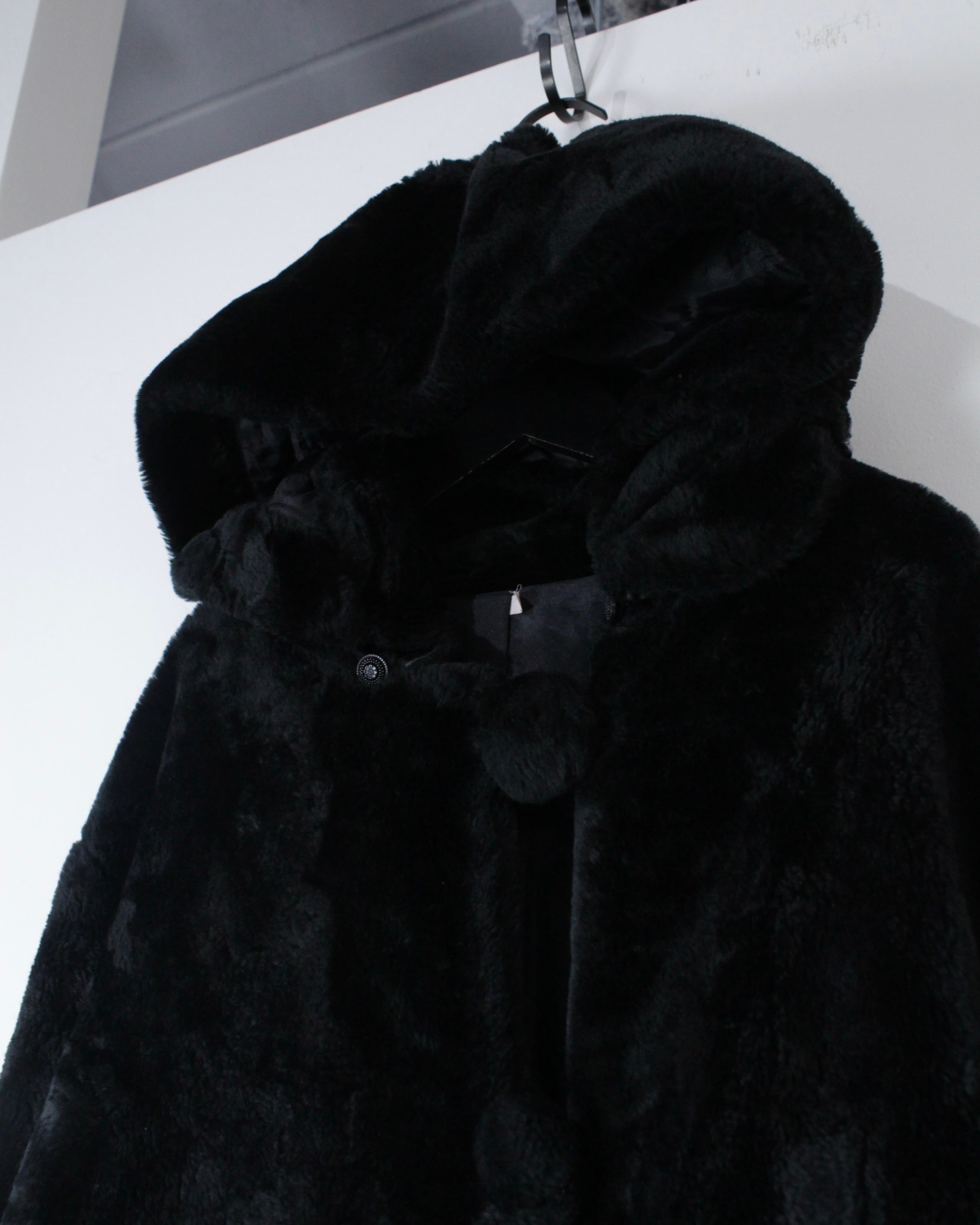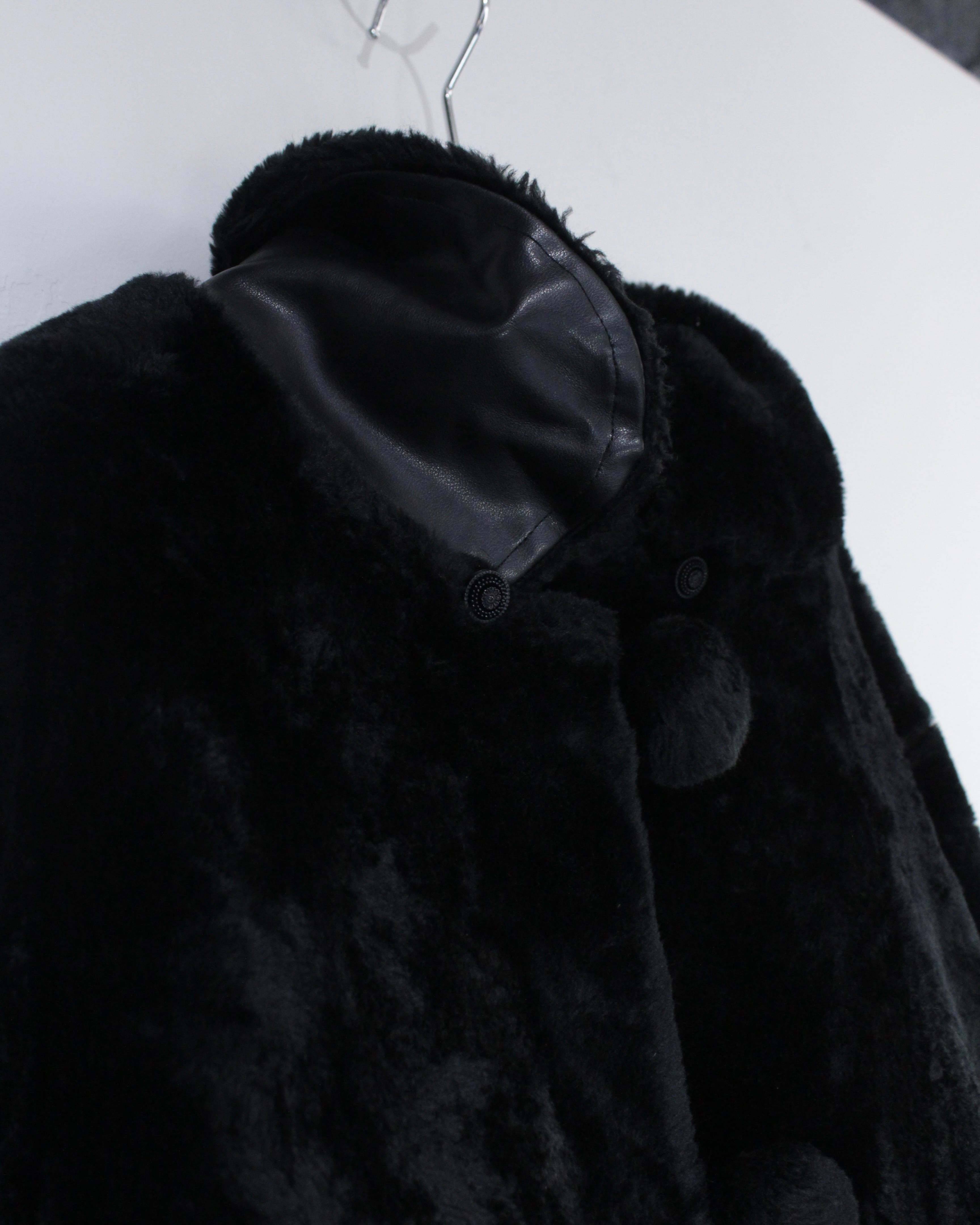しっかりとした毛足のブラックフェイクファーを使用した、ラグジュアリーなムードを纏ったロングファーコート。