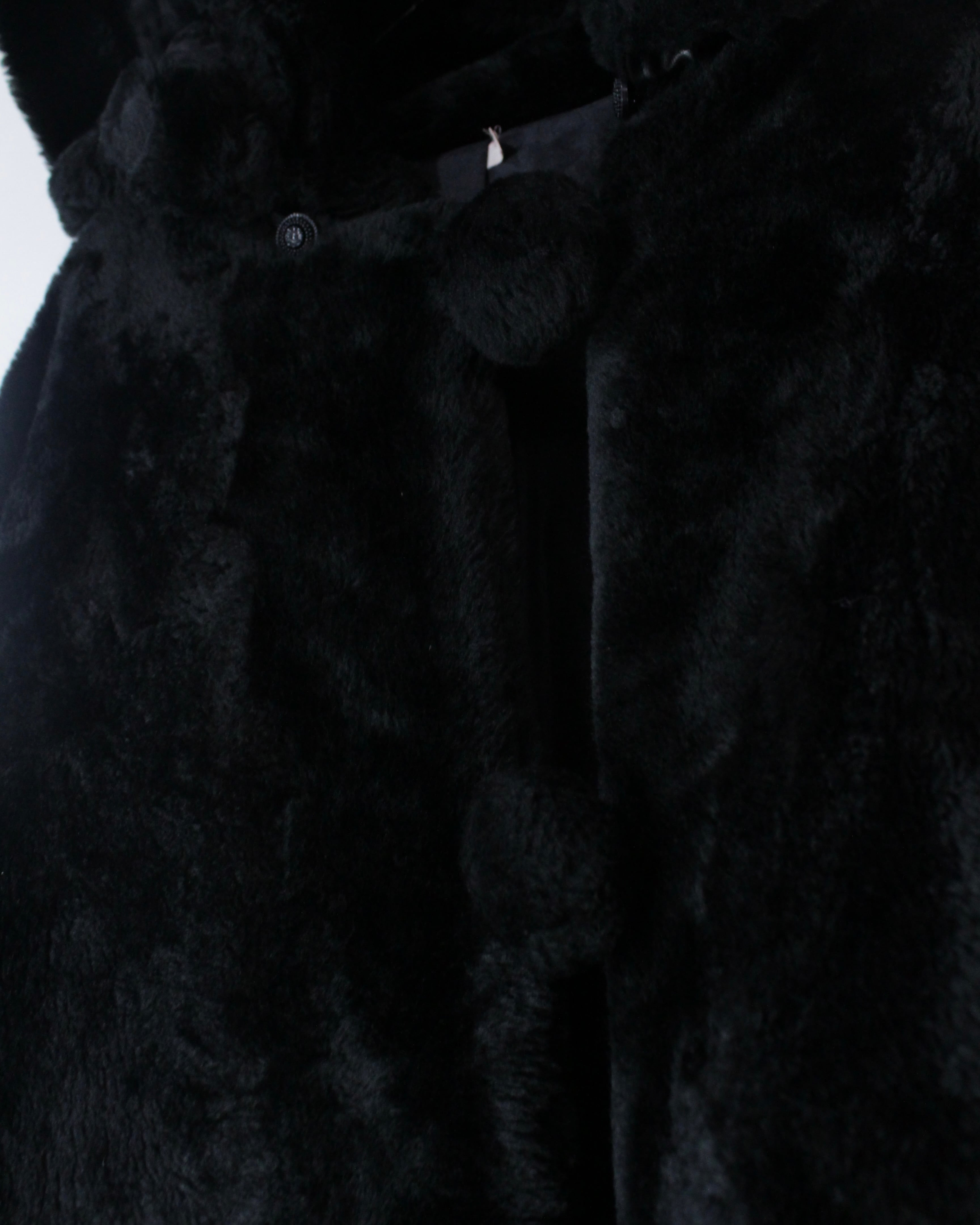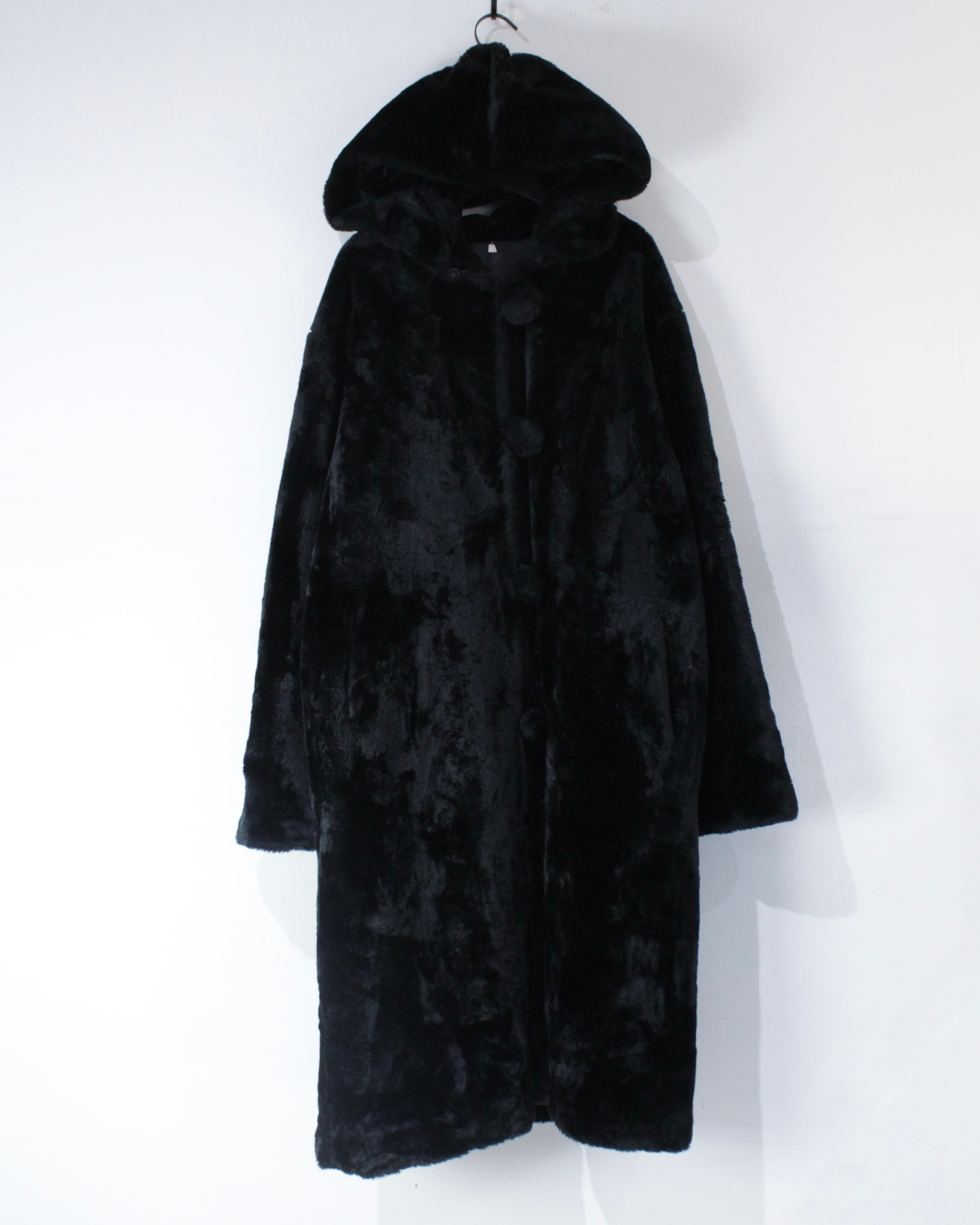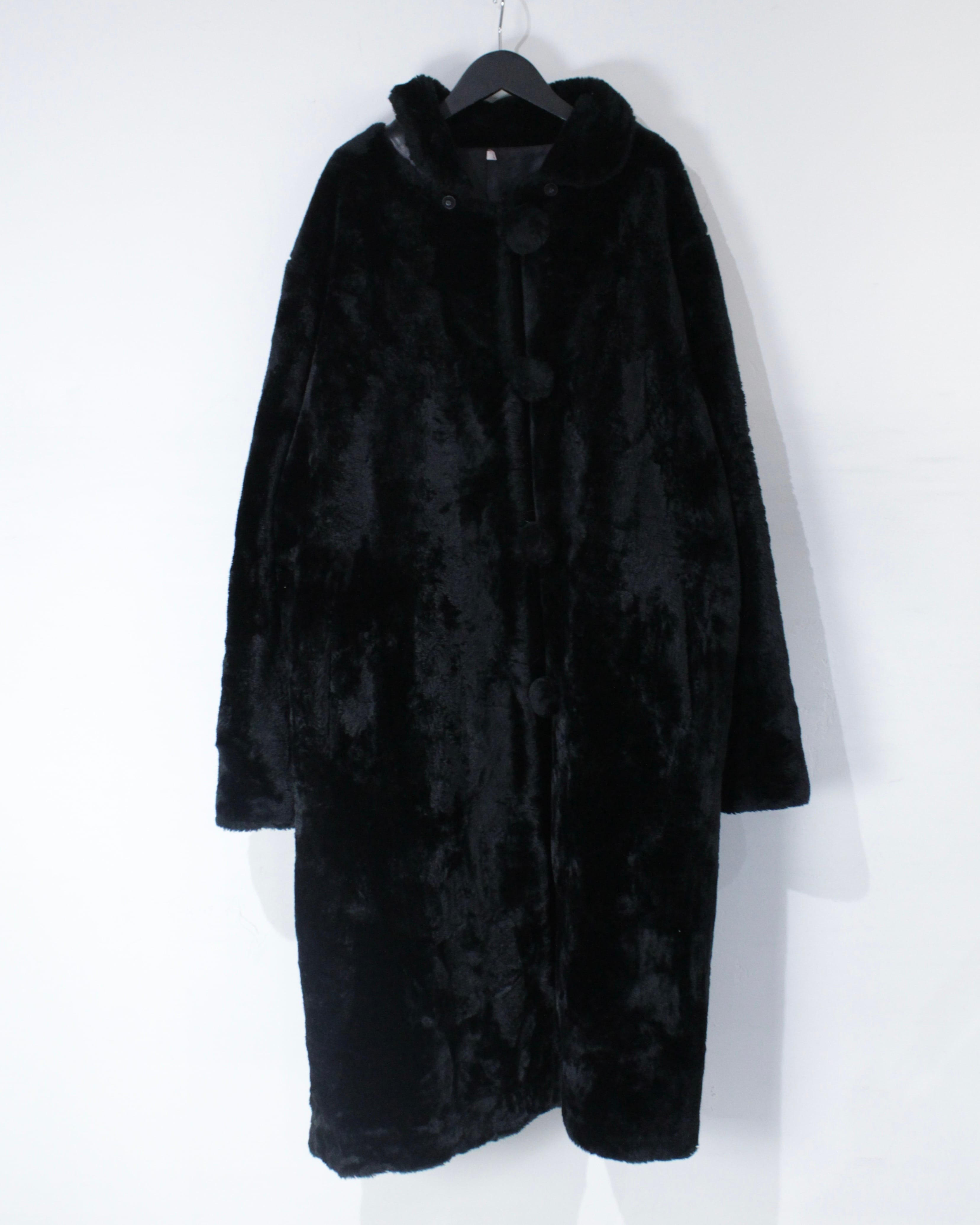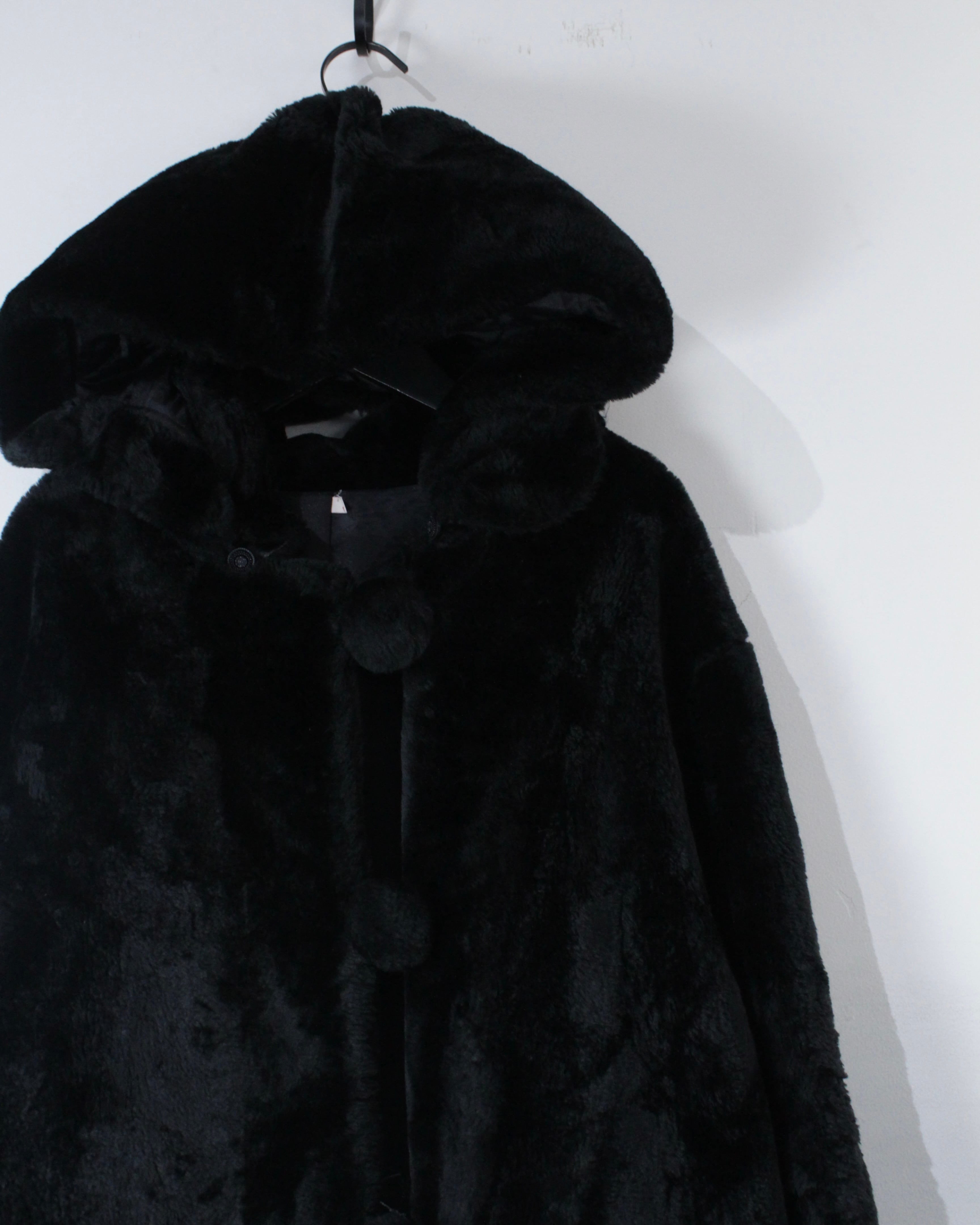 しっかりとした毛足のブラックフェイクファーを使用した、ラグジュアリーなムードを纏ったロングファーコート。