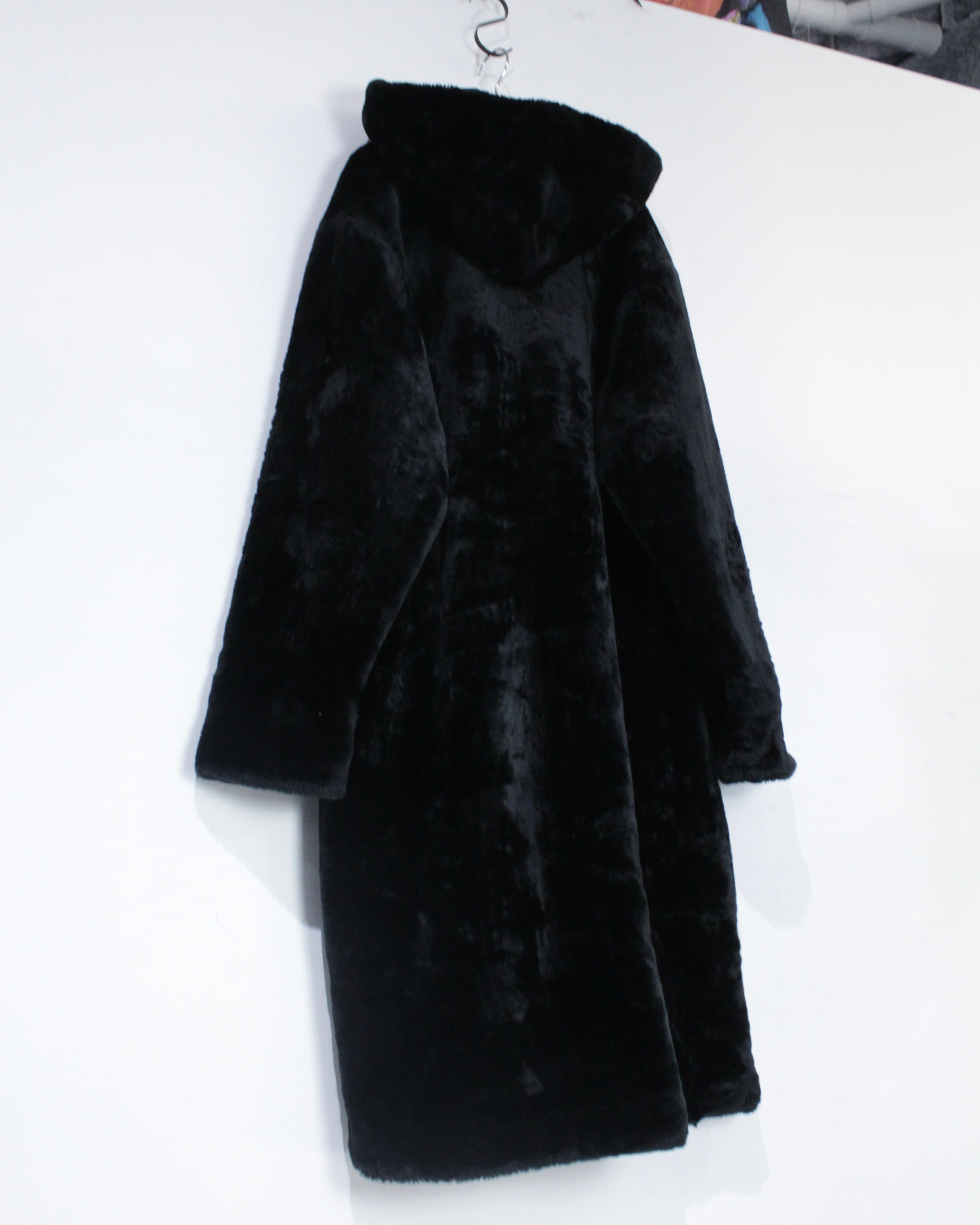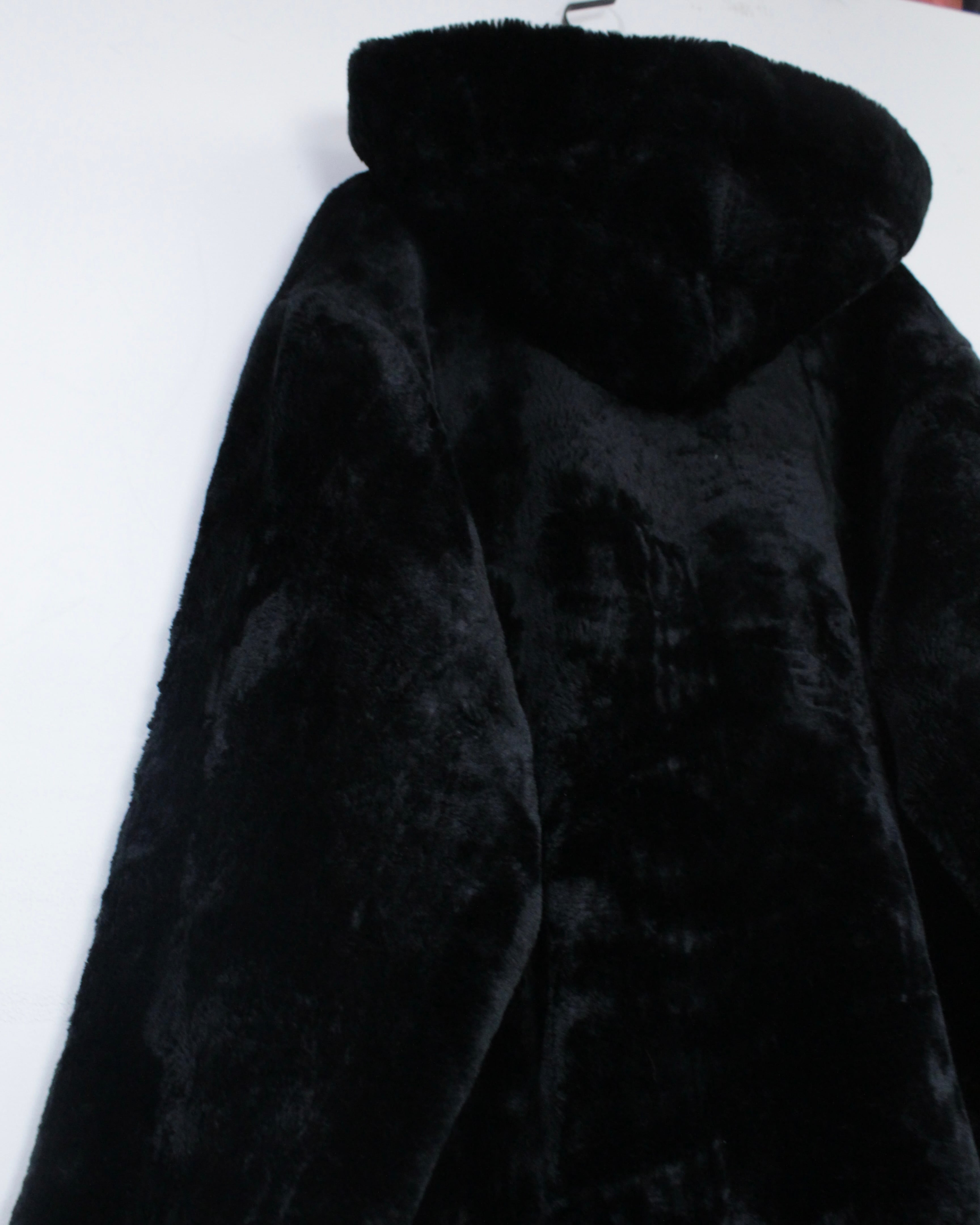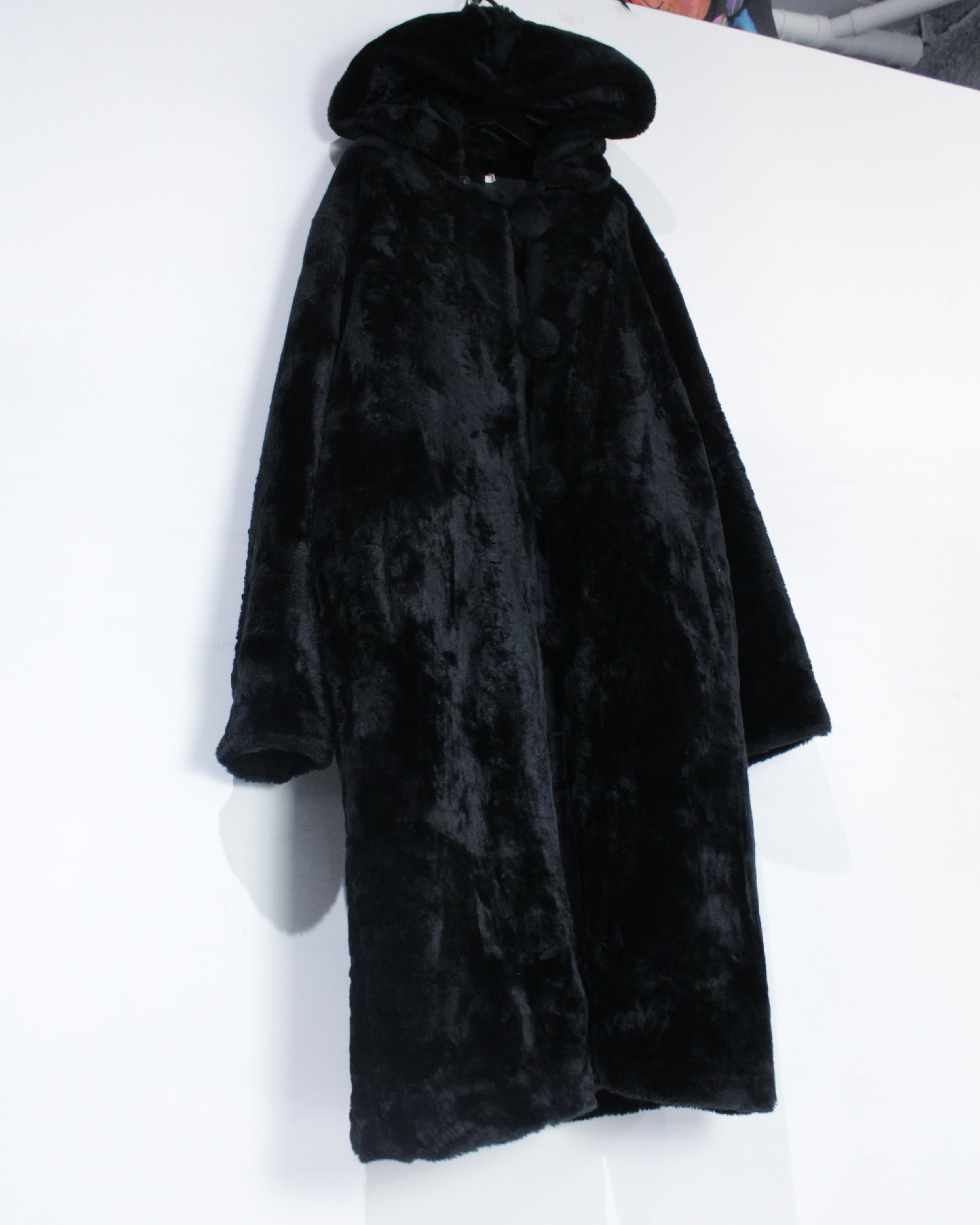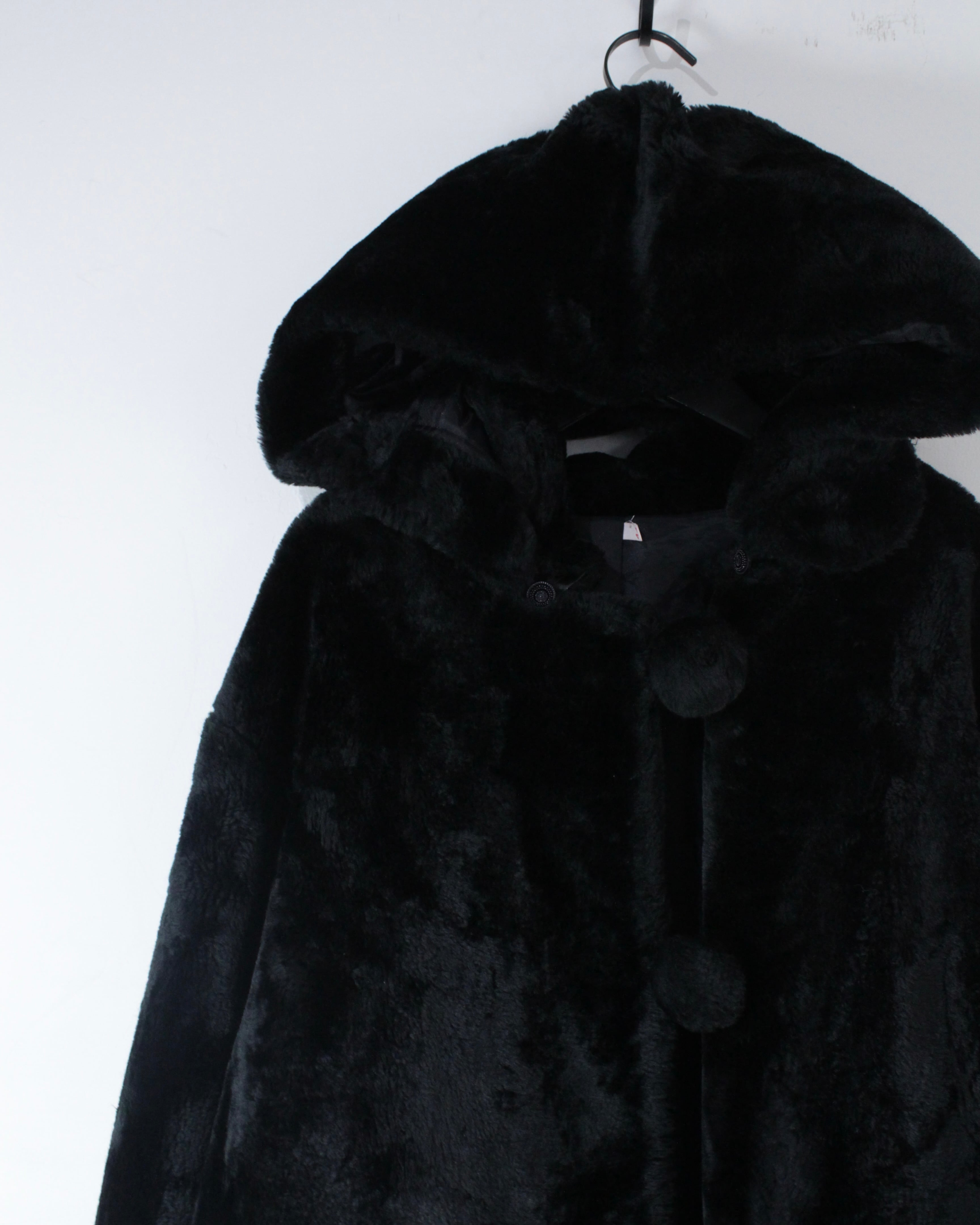 しっかりとした毛足のブラックフェイクファーを使用した、ラグジュアリーなムードを纏ったロングファーコート。