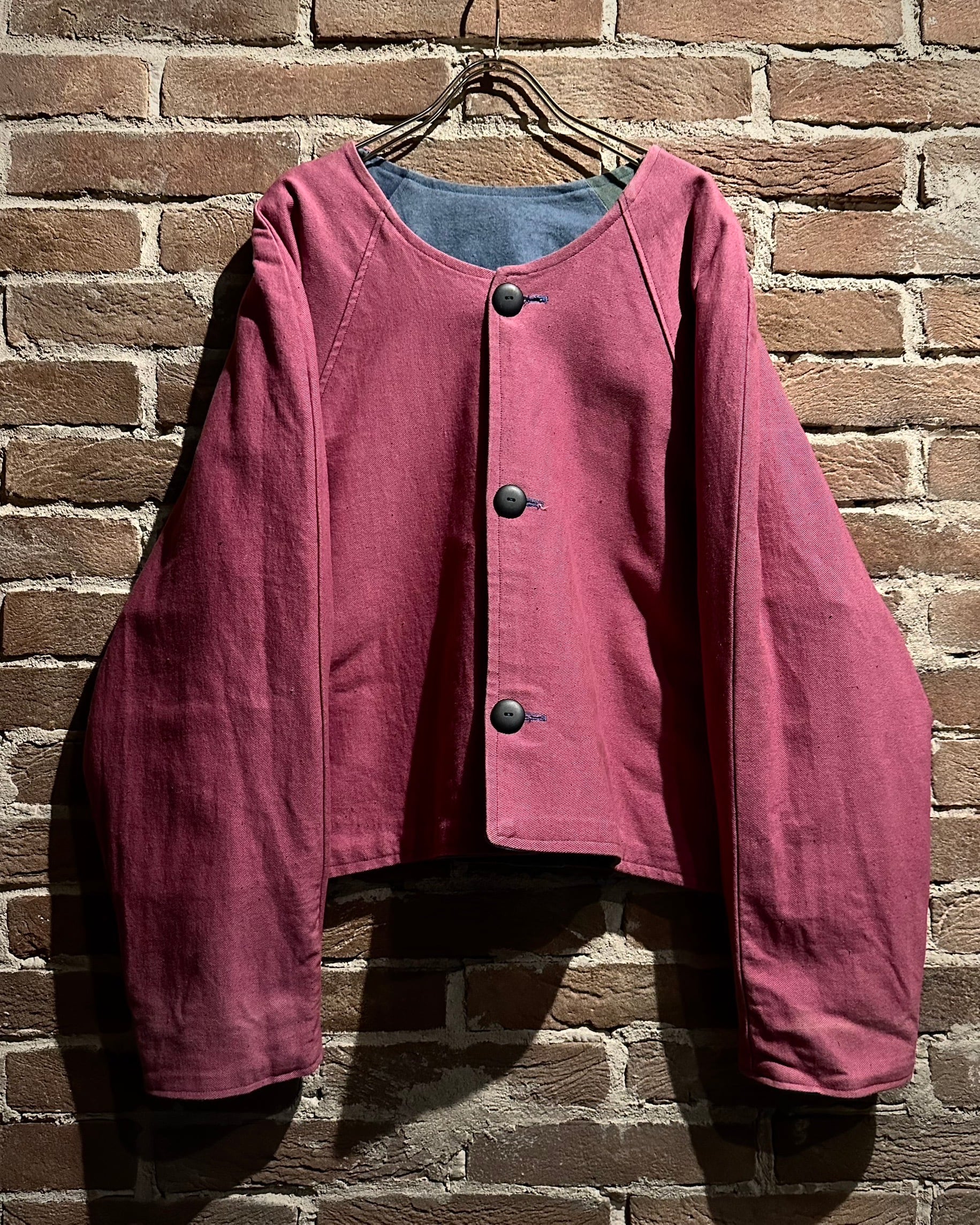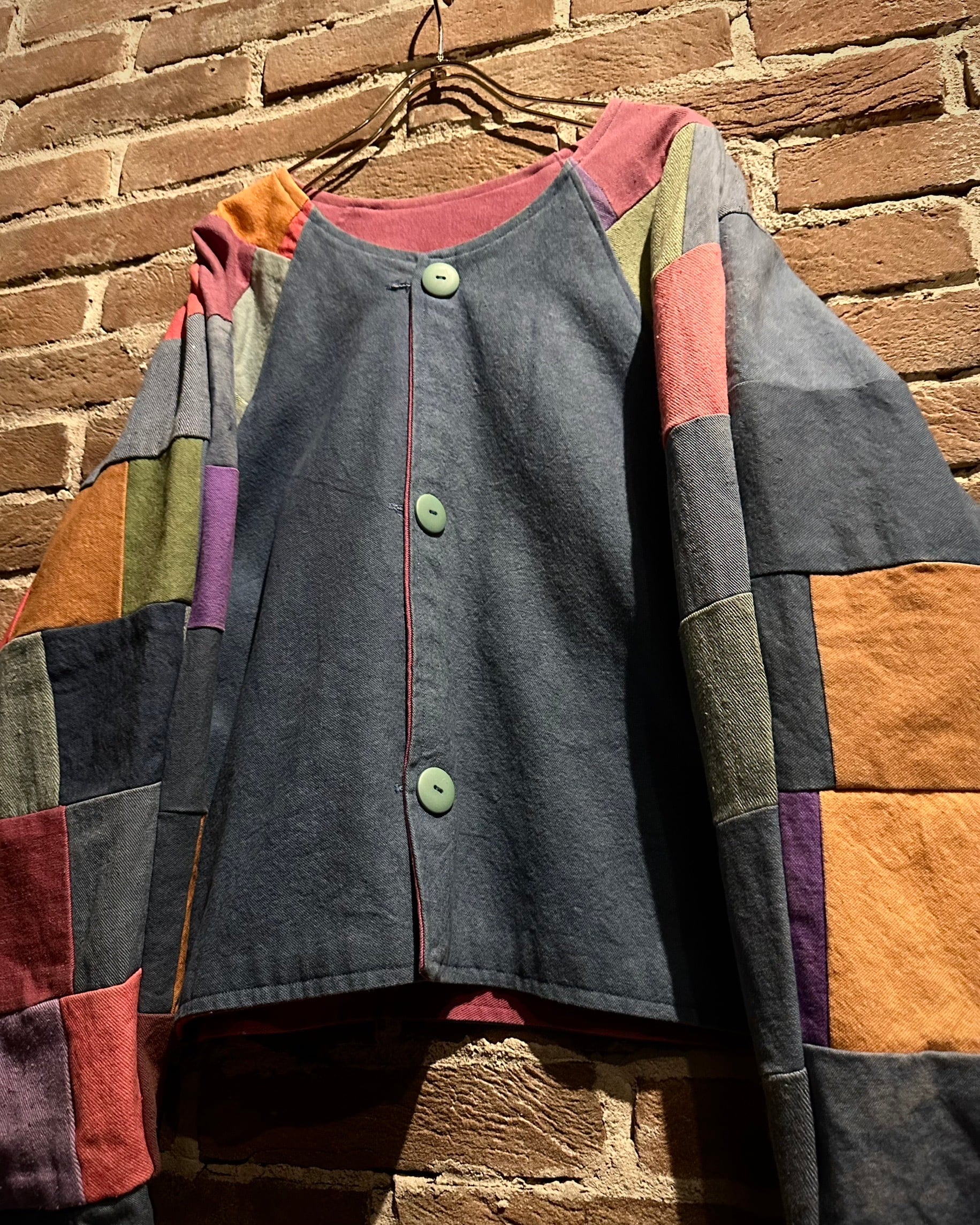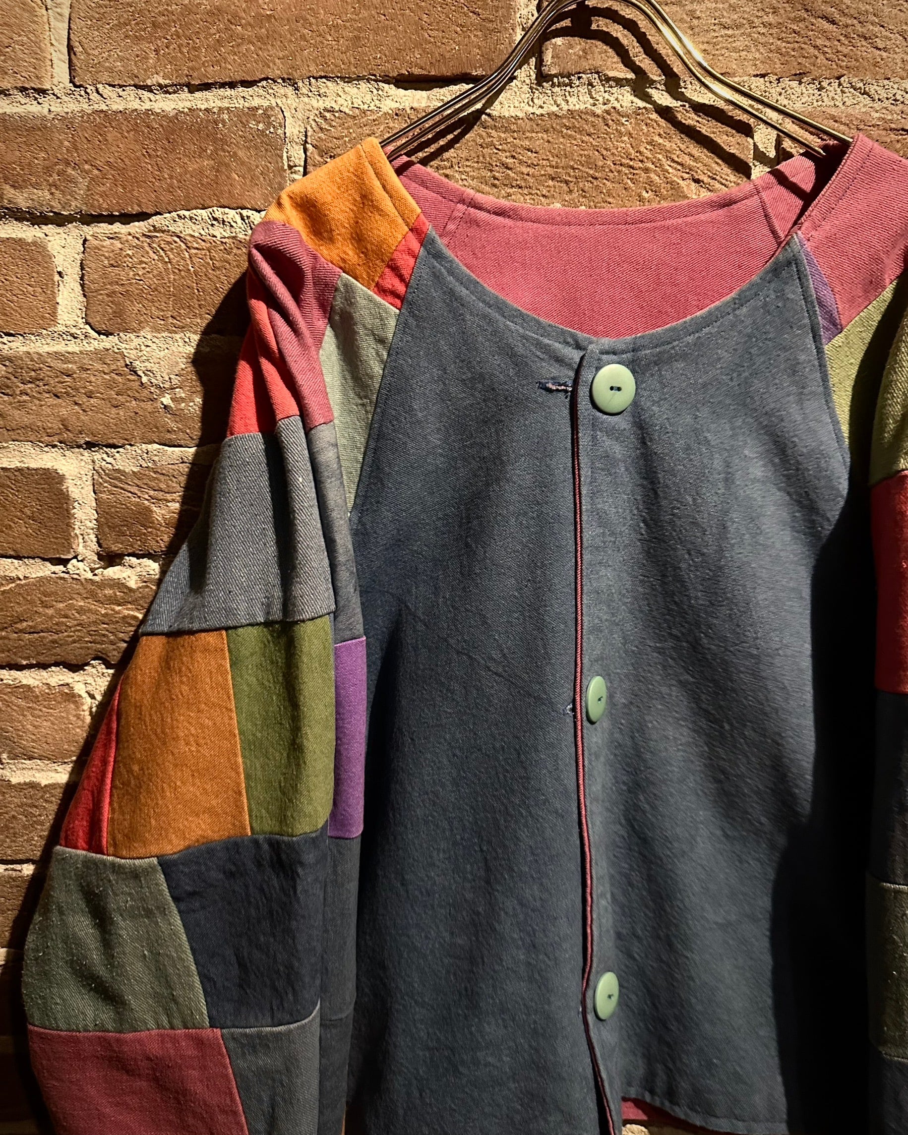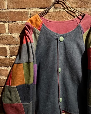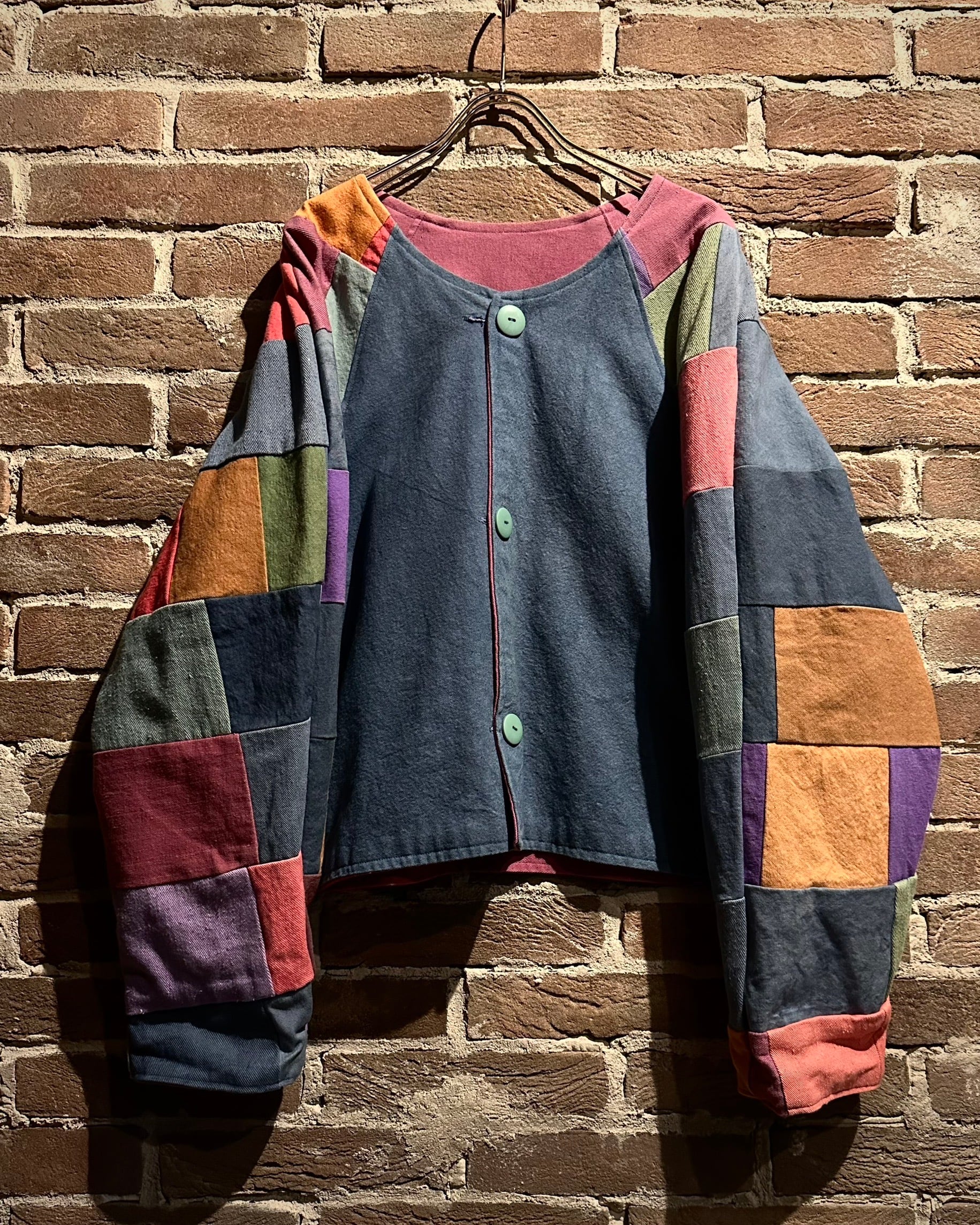 片面は多色使いのパッチワークスリーブ、もう片面は優しげなピンクで仕上げられた、リバーシブル仕様のジャケット。