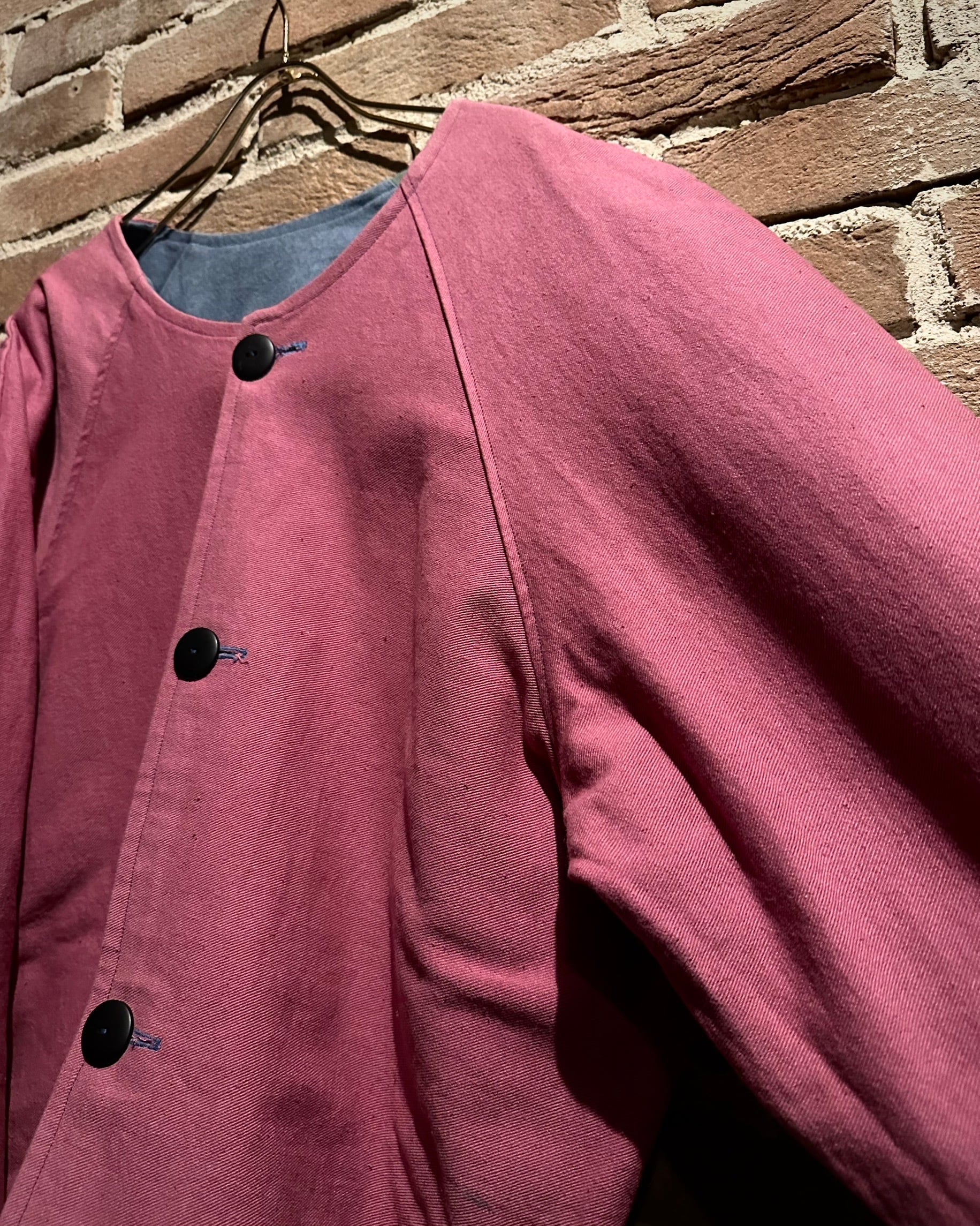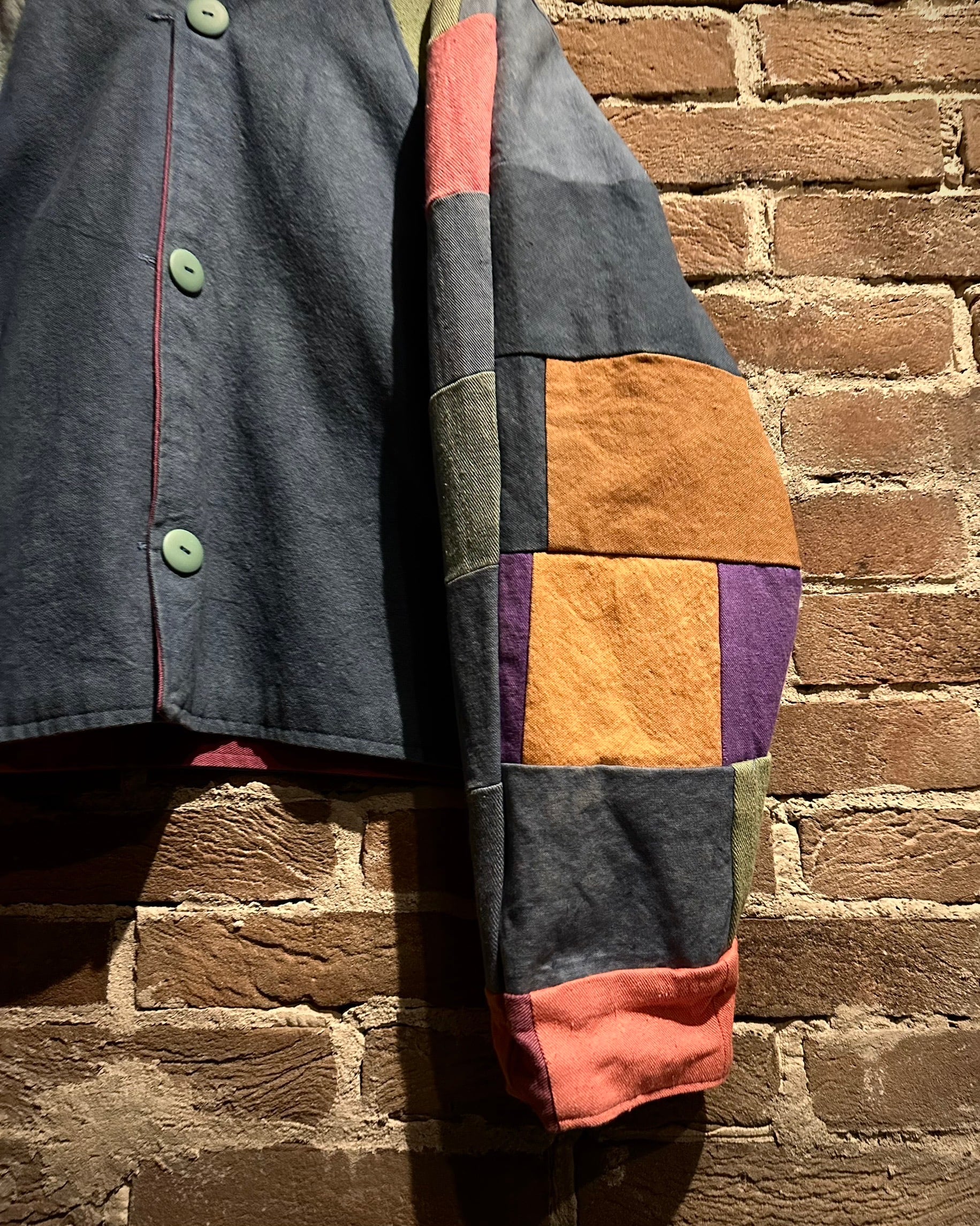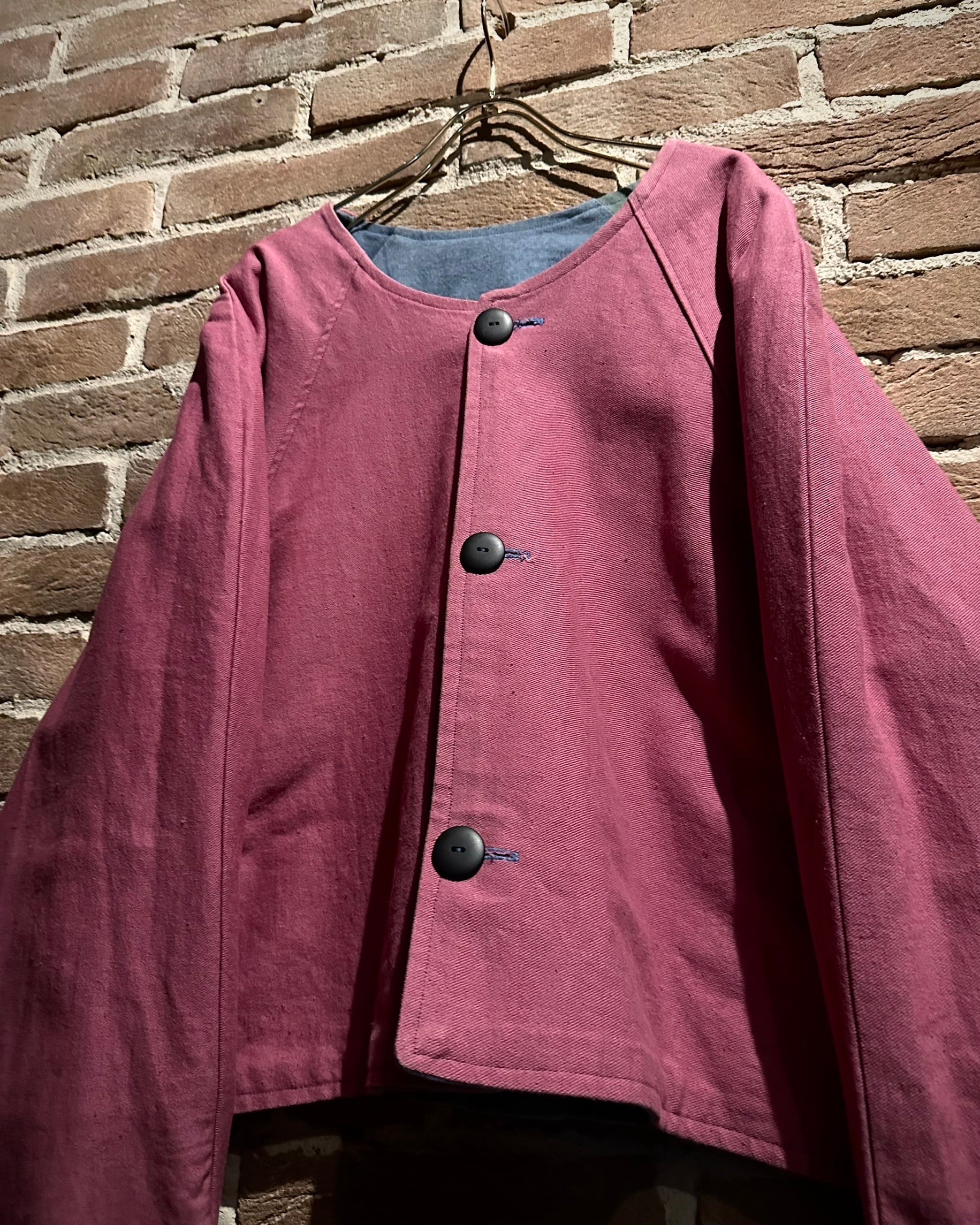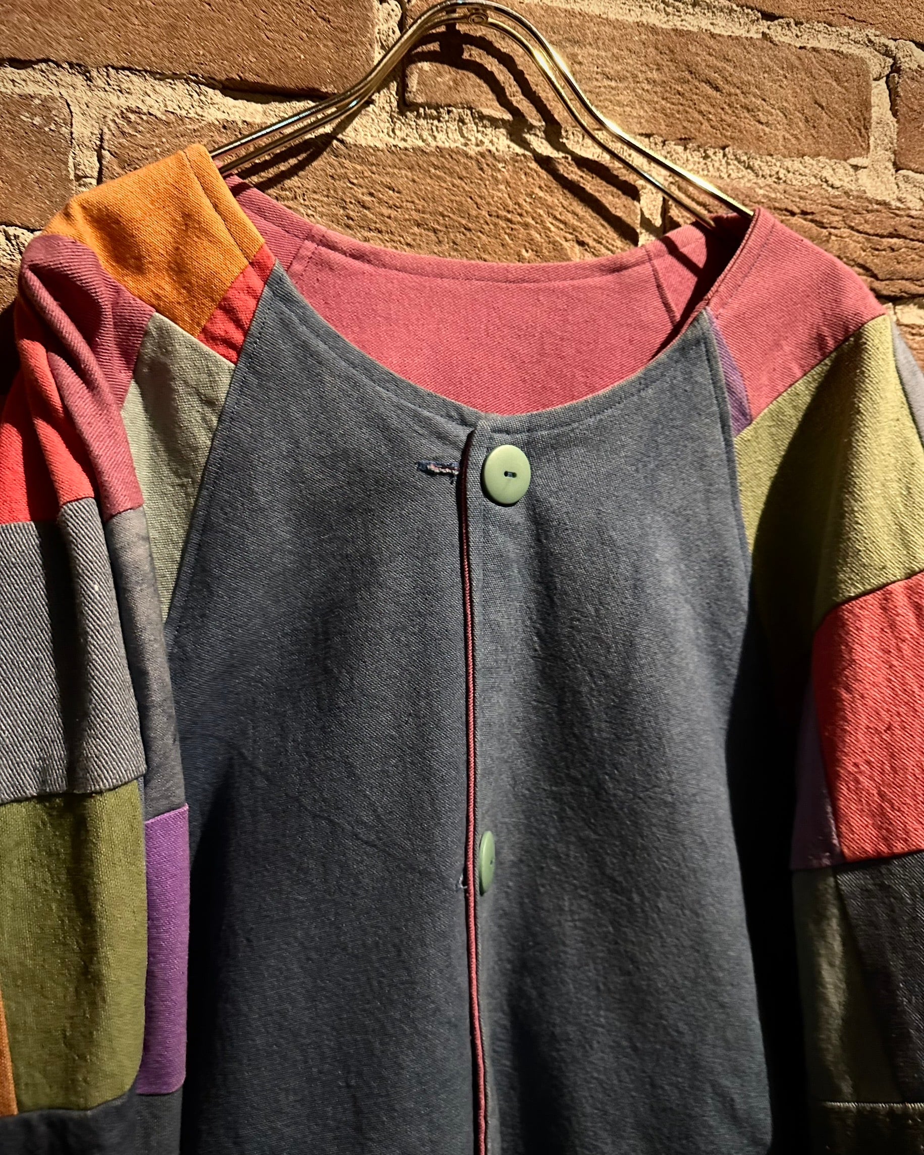 片面は多色使いのパッチワークスリーブ、もう片面は優しげなピンクで仕上げられた、リバーシブル仕様のジャケット。