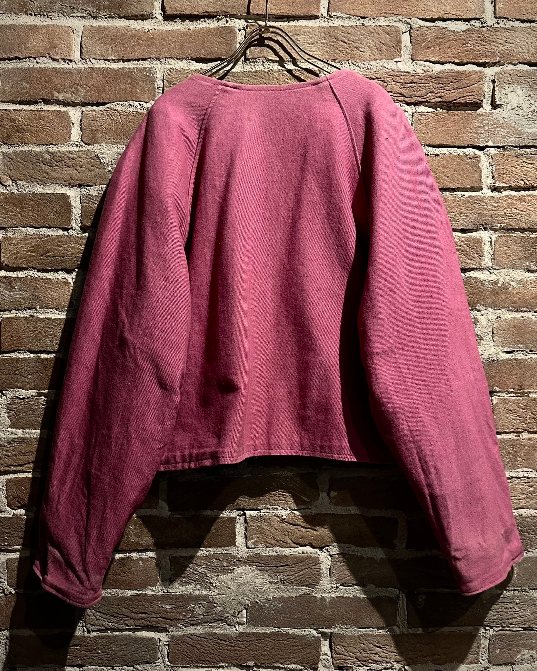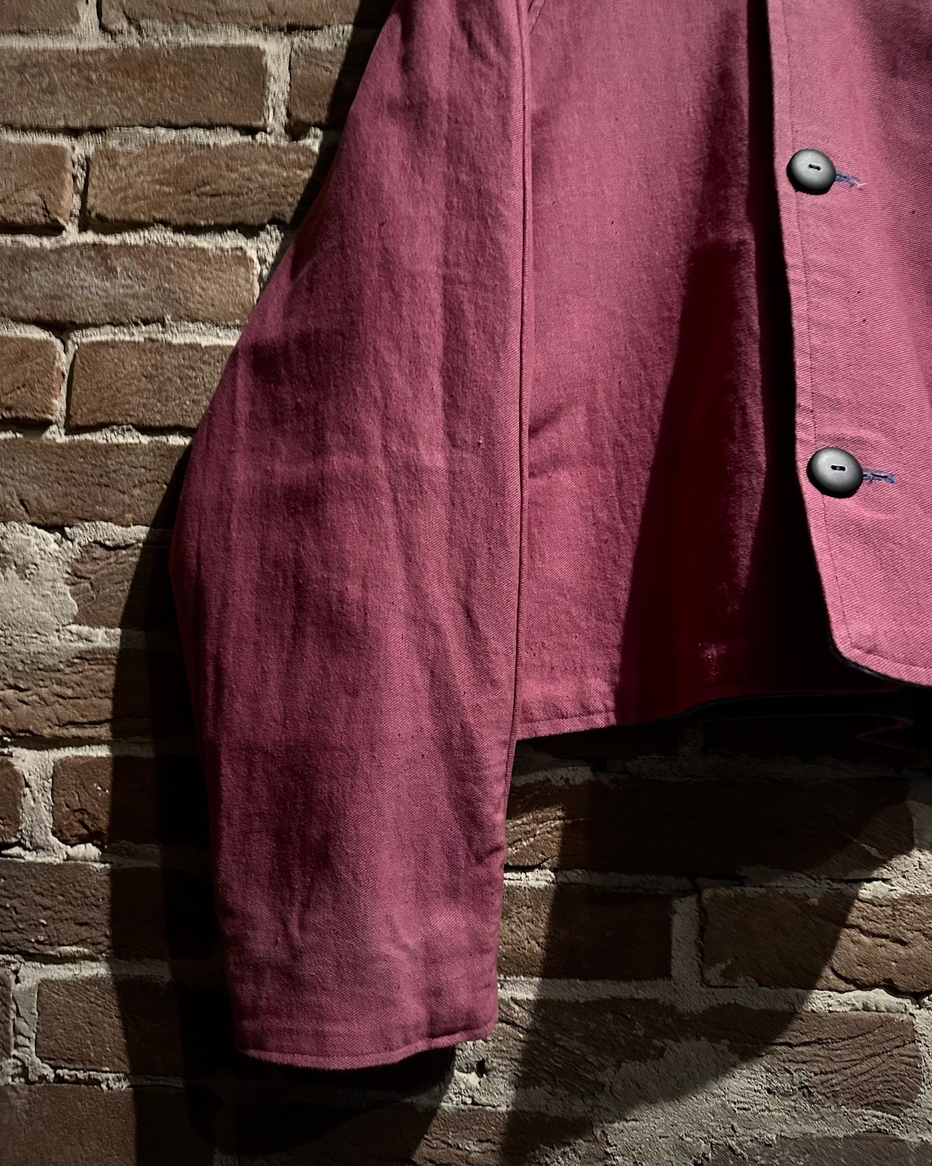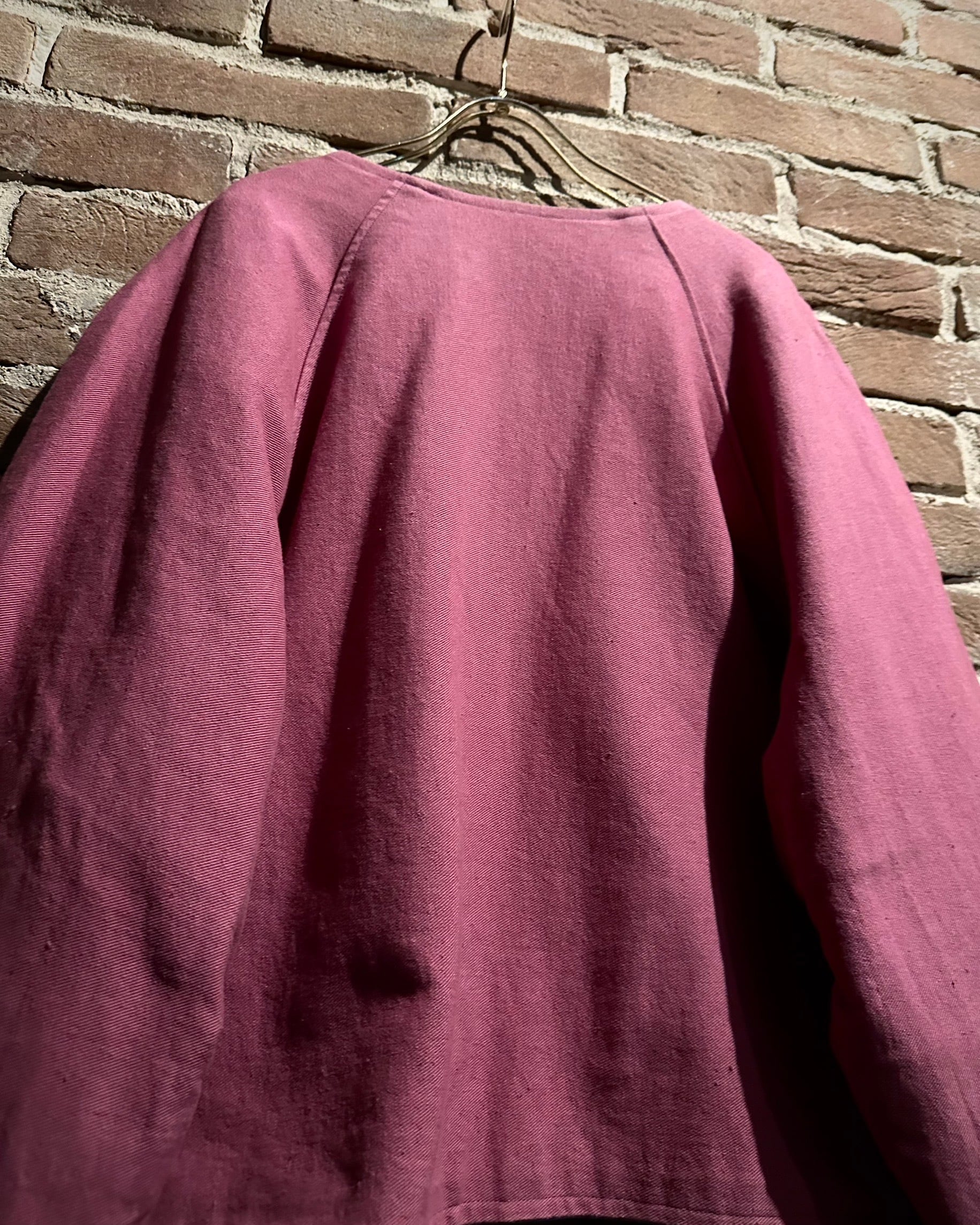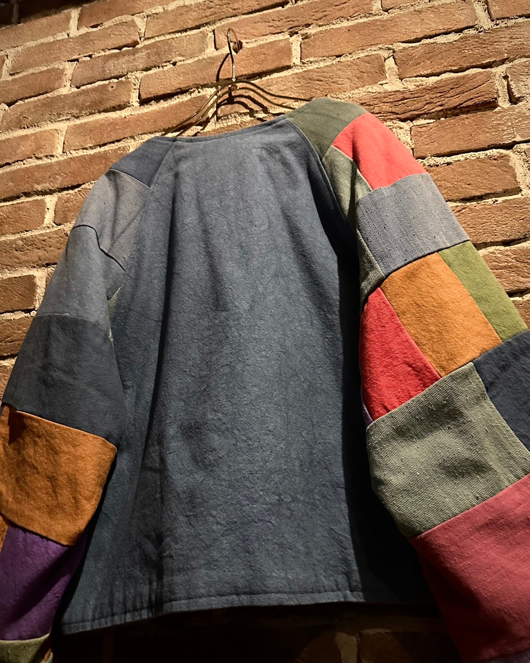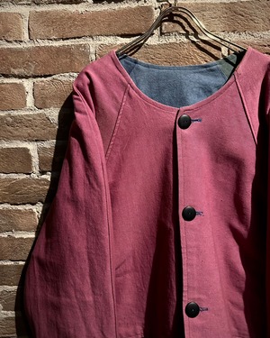 片面は多色使いのパッチワークスリーブ、もう片面は優しげなピンクで仕上げられた、リバーシブル仕様のジャケット。