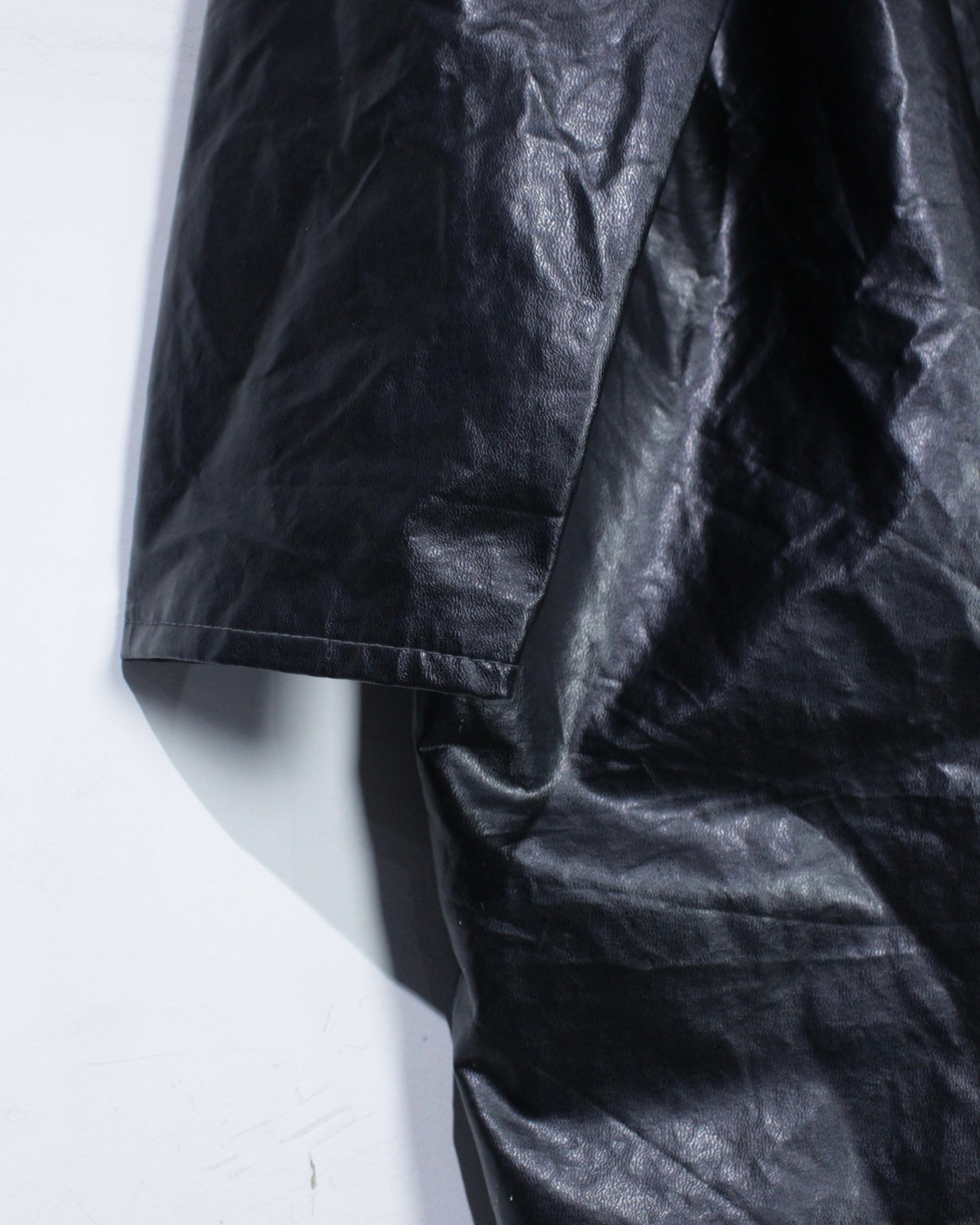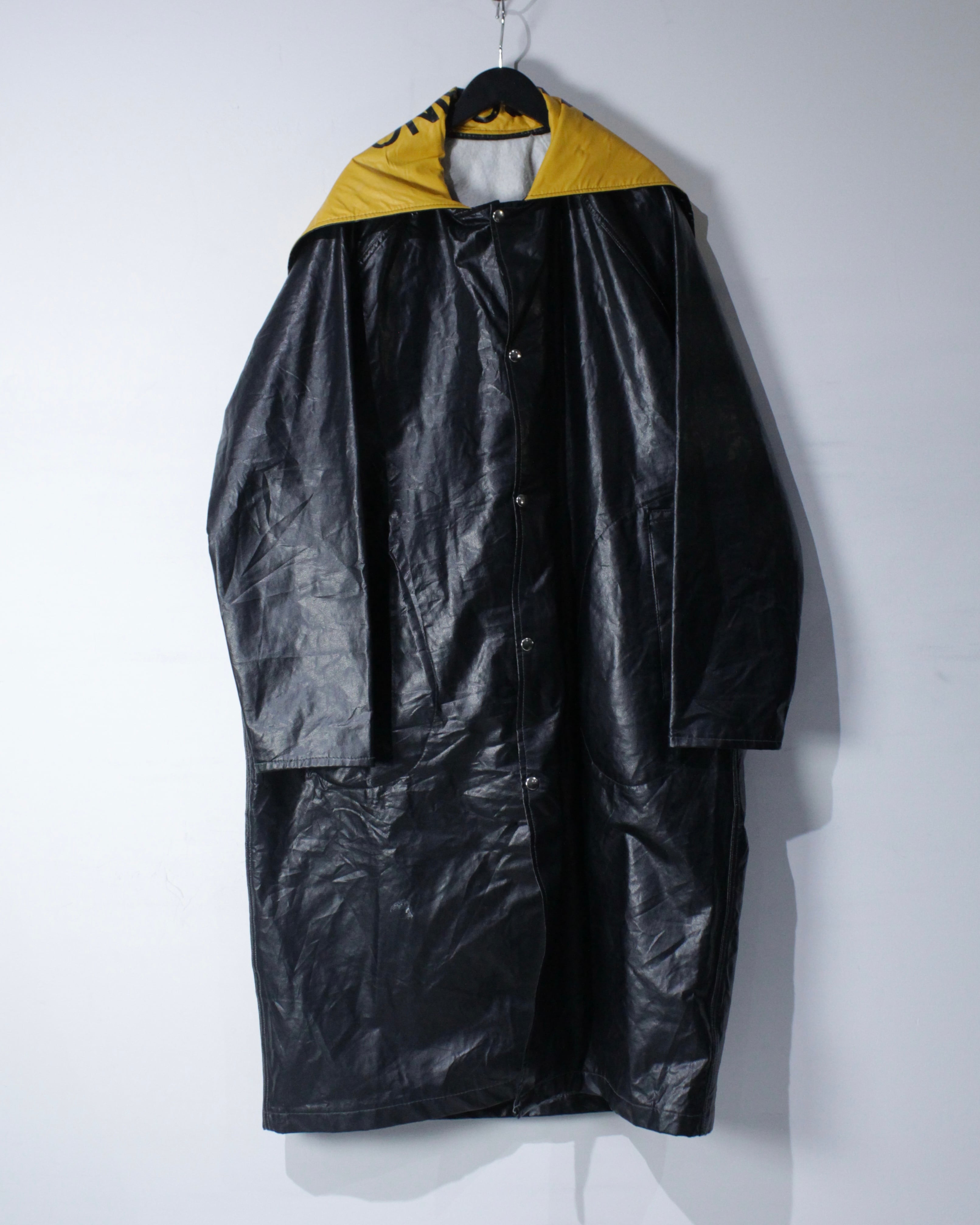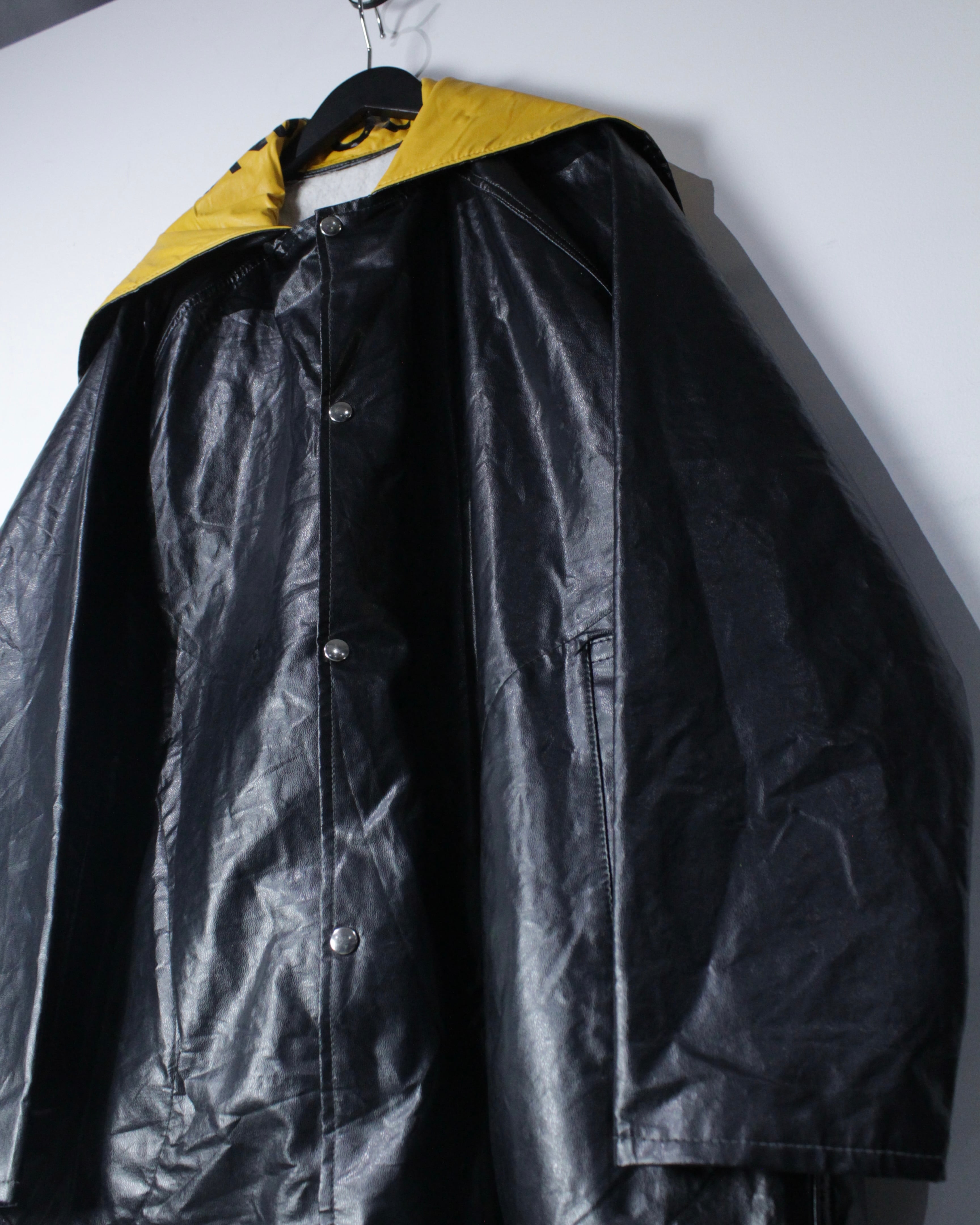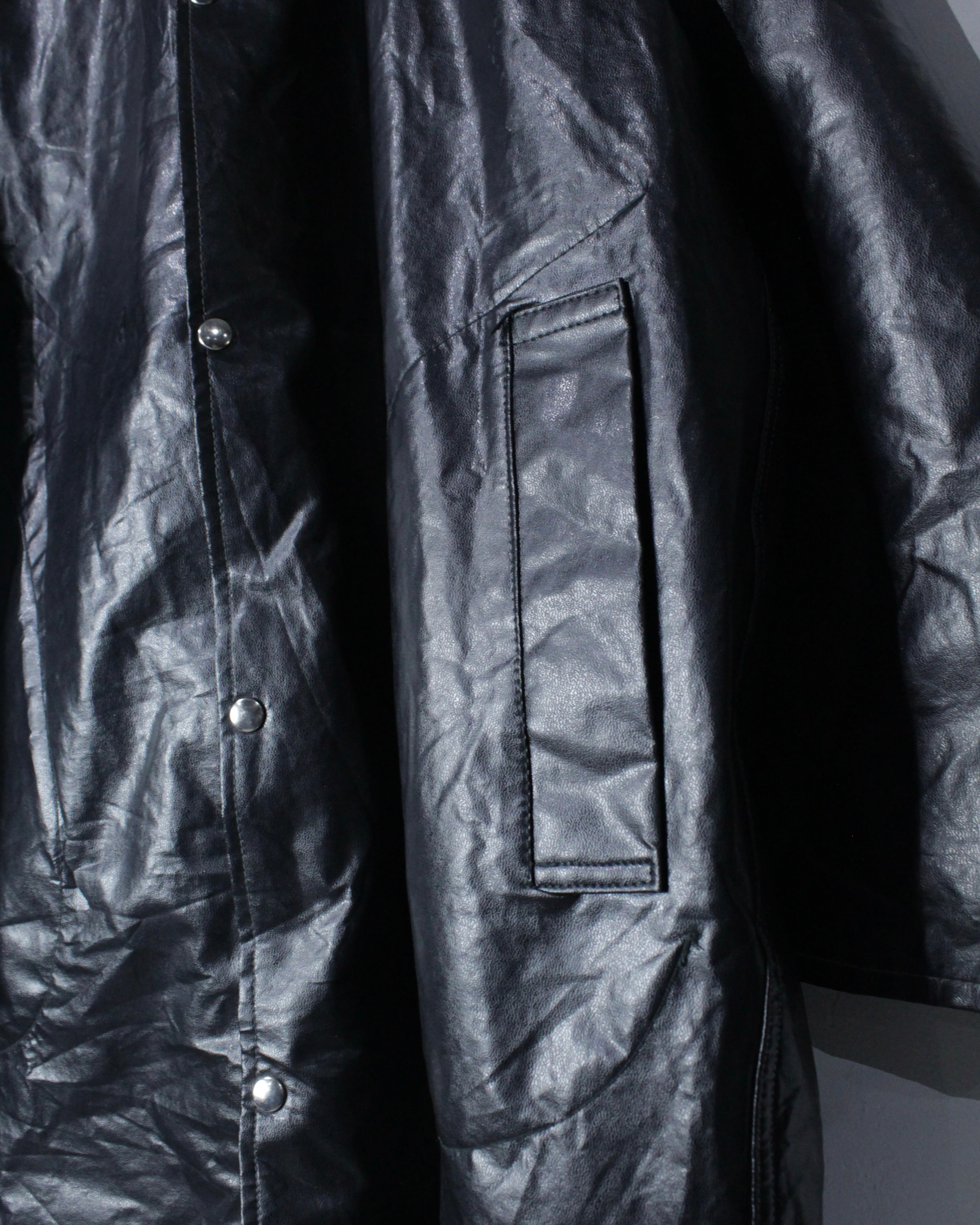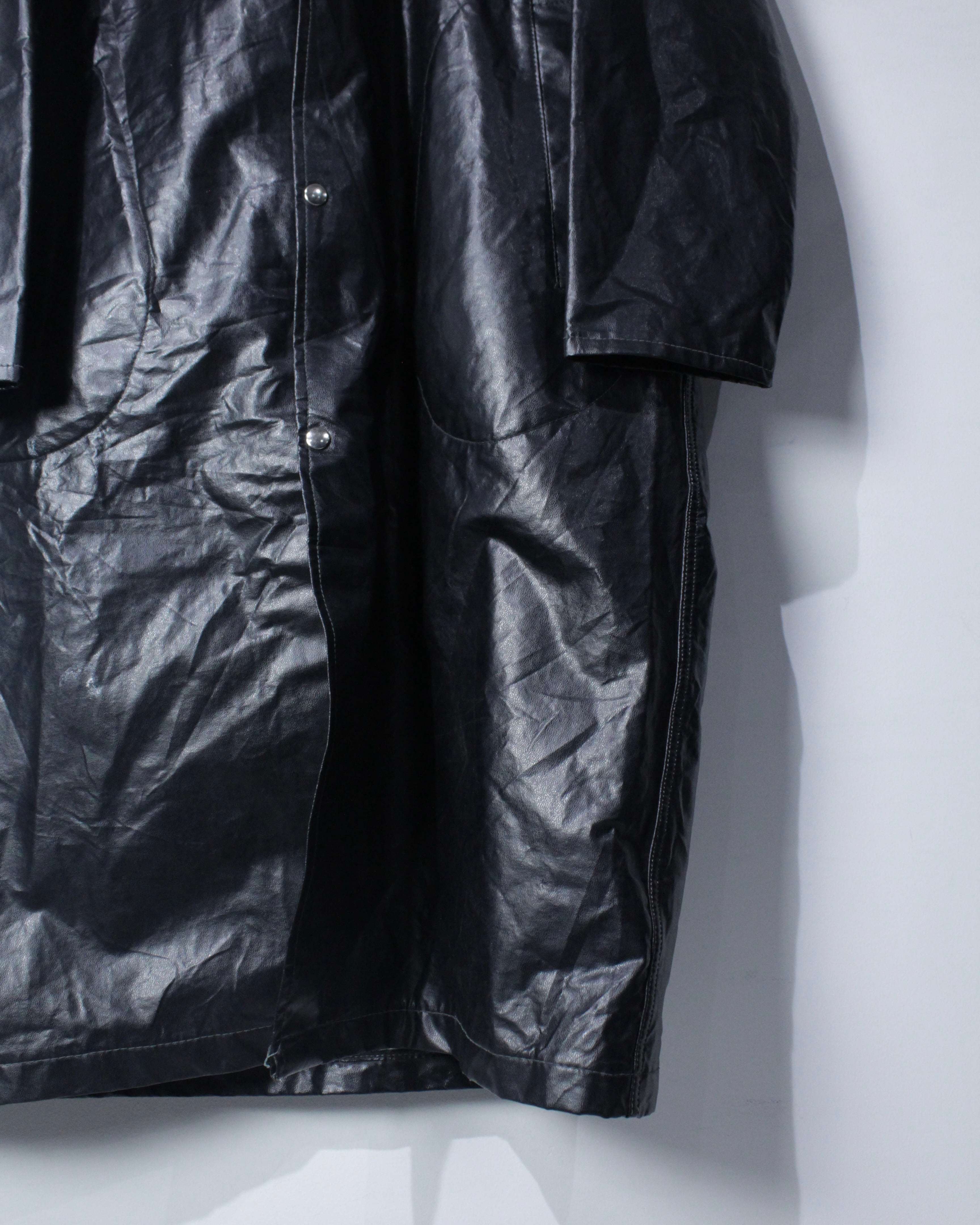 ボディには艶のあるフェイクレザー素材を採用。ヴィンテージのフェイクレザーって点が非常に良く、ムードをしっかりと感じさせます。雨具としての用途を前提としながらも、しっかりとファッションとして成り立つバランス感が◎