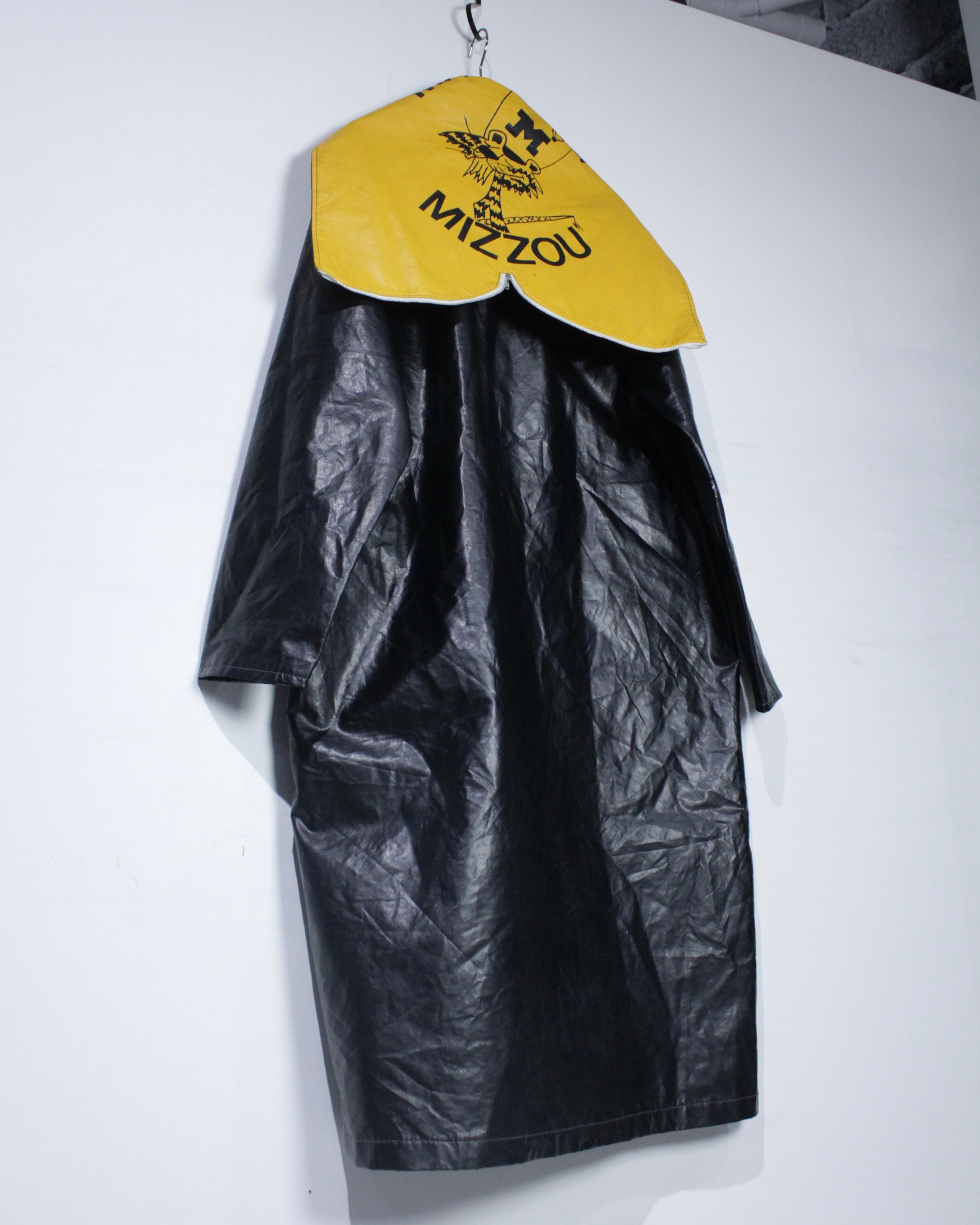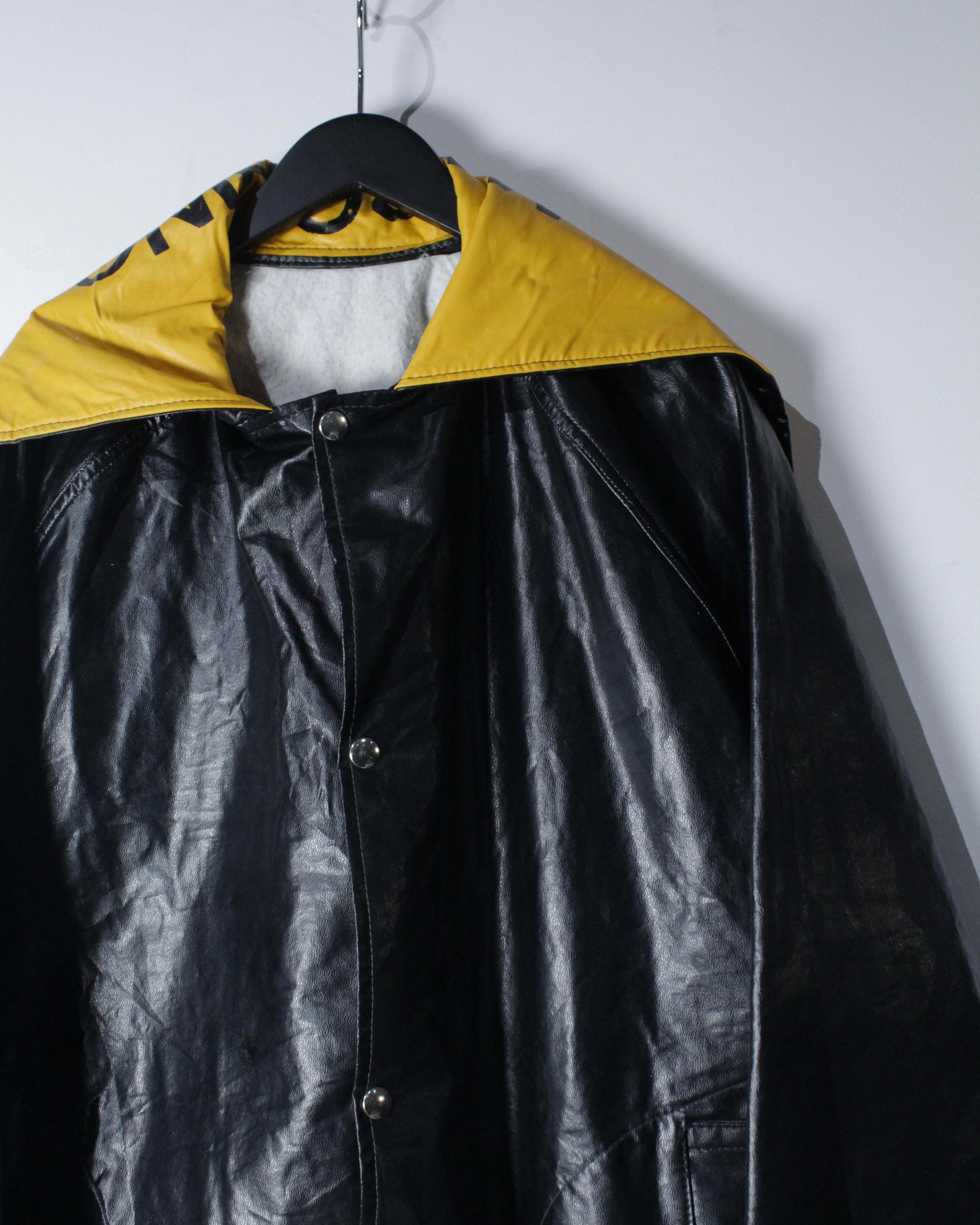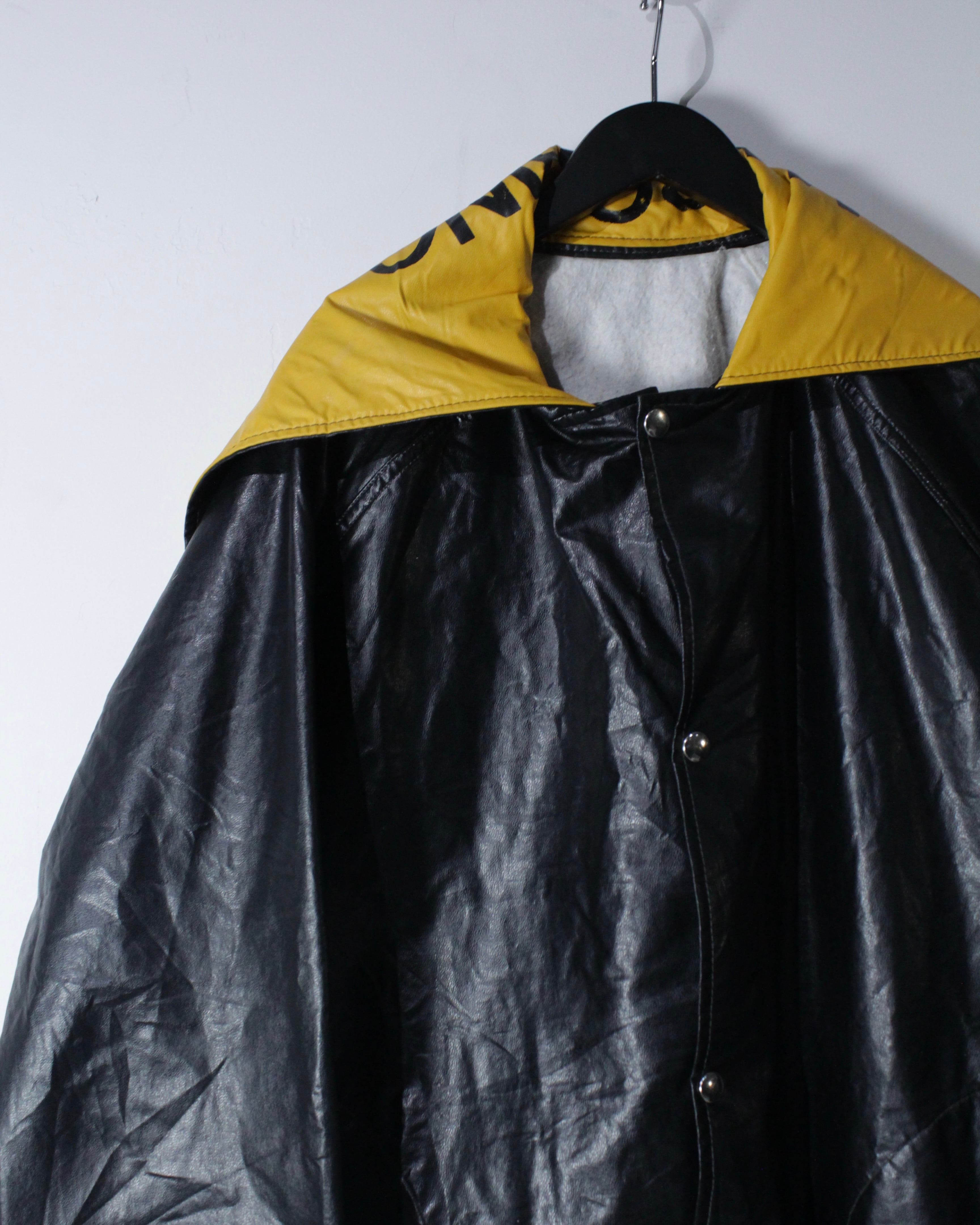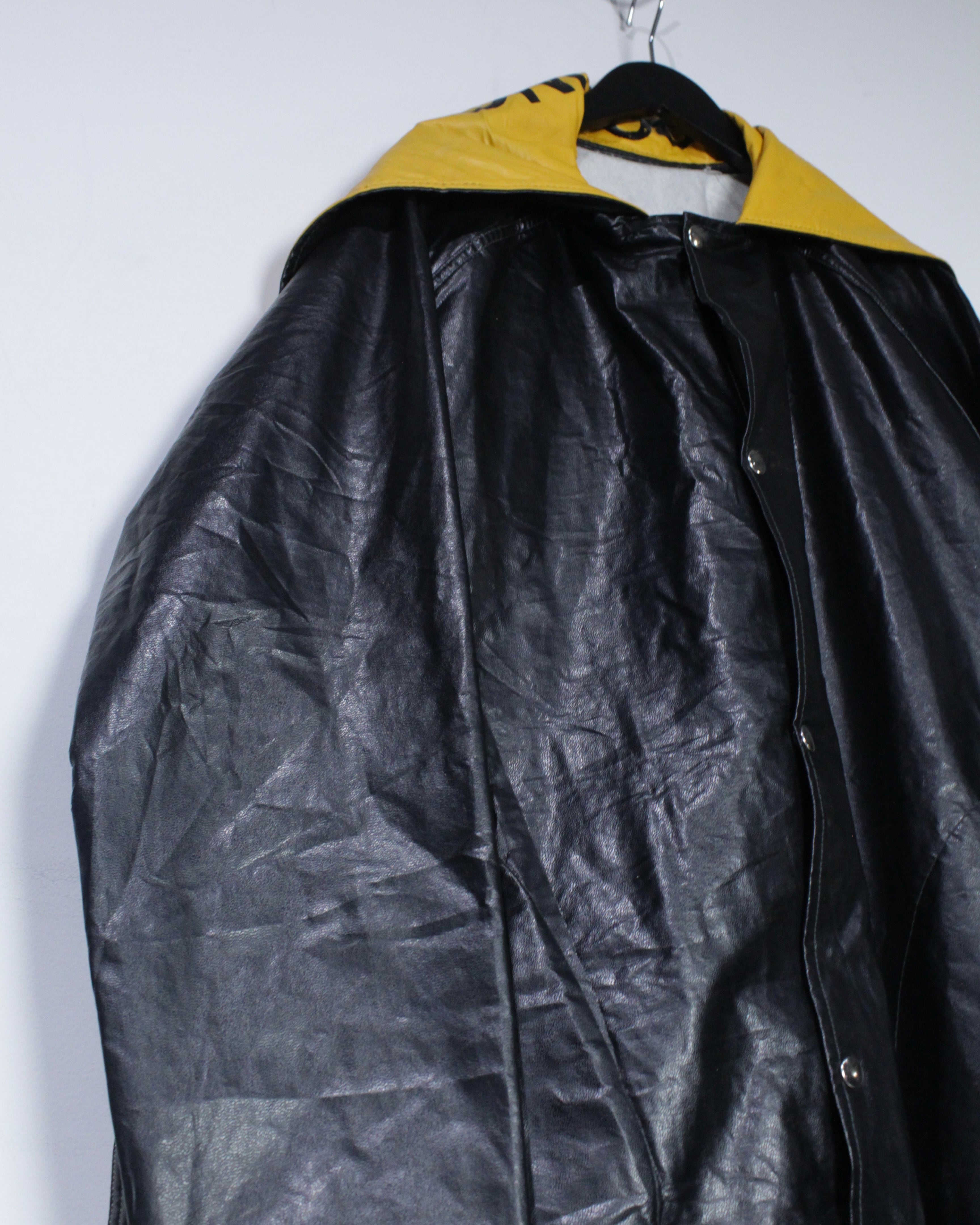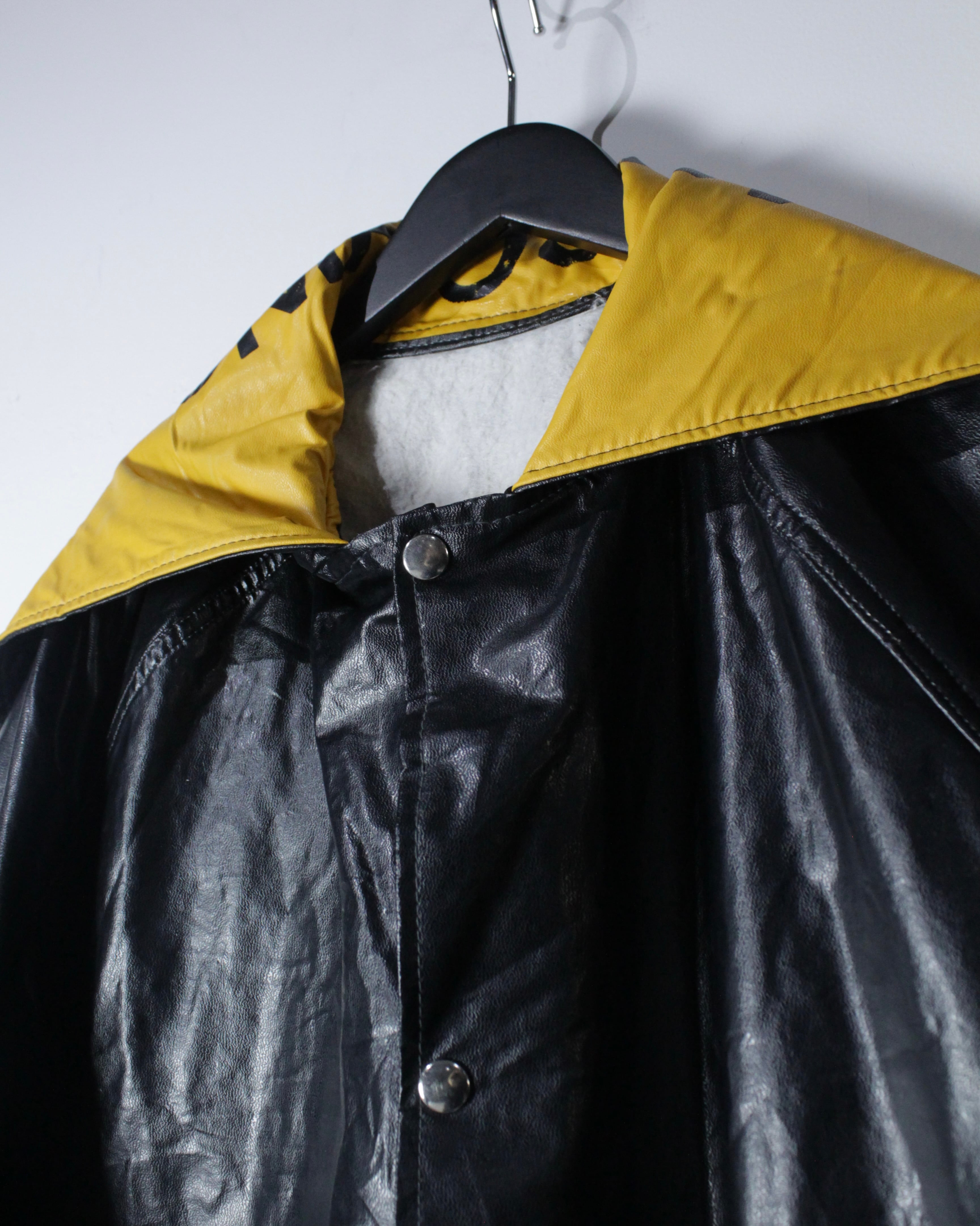 ボディには艶のあるフェイクレザー素材を採用。ヴィンテージのフェイクレザーって点が非常に良く、ムードをしっかりと感じさせます。雨具としての用途を前提としながらも、しっかりとファッションとして成り立つバランス感が◎