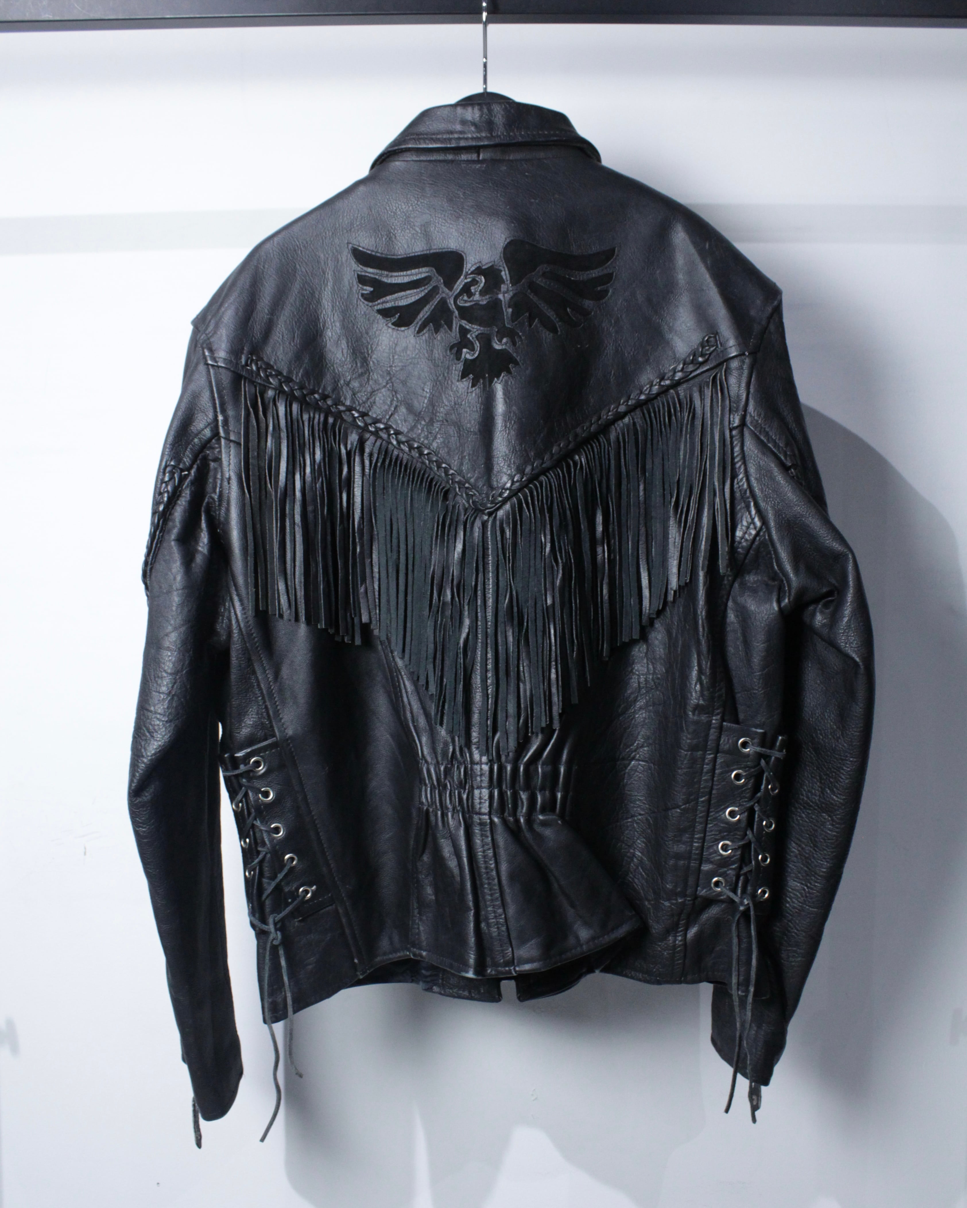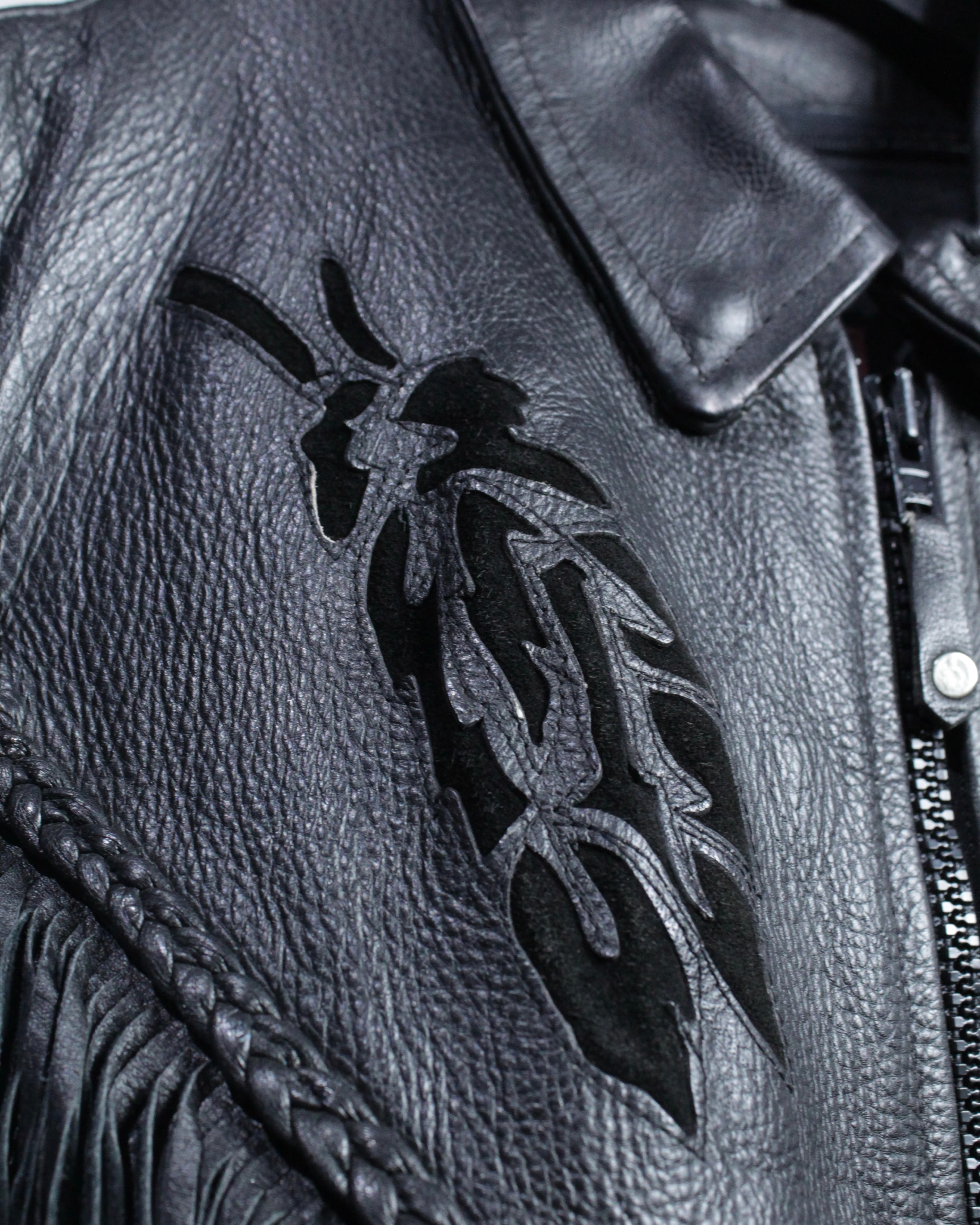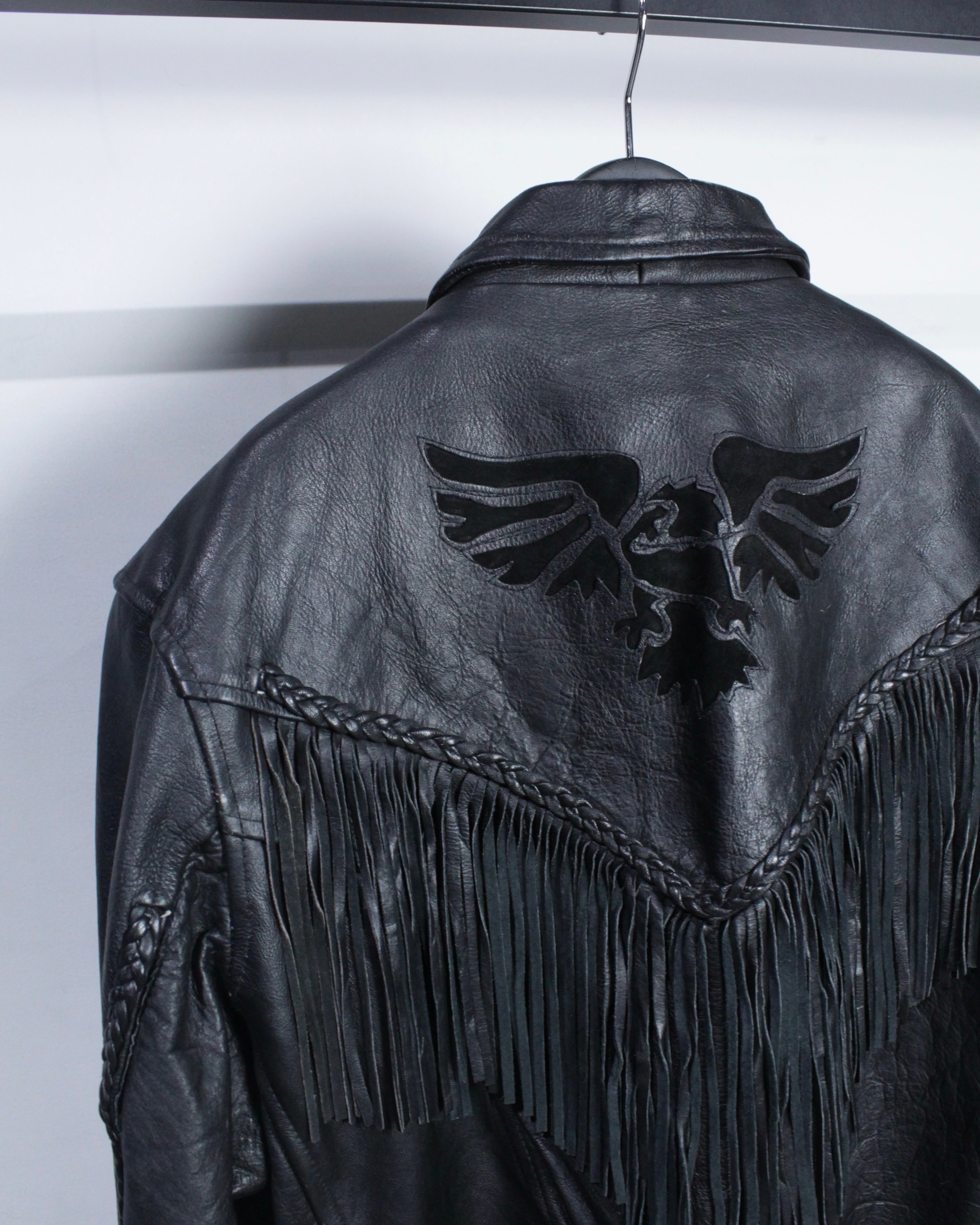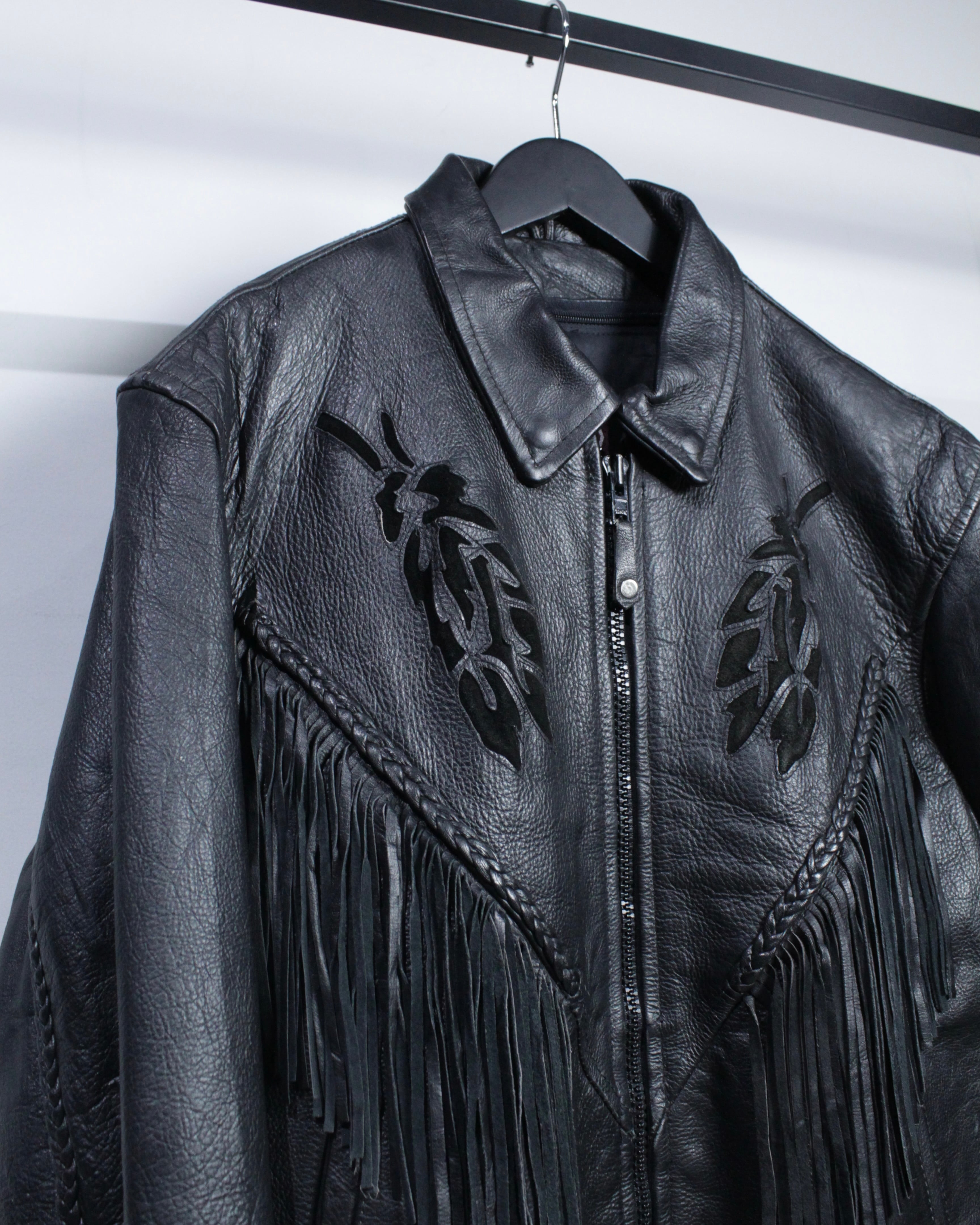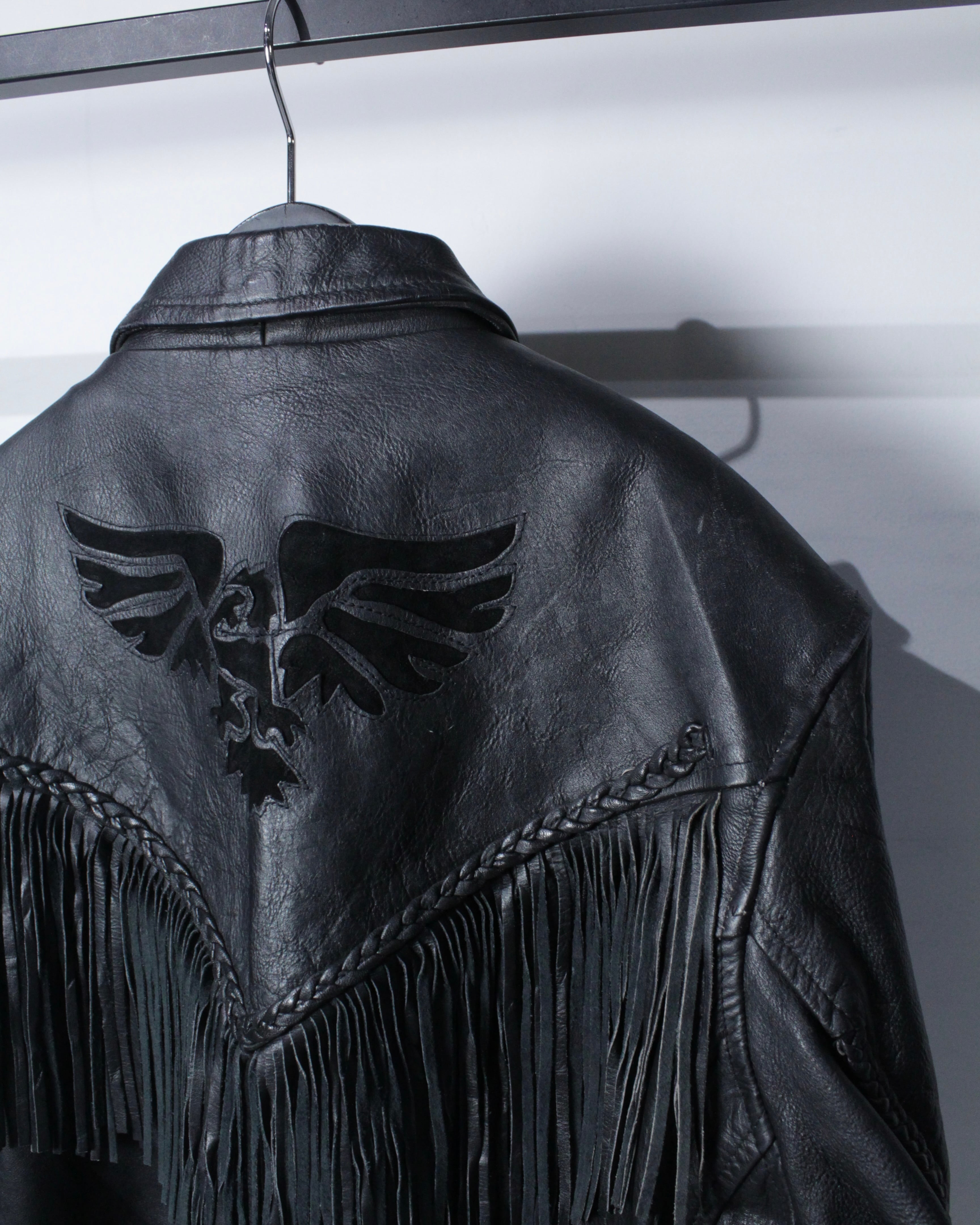 フロントからバックヨークにかけて大胆に配されたフリンジデザインが最大の特徴。編み込みレザーで縁取られたフリンジは立体感があり、動きに合わせて揺れることで存在感を一層際立たせます。