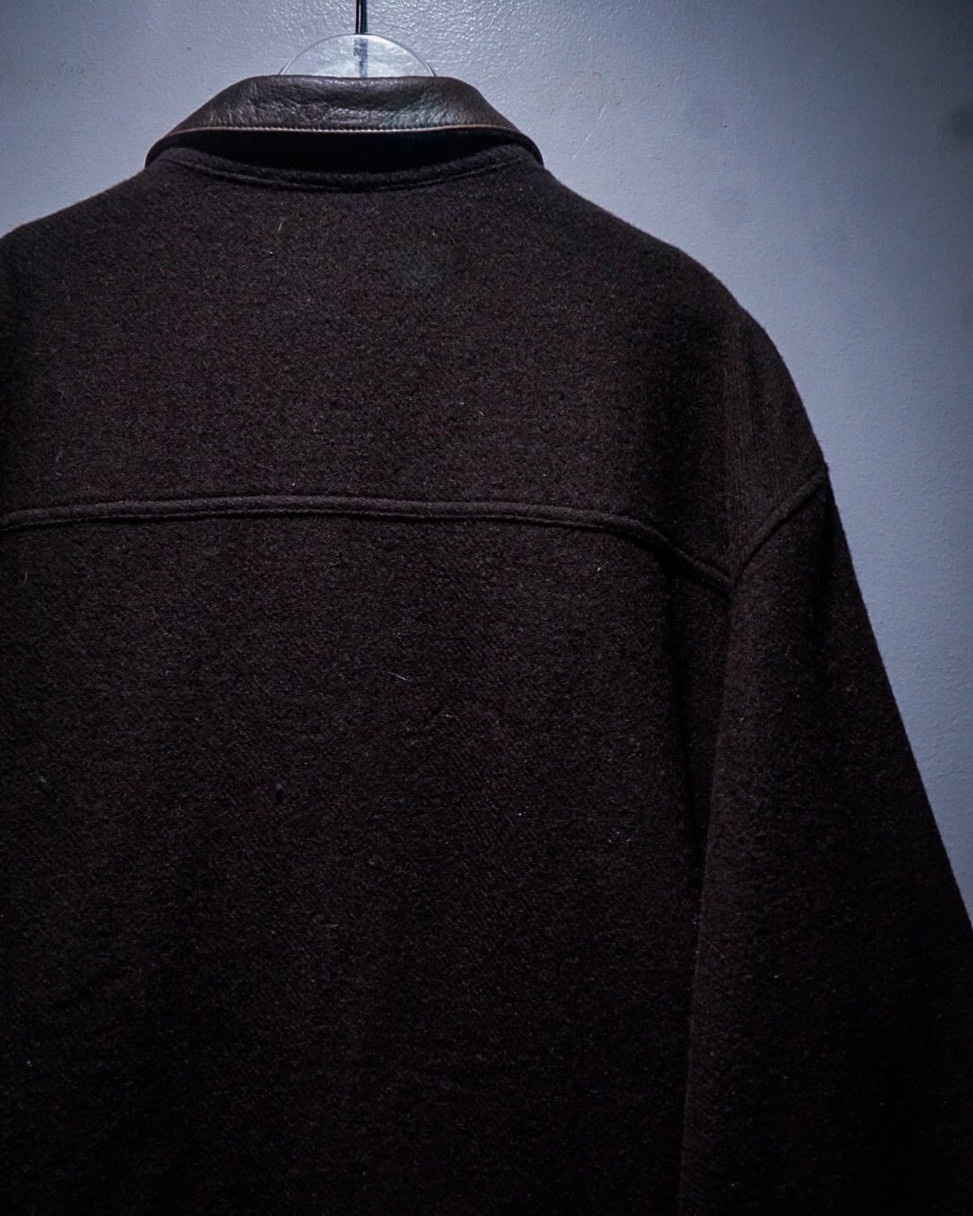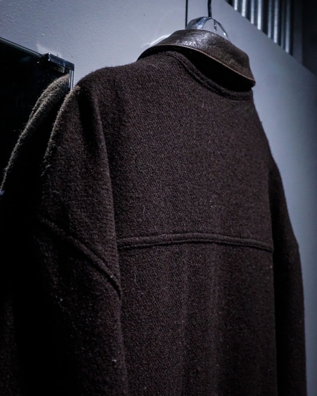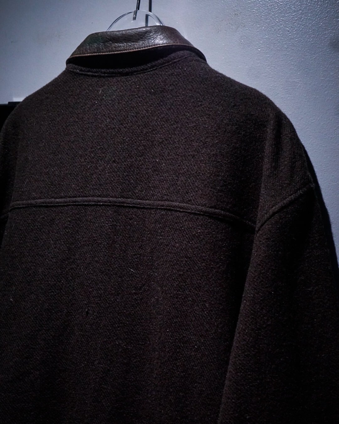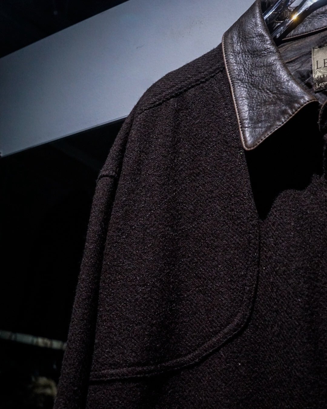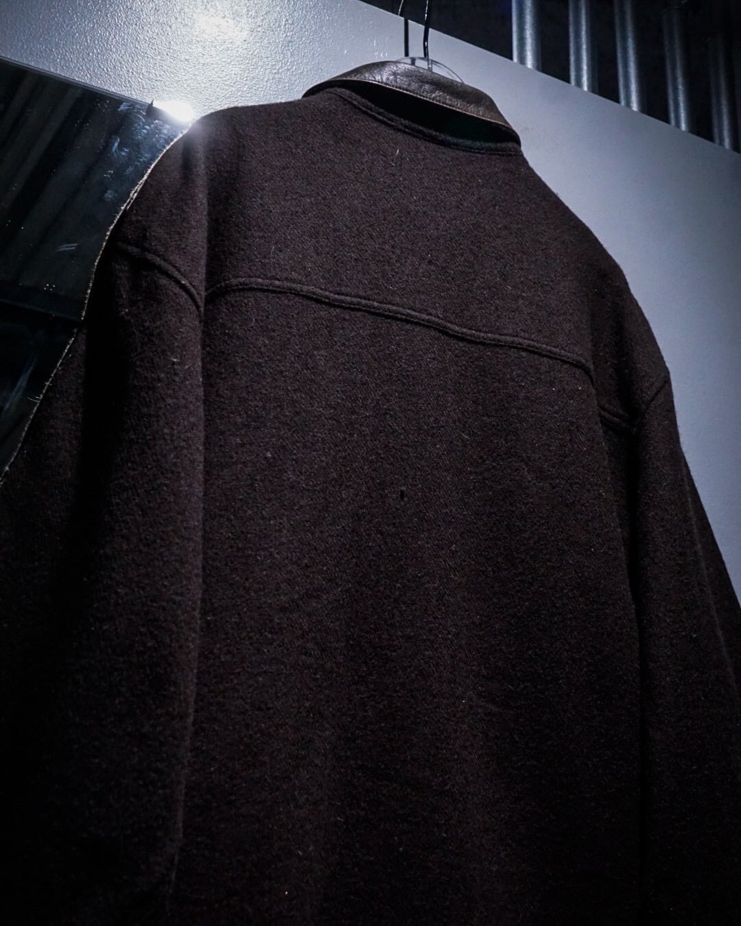 柔らかなウールを用いたボディに、襟元はブラウンレザーで切り替えた1着。起毛感のあるウールの温もりと、レザー特有の渋みが重なり、落ち着いた中にも深みのある表情を生み出しています。