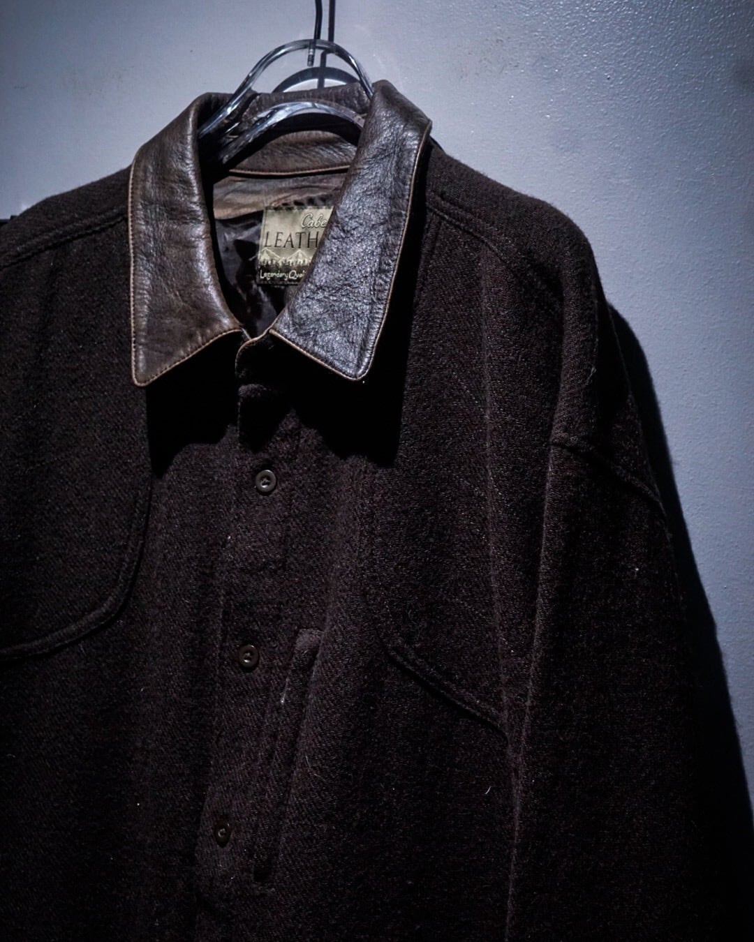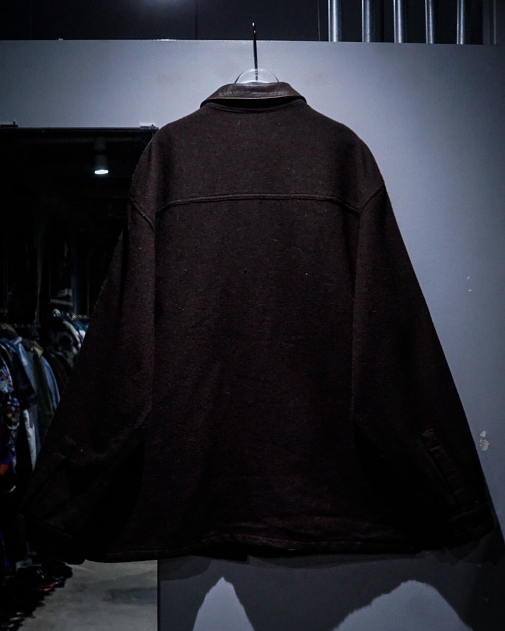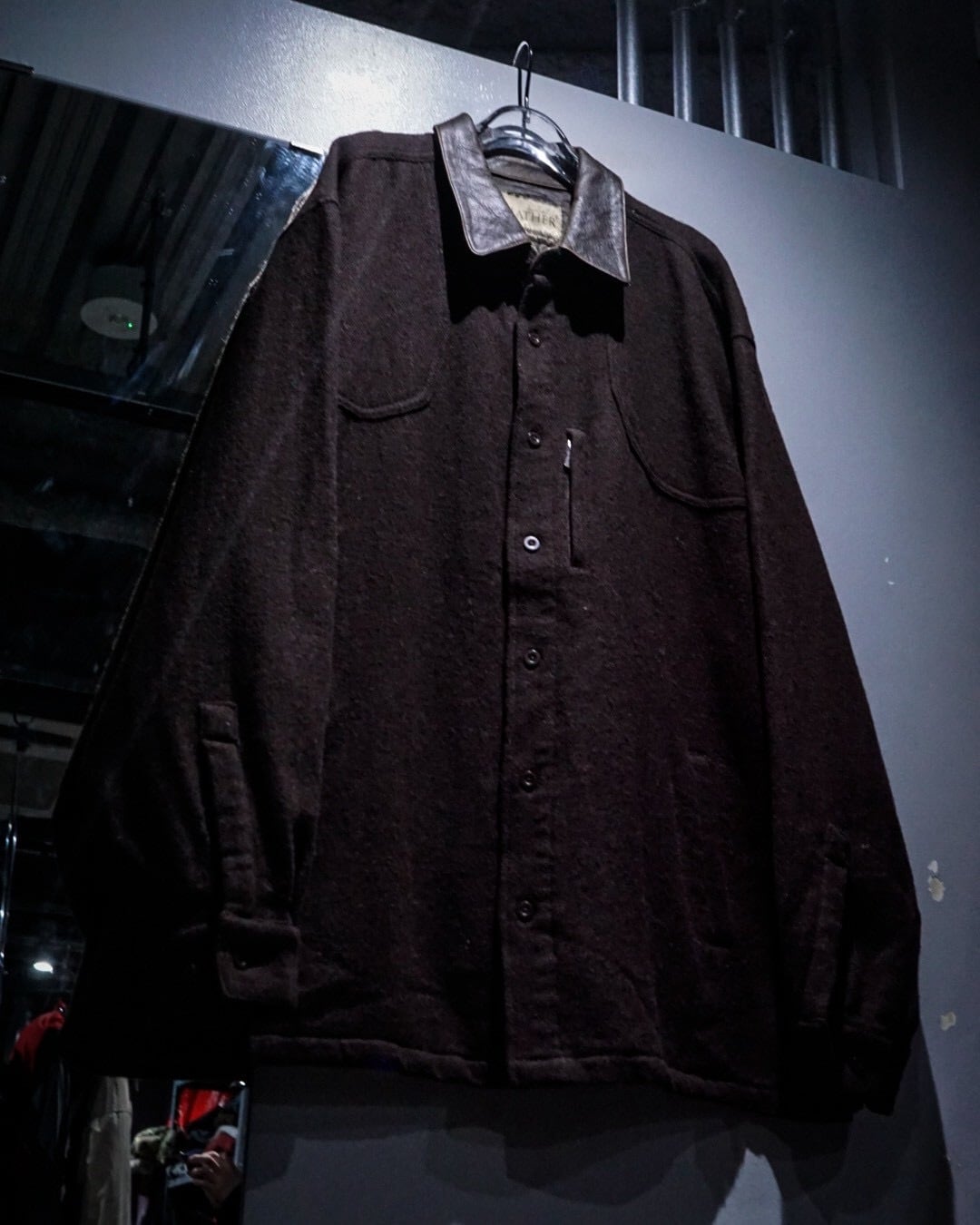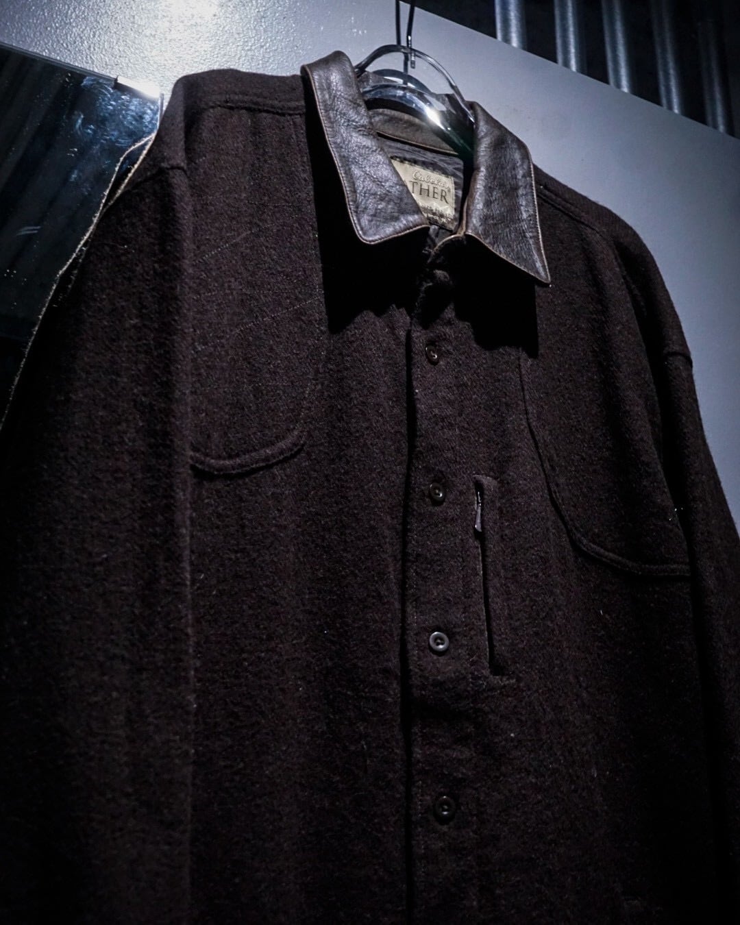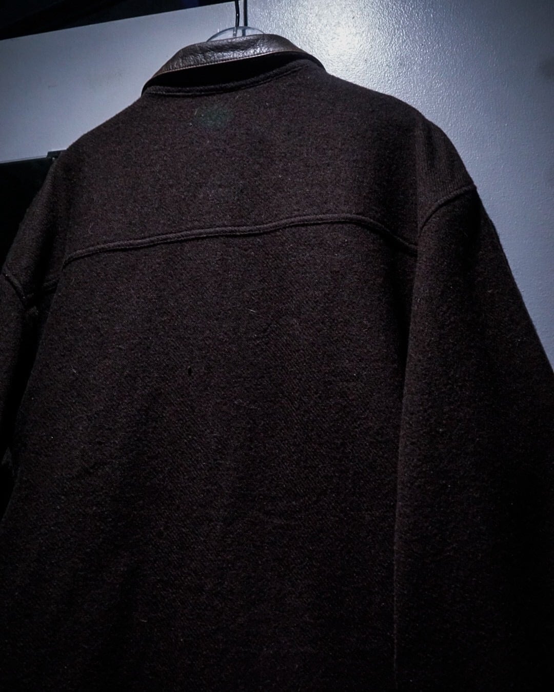 柔らかなウールを用いたボディに、襟元はブラウンレザーで切り替えた1着。起毛感のあるウールの温もりと、レザー特有の渋みが重なり、落ち着いた中にも深みのある表情を生み出しています。