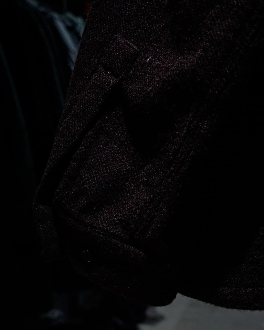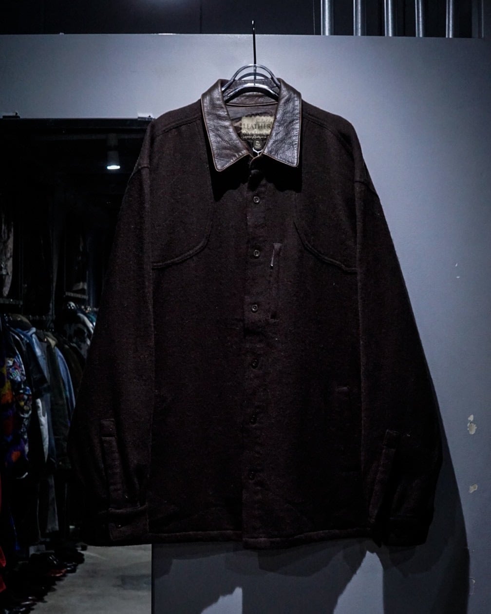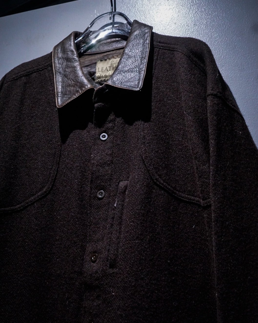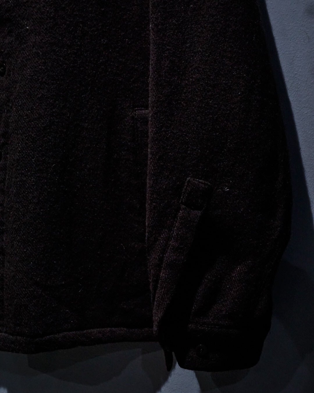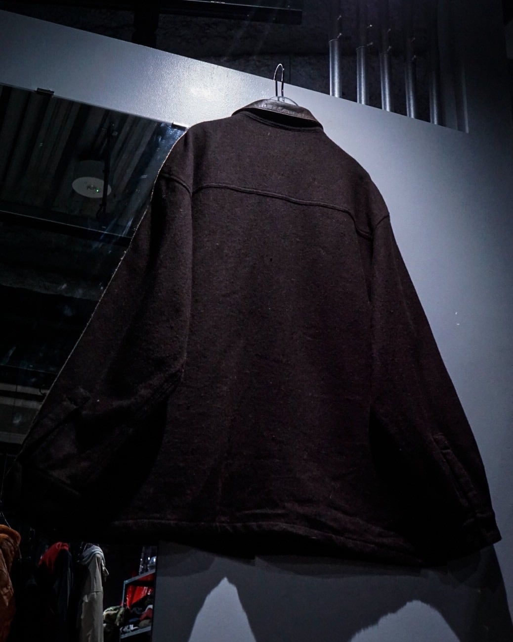 柔らかなウールを用いたボディに、襟元はブラウンレザーで切り替えた1着。起毛感のあるウールの温もりと、レザー特有の渋みが重なり、落ち着いた中にも深みのある表情を生み出しています。