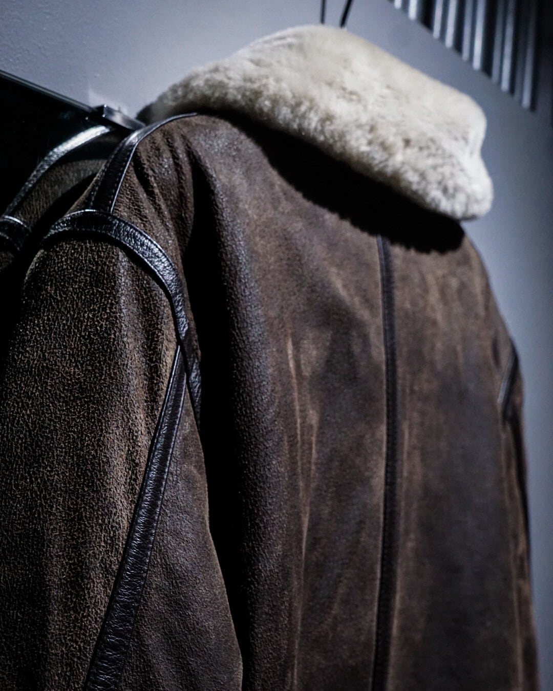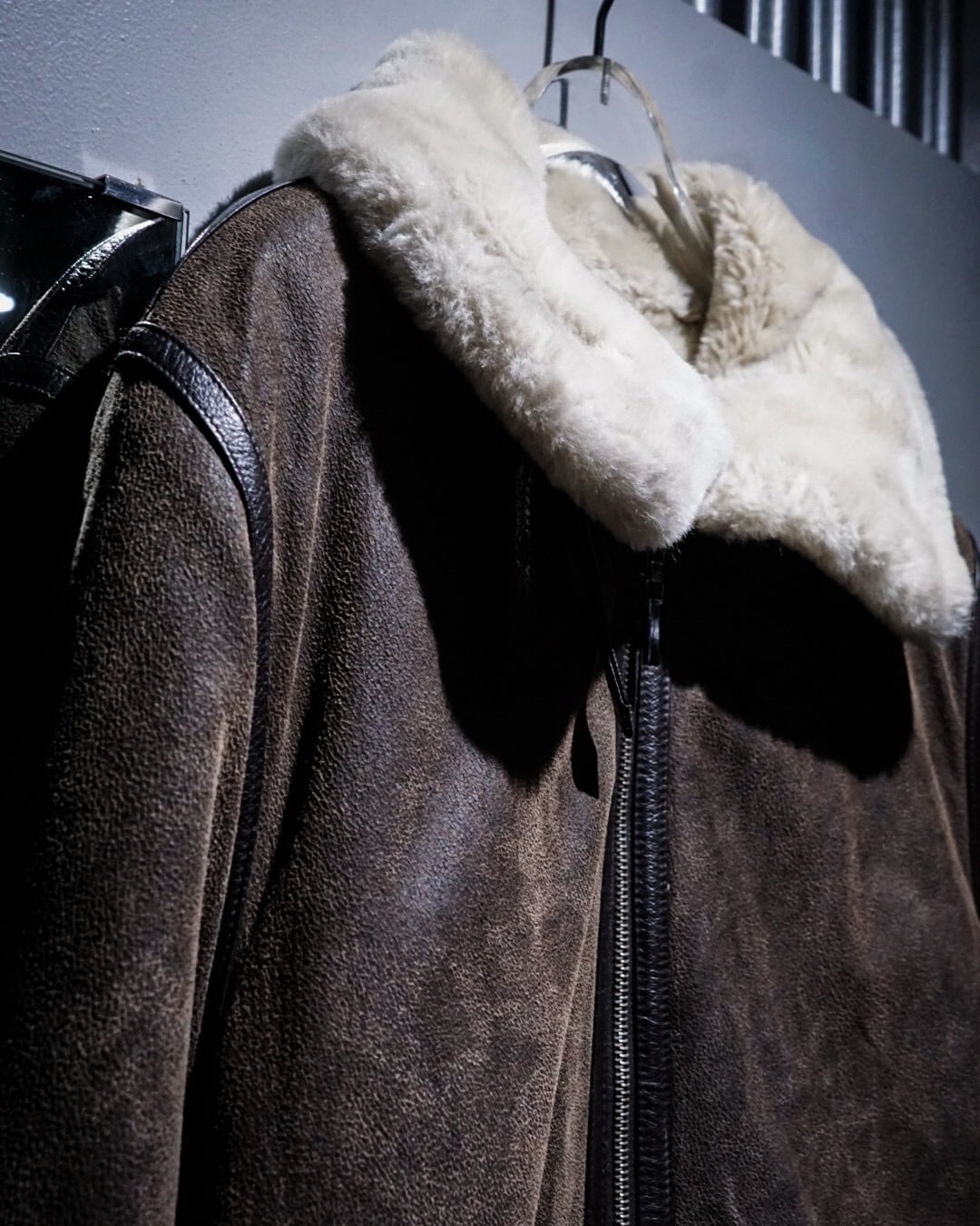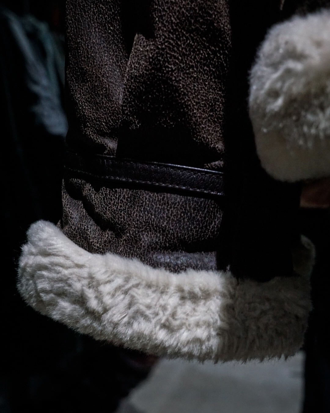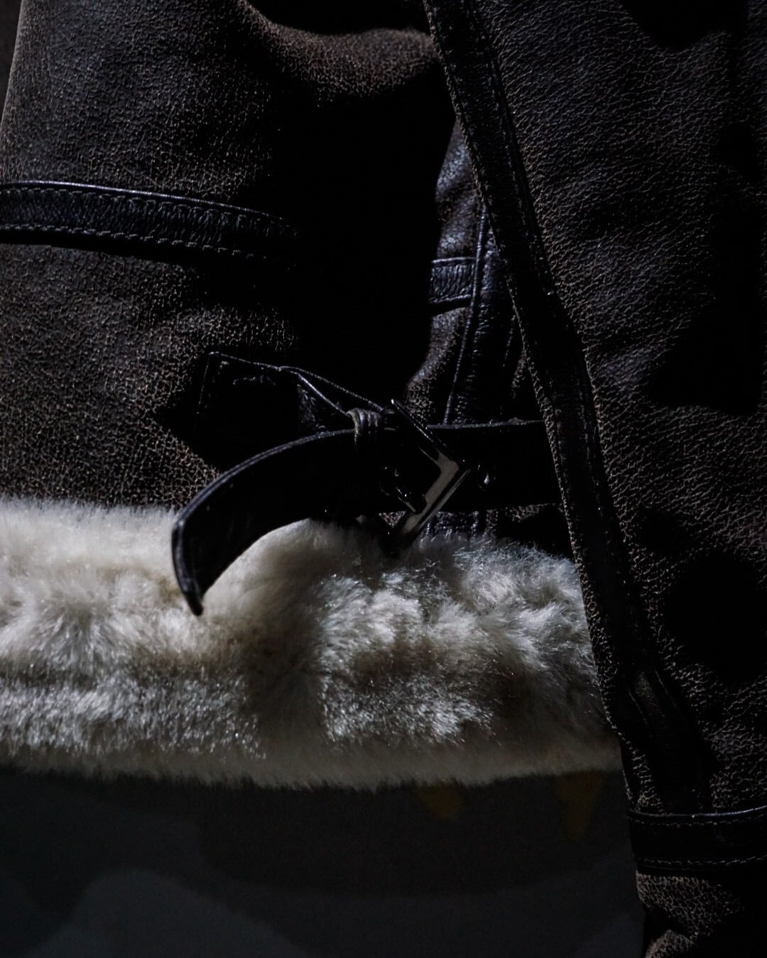 ボディにはしっとりとした質感のリアルレザーを使用。ブラウンレザーに、襟、裾、袖口へ配されたアイボリートーンのボアが、無骨さの中に温もりのあるコントラストを生み出しています。