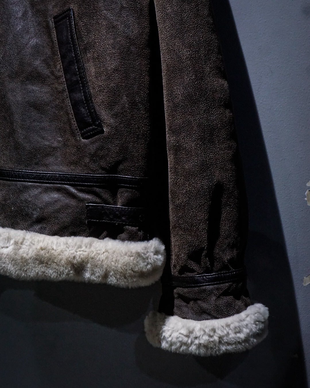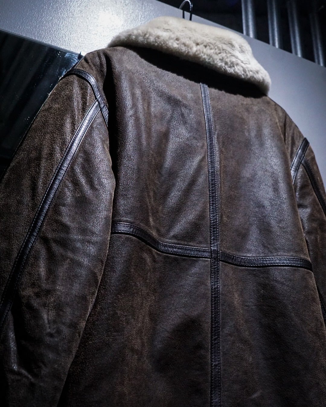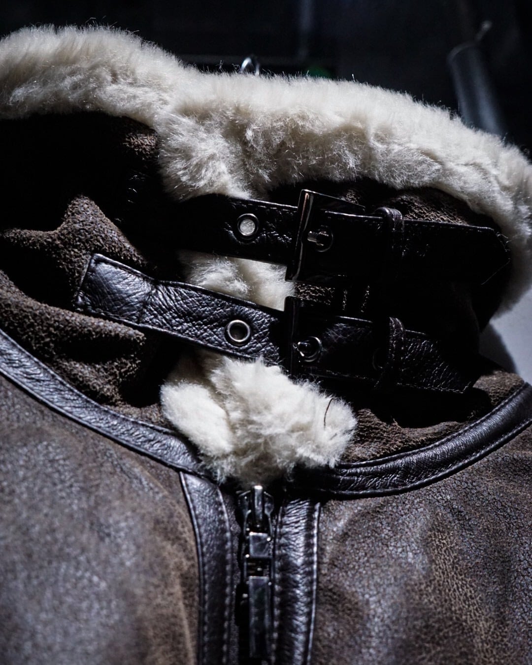 ボディにはしっとりとした質感のリアルレザーを使用。ブラウンレザーに、襟、裾、袖口へ配されたアイボリートーンのボアが、無骨さの中に温もりのあるコントラストを生み出しています。
