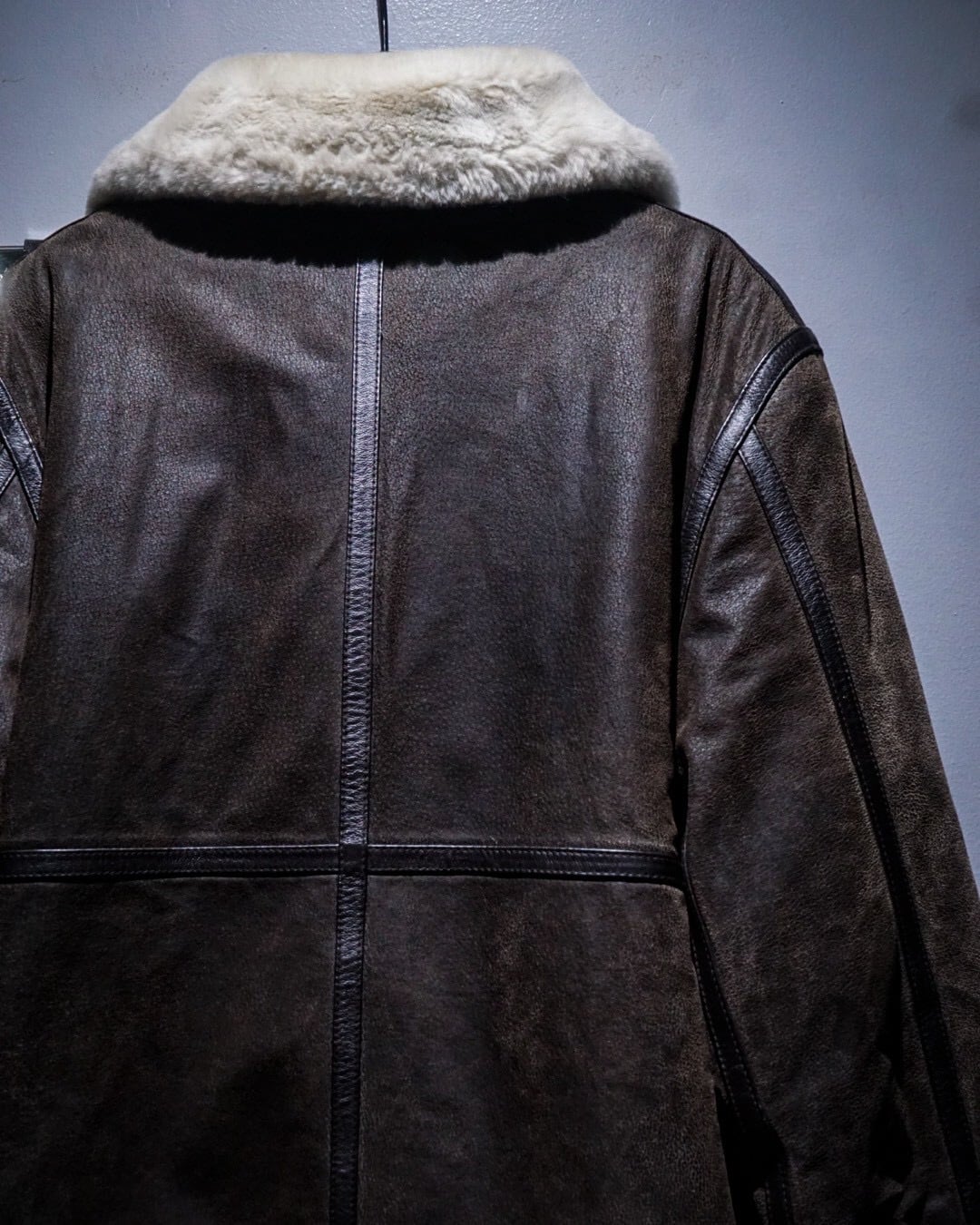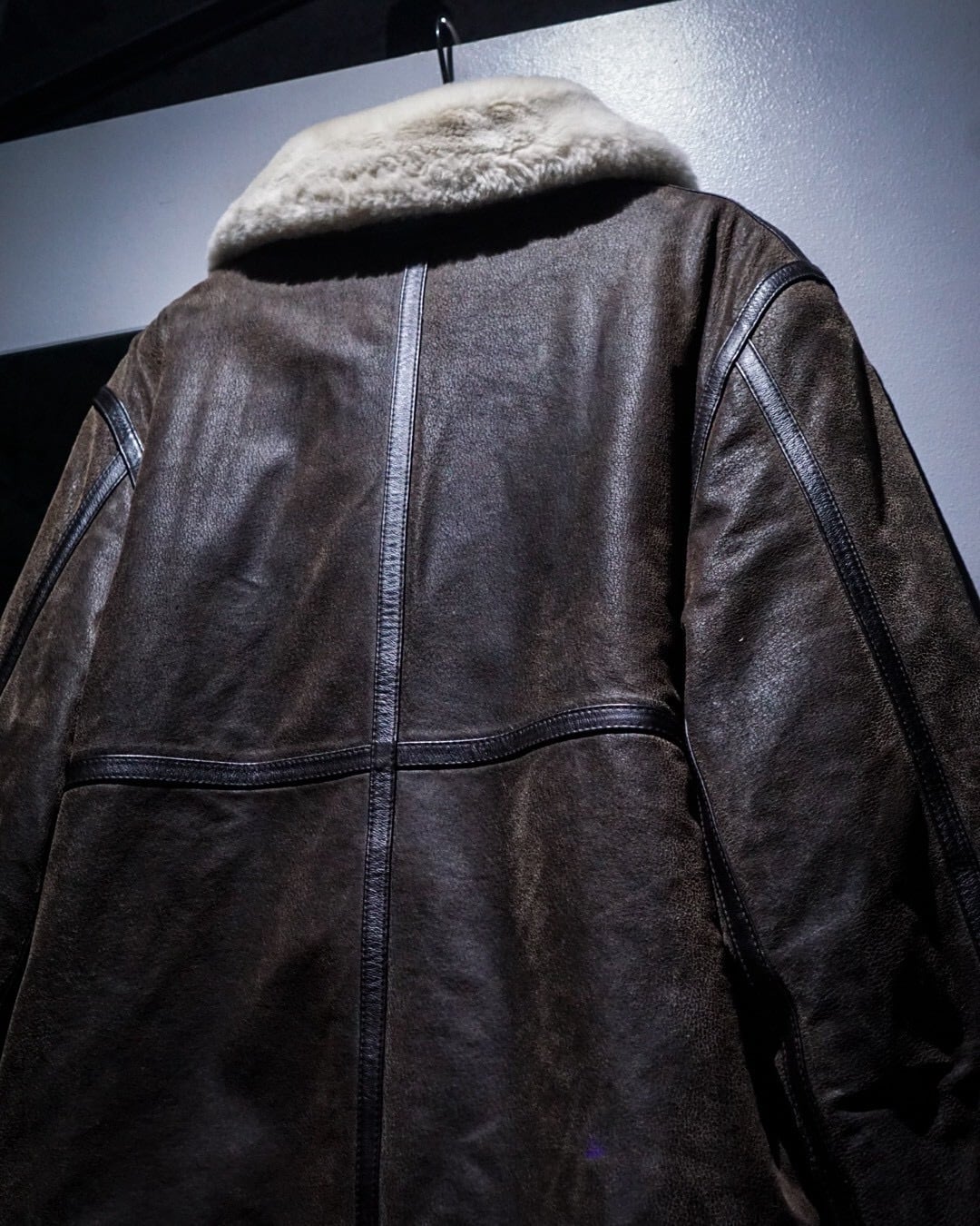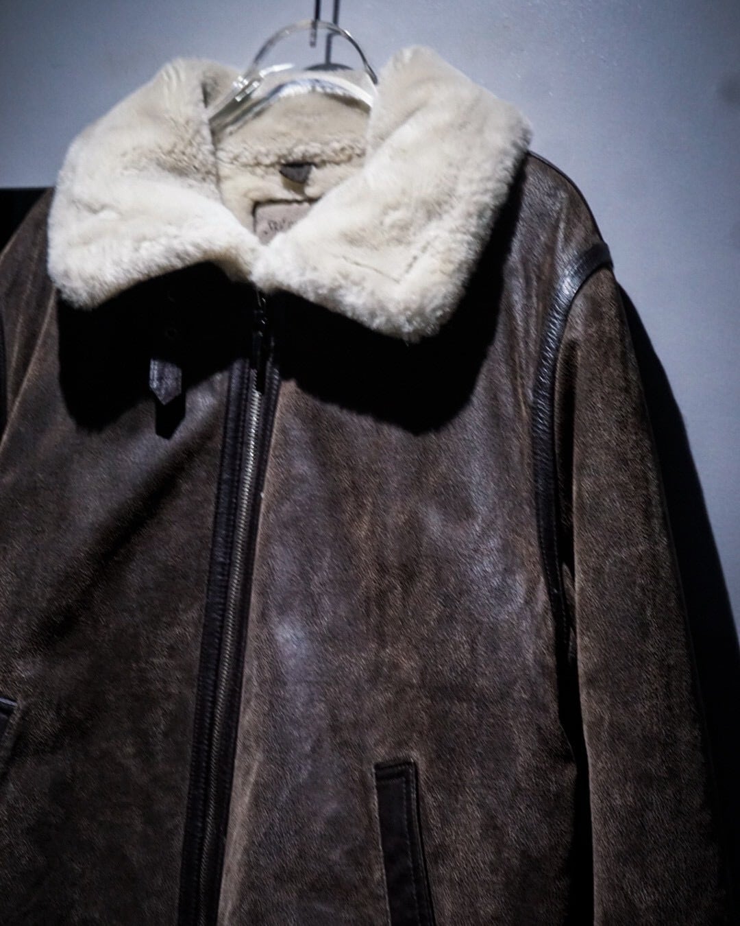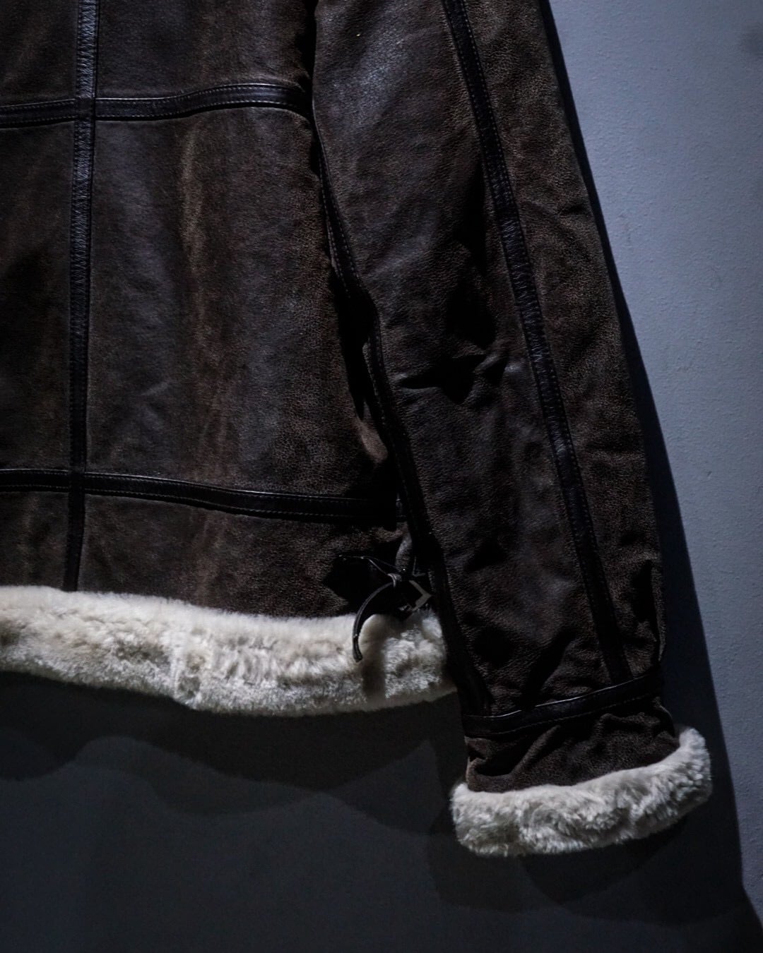 ボディにはしっとりとした質感のリアルレザーを使用。ブラウンレザーに、襟、裾、袖口へ配されたアイボリートーンのボアが、無骨さの中に温もりのあるコントラストを生み出しています。