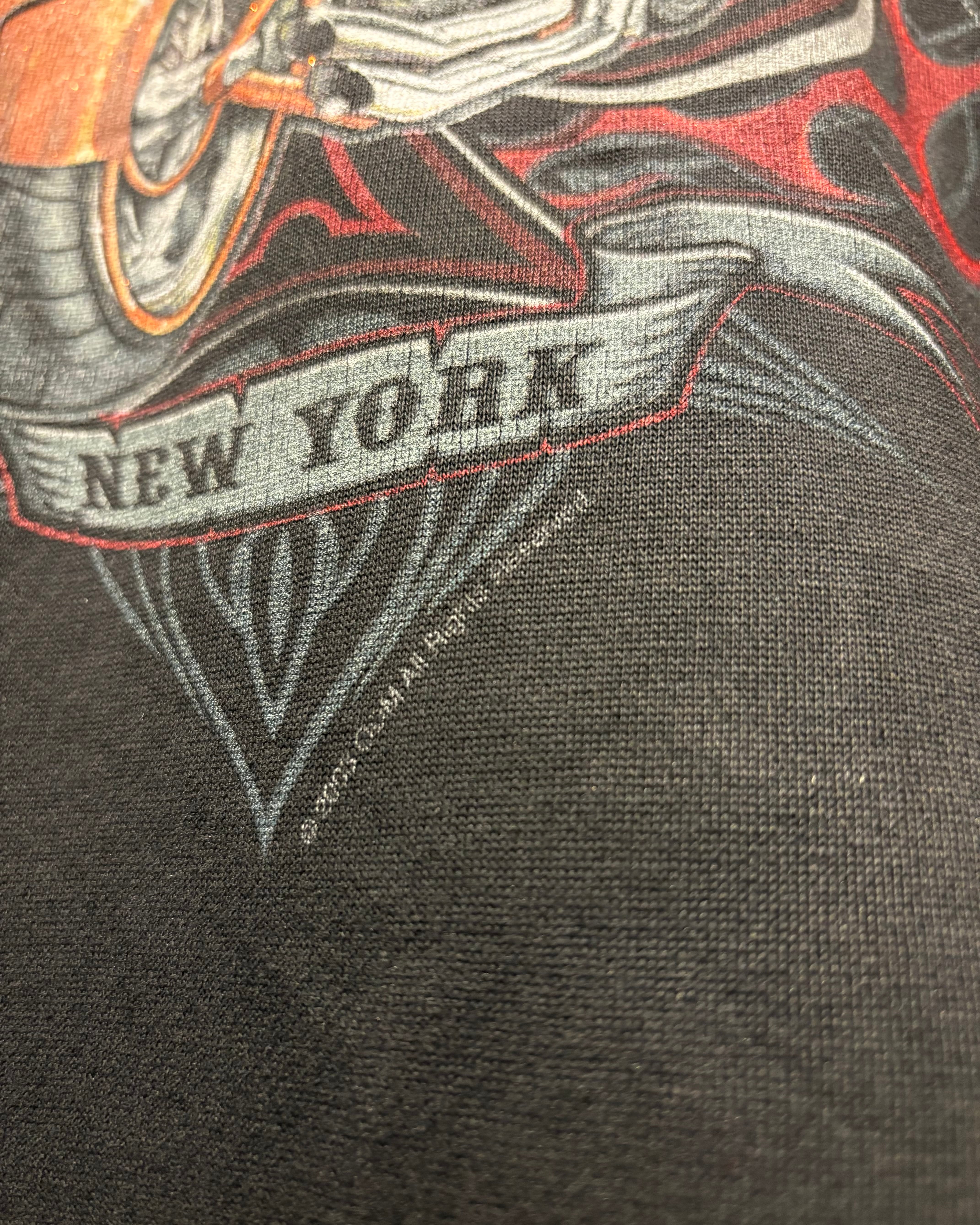 フロント、スリーブにはフレイムモチーフとスペイド、ロゴを組み合わせたグラフィック。背面にはバイクをラメ入りのプリントで大胆に描いた迫力あるデザインが入り、OCCらしい強さがしっかり感じられます。
