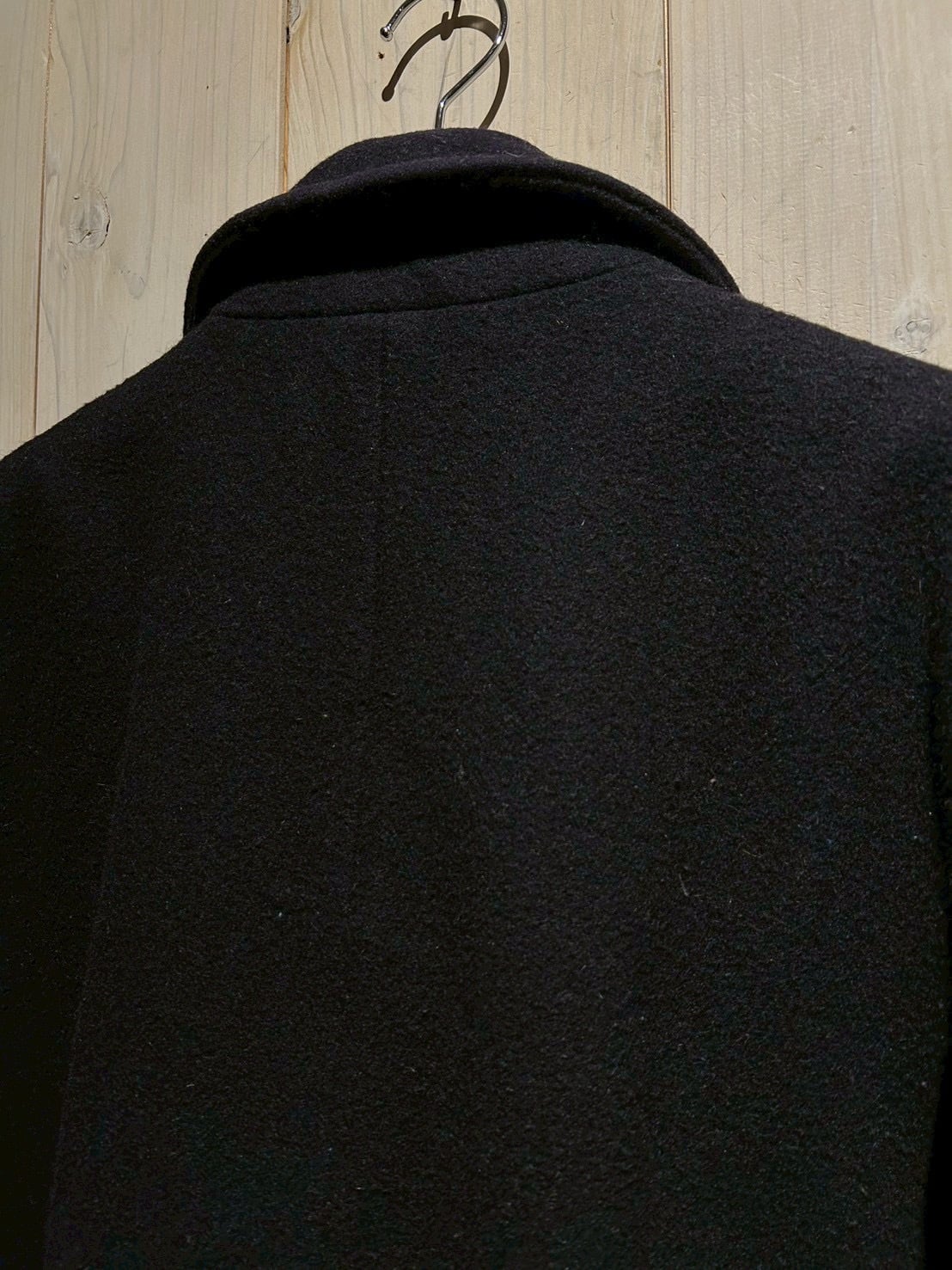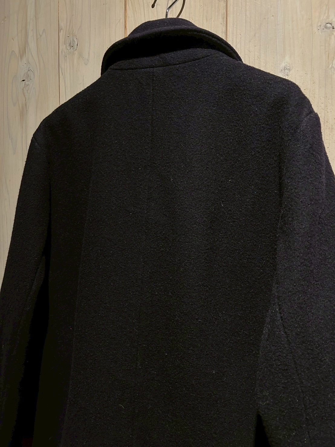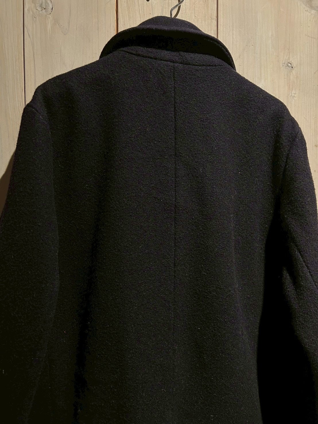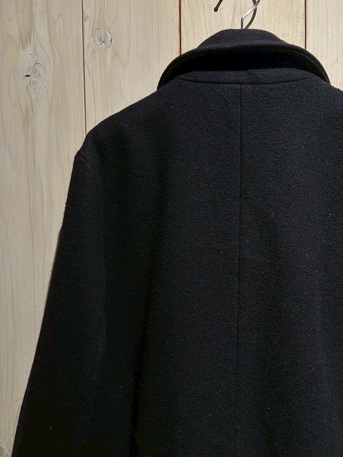 肉感のあるウールを用いた1着で、しっかりとした生地感と落ち着いたネイビーカラーが印象的。ピーコートならではのダブルブレスト仕様が、シンプルながらも力強い存在感を演出しています。