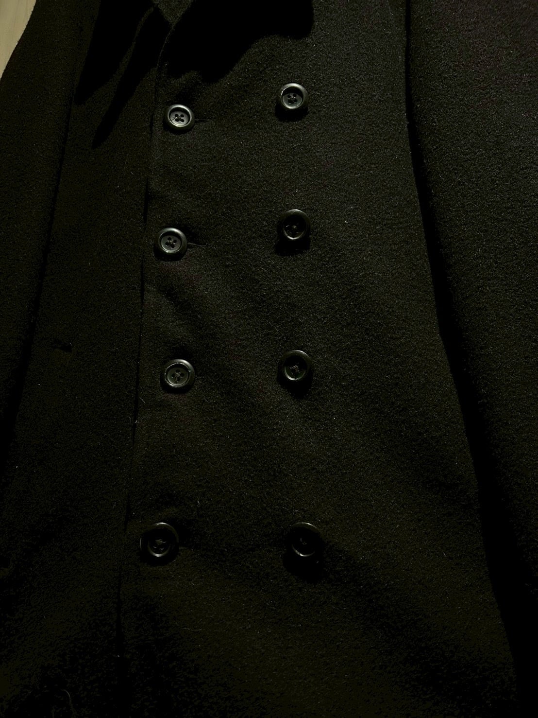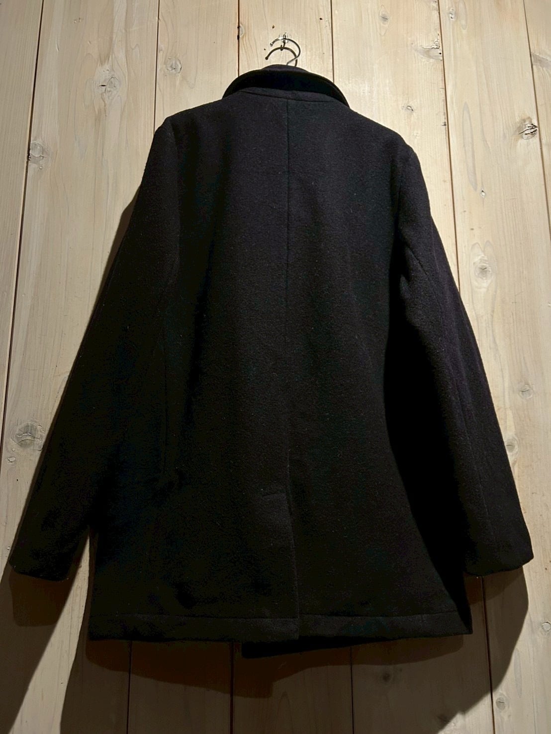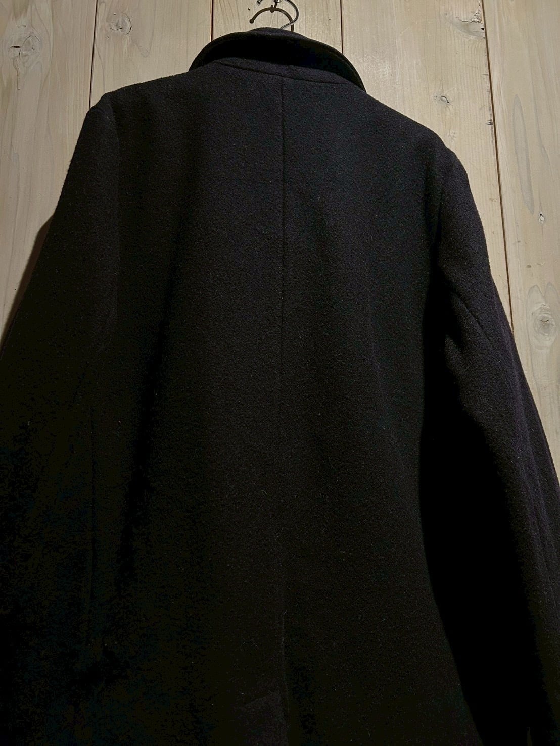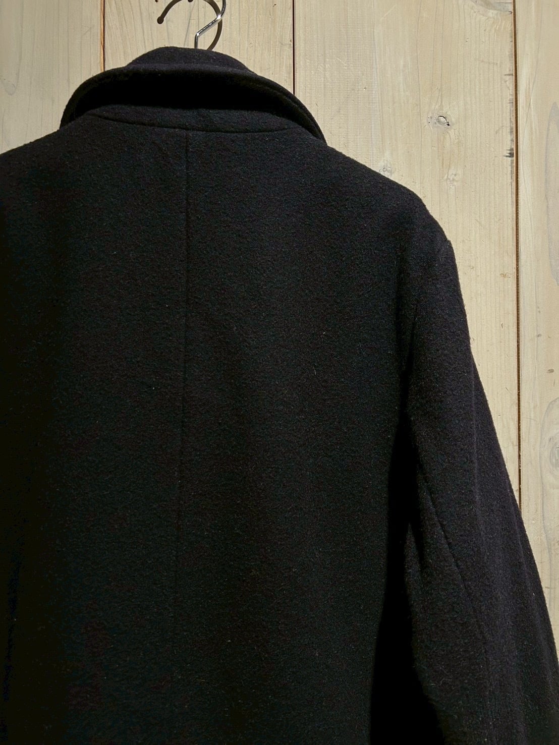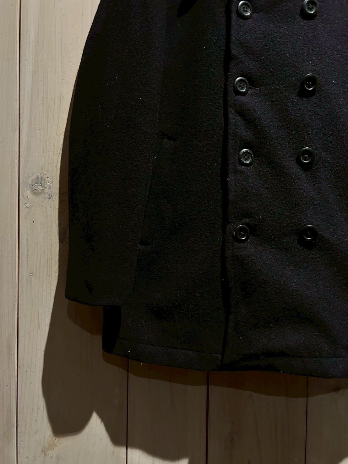 肉感のあるウールを用いた1着で、しっかりとした生地感と落ち着いたネイビーカラーが印象的。ピーコートならではのダブルブレスト仕様が、シンプルながらも力強い存在感を演出しています。