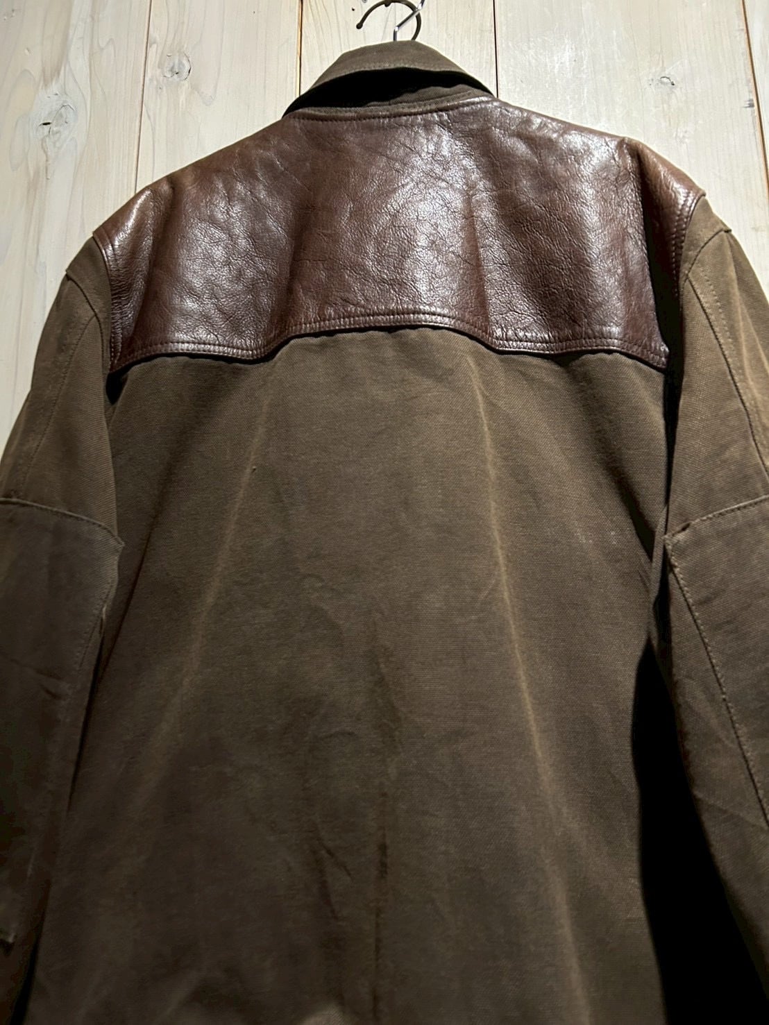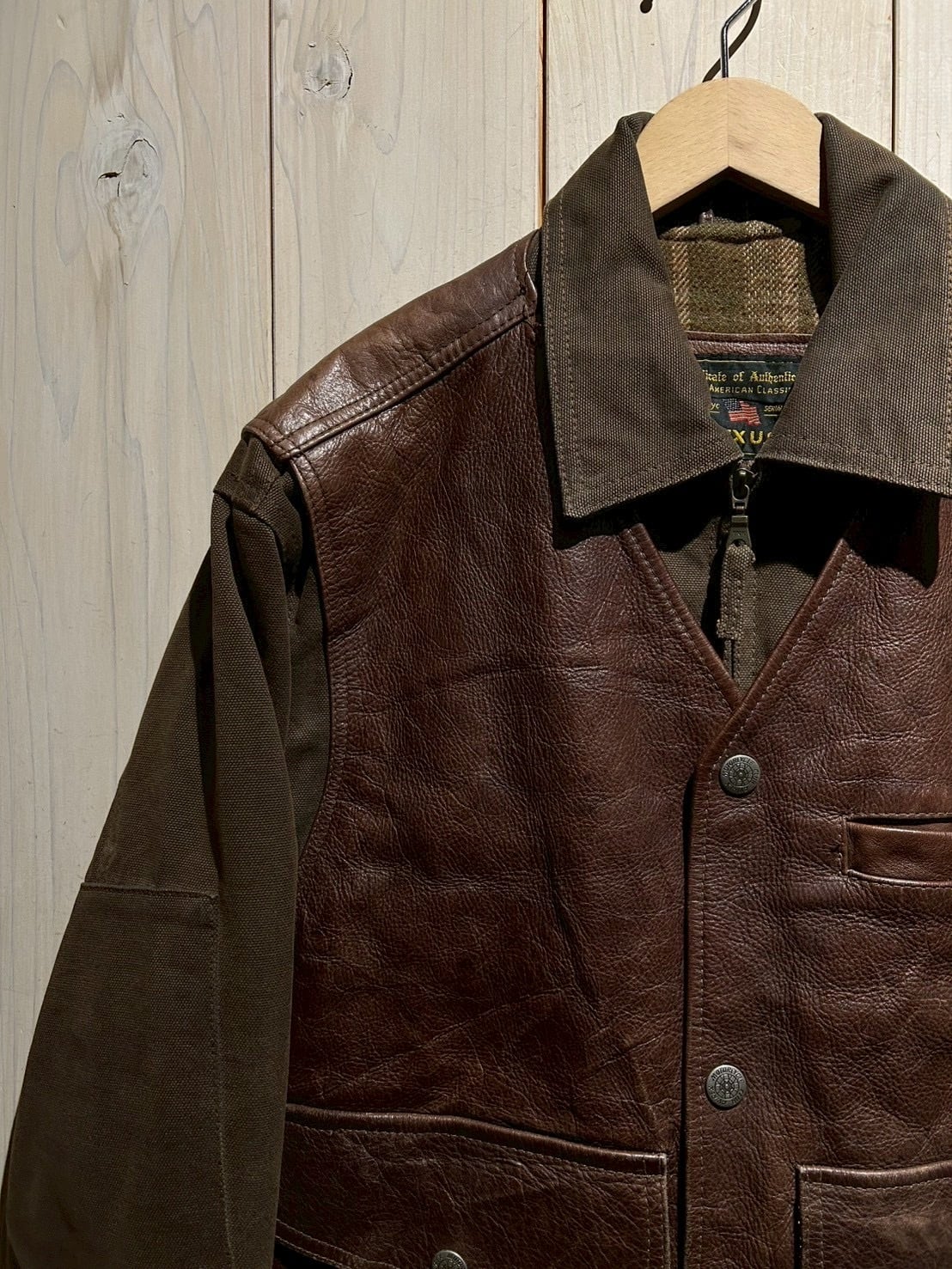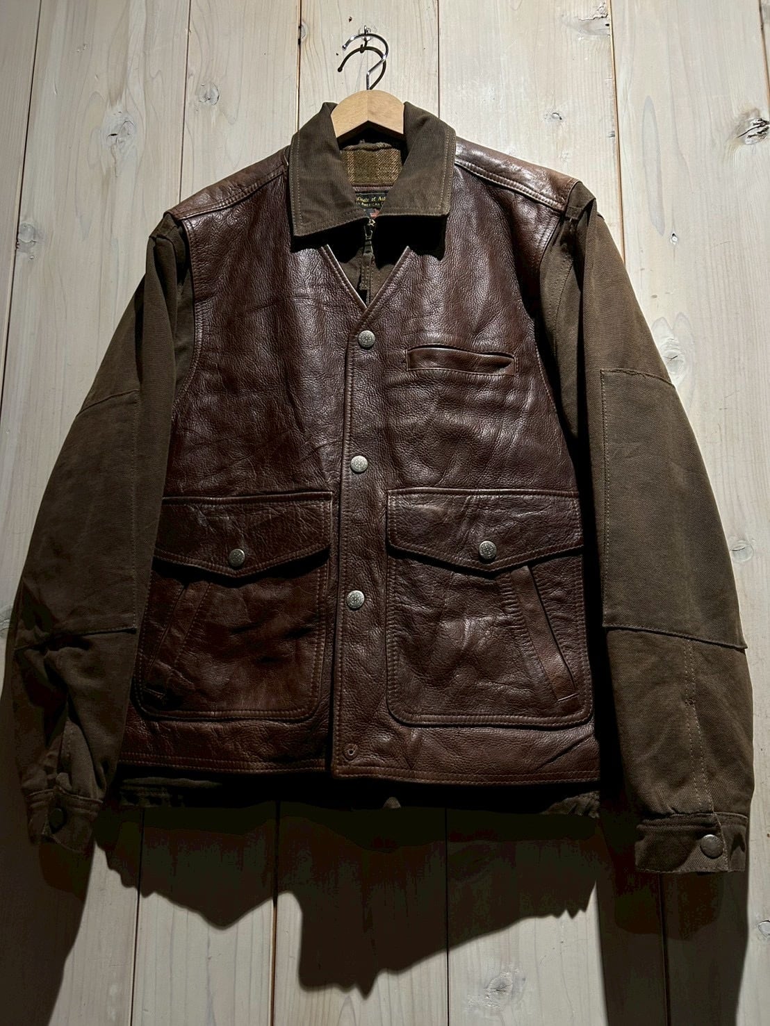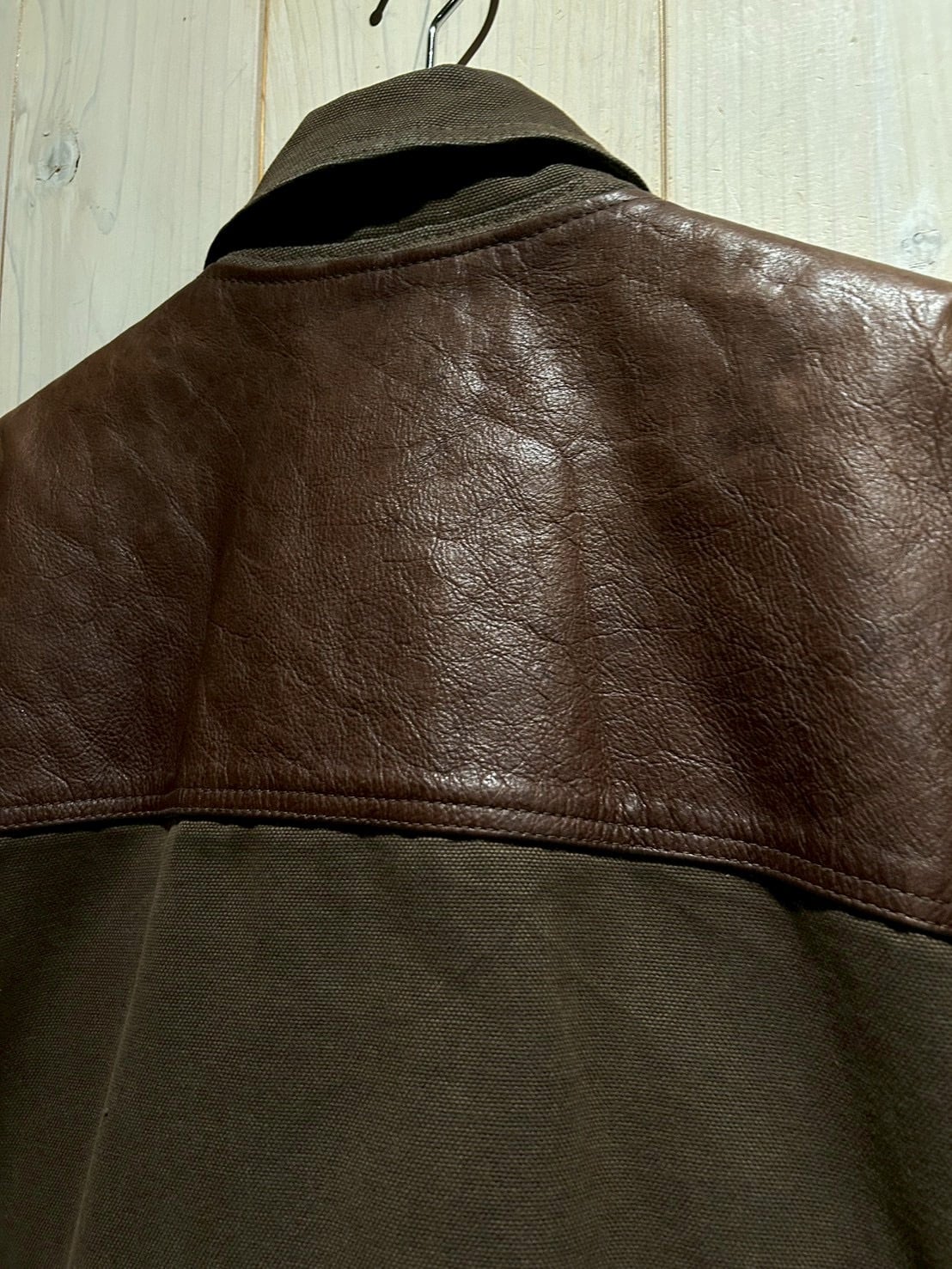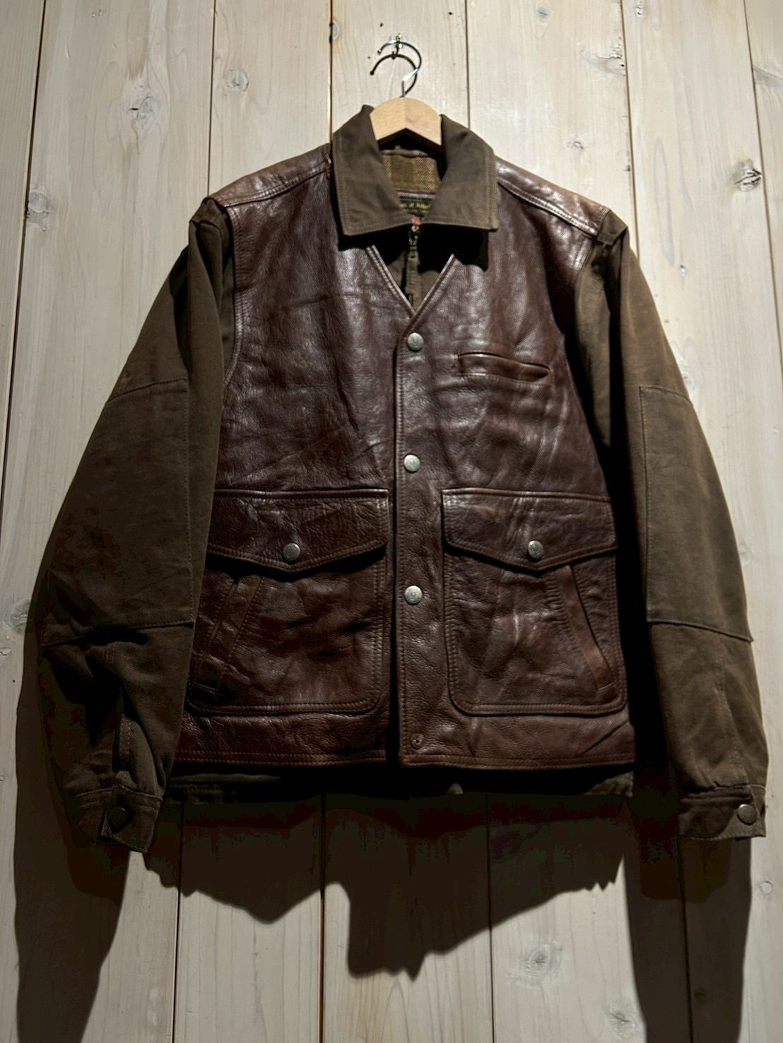 使用されているレザーはしっかりとした厚みがありながらも、経年による柔らかさとシボ感が現れた上質な表情。裏地にはウール混素材を用い、見た目以上の保温性と着心地の良さを確保しています。