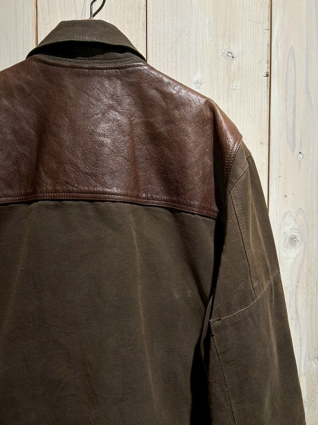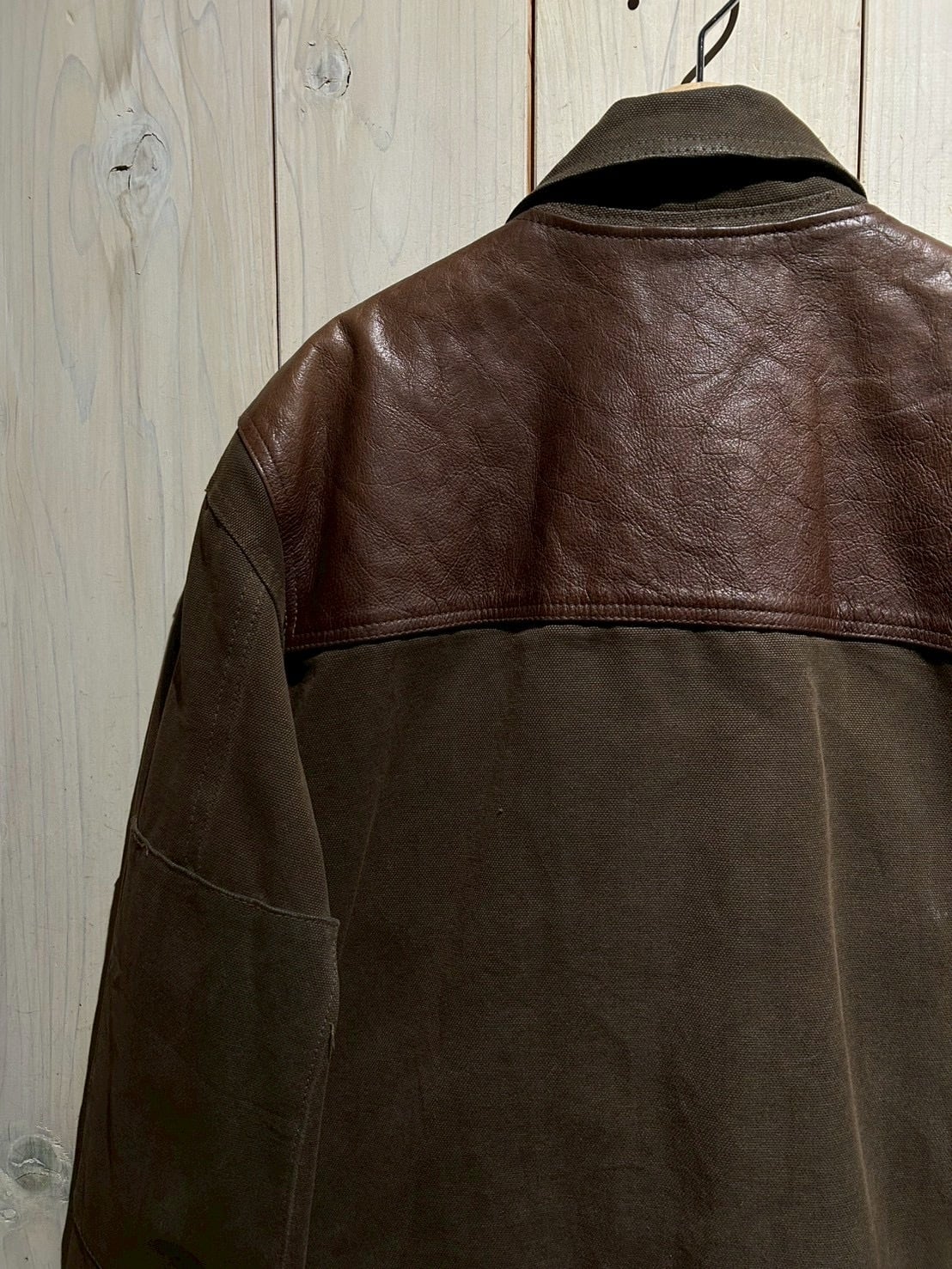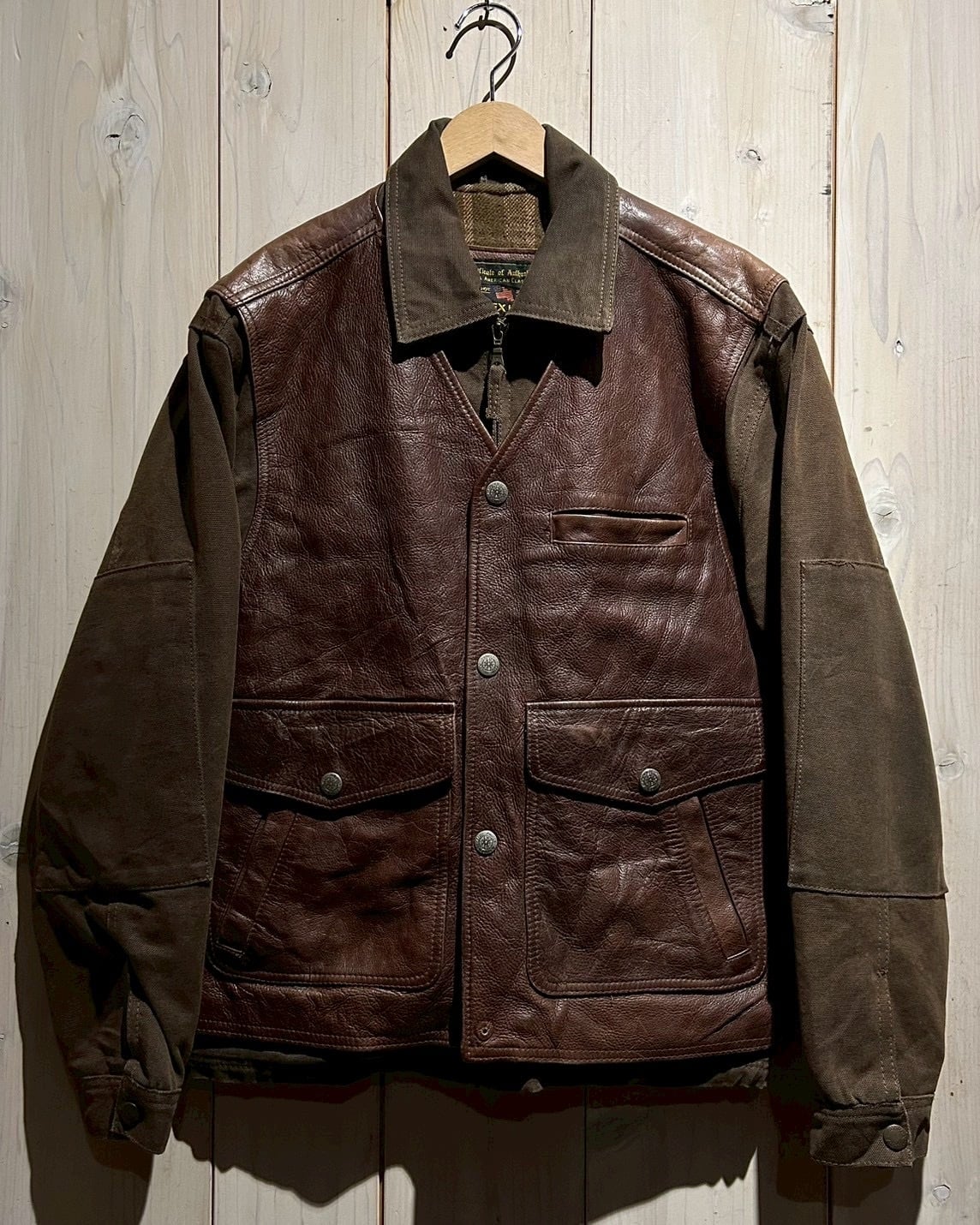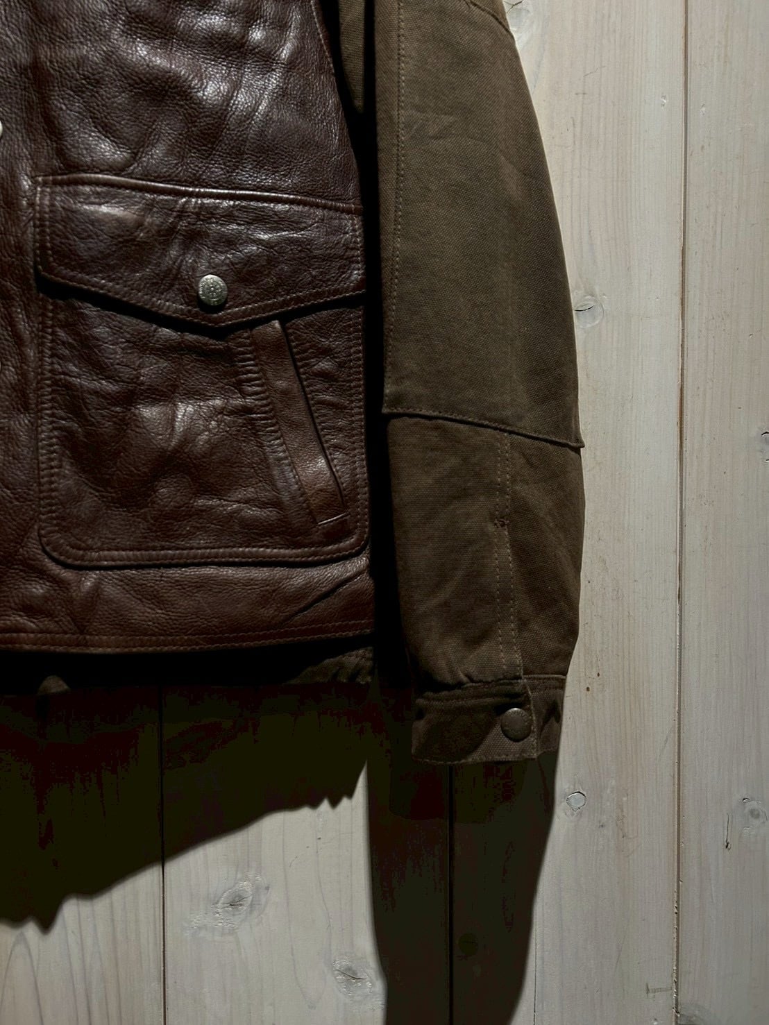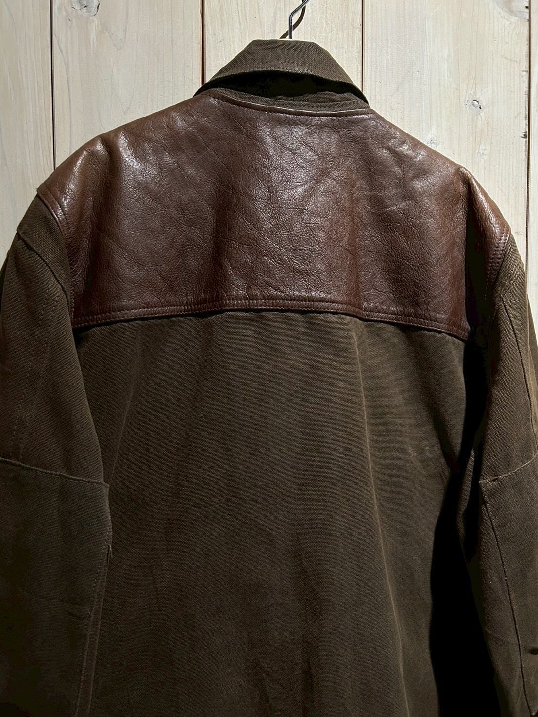 使用されているレザーはしっかりとした厚みがありながらも、経年による柔らかさとシボ感が現れた上質な表情。裏地にはウール混素材を用い、見た目以上の保温性と着心地の良さを確保しています。