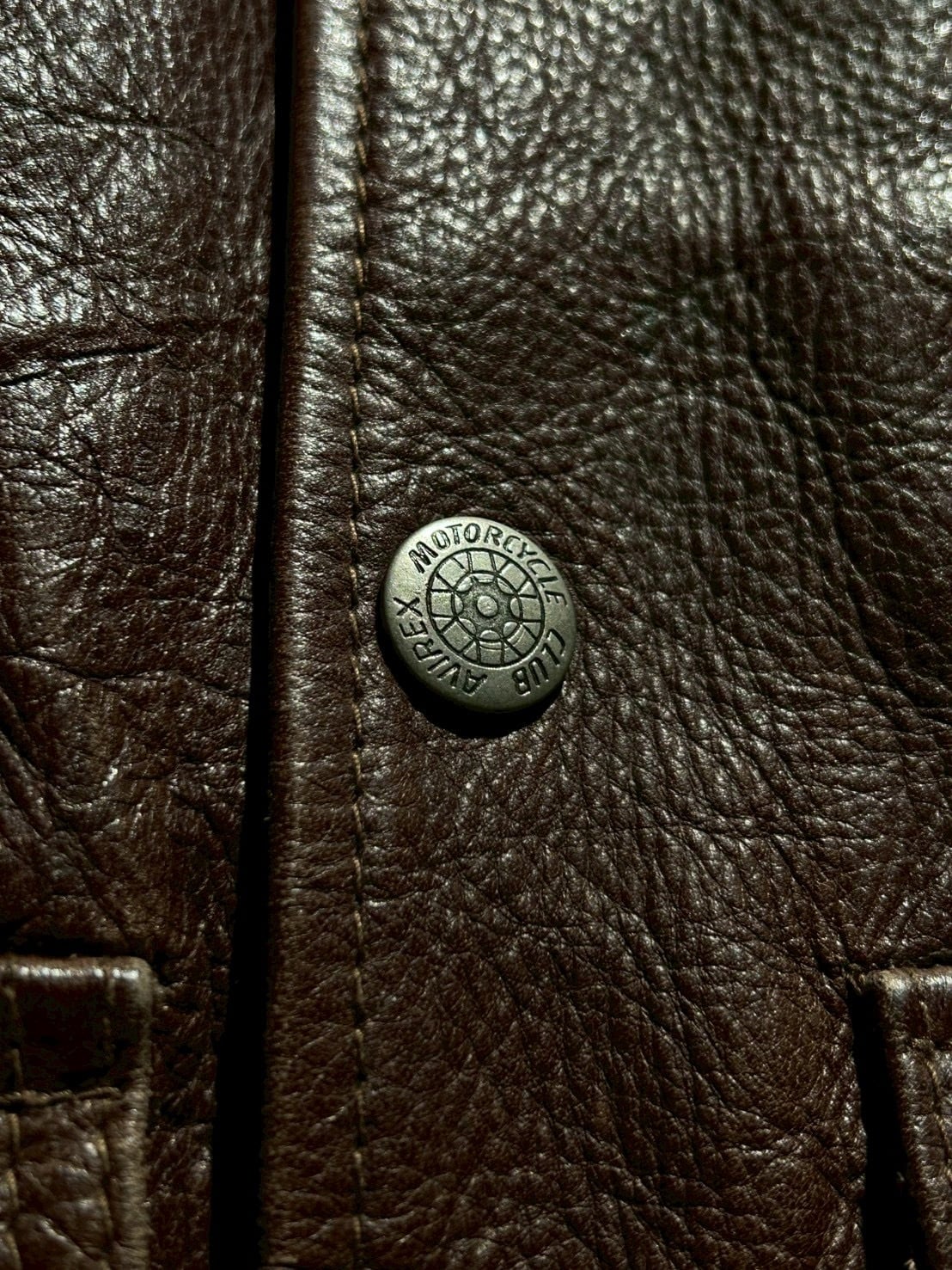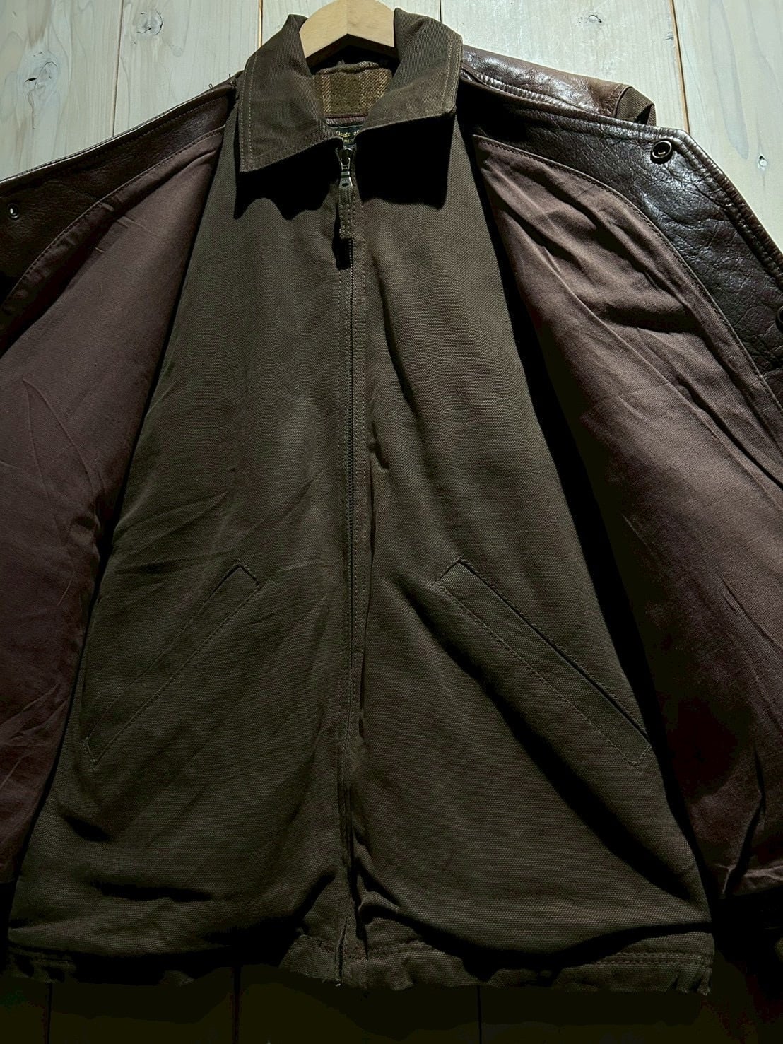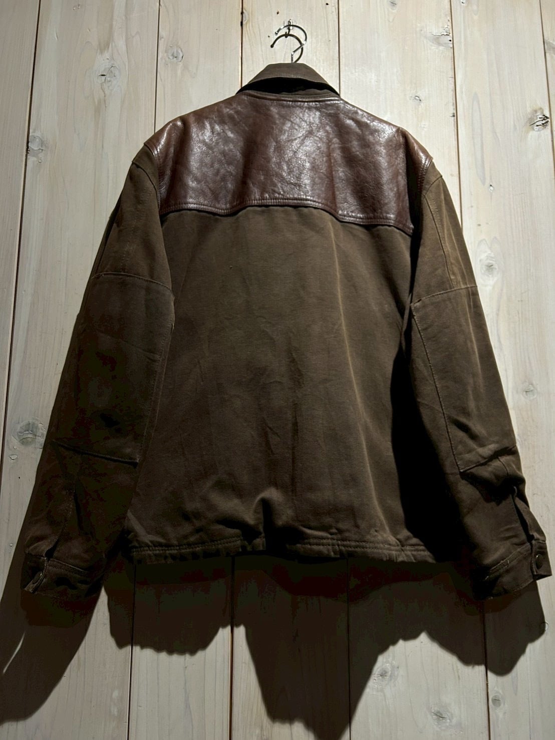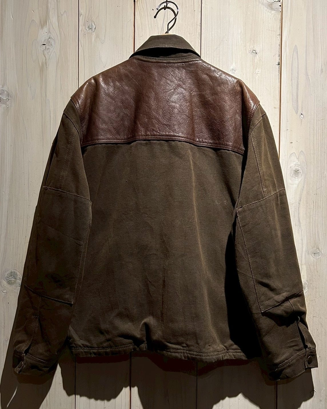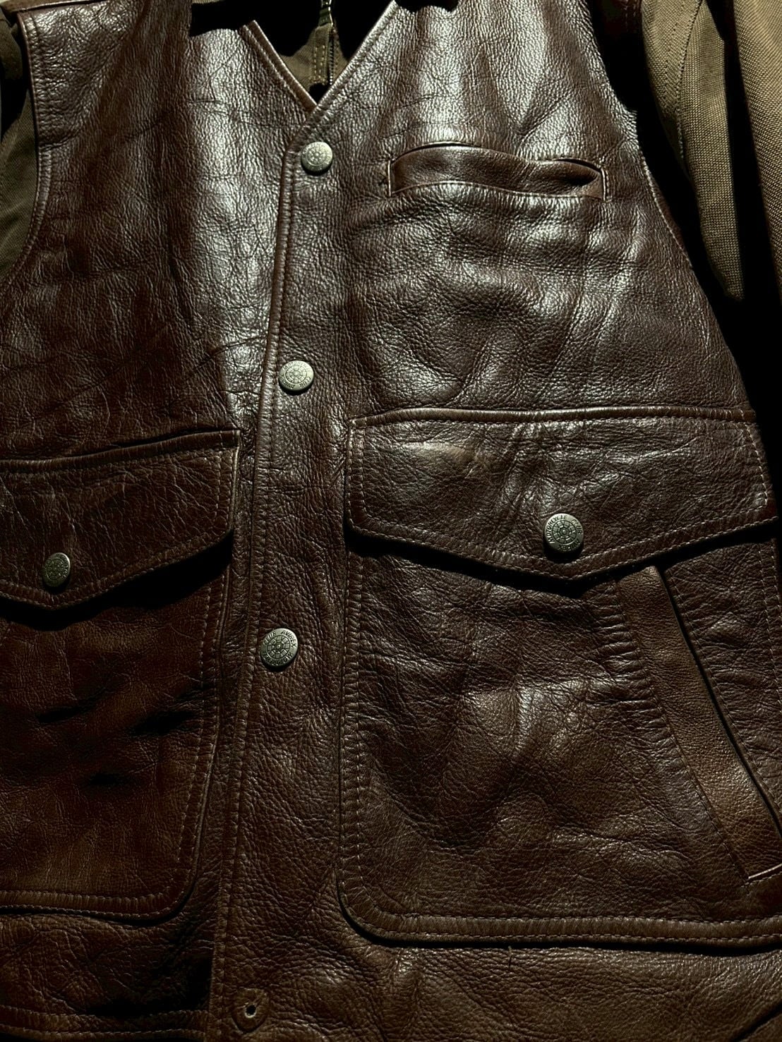 使用されているレザーはしっかりとした厚みがありながらも、経年による柔らかさとシボ感が現れた上質な表情。裏地にはウール混素材を用い、見た目以上の保温性と着心地の良さを確保しています。