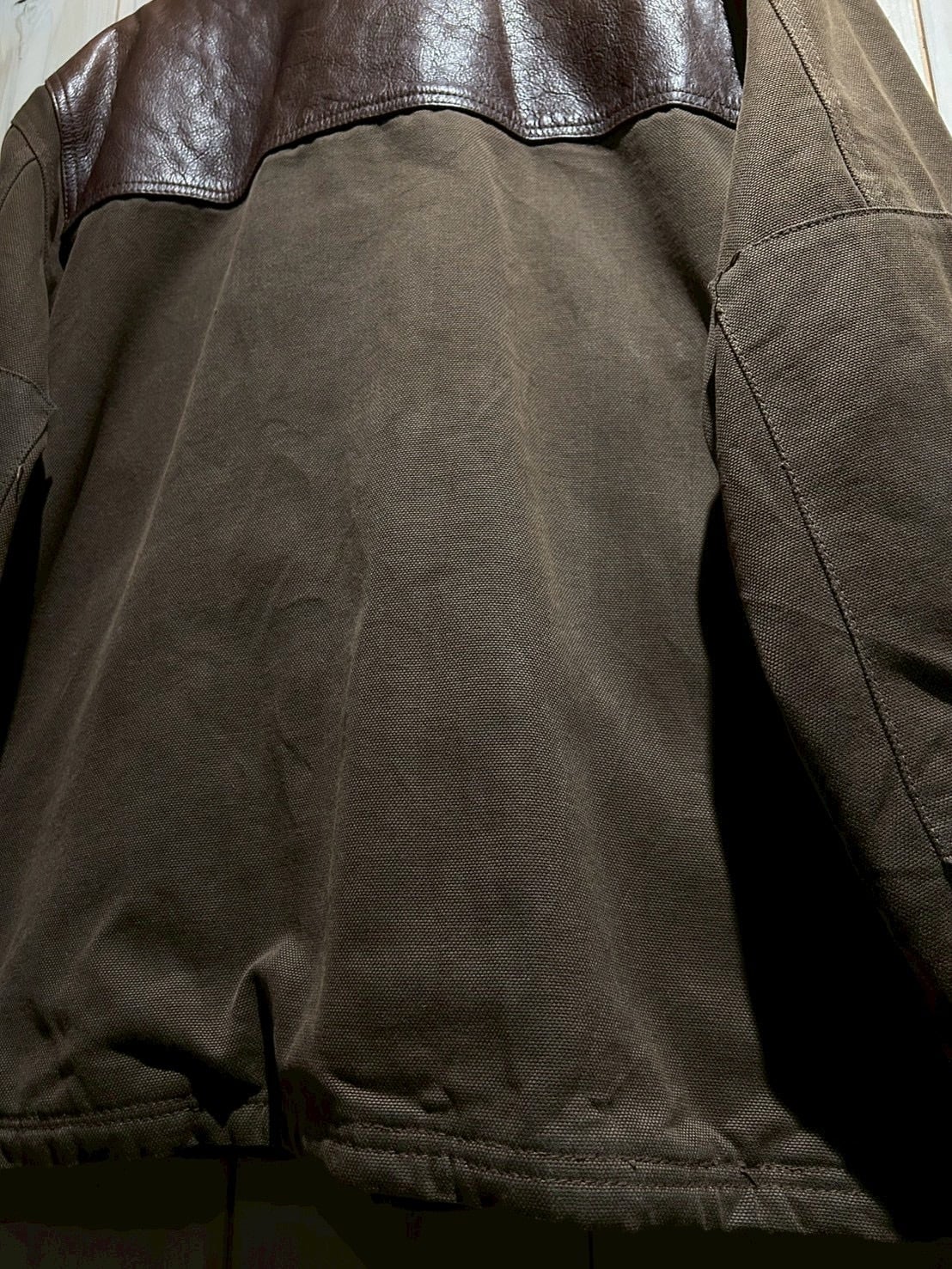 ボディにはしっかりとしたコットンキャンバスを採用し、その上からリアルレザーのベストをレイヤードしたかのようなデザインを落とし込んだ1着。