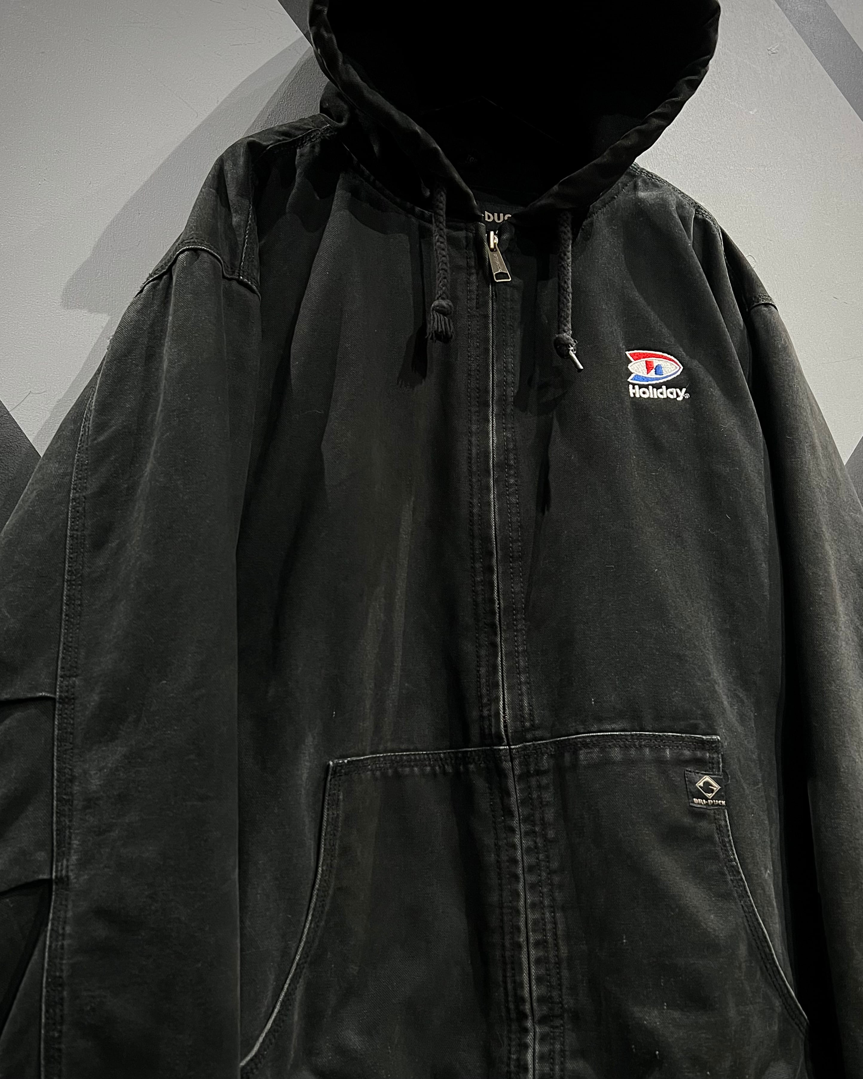 フロントはジップ仕様、ハンドウォーマーポケット付きで実用性も十分。左胸には企業ロゴの刺繍が入り、いわゆる“リアルワーク”由来ならではの説得力あるディテールとして存在感を放ちます。