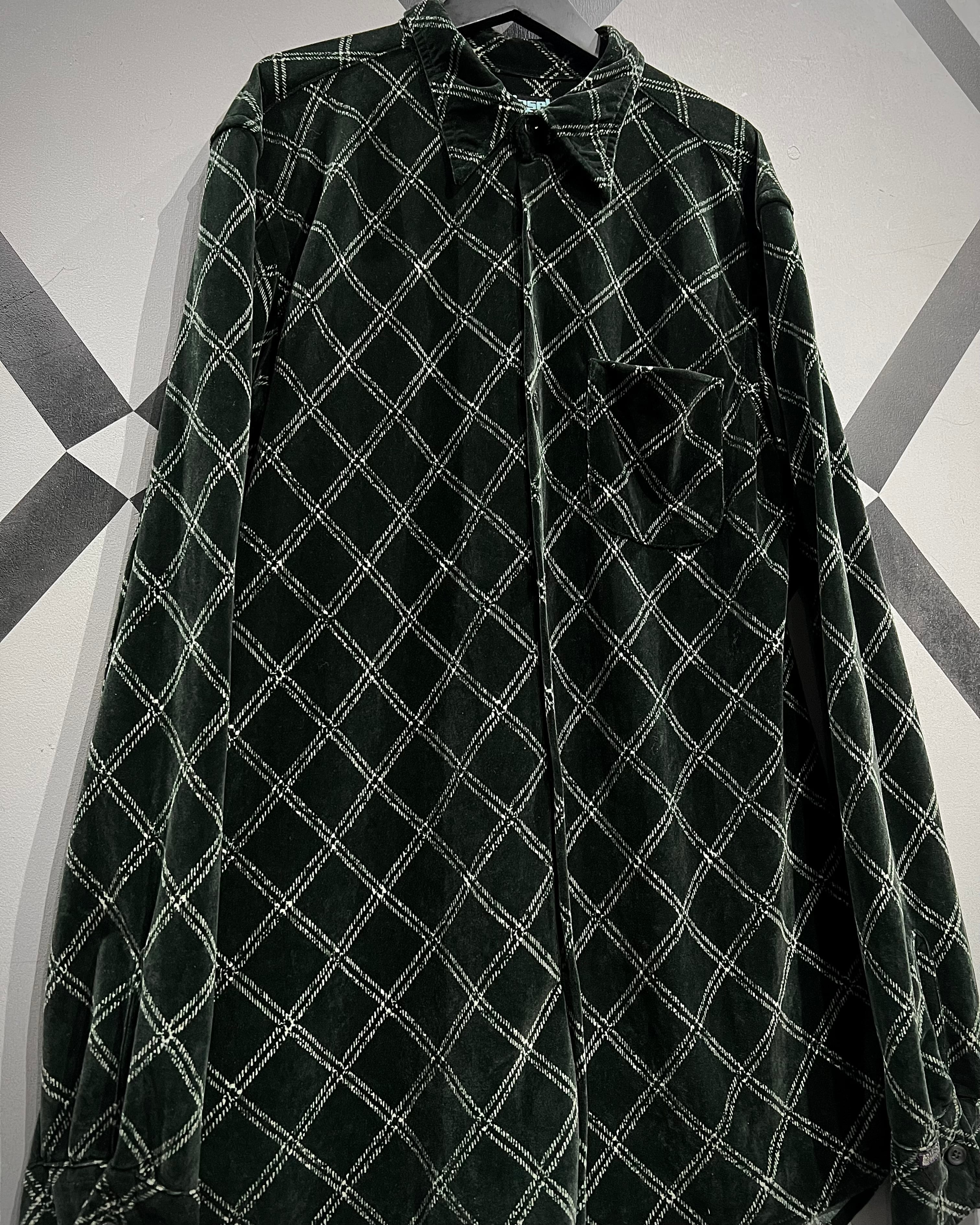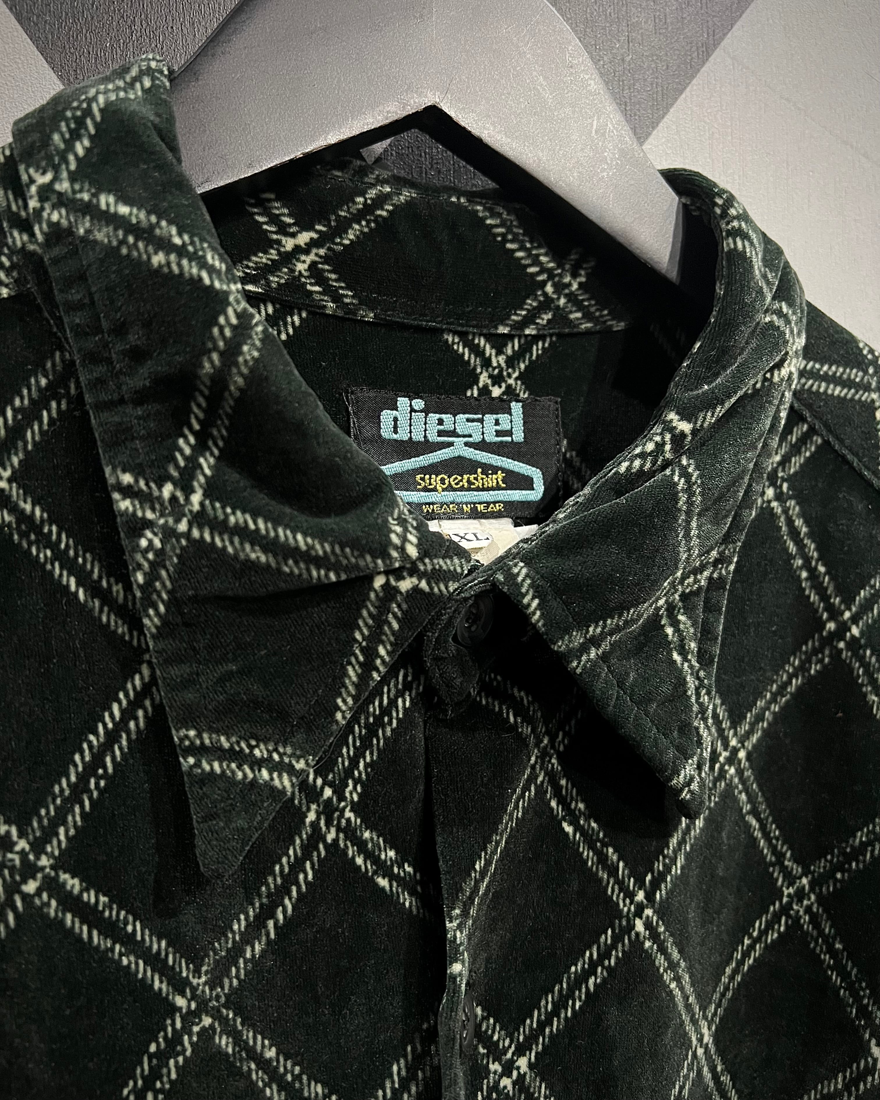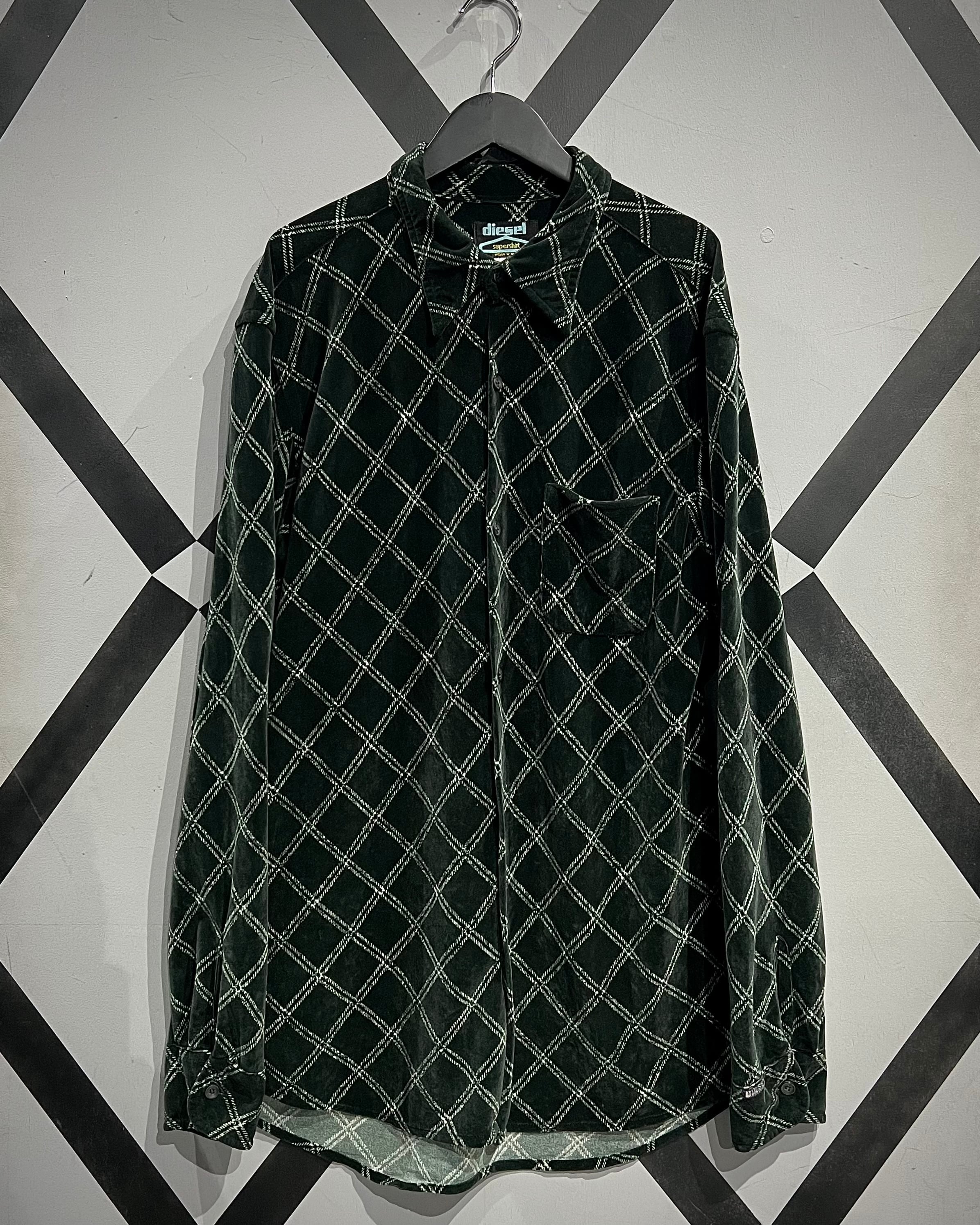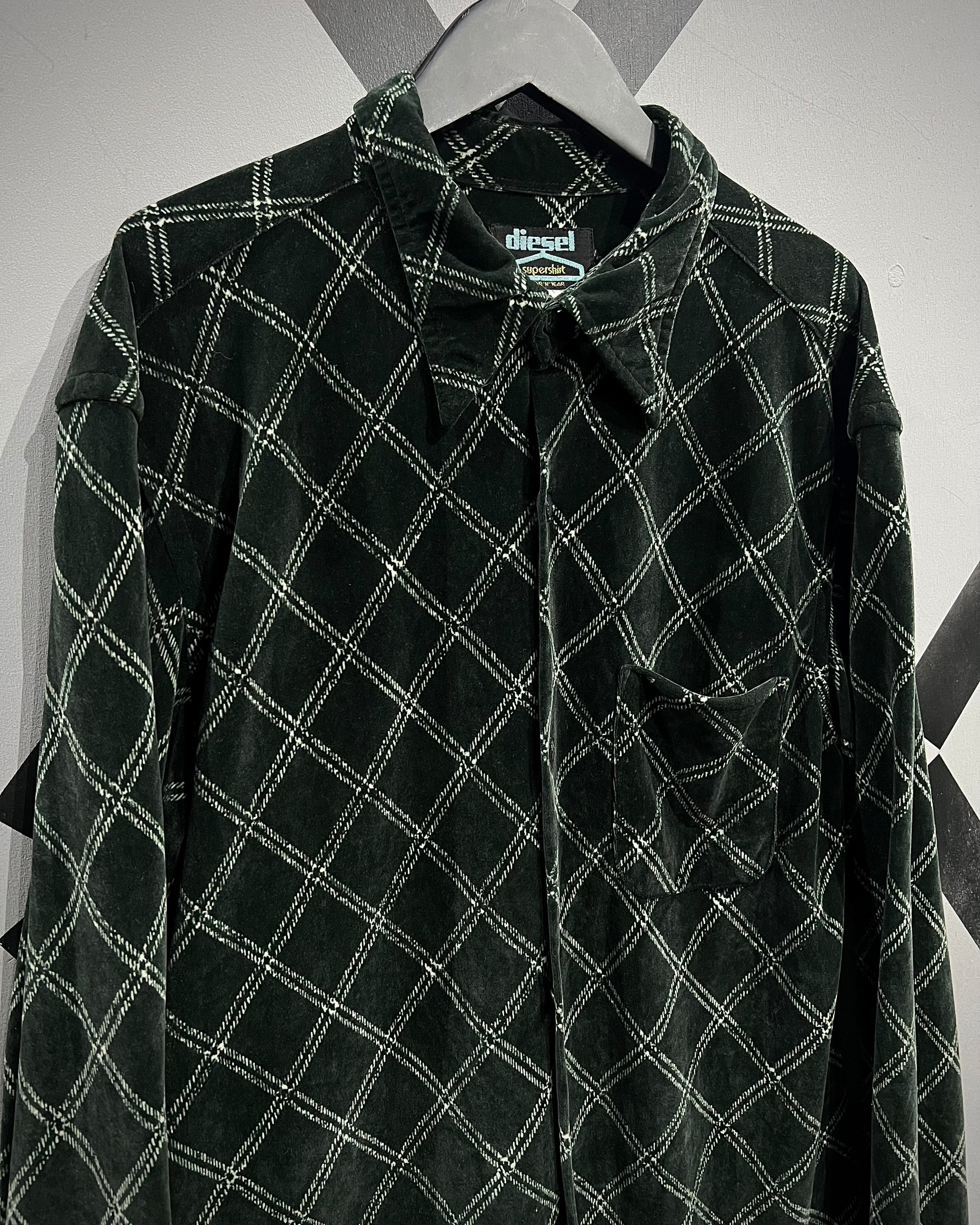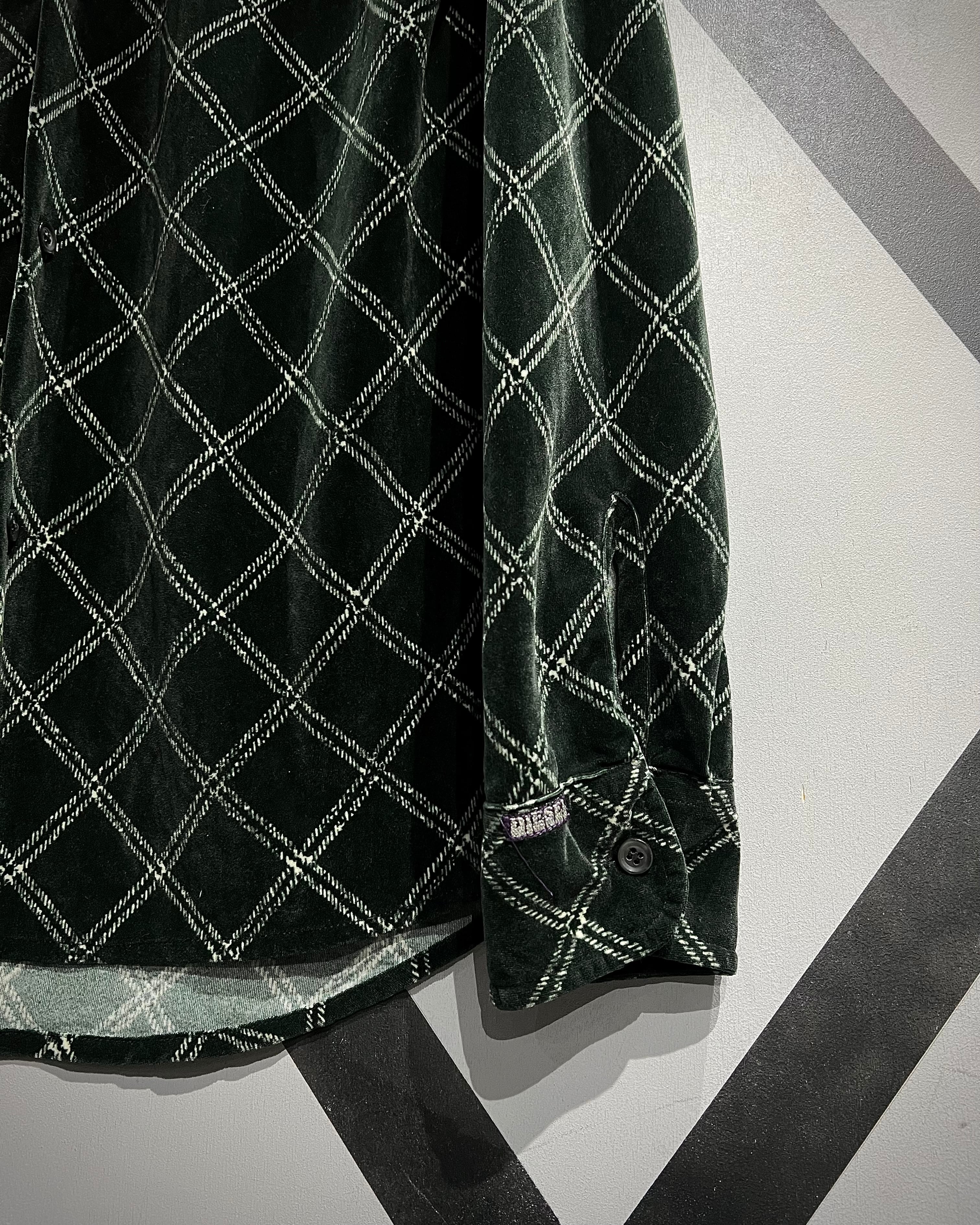 カジュアルなシャツという枠に収まらない、素材選びとグラフィカルなアプローチが特徴的な、“DIESEL“らしいエッジの効いた感性が色濃く反映された、ベロア素材のチェックシャツ。