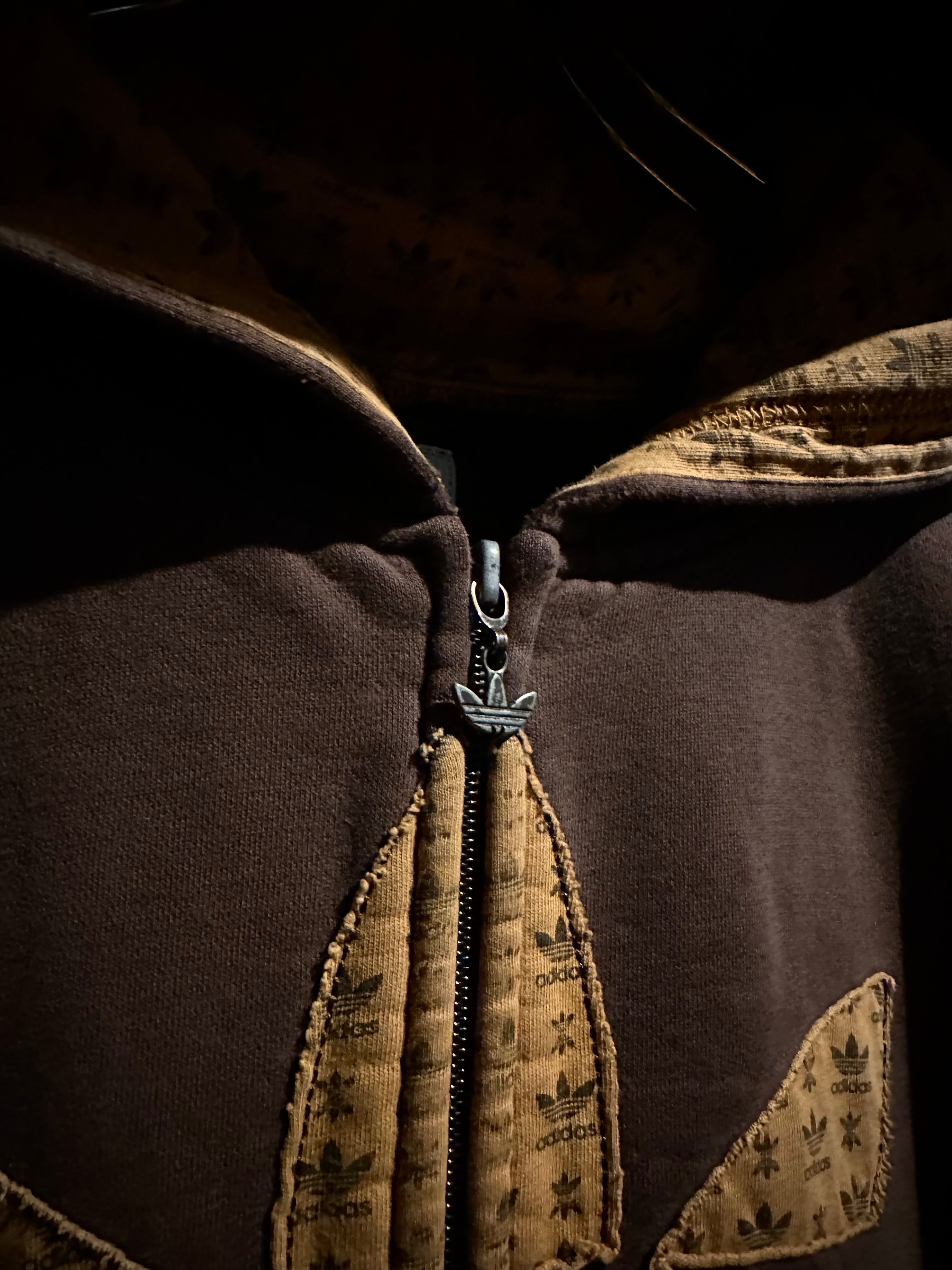 フロントにはトレフォイルロゴを大胆に配置。ロゴの総柄生地で表現され、フード裏にも同じ生地を切り替え。ジップトップにもブランドらしい意匠が見られ、細部まで抜かりない作りが素晴らしい、、、